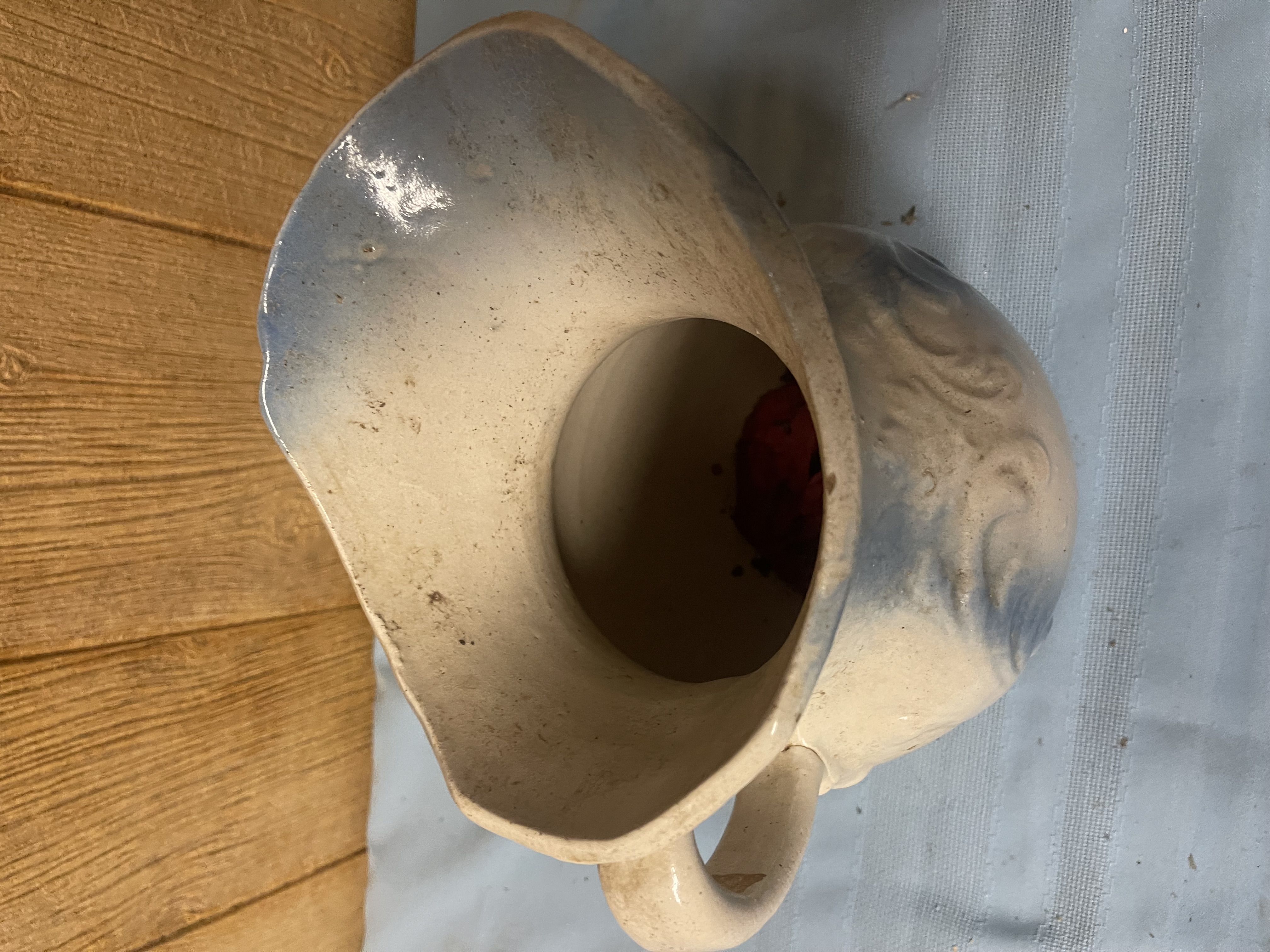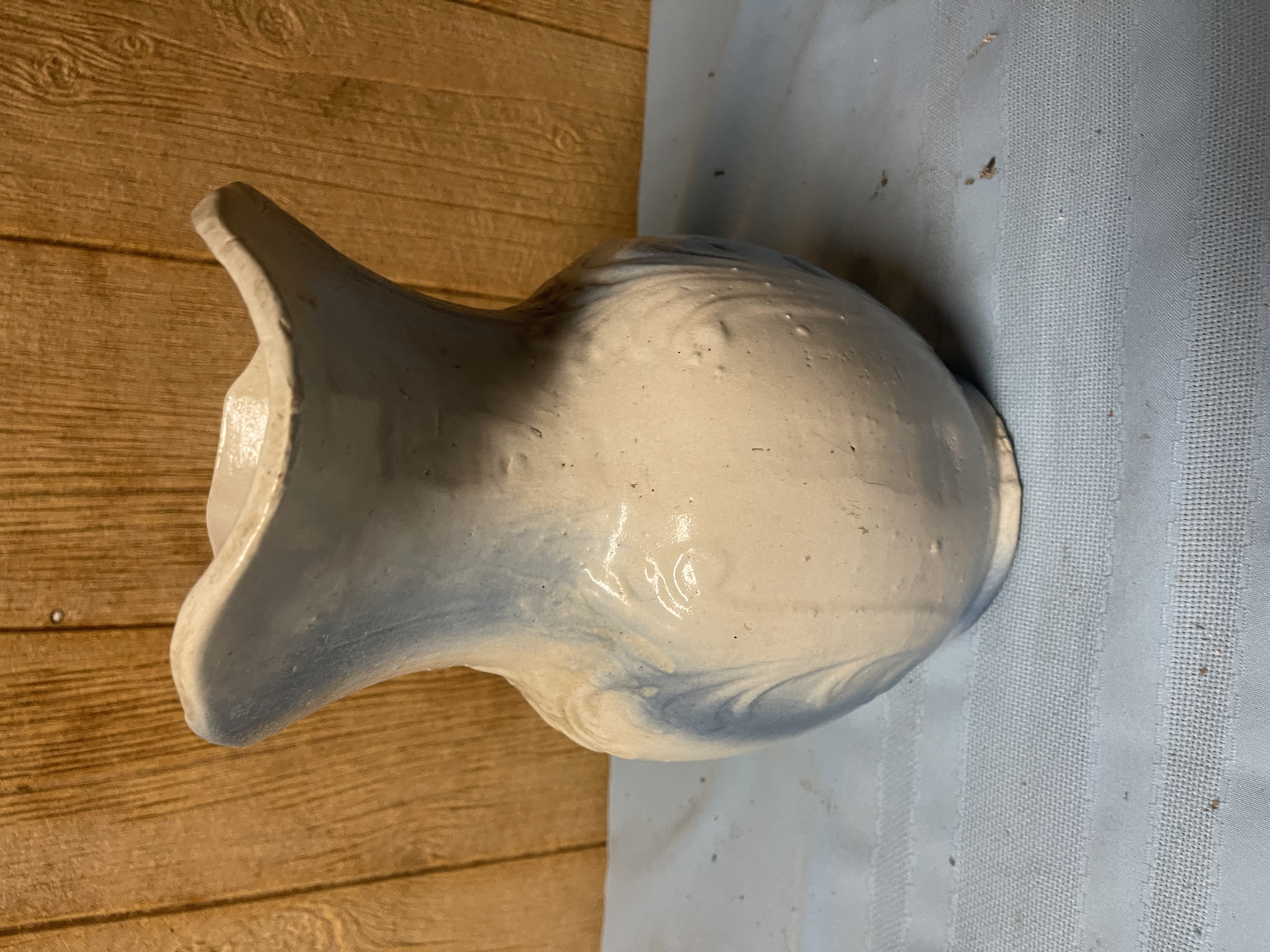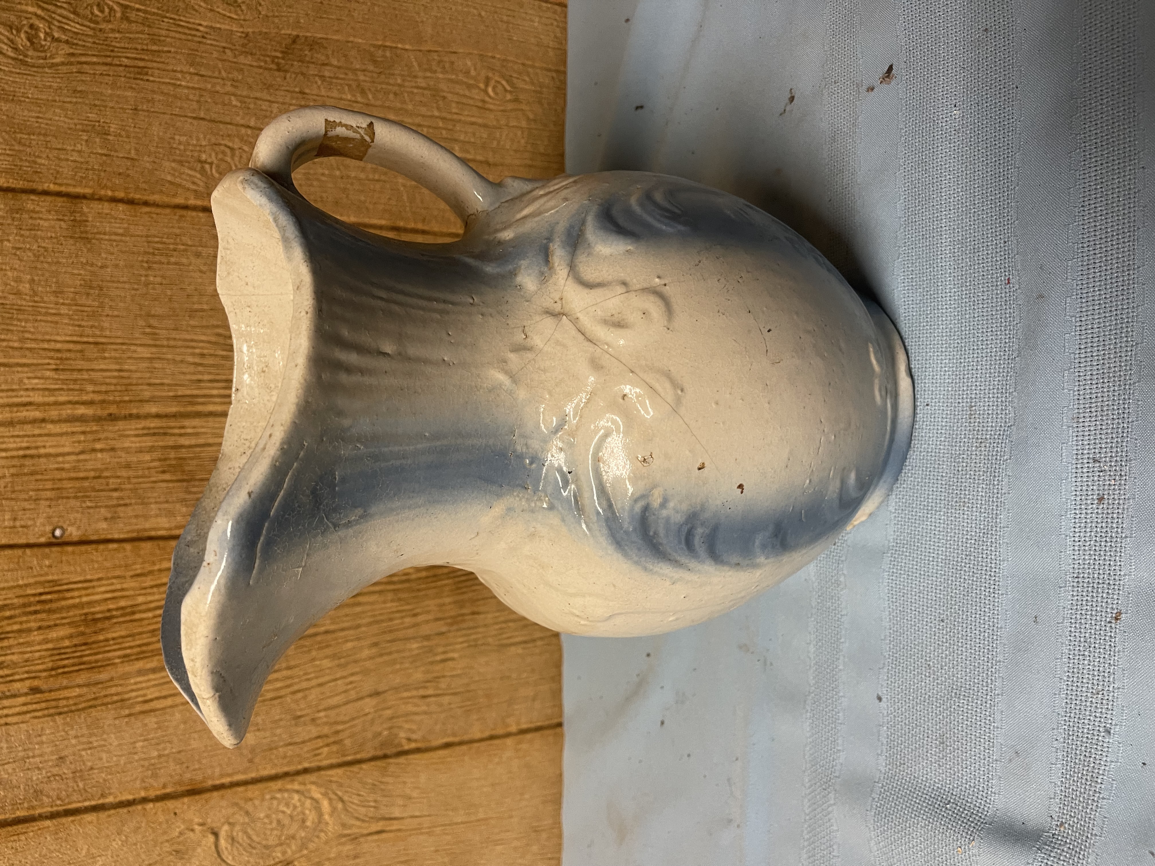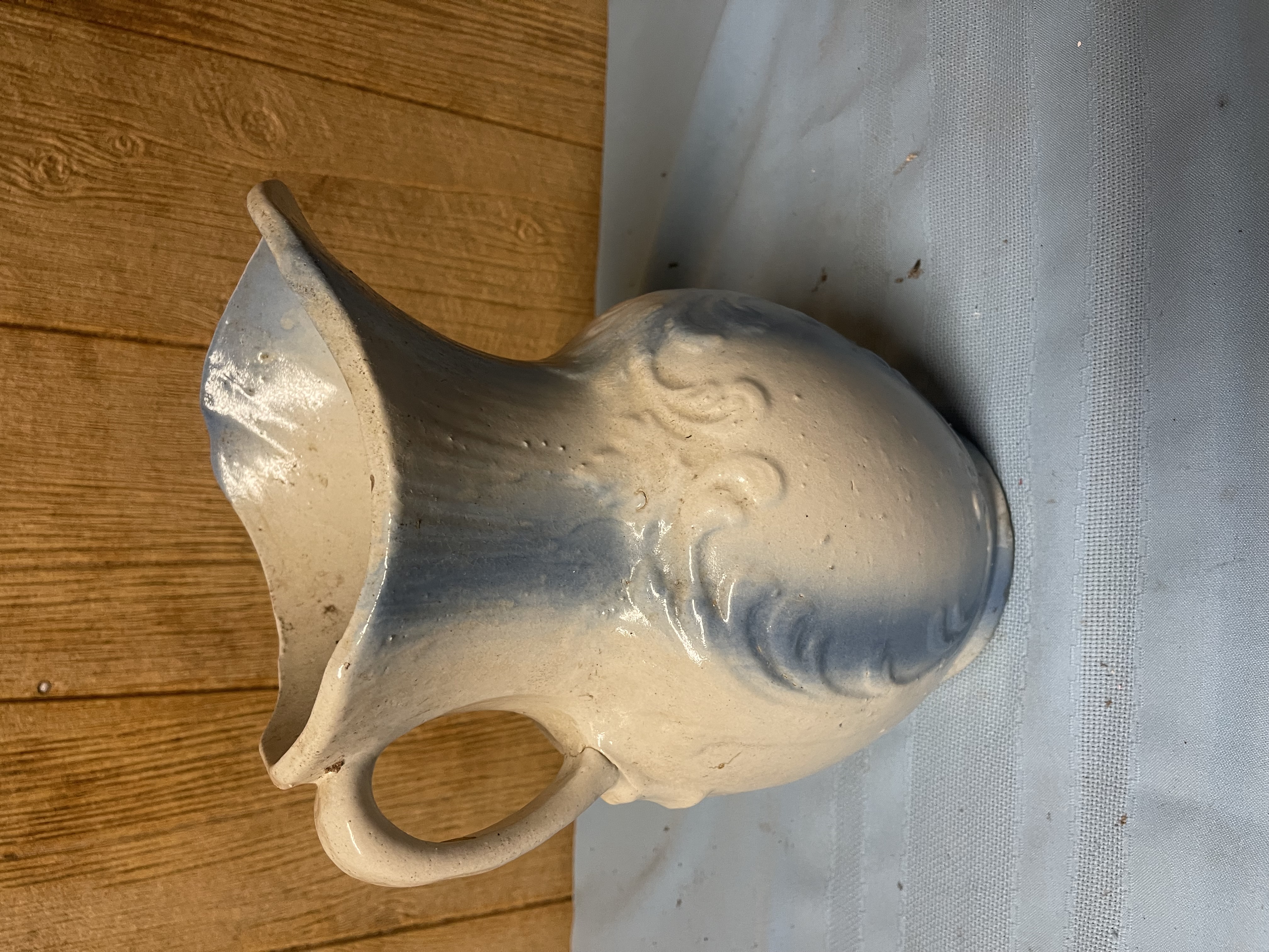 Large Blue & White Stoneware Water Pitcher Embossed “Scroll” Decoration No shipping