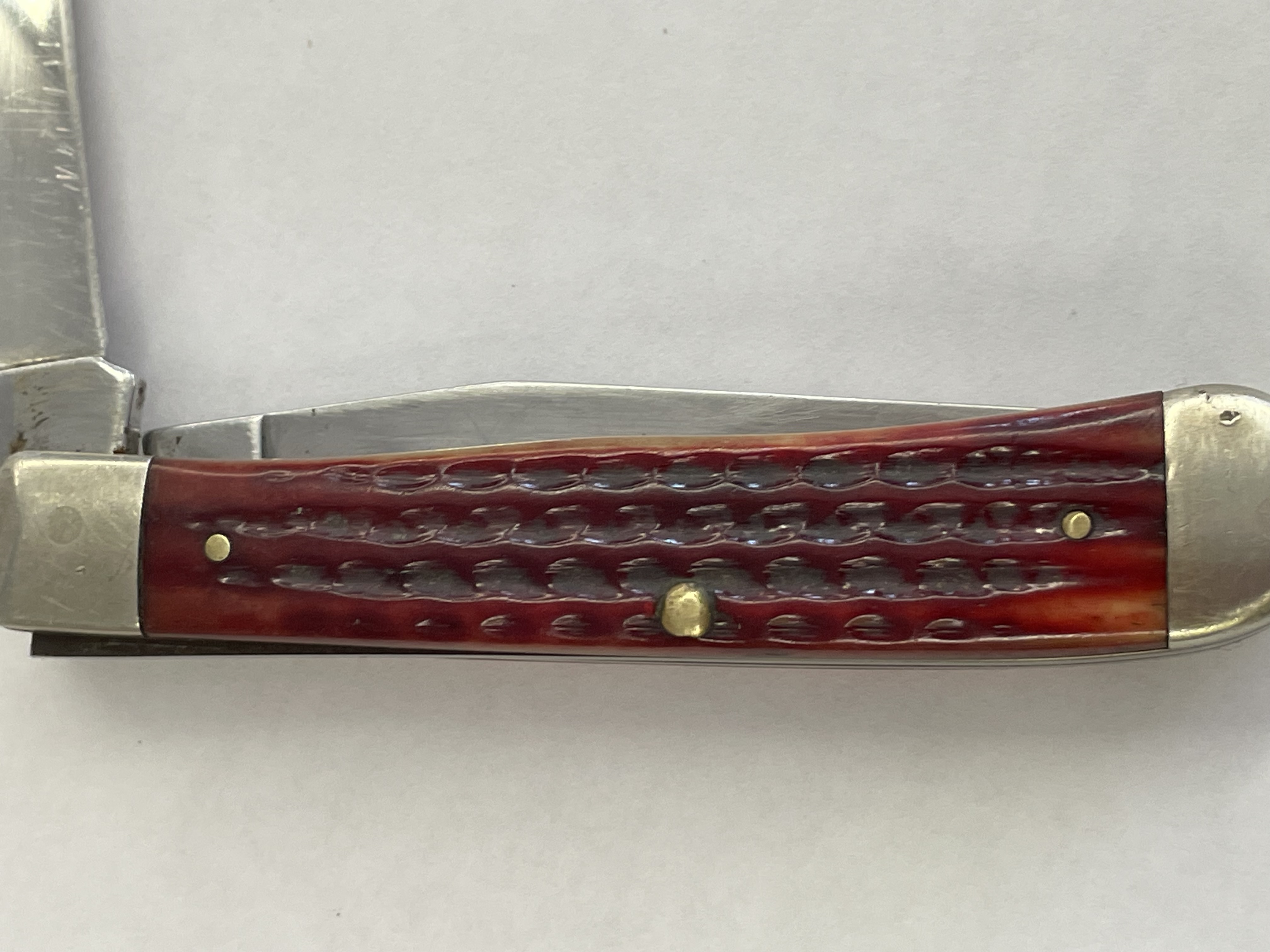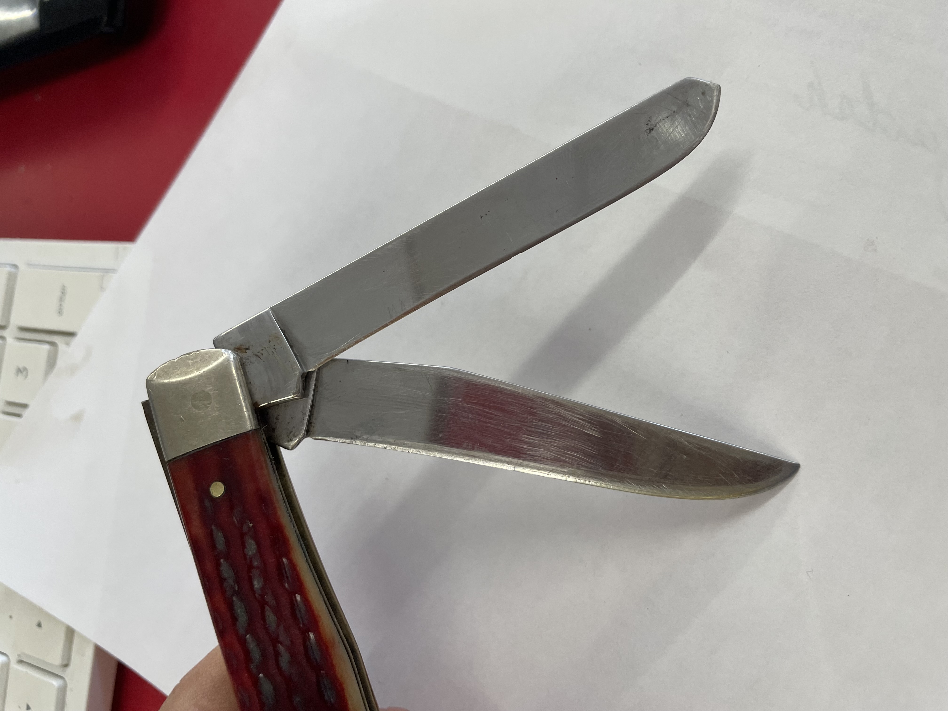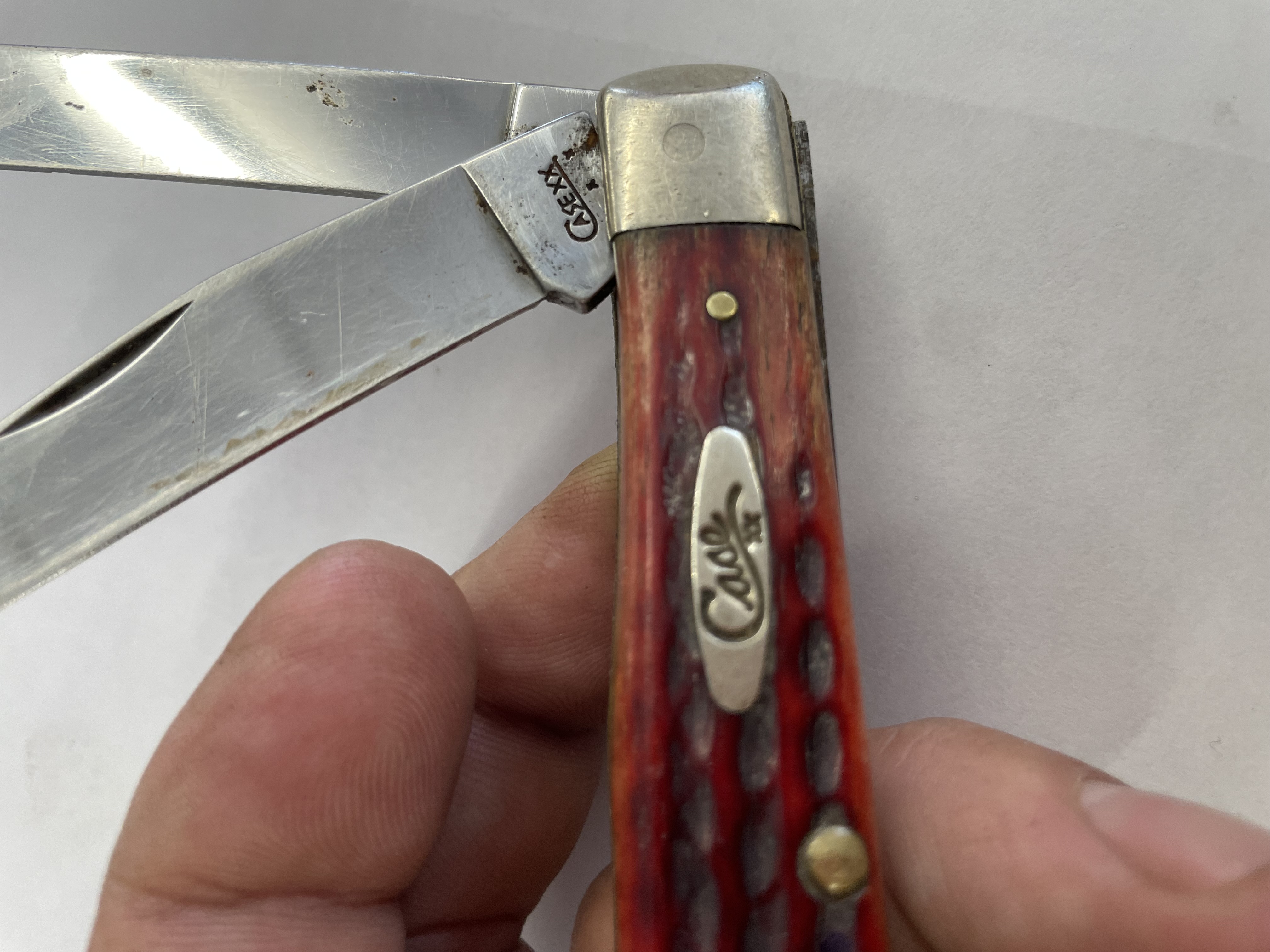 CASE XX, TRAPPER, 6254 SS, VINTAGE RED HANDLES IT HAS BEEN USED