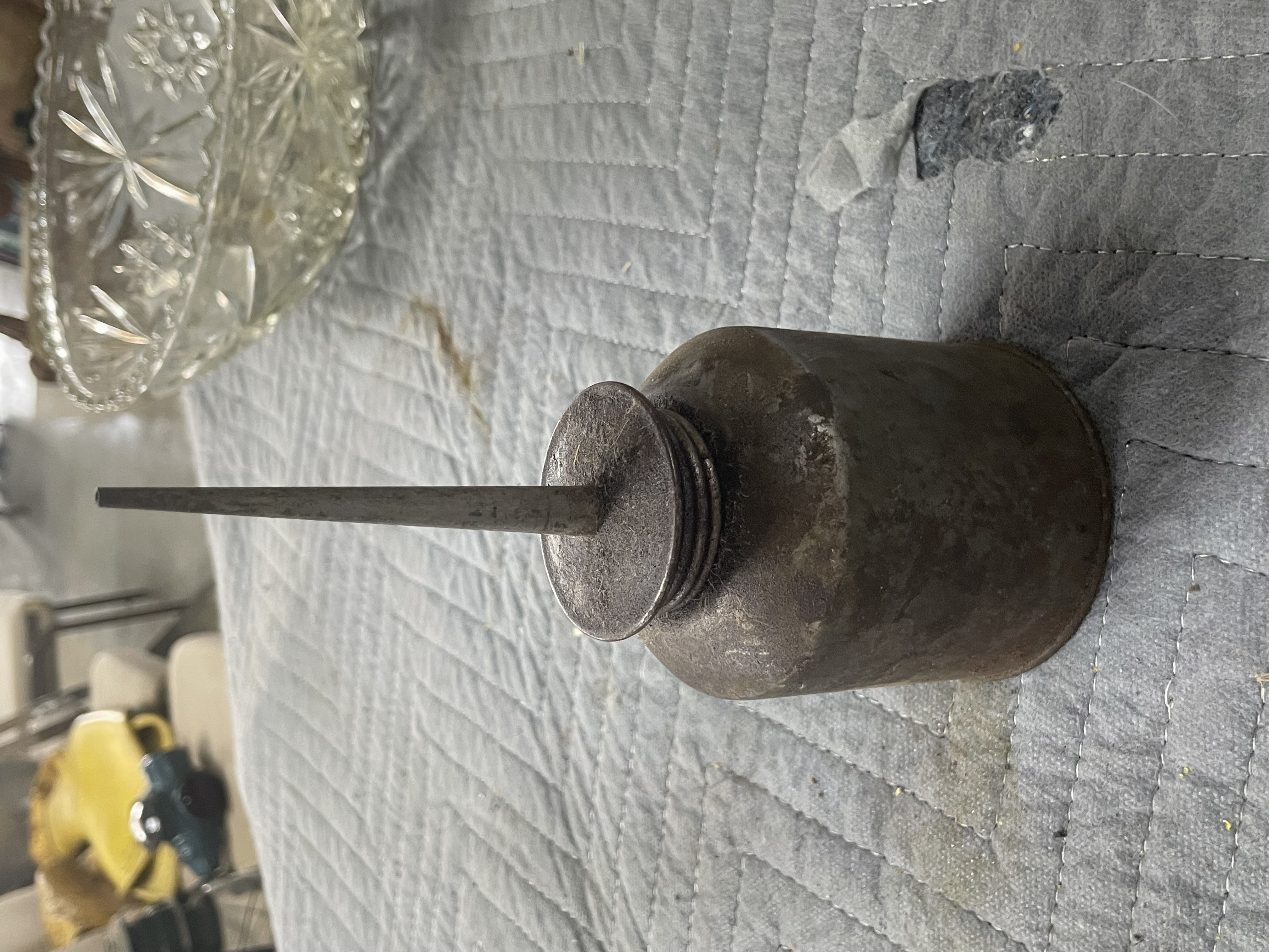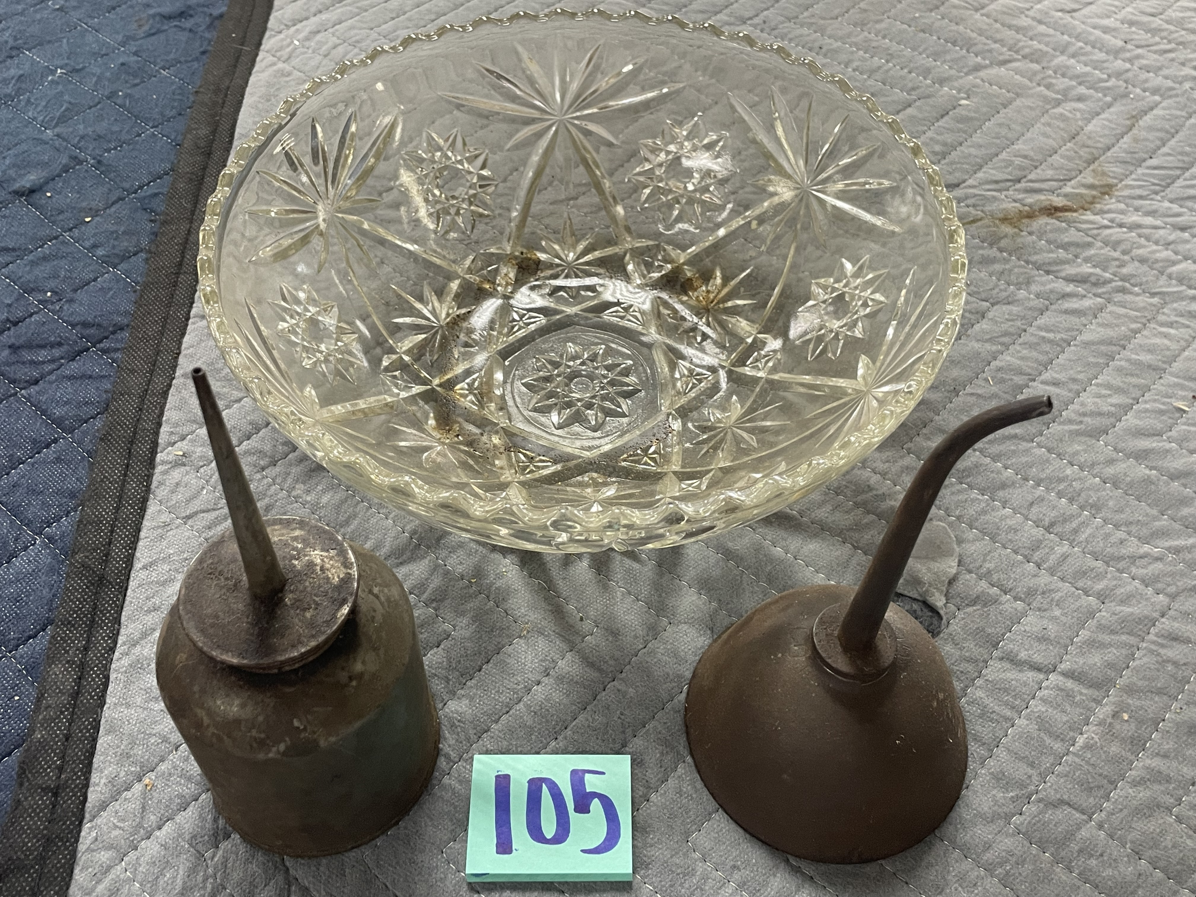 Glass Bowl and 2 Vintage Thumb Oiler Cans
