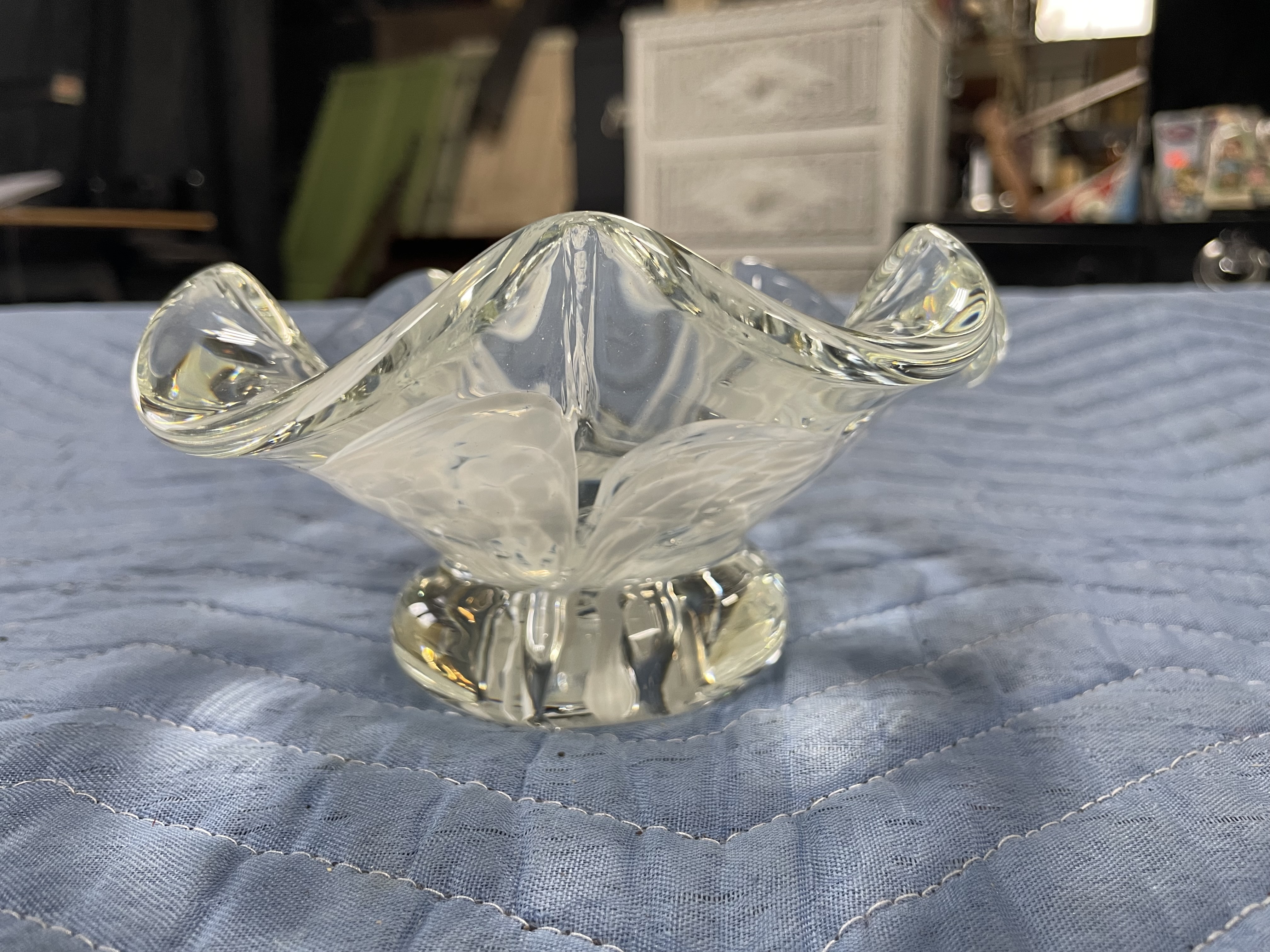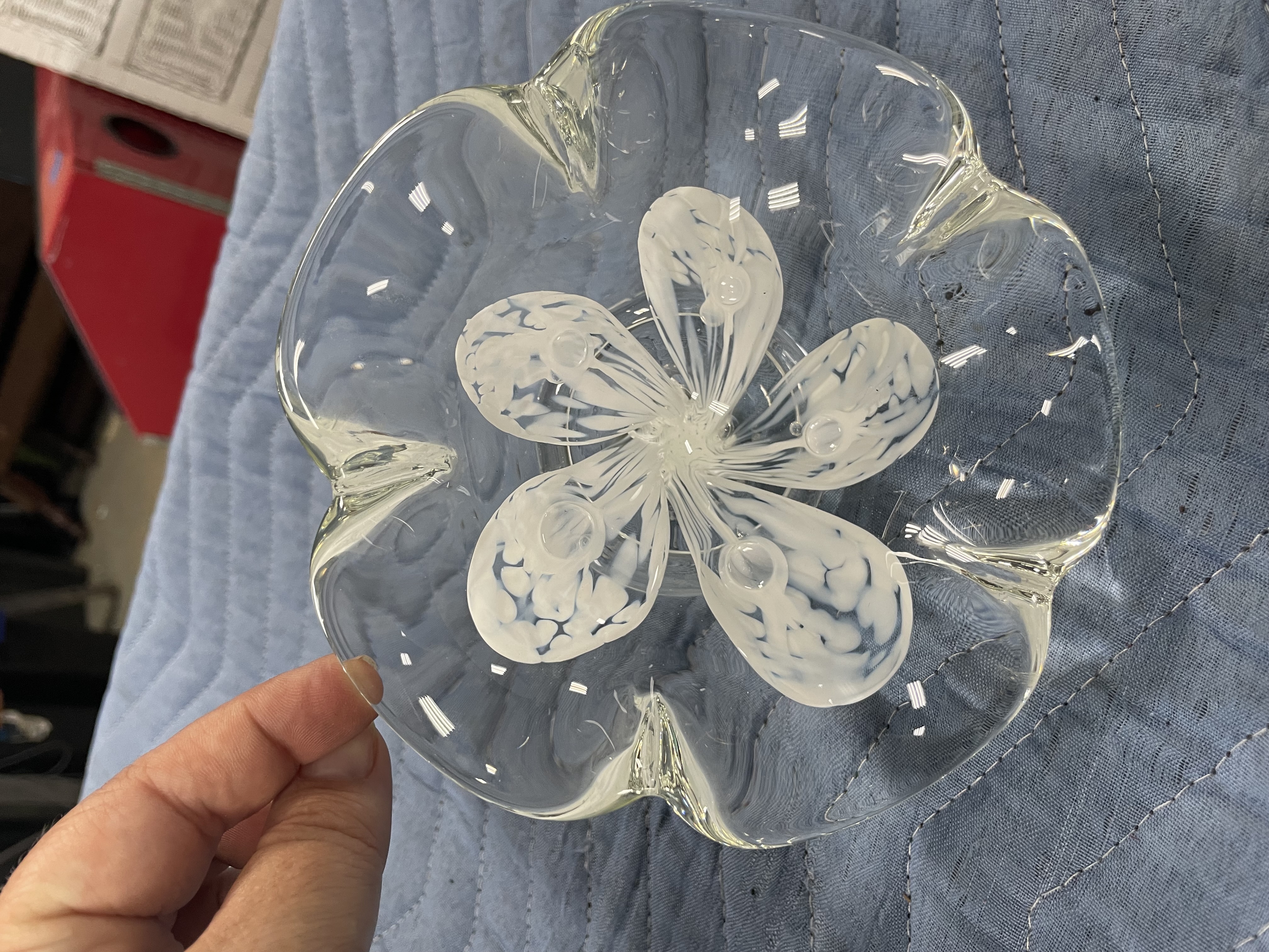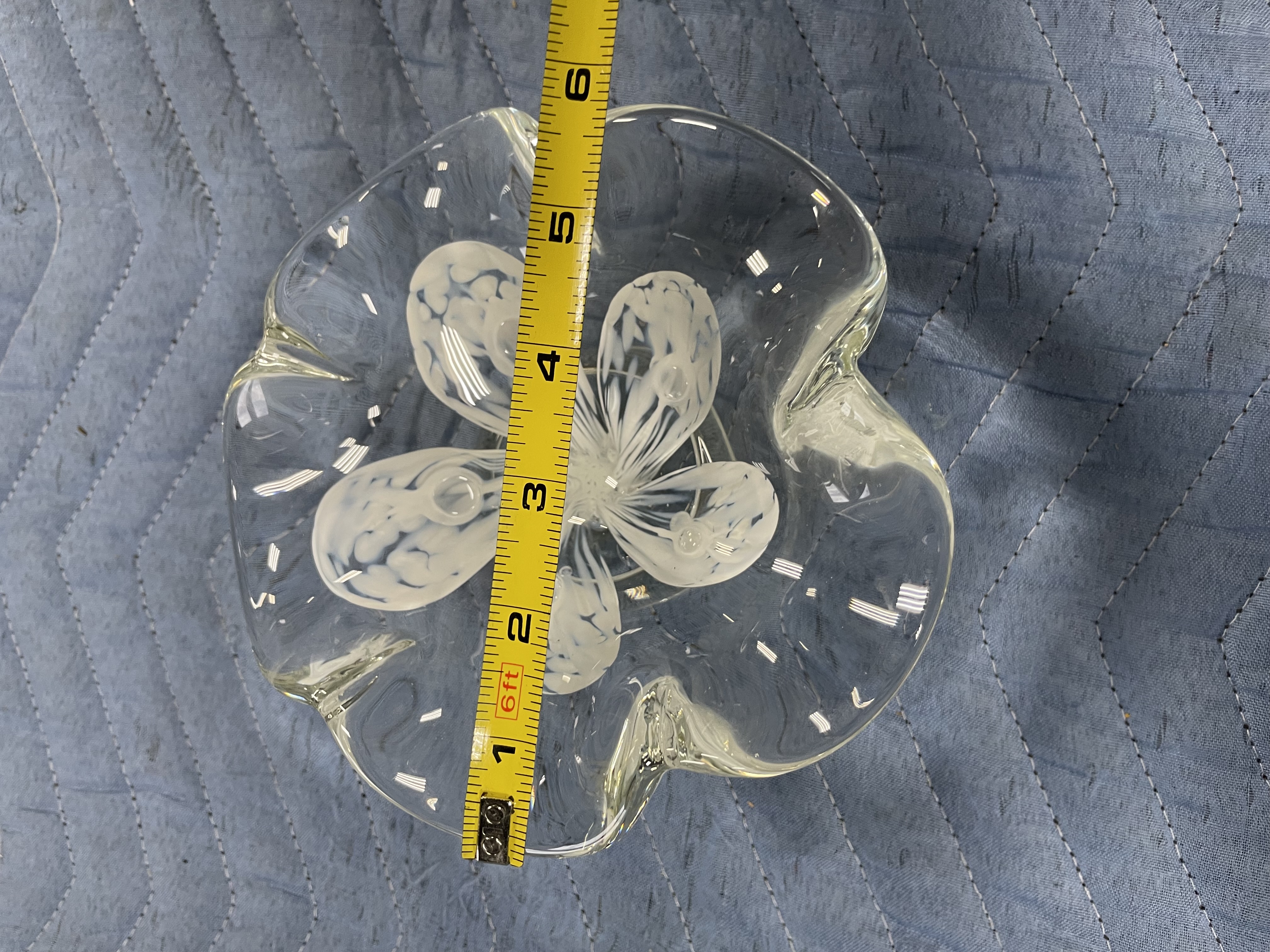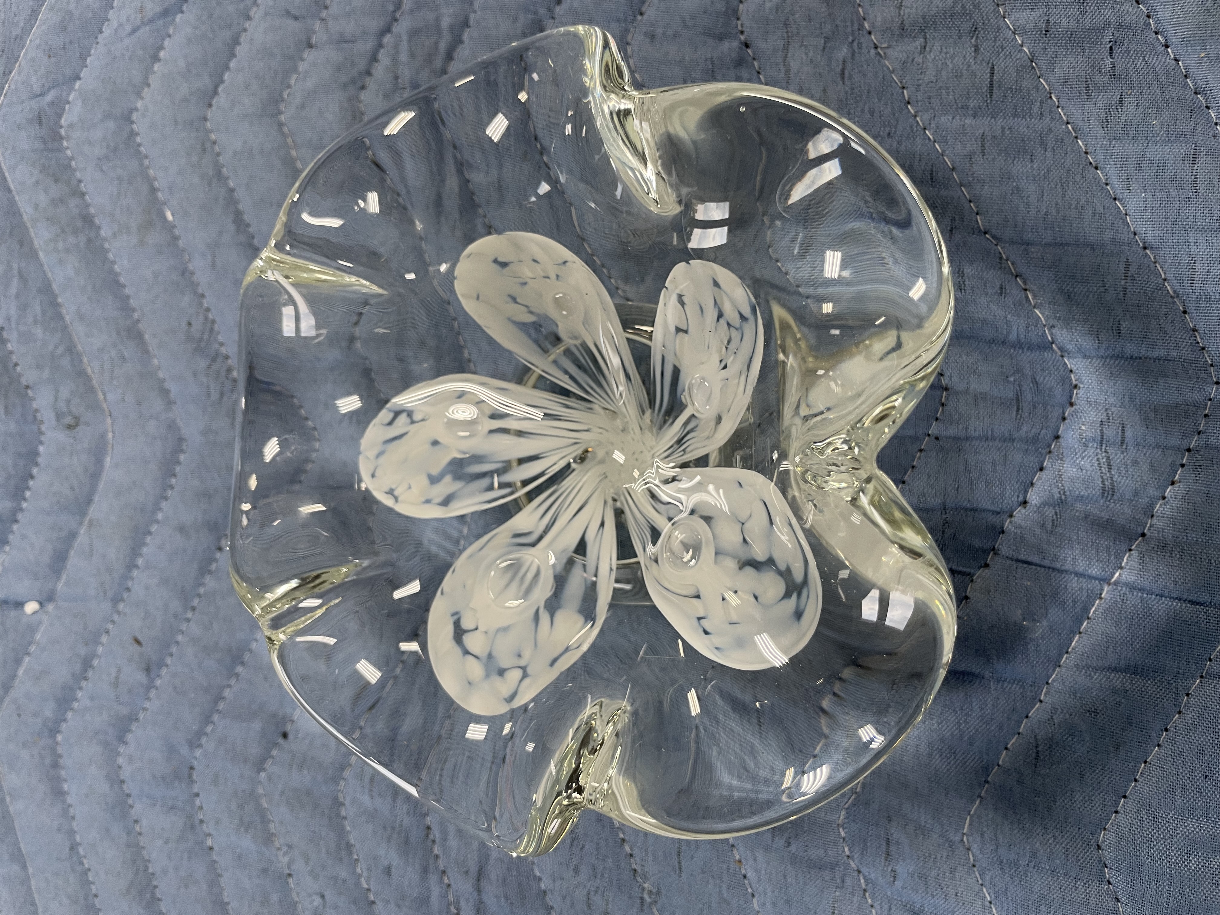 Vintage white flower Zimmerman art glass bowl or ice tray handmade crystal control bubbles four lines no chips or cracks Date says 2006