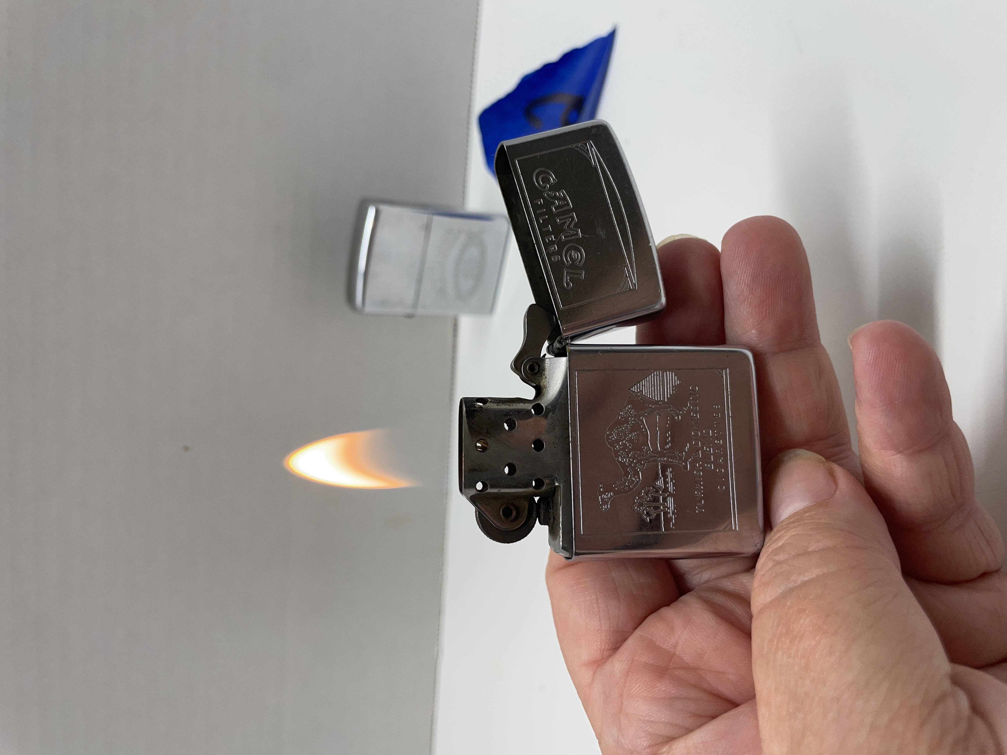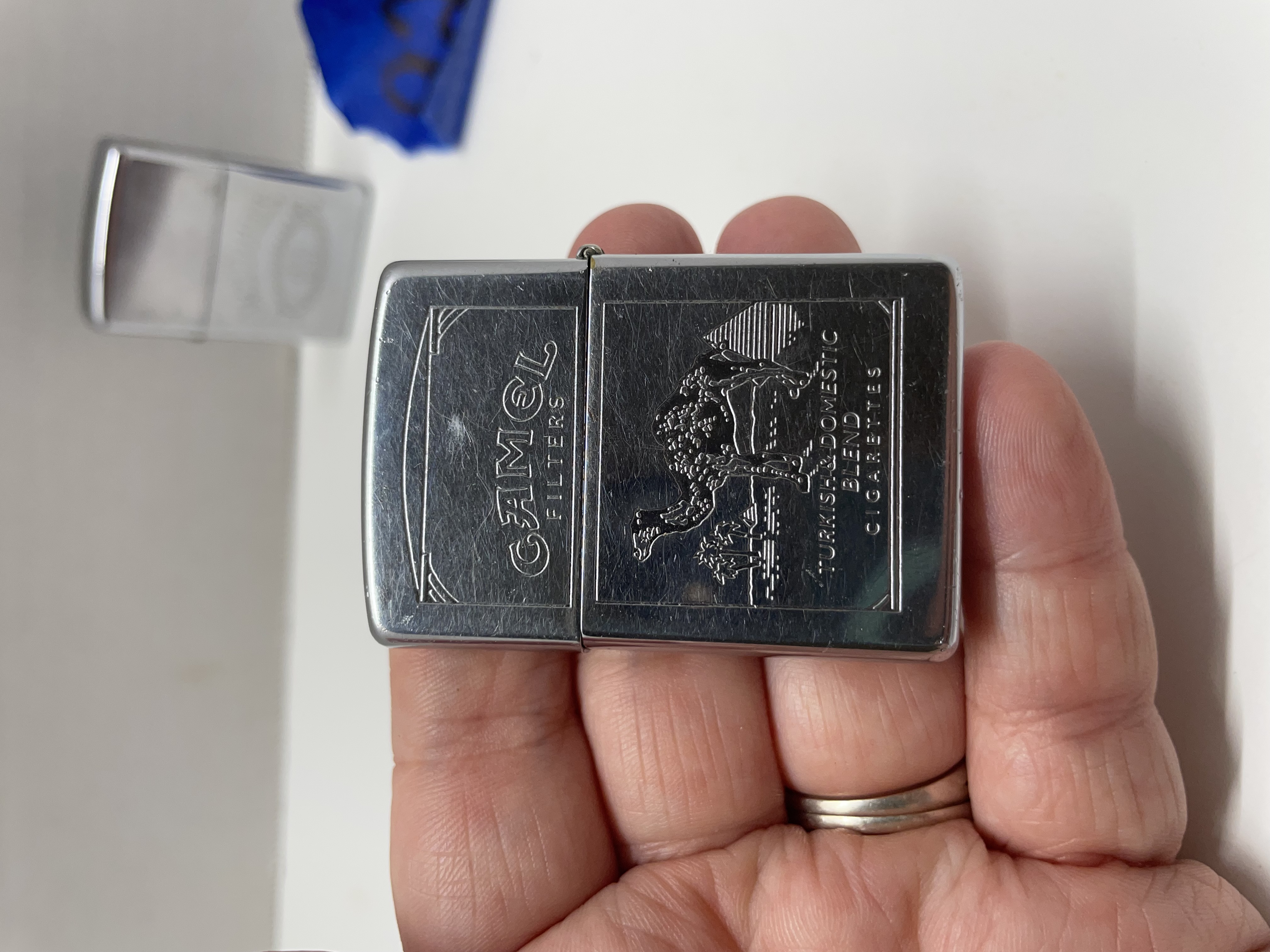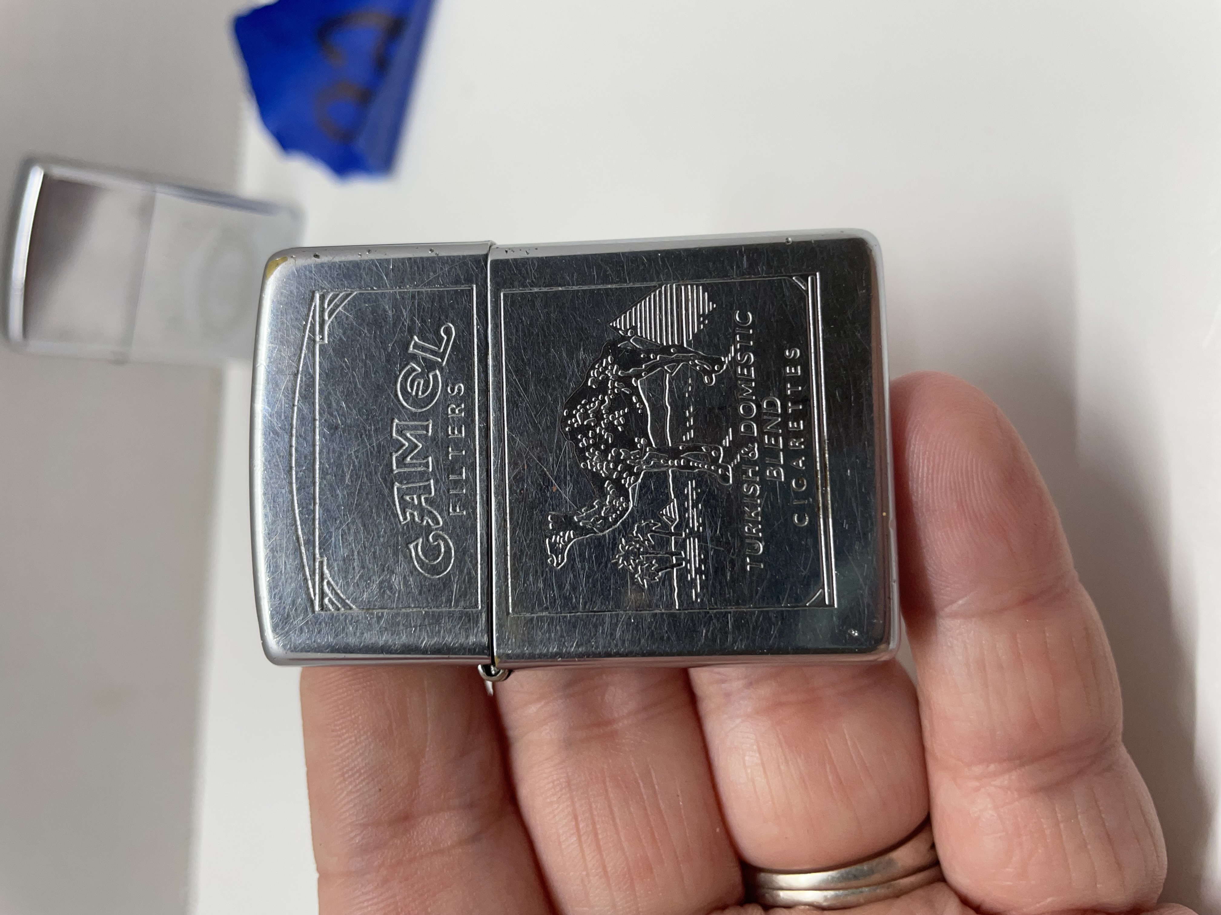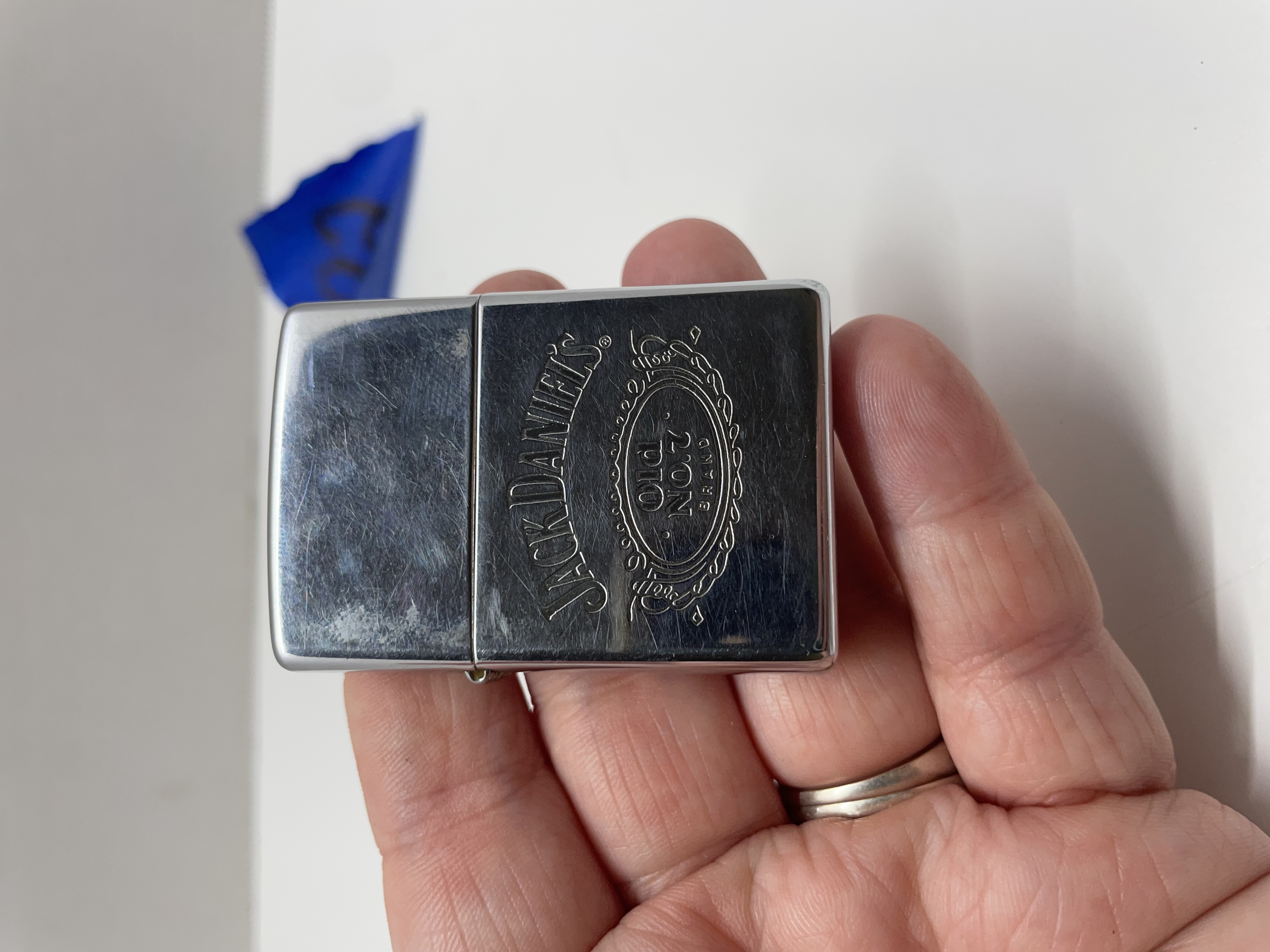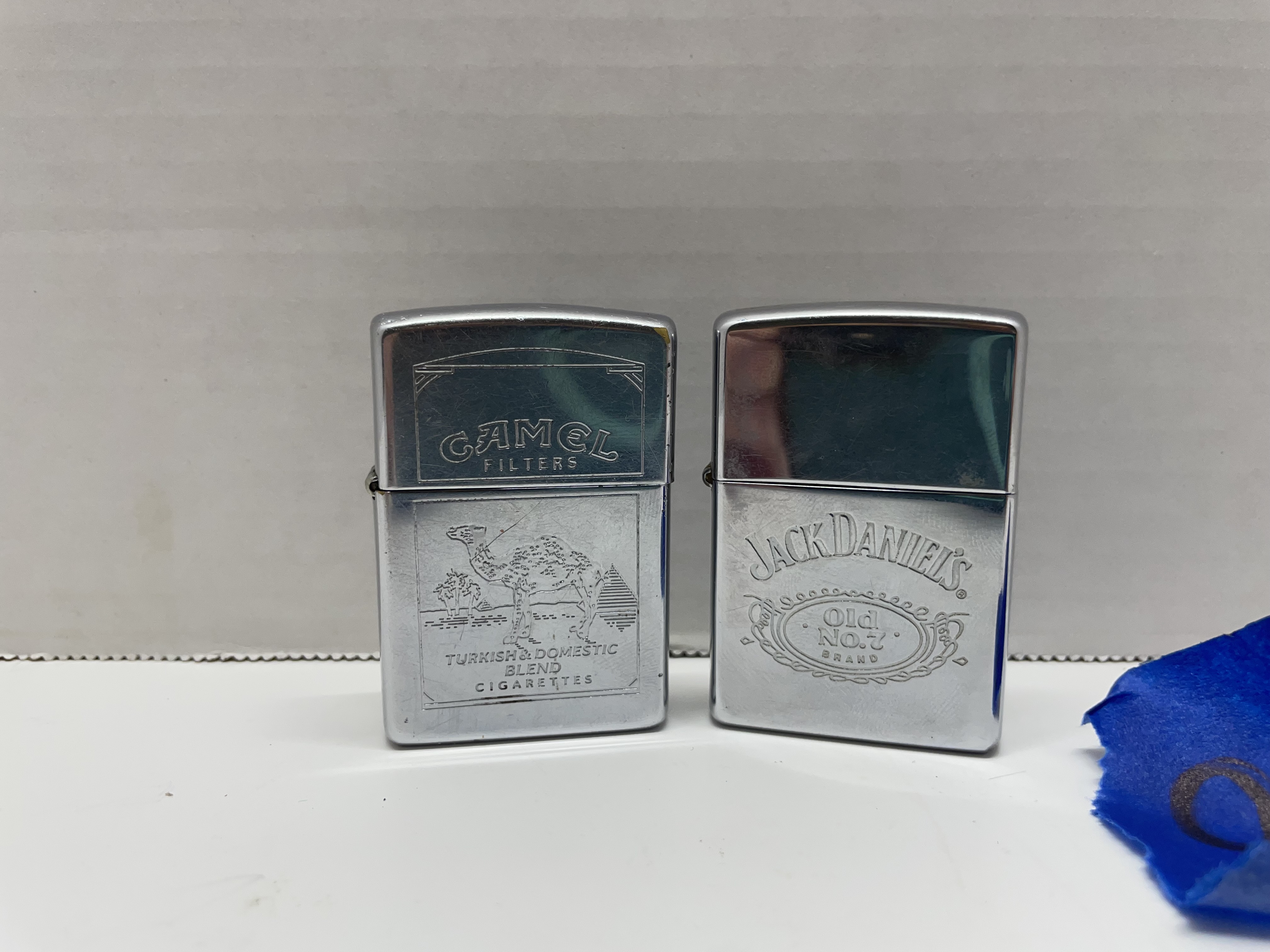 Jack Daniel’s Zippo, works but needs fuel Camel Zippo, works