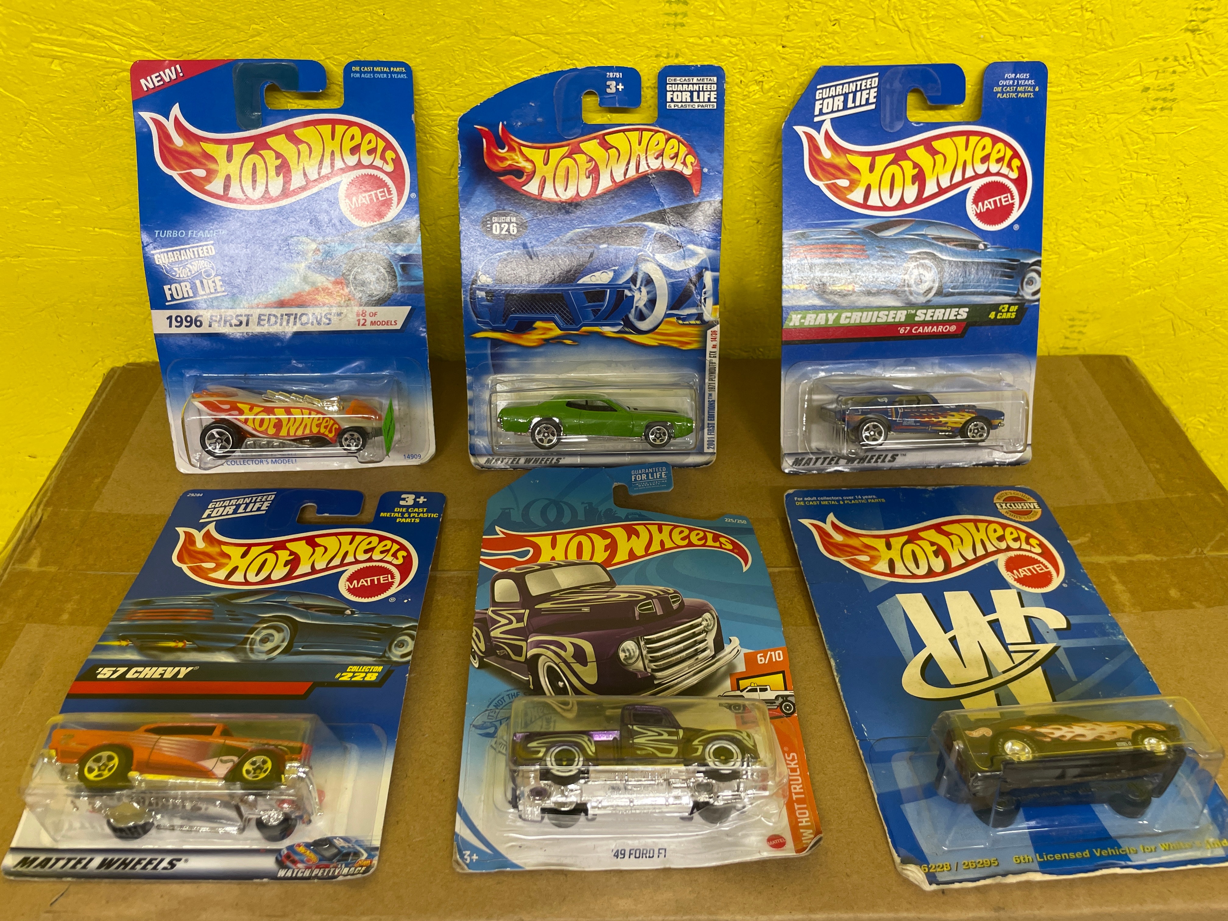Each package prominently features the "Hot Wheels" and "Mattel" logos, along with text indicating "Guaranteed For Life" and "Die-Cast Metal & Plastic Parts."