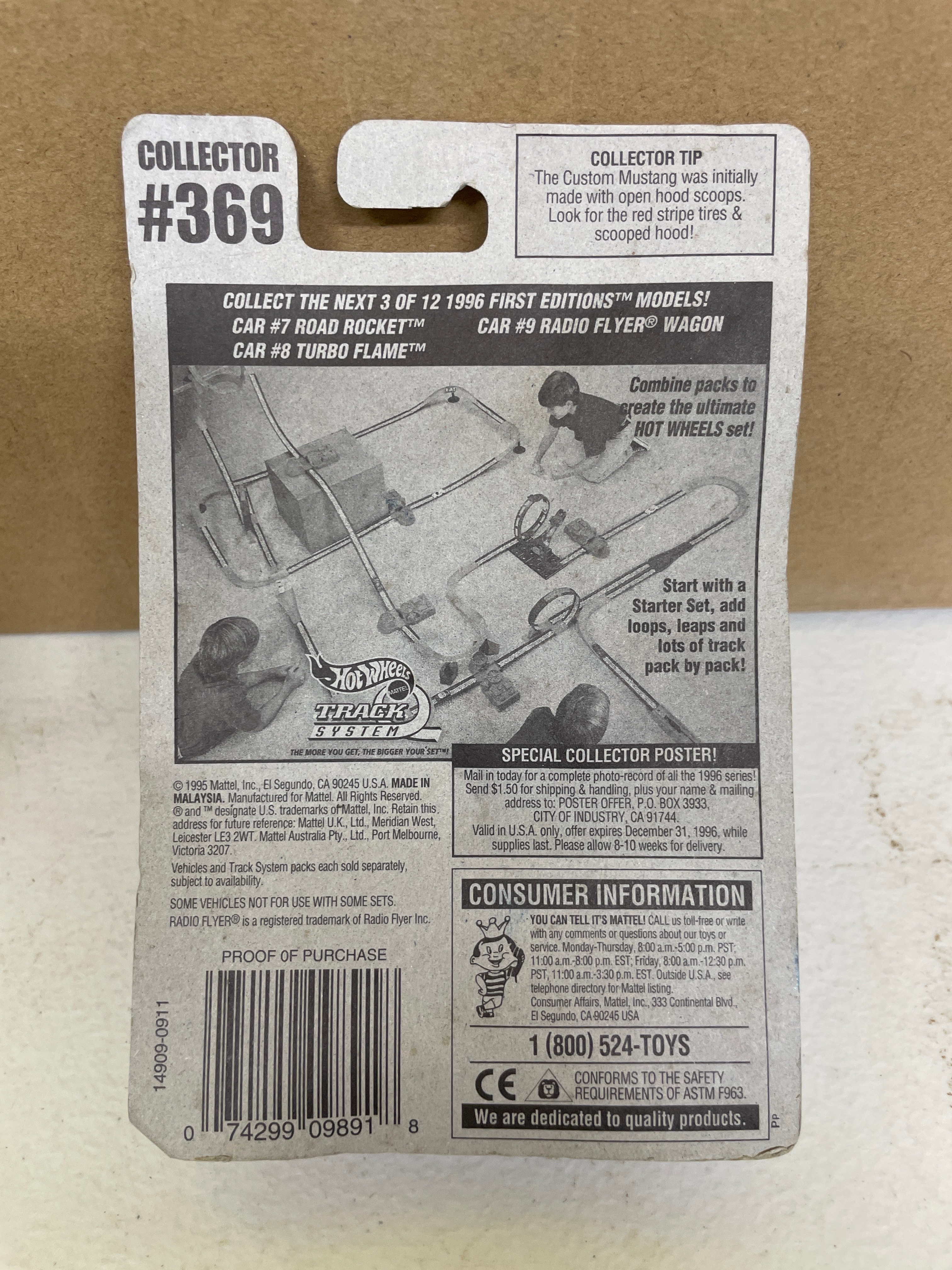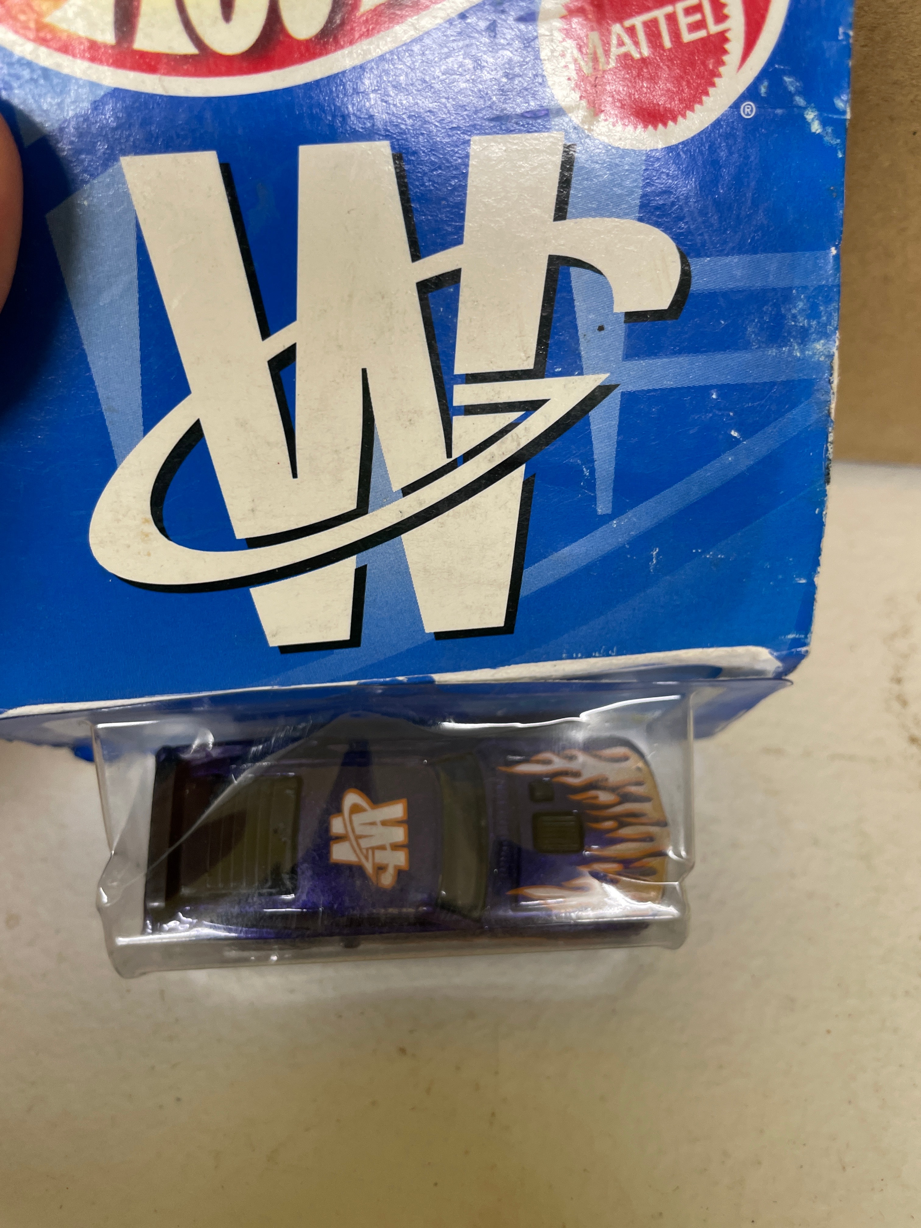 A group of six Hot Wheels brand die-cast metal and plastic toy vehicles, each sealed in its original blister packaging. The collection includes models from 1996, 1998, 1999, 2000, and 2020. Specific vehicles are:
