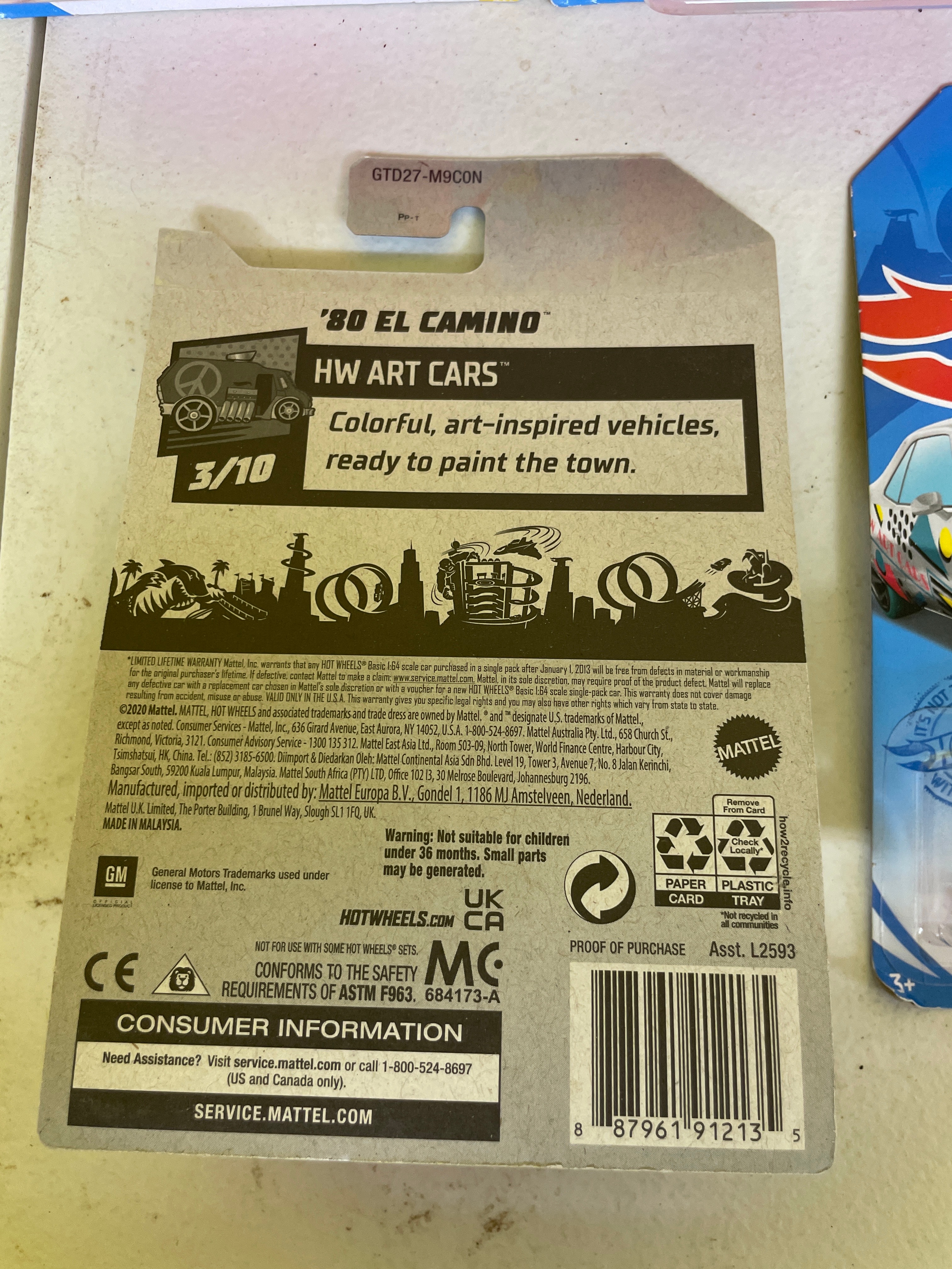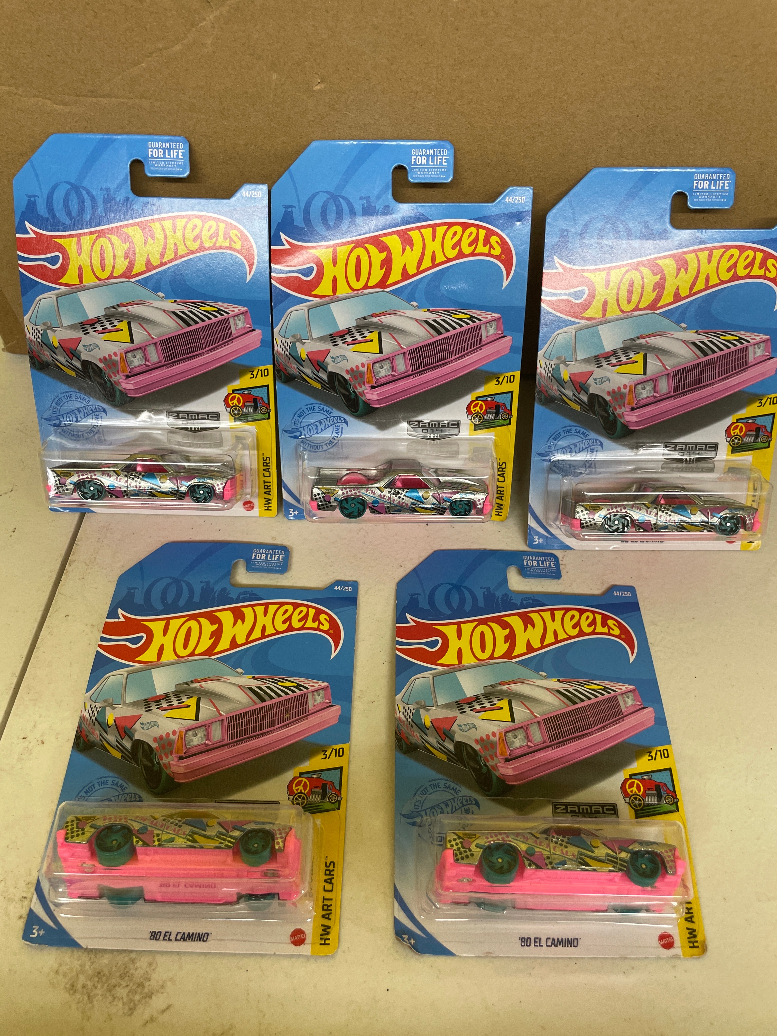 A Group of Five Hot Wheels 2021 '80 El Camino HW Art Cars 3/10, including Three ZAMAC Editions