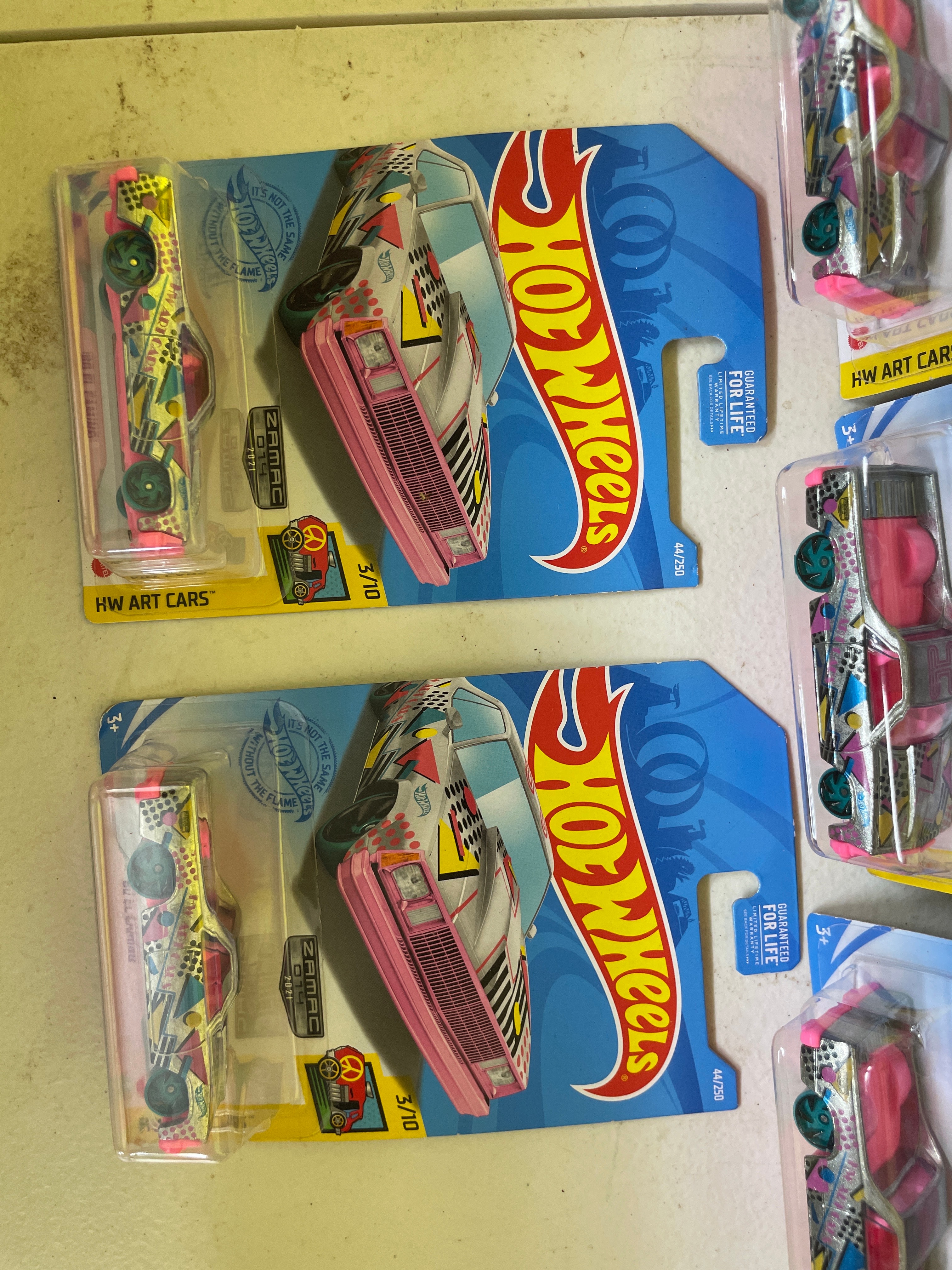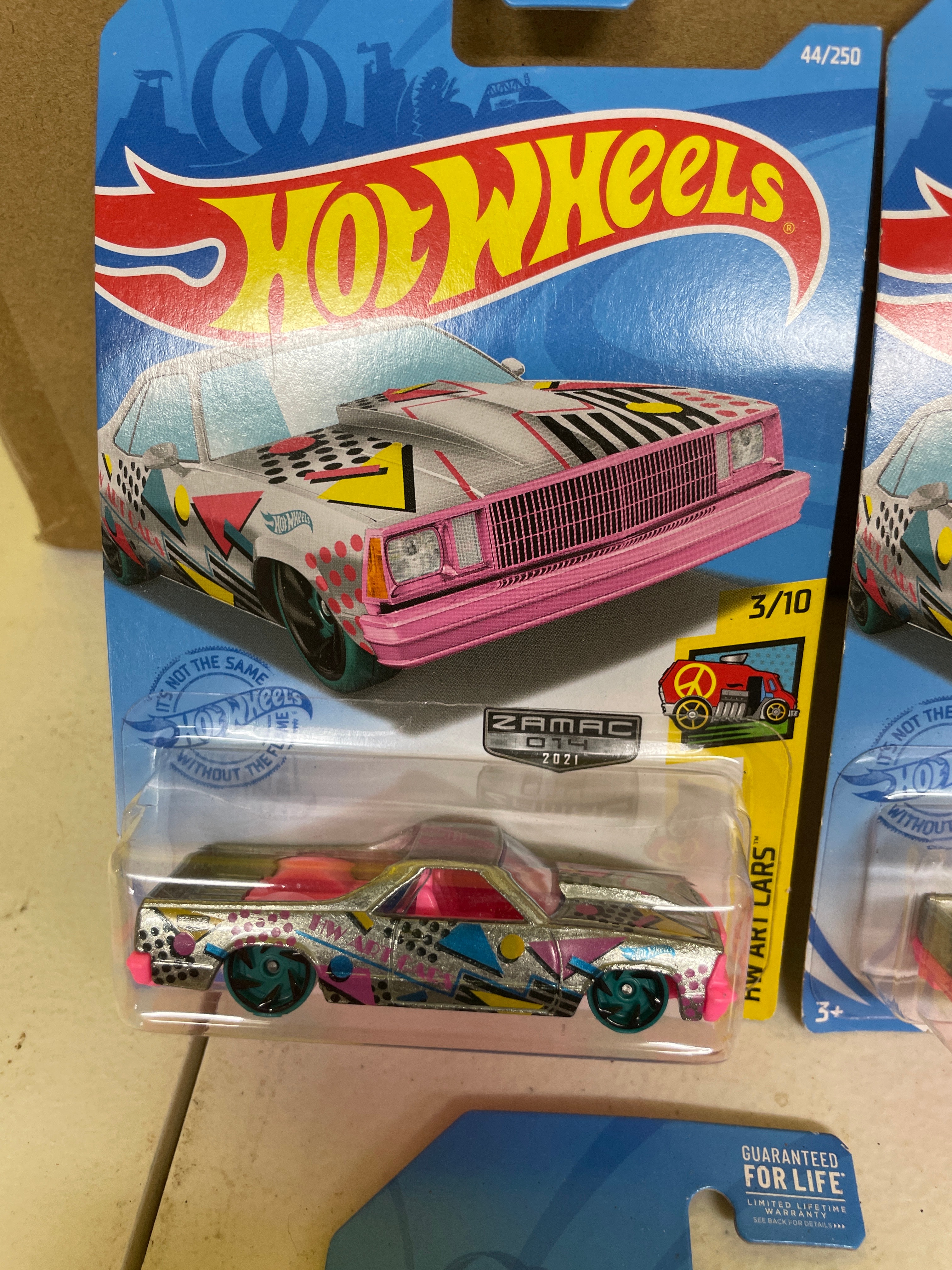 A group of five Hot Wheels 2021 ’80 El Camino HW Art Cars 3/10 die-cast toy vehicles. Each car, made from die-cast metal and plastic, features an abstract, multi-colored livery in pink, white, green, and black geometric patterns, complemented by teal-colored wheels. Three of the five items are identified as ‘ZAMAC 2021’ editions, indicating an unpainted metallic finish. These vehicles are part of the 2021 mainline, identified as 44/250 overall. All items are presented in their original, unopened blue and yellow carded blister packaging. Visible markings on the reverse include ‘GUARANTEED FOR LIFE, ‘ ‘3+, ‘ ‘Made in Malaysia, ‘ and model number GTD27-M9C0N.
