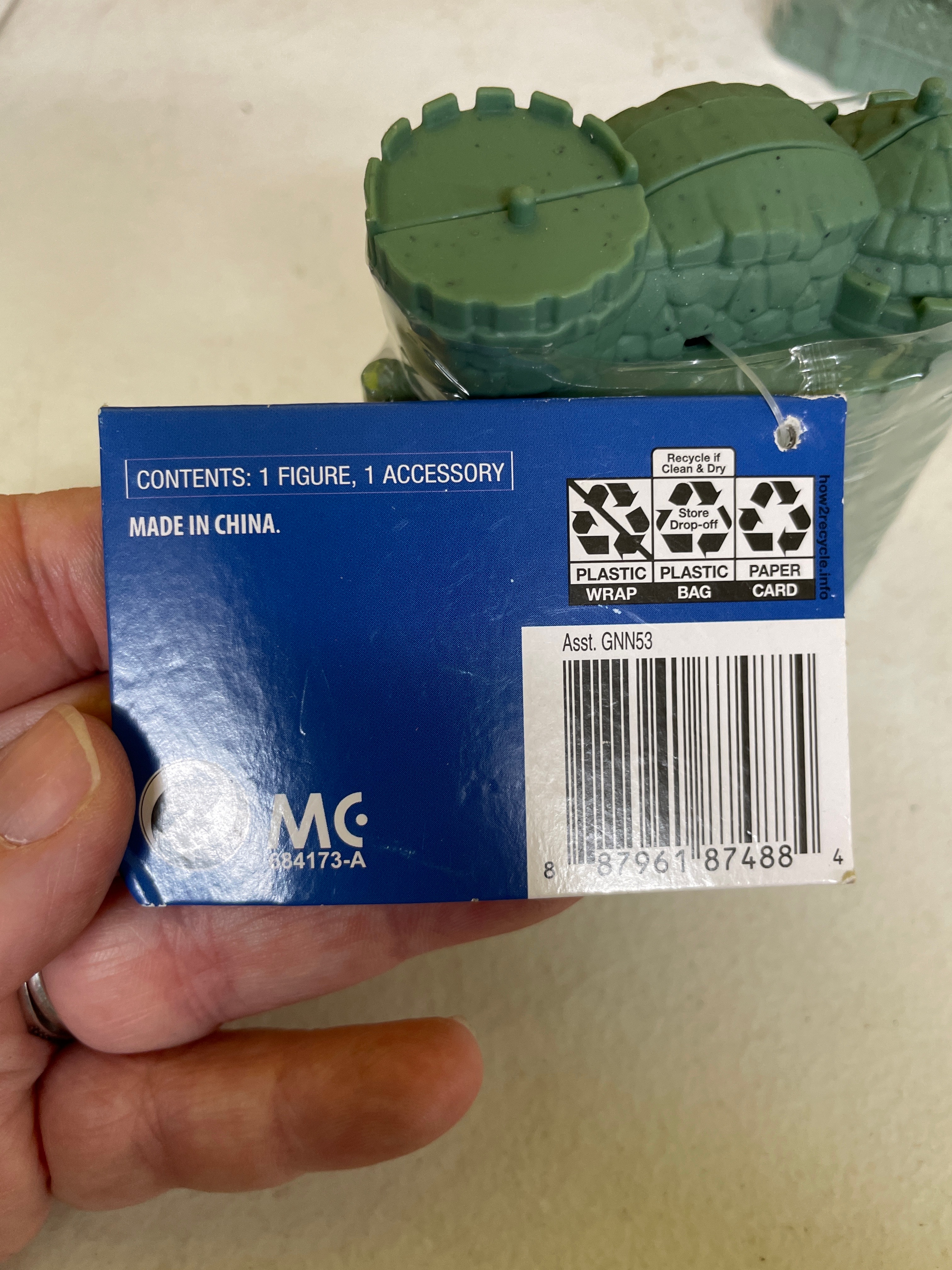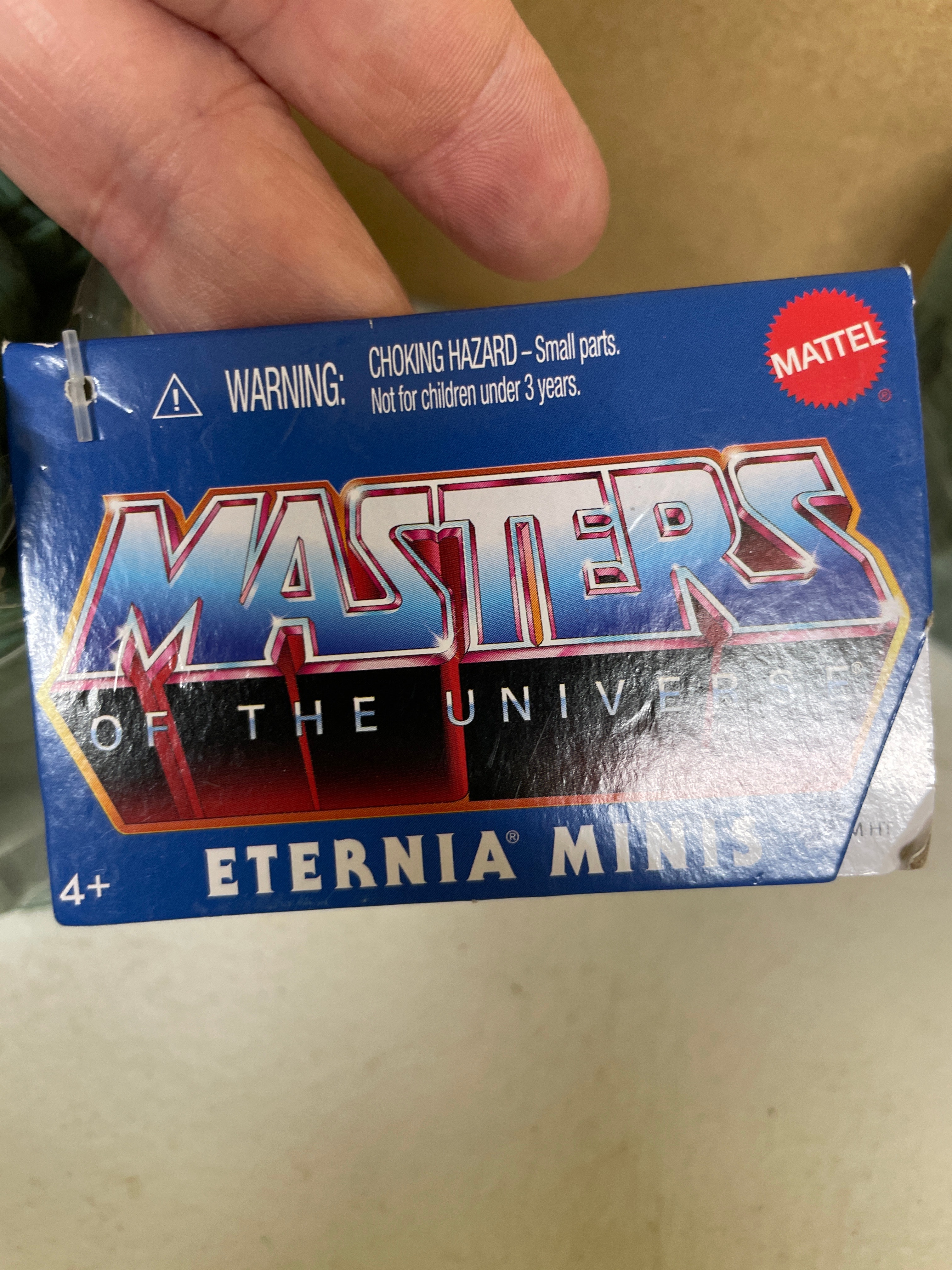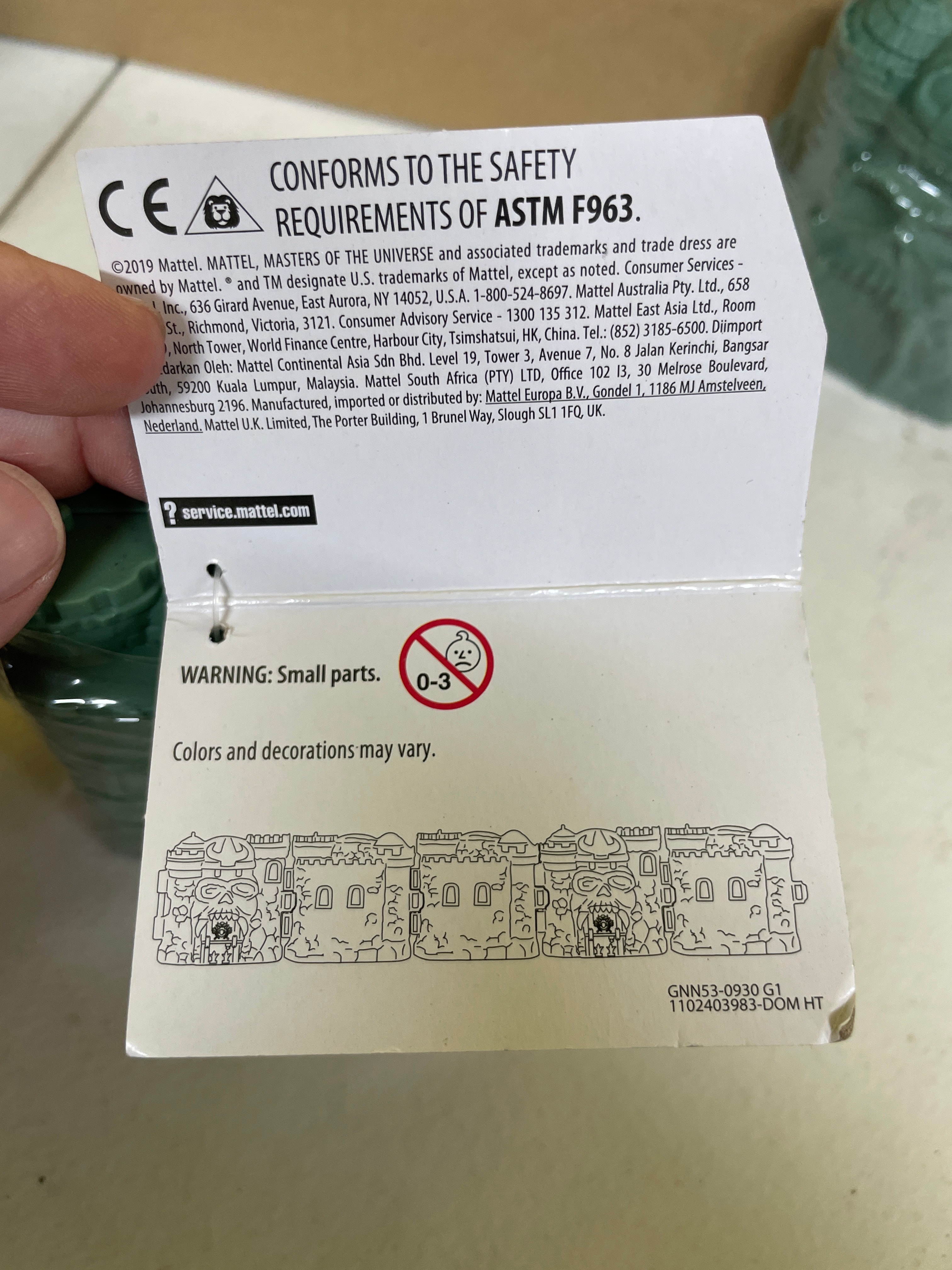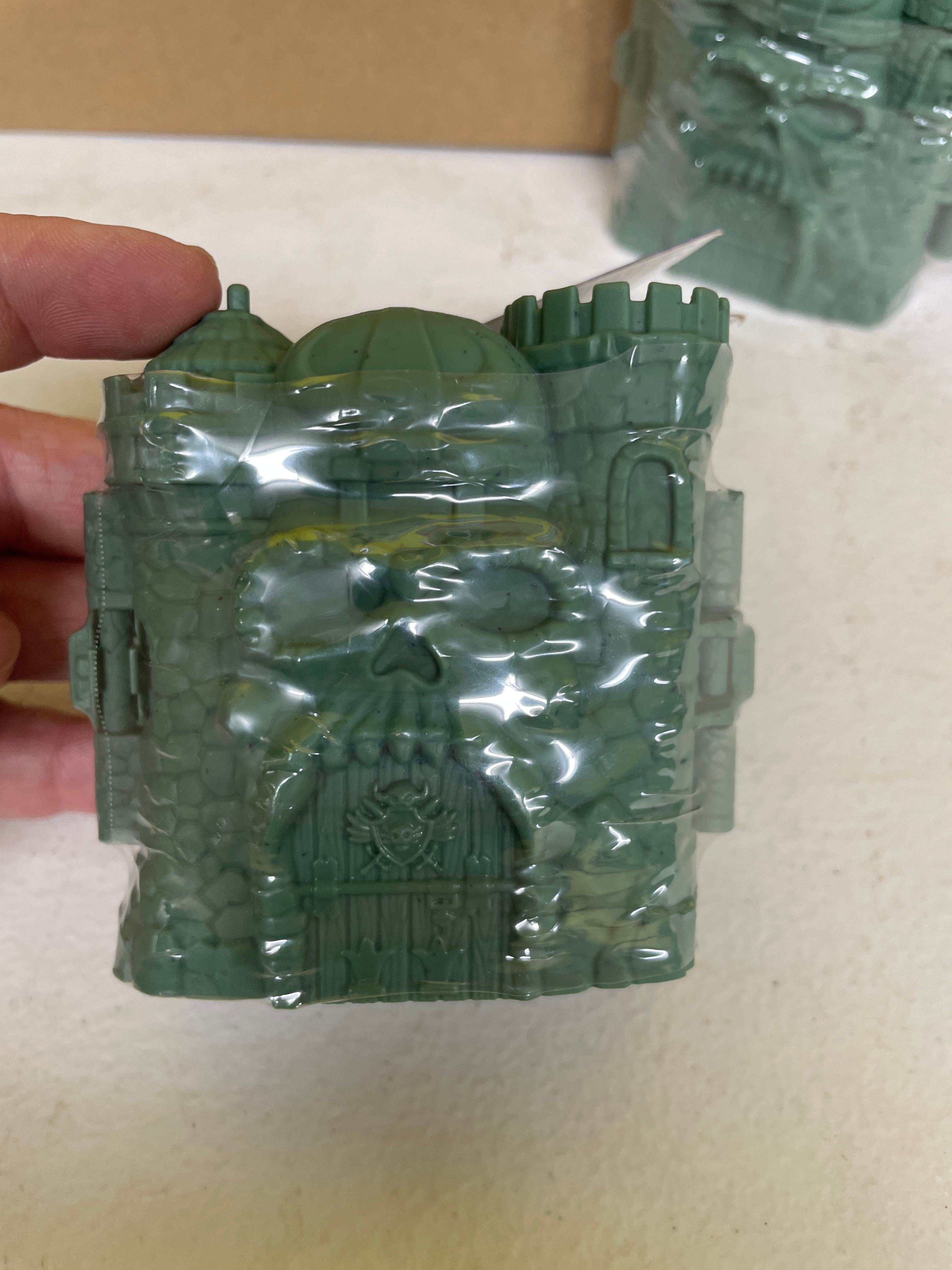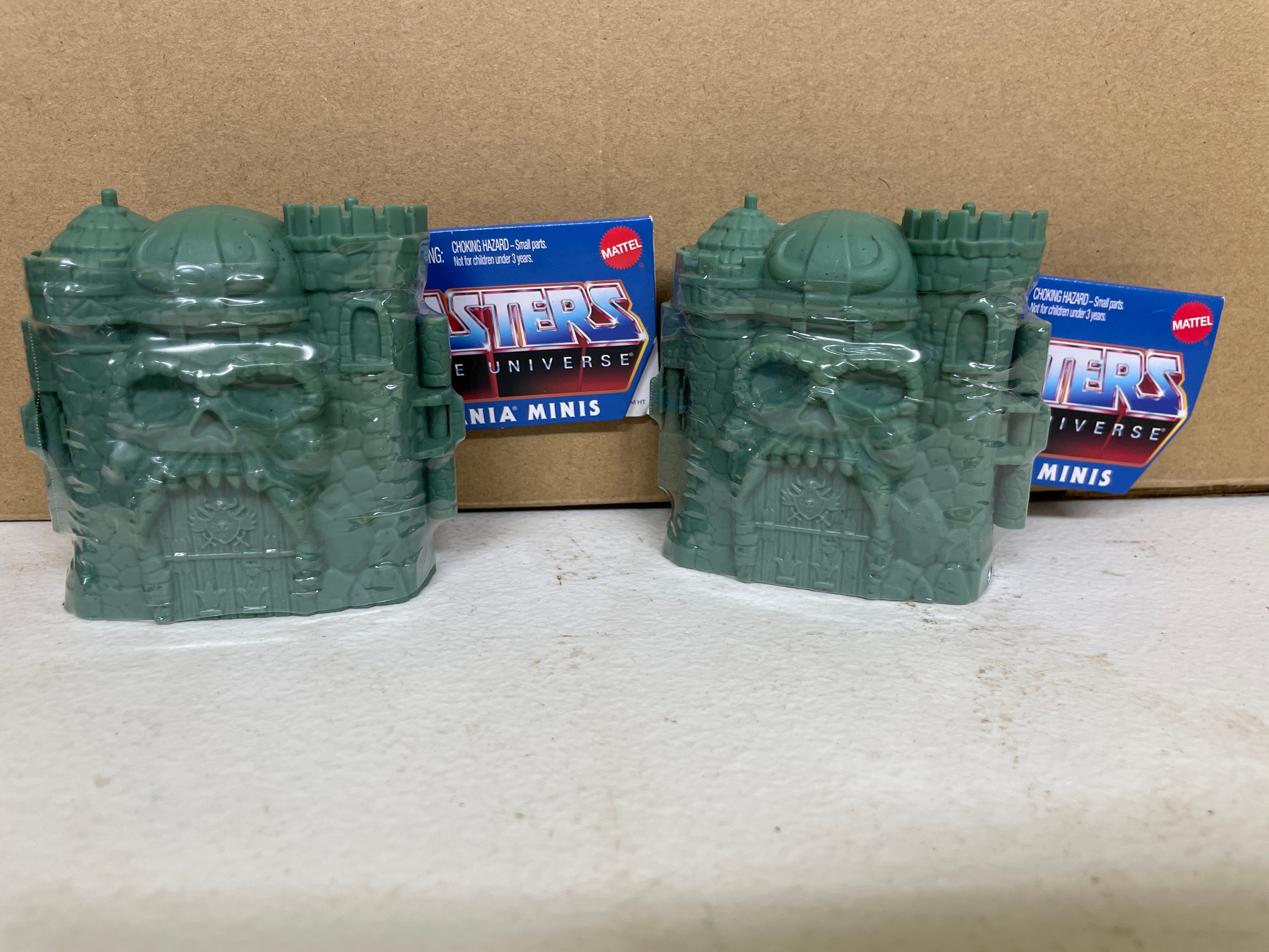 A pair of Mattel Masters of the Universe Eternia Minis Castle Grayskull blind packs. Each miniature dark green plastic castle-like structure is individually sealed in clear plastic wrap with an attached blue and white paper tag. The tags bear ‘MATTEL’ branding, ‘©2019 Mattel’ copyright, and ‘MADE IN CHINA.’ They also state ‘WARNING: CHOKING HAZARD – Small parts. Not for children under 3 years, ‘ ‘CONTENTS: 1 FIGURE, 1 ACCESSORY, ‘ and include the product identifier ‘Asst. GNN53’ along with a barcode.
