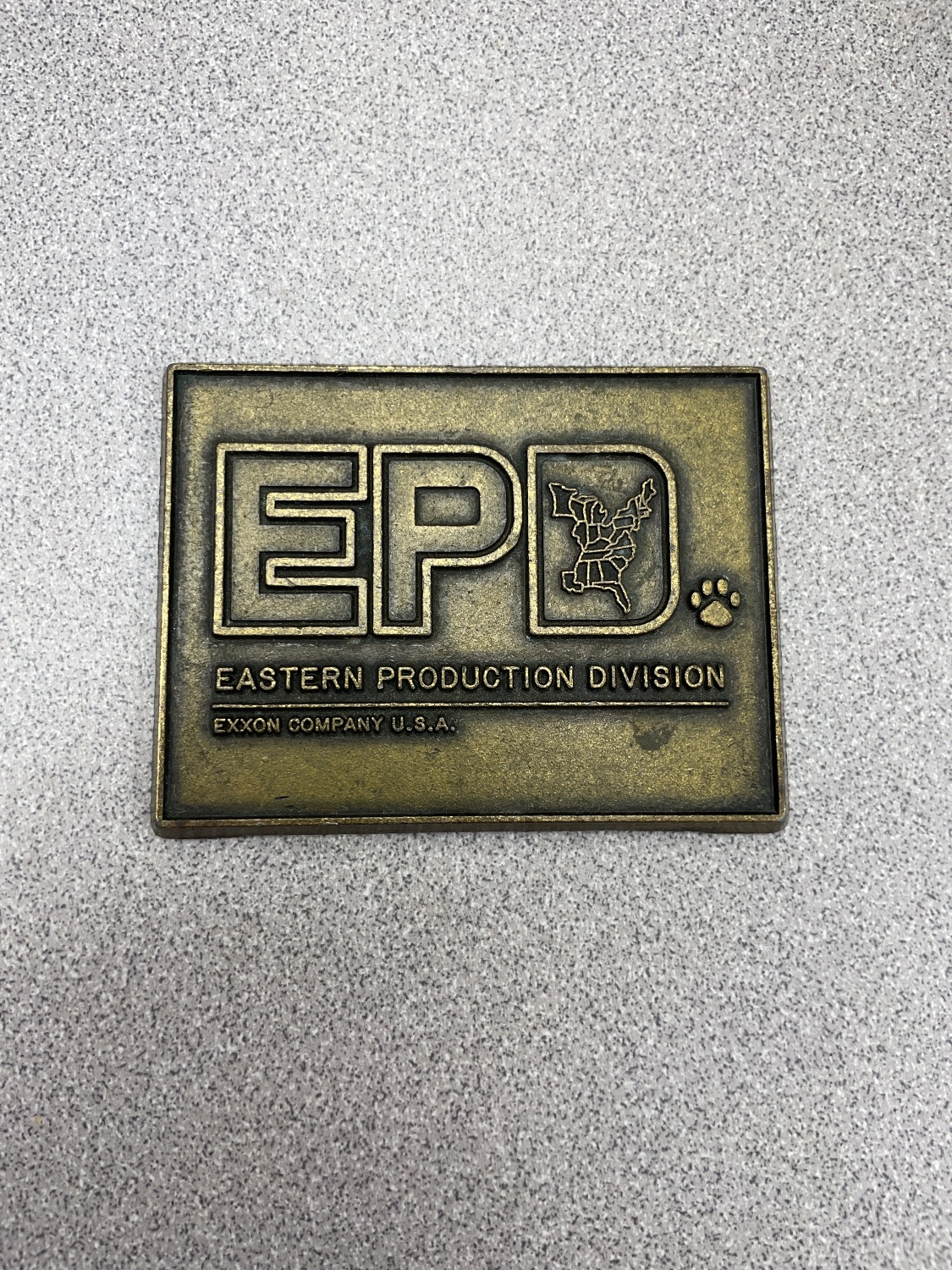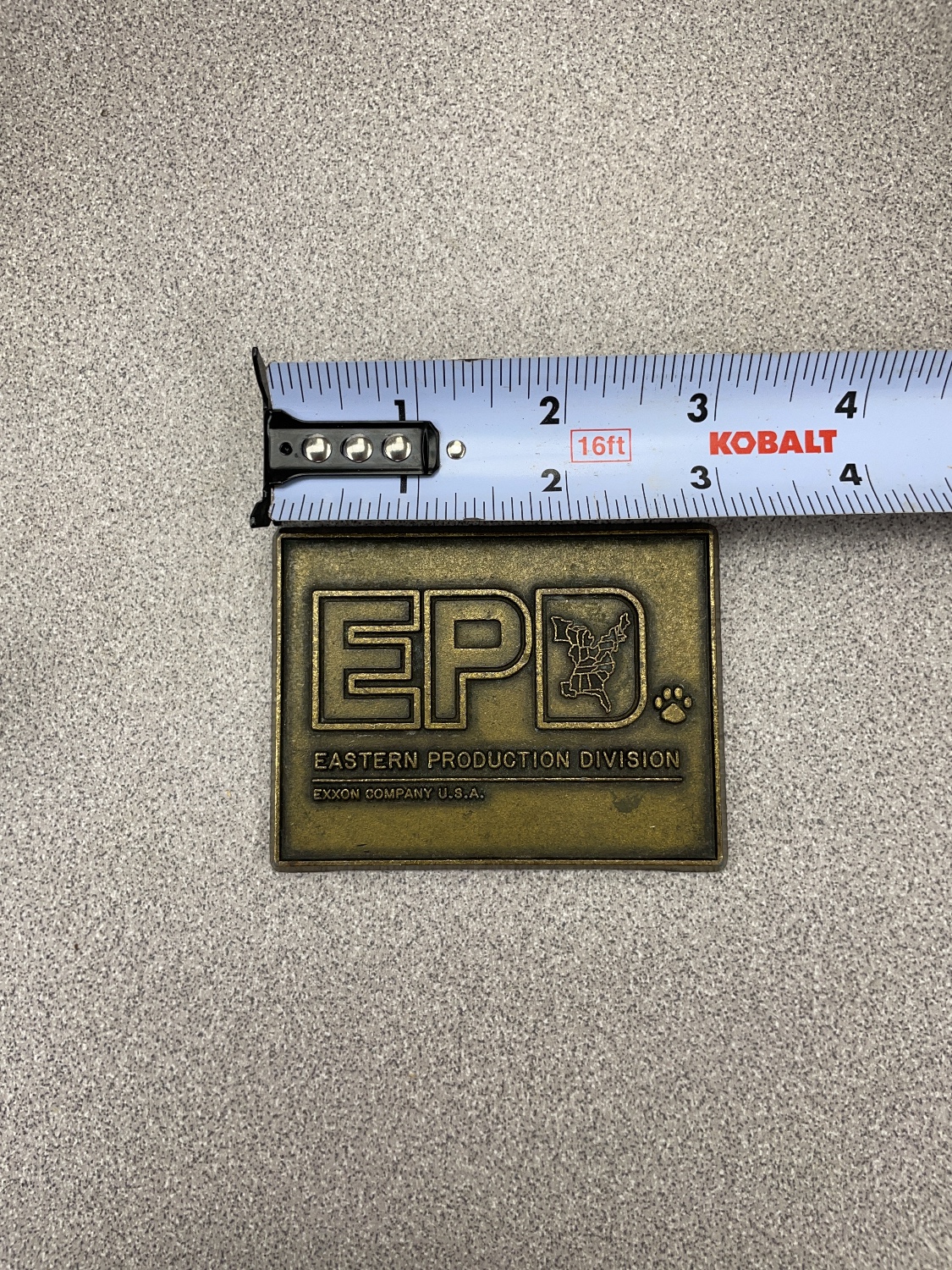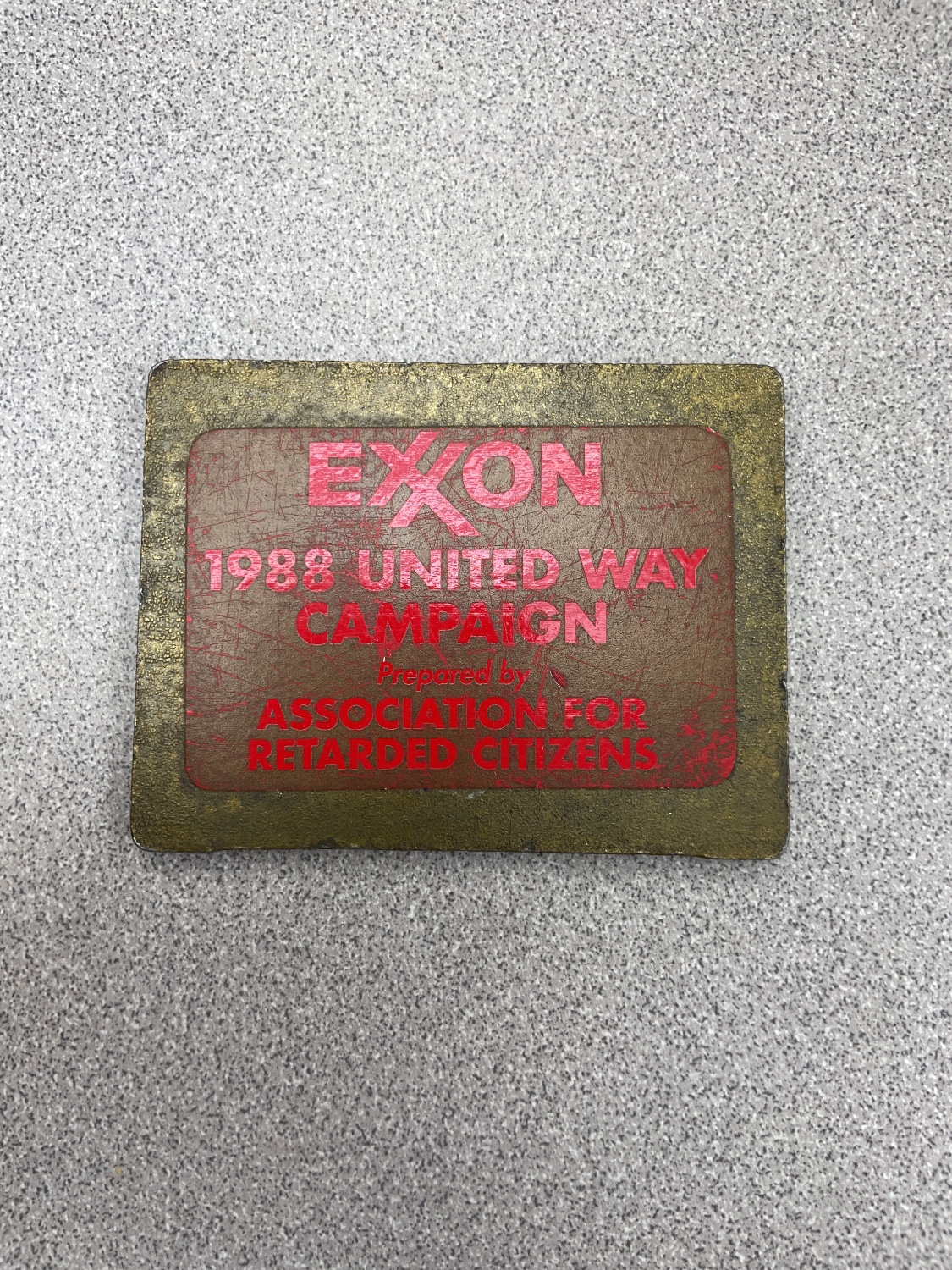 A small, rectangular commemorative plaque or medallion, crafted from a brass or bronze-toned metal. The front features raised text "EPD" centrally, with a map-like emblem and a paw print to its right, below which reads "EASTERN PRODUCTION DIVISION" and "EXXON COMPANY U.S.A.". The reverse displays a red adhesive label with the text "EXXON", "1988 UNITED WAY CAMPAIGN", "Prepared by", and "ASSOCIATION FOR RETARDED CITIZENS", clearly dating the piece to the late 20th century.