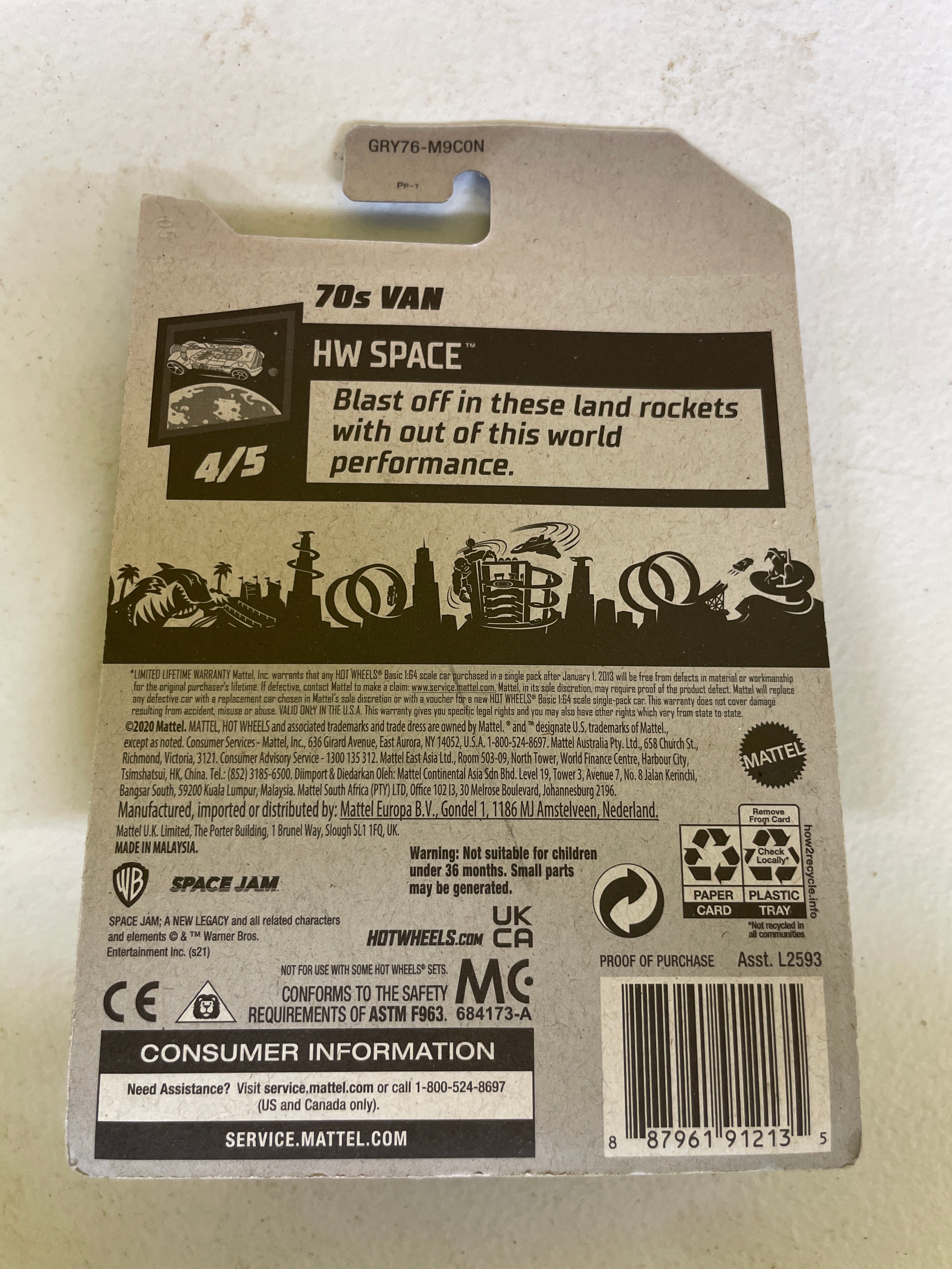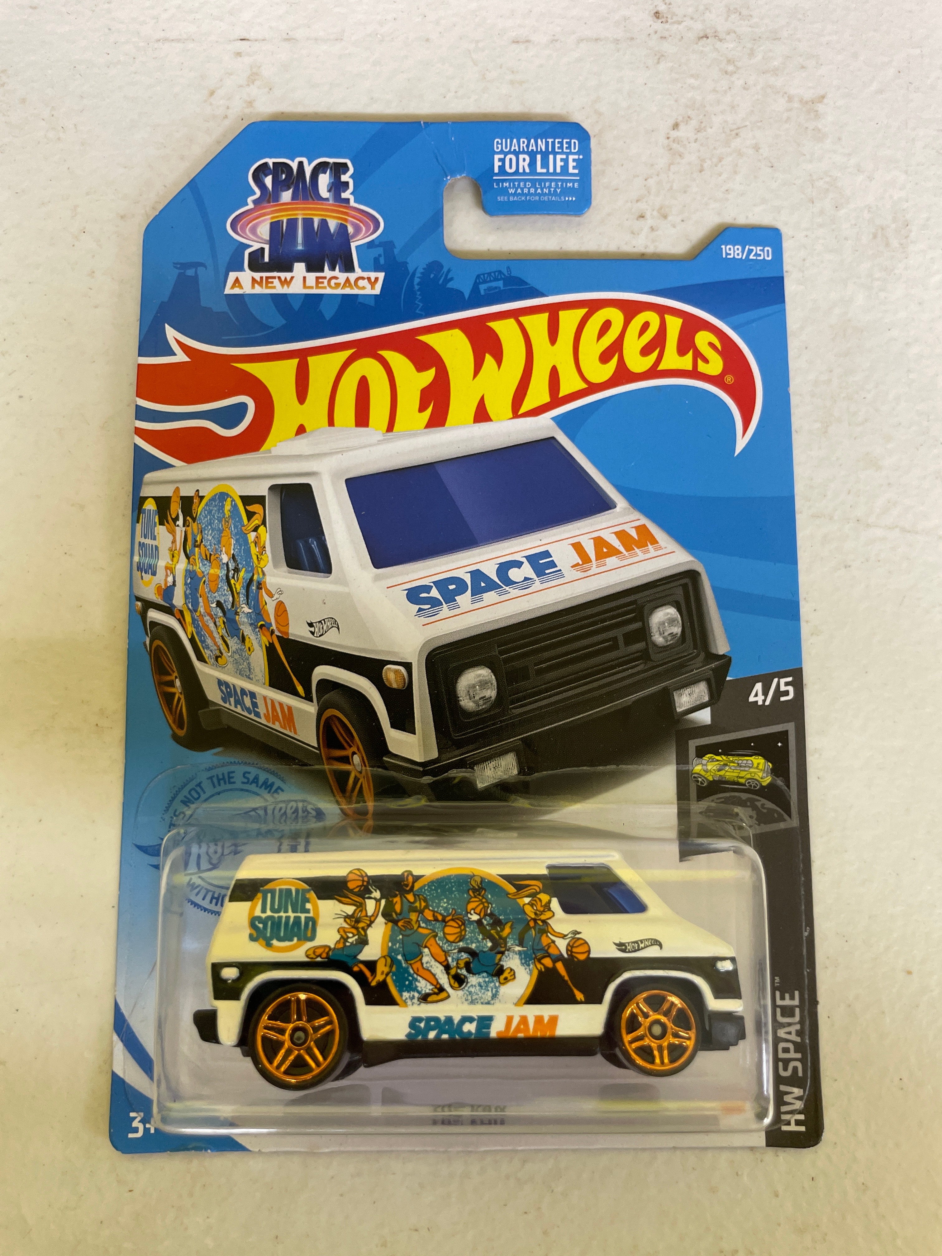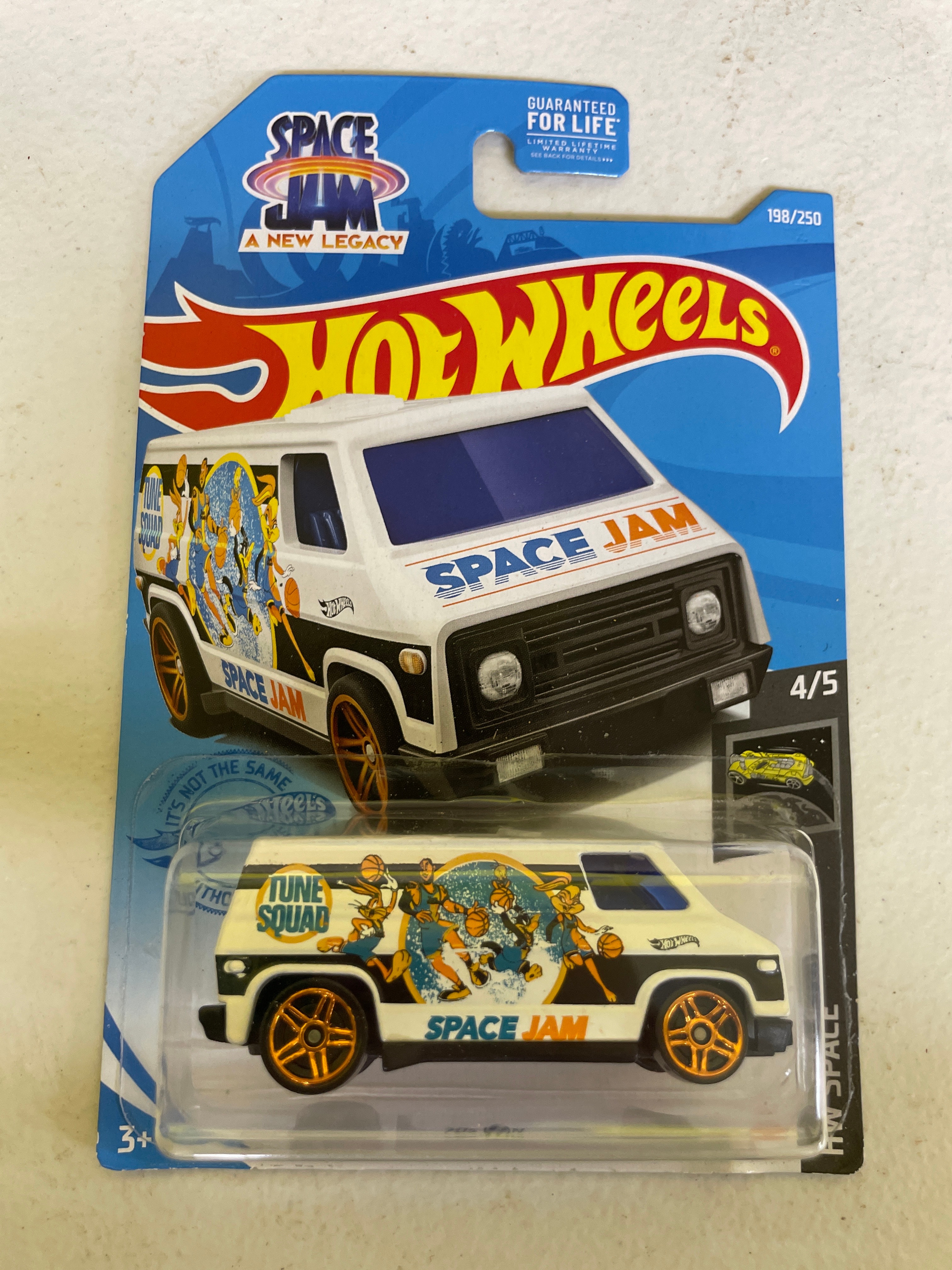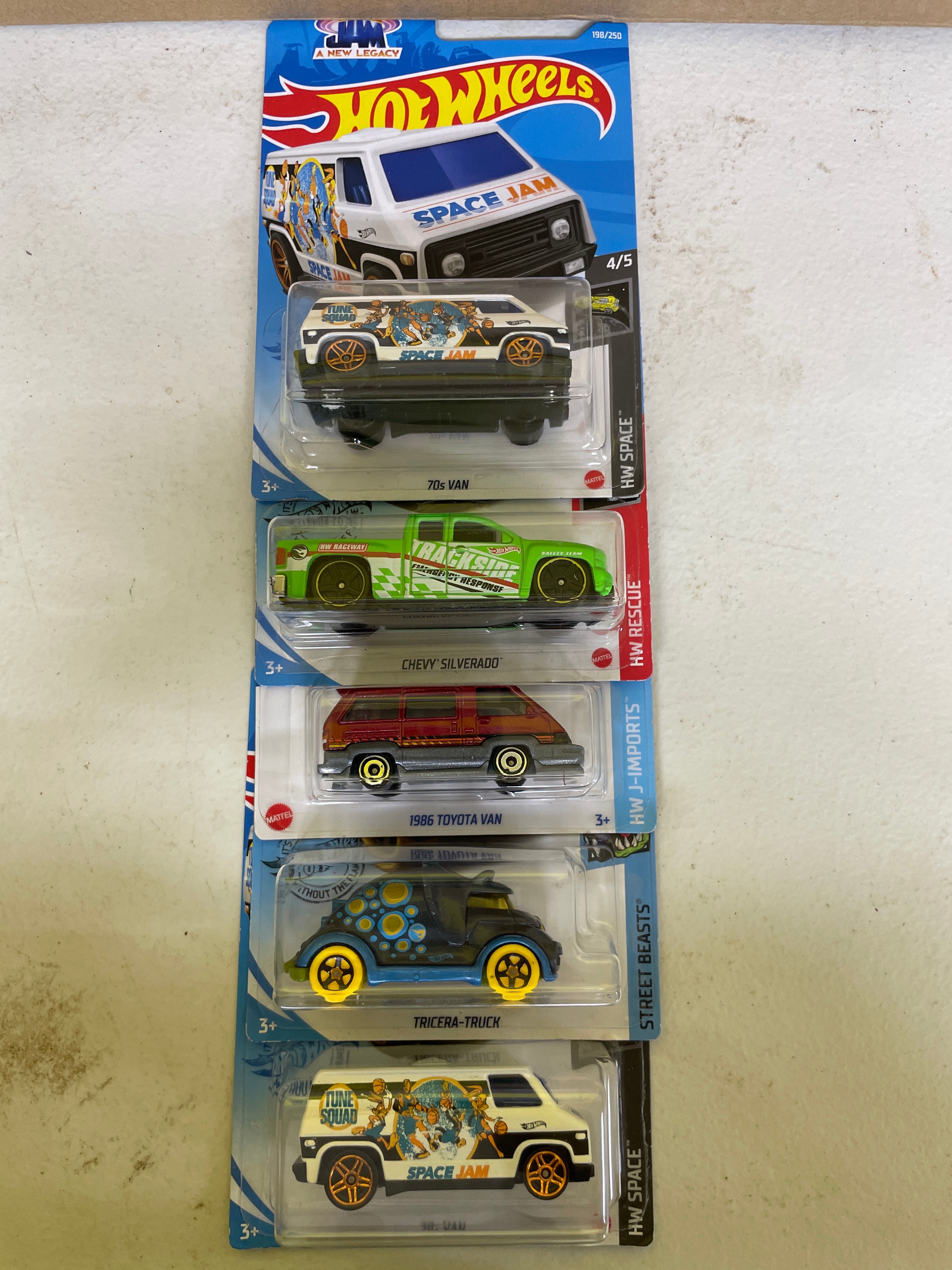 A collection of five Hot Wheels die-cast toy vehicles, each sealed in its original plastic blister packaging on a cardboard card. The collection includes two identical ’70s Van’ models, white with ‘Space Jam: A New Legacy’ ‘Tune Squad’ cartoon graphics, identified as 198/250 and 4/5 within the ‘HW Space™’ series, copyrighted 2020. Also present is a green ‘Chevy Silverado’ pickup truck featuring ‘Trackside Safety Team’ livery, from the ‘HW Rescue™’ series (240/250, 10/10), copyrighted 2020. A red ‘1986 Toyota Van, ‘ marked ‘NEW FOR 2022’ and part of the ‘HW J-Imports™’ series (173/250, 7/10), copyrighted 2021, is included. The final item is a black, blue, and yellow ‘Tricera-Truck, ‘ a stylized, fictional dinosaur-inspired vehicle from the ‘Street Beasts®’ series (212/250, 10/10), copyrighted 2017. All packaging consistently displays ‘Hot Wheels’ branding, specific series names, unique identifying codes (GRY76-M9C0N, GHD76-D9C0P, HCT15-M9C0J, GHD80-D9C0M), age recommendations (‘3+’), ‘MADE IN MALAYSIA’ origin, ‘Guaranteed For Life’ seals, and various safety compliance markings (CE, ASTM F963). The vehicles are primarily constructed from die-cast metal and plastic.