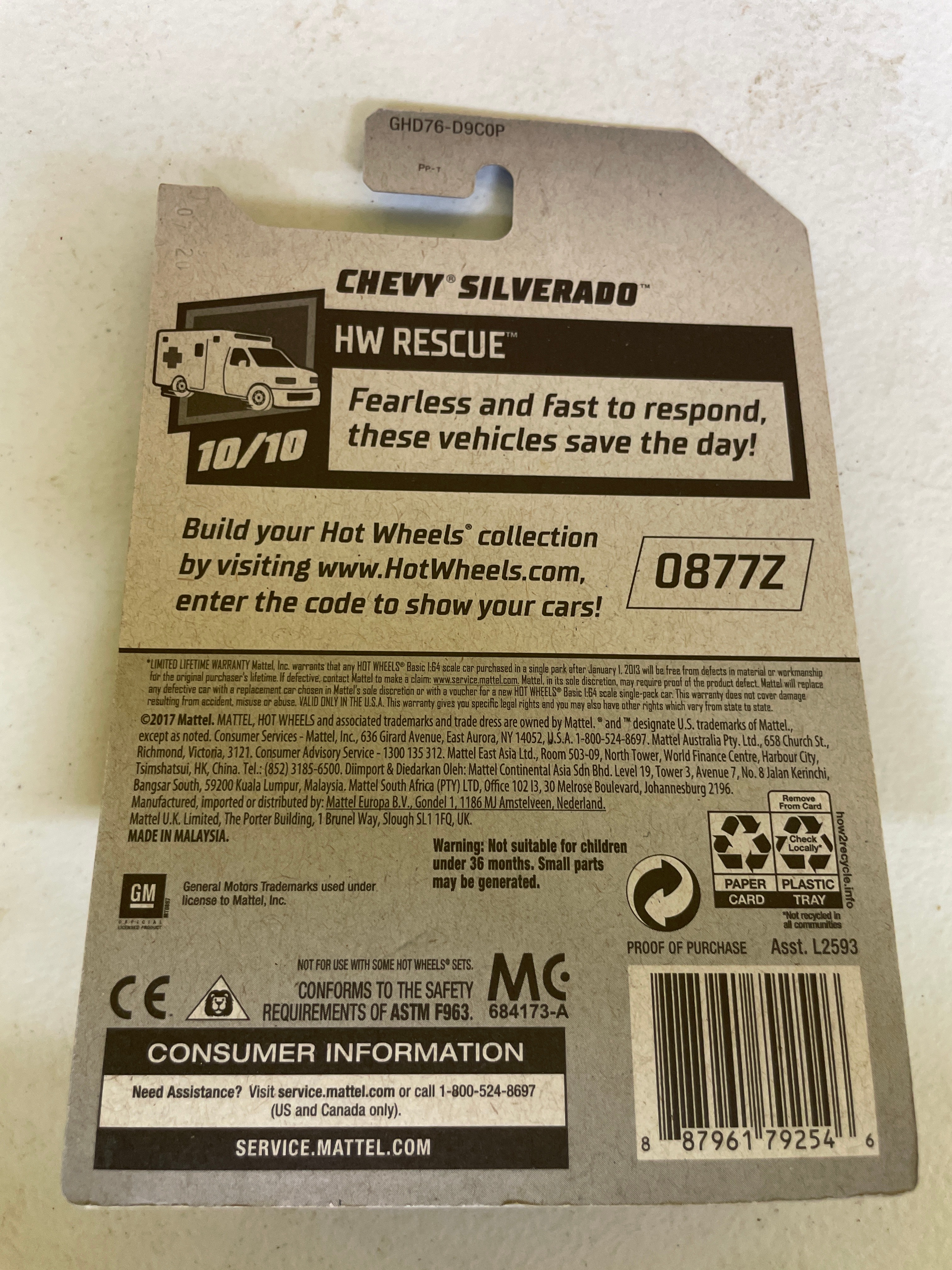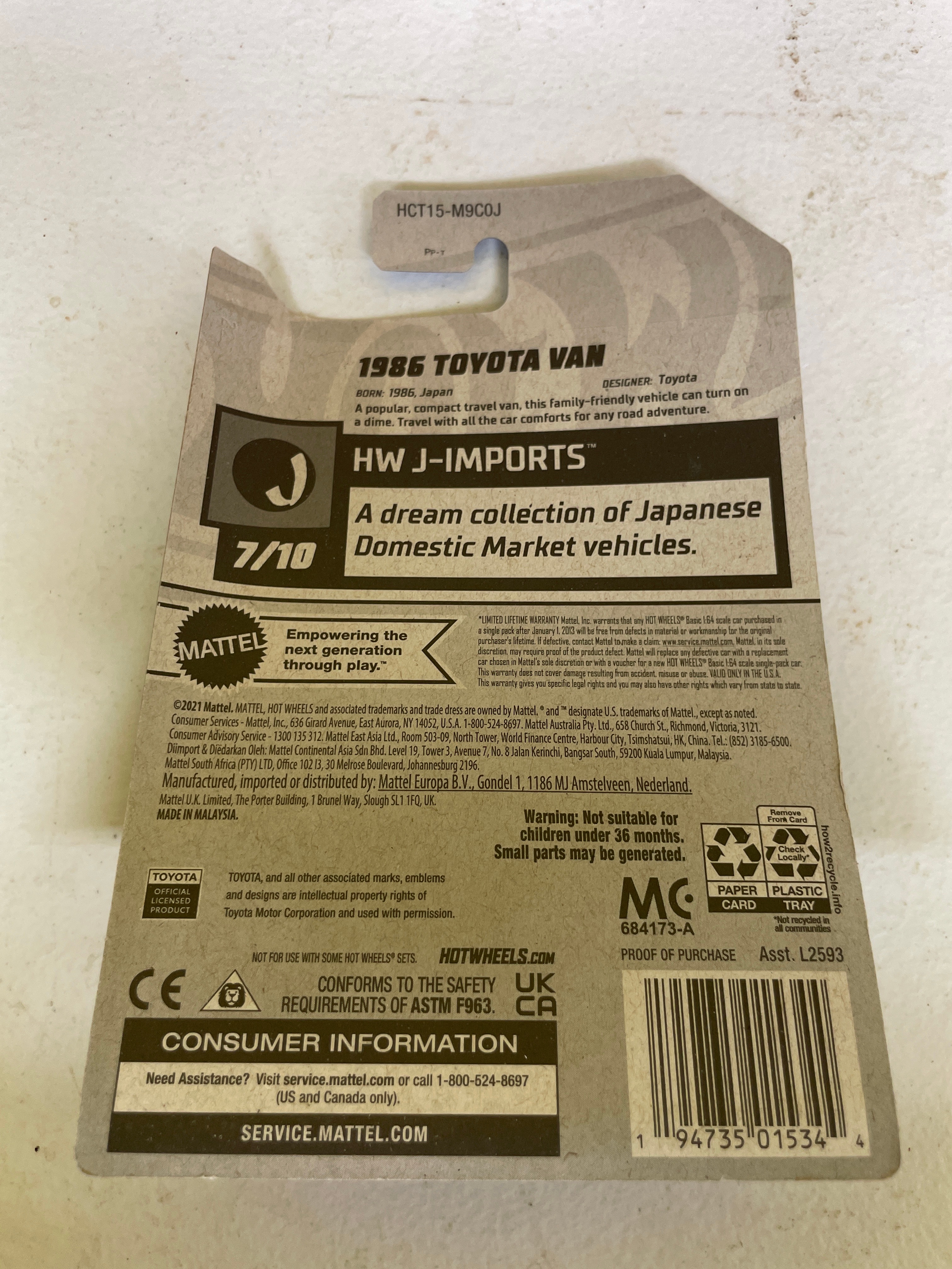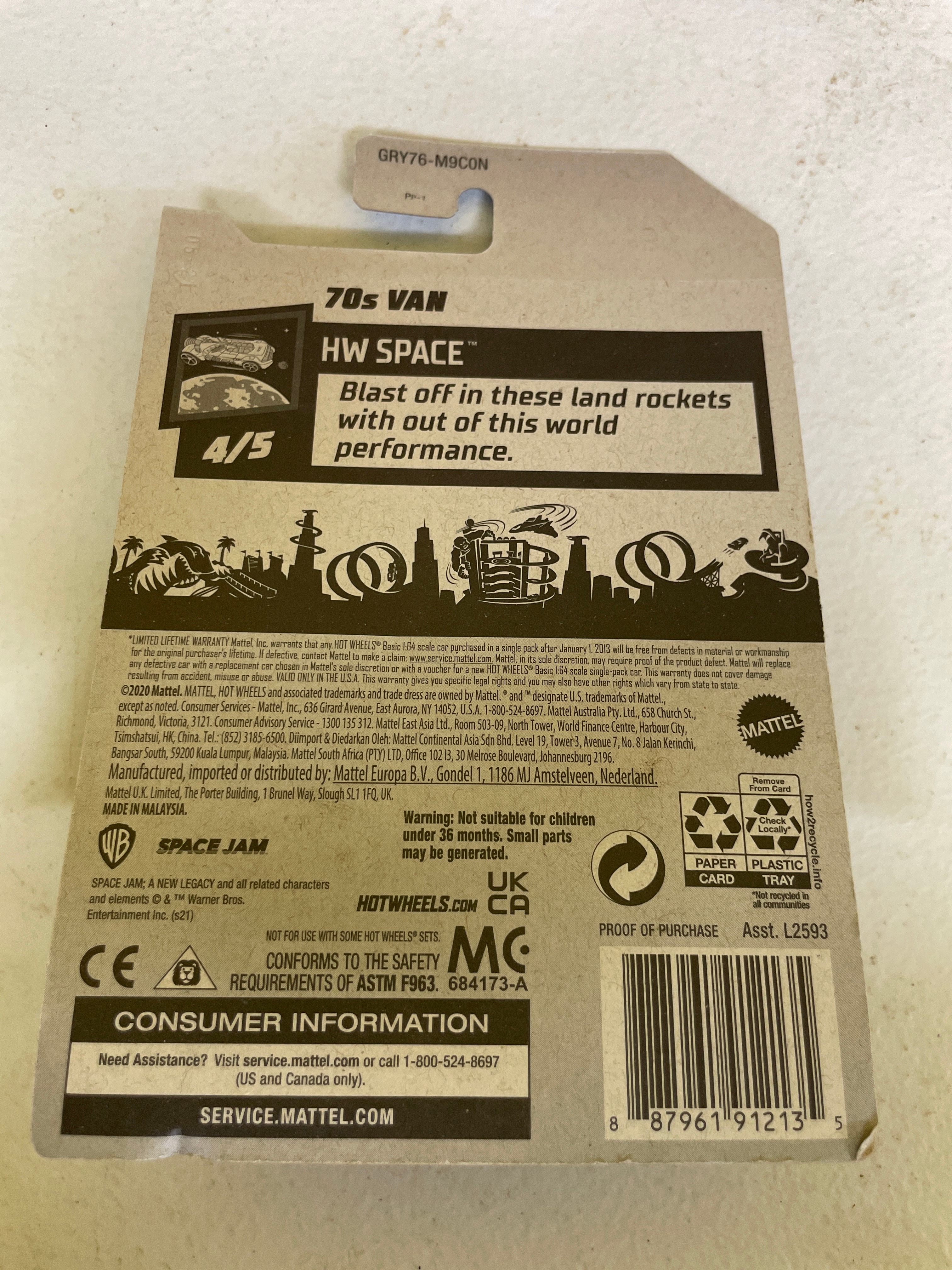 A collection of five Hot Wheels die-cast toy vehicles, each sealed in its original plastic blister packaging on a cardboard card. The collection includes two identical ’70s Van’ models, white with ‘Space Jam: A New Legacy’ ‘Tune Squad’ cartoon graphics, identified as 198/250 and 4/5 within the ‘HW Space™’ series, copyrighted 2020. Also present is a green ‘Chevy Silverado’ pickup truck featuring ‘Trackside Safety Team’ livery, from the ‘HW Rescue™’ series (240/250, 10/10), copyrighted 2020. A red ‘1986 Toyota Van, ‘ marked ‘NEW FOR 2022’ and part of the ‘HW J-Imports™’ series (173/250, 7/10), copyrighted 2021, is included. The final item is a black, blue, and yellow ‘Tricera-Truck, ‘ a stylized, fictional dinosaur-inspired vehicle from the ‘Street Beasts®’ series (212/250, 10/10), copyrighted 2017. All packaging consistently displays ‘Hot Wheels’ branding, specific series names, unique identifying codes (GRY76-M9C0N, GHD76-D9C0P, HCT15-M9C0J, GHD80-D9C0M), age recommendations (‘3+’), ‘MADE IN MALAYSIA’ origin, ‘Guaranteed For Life’ seals, and various safety compliance markings (CE, ASTM F963). The vehicles are primarily constructed from die-cast metal and plastic.