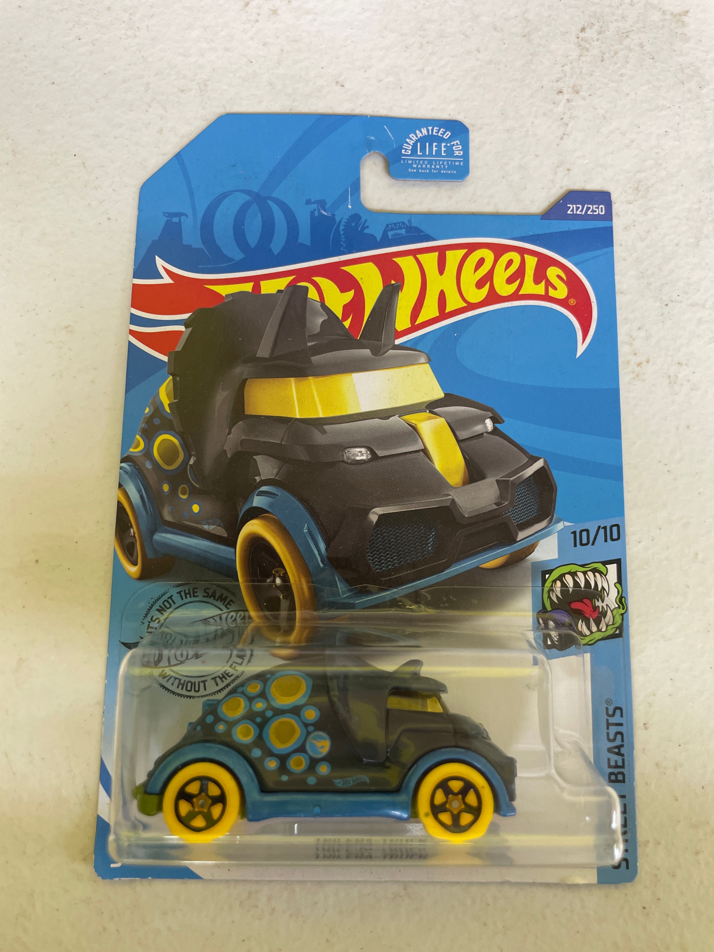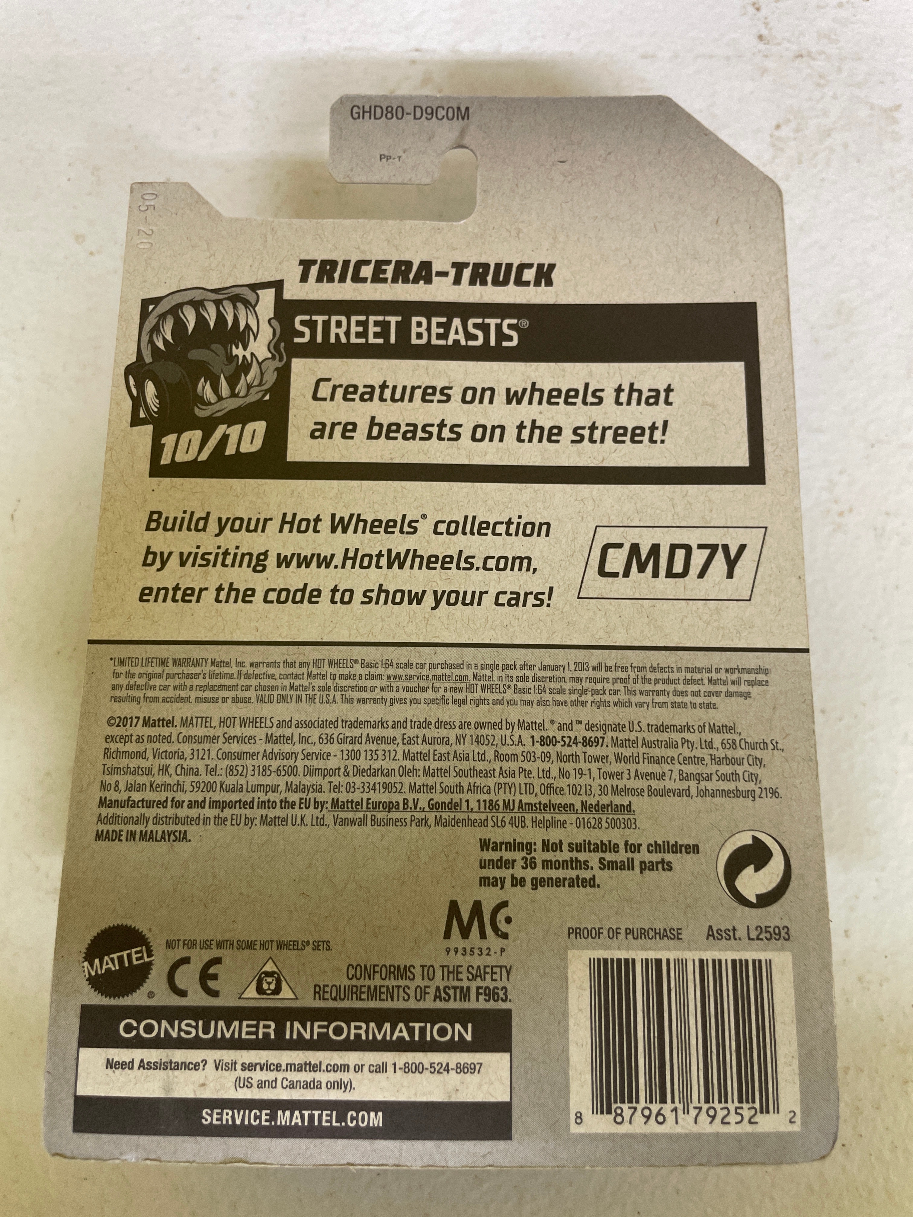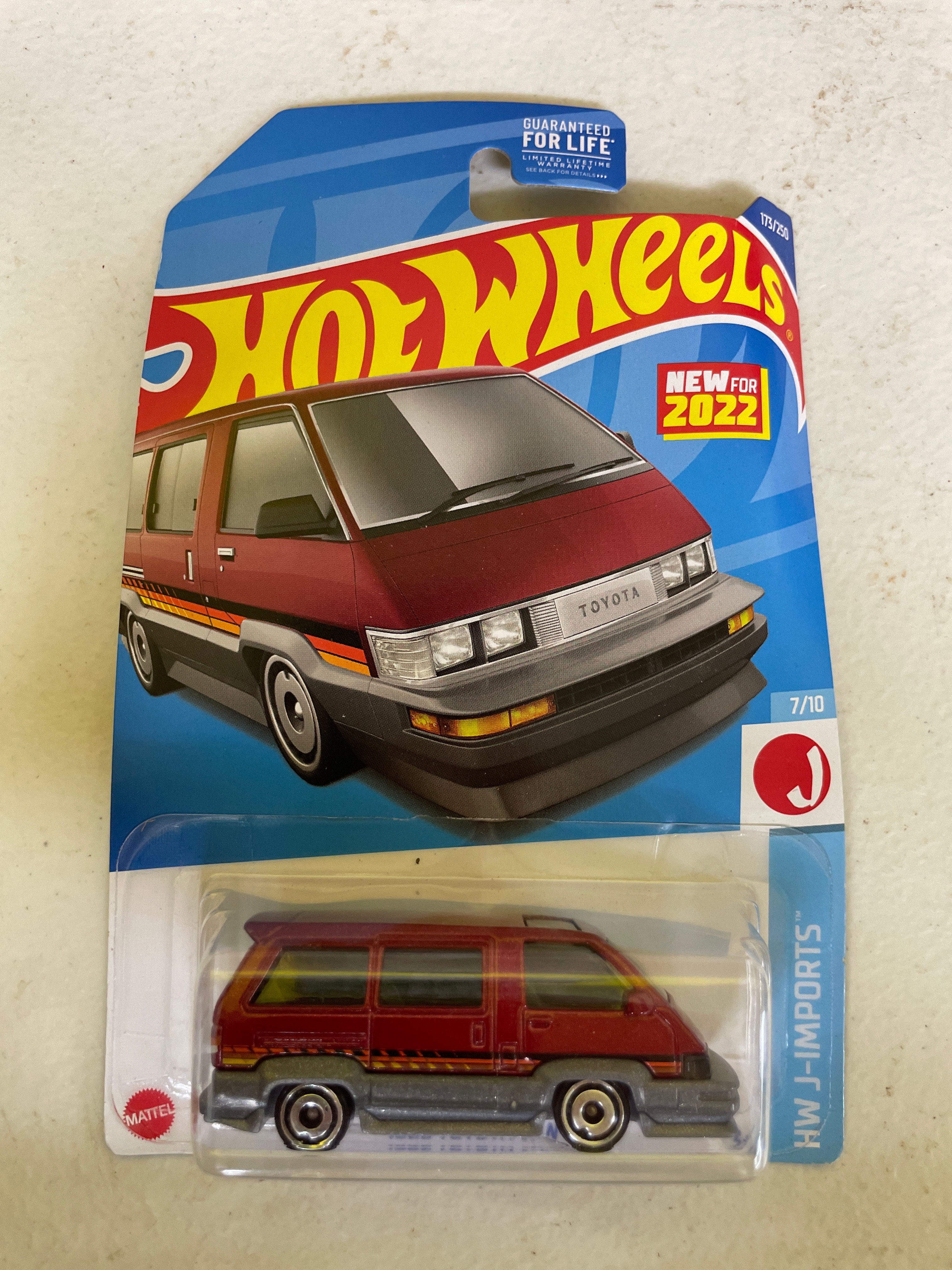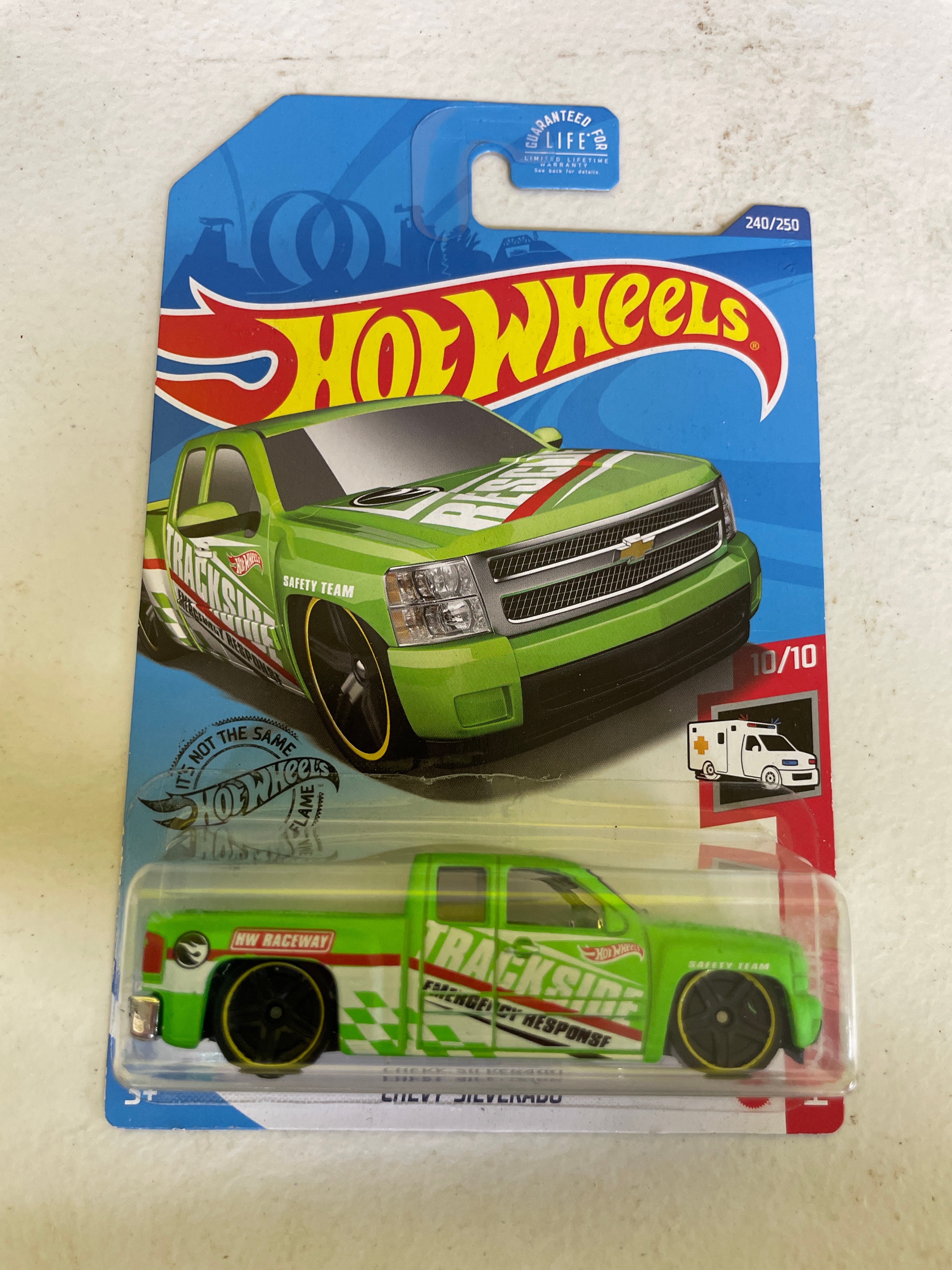 A collection of five Hot Wheels die-cast toy vehicles, each sealed in its original plastic blister packaging on a cardboard card. The collection includes two identical ’70s Van’ models, white with ‘Space Jam: A New Legacy’ ‘Tune Squad’ cartoon graphics, identified as 198/250 and 4/5 within the ‘HW Space™’ series, copyrighted 2020. Also present is a green ‘Chevy Silverado’ pickup truck featuring ‘Trackside Safety Team’ livery, from the ‘HW Rescue™’ series (240/250, 10/10), copyrighted 2020. A red ‘1986 Toyota Van, ‘ marked ‘NEW FOR 2022’ and part of the ‘HW J-Imports™’ series (173/250, 7/10), copyrighted 2021, is included. The final item is a black, blue, and yellow ‘Tricera-Truck, ‘ a stylized, fictional dinosaur-inspired vehicle from the ‘Street Beasts®’ series (212/250, 10/10), copyrighted 2017. All packaging consistently displays ‘Hot Wheels’ branding, specific series names, unique identifying codes (GRY76-M9C0N, GHD76-D9C0P, HCT15-M9C0J, GHD80-D9C0M), age recommendations (‘3+’), ‘MADE IN MALAYSIA’ origin, ‘Guaranteed For Life’ seals, and various safety compliance markings (CE, ASTM F963). The vehicles are primarily constructed from die-cast metal and plastic.