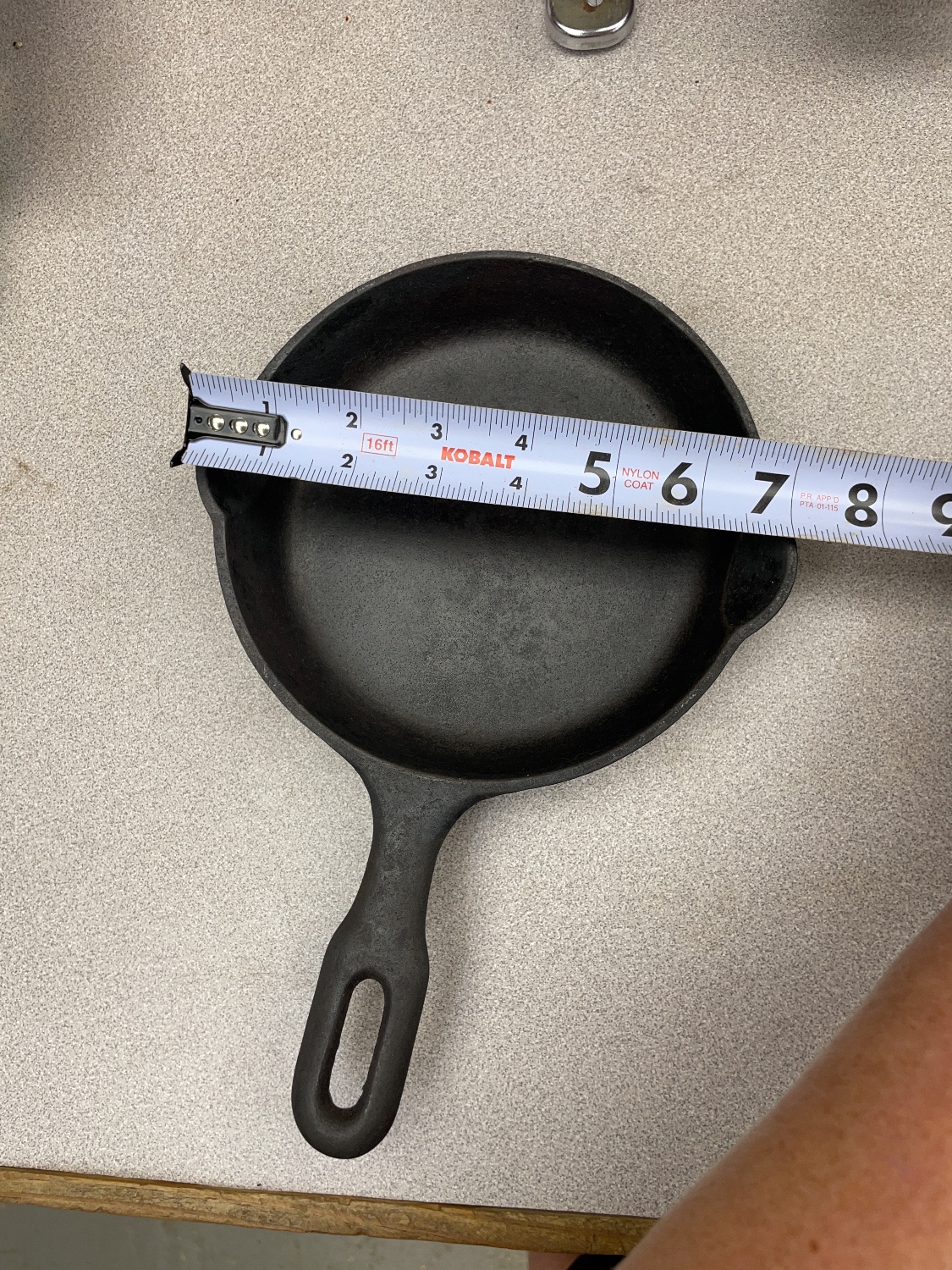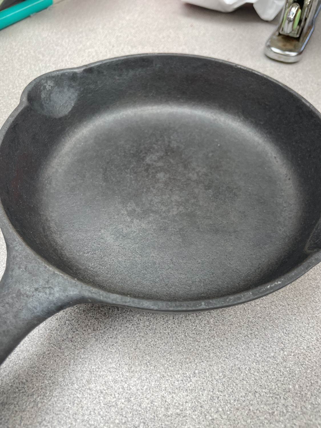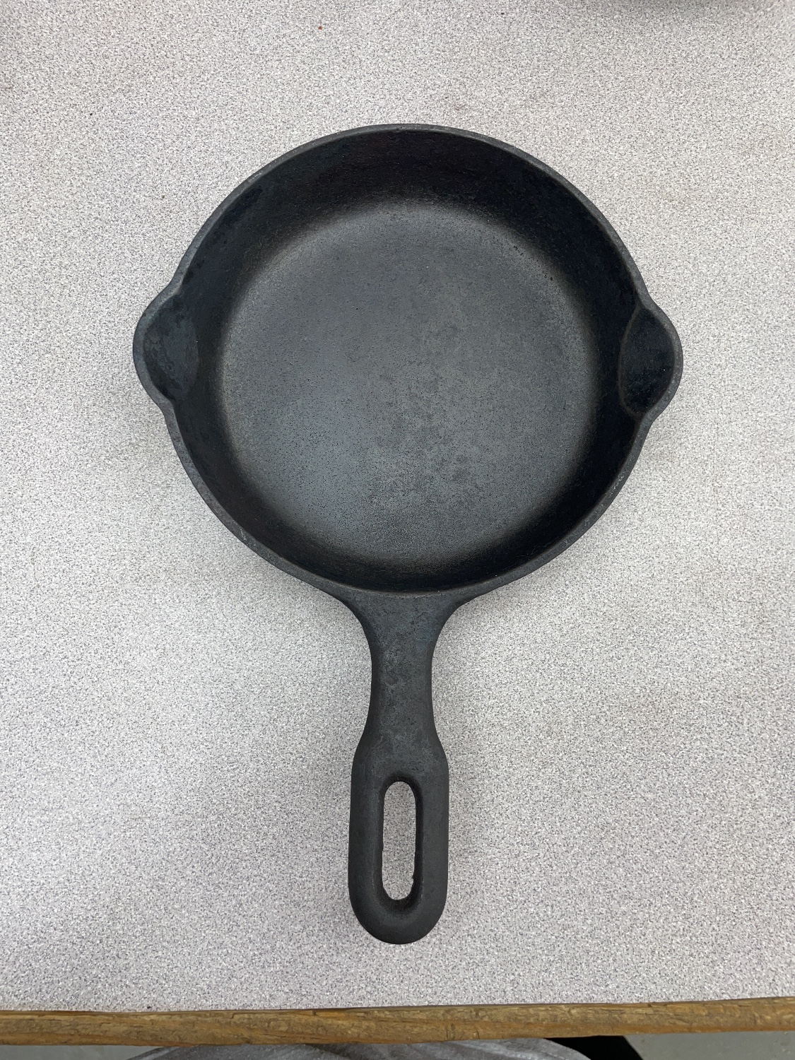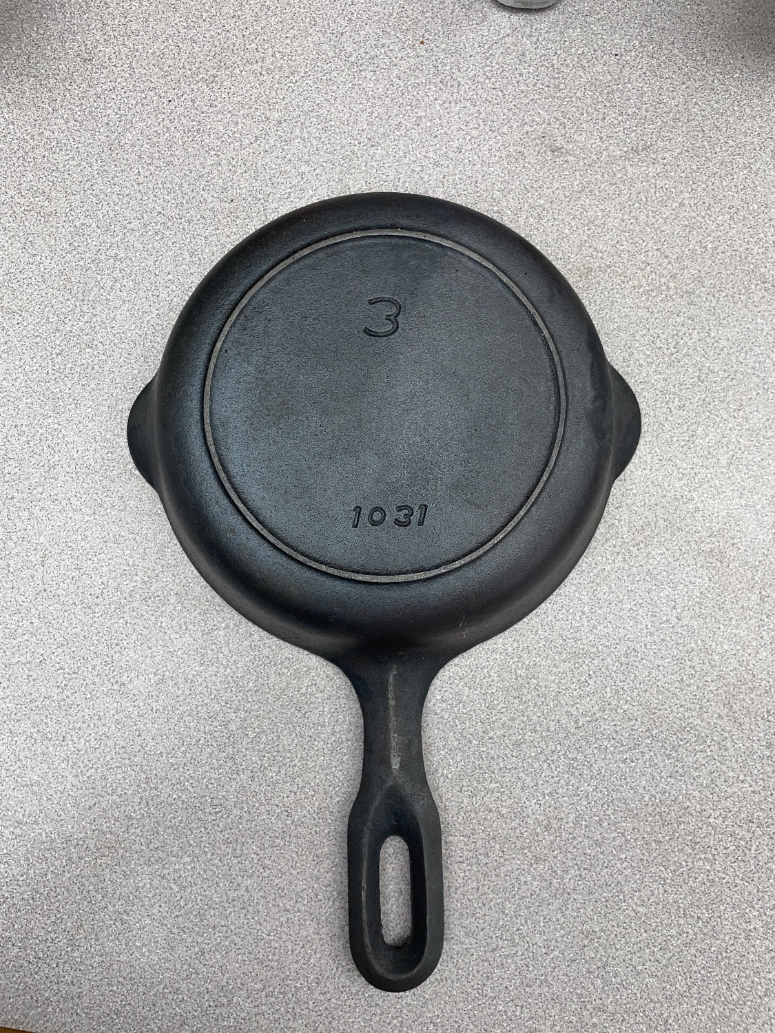 A Iron Mountain by Griseold #3 cast iron skillet. This traditional cast iron frying pan features a classic round form with a single integrated handle and dual pour spouts. The material is visibly cast iron, presenting a well-established, dark, and somewhat mottled seasoning across both its interior and exterior surfaces. The underside is clearly marked with the embossed numbers ‘3’ and ‘1031’ within a raised circular ring.