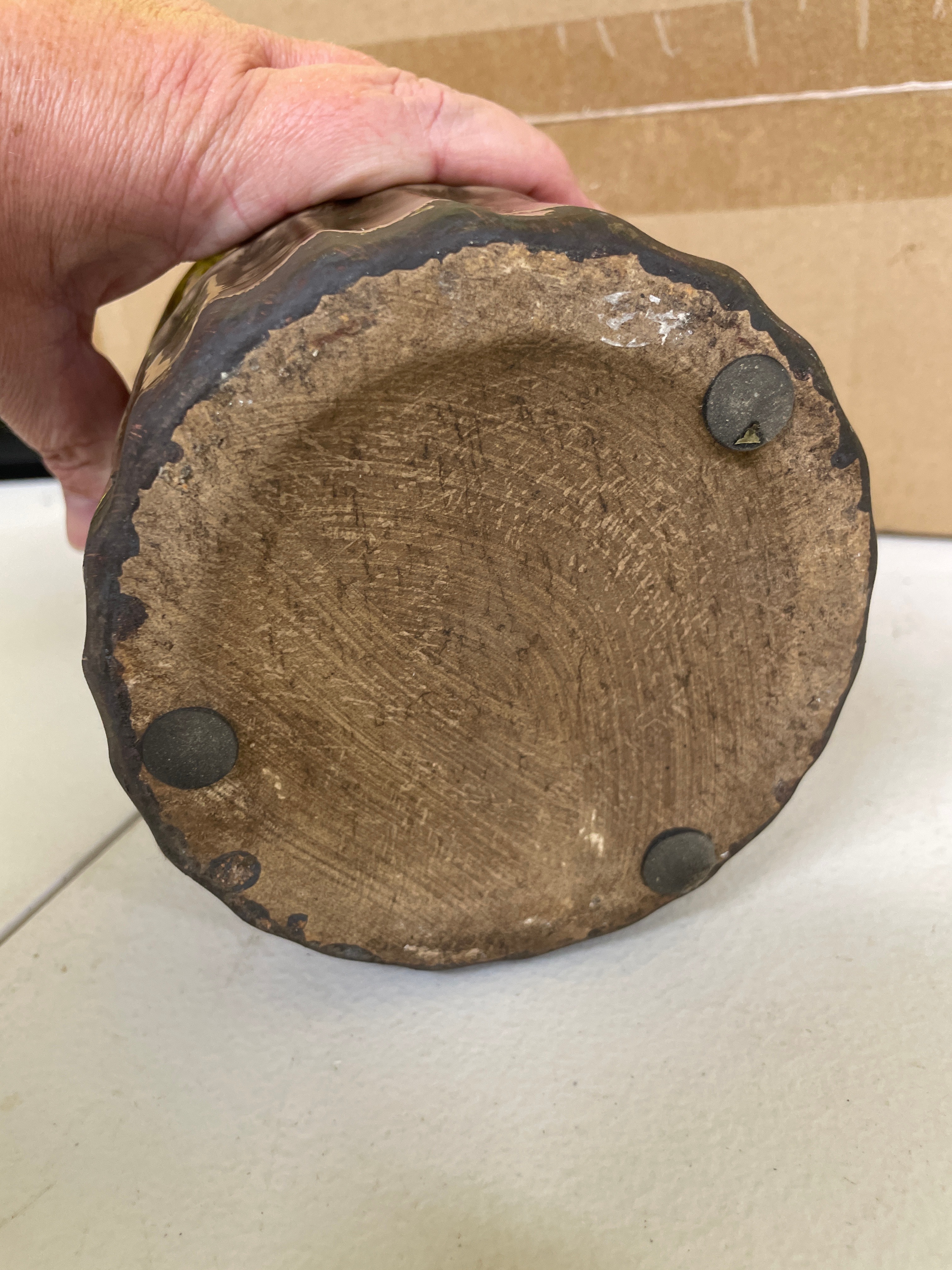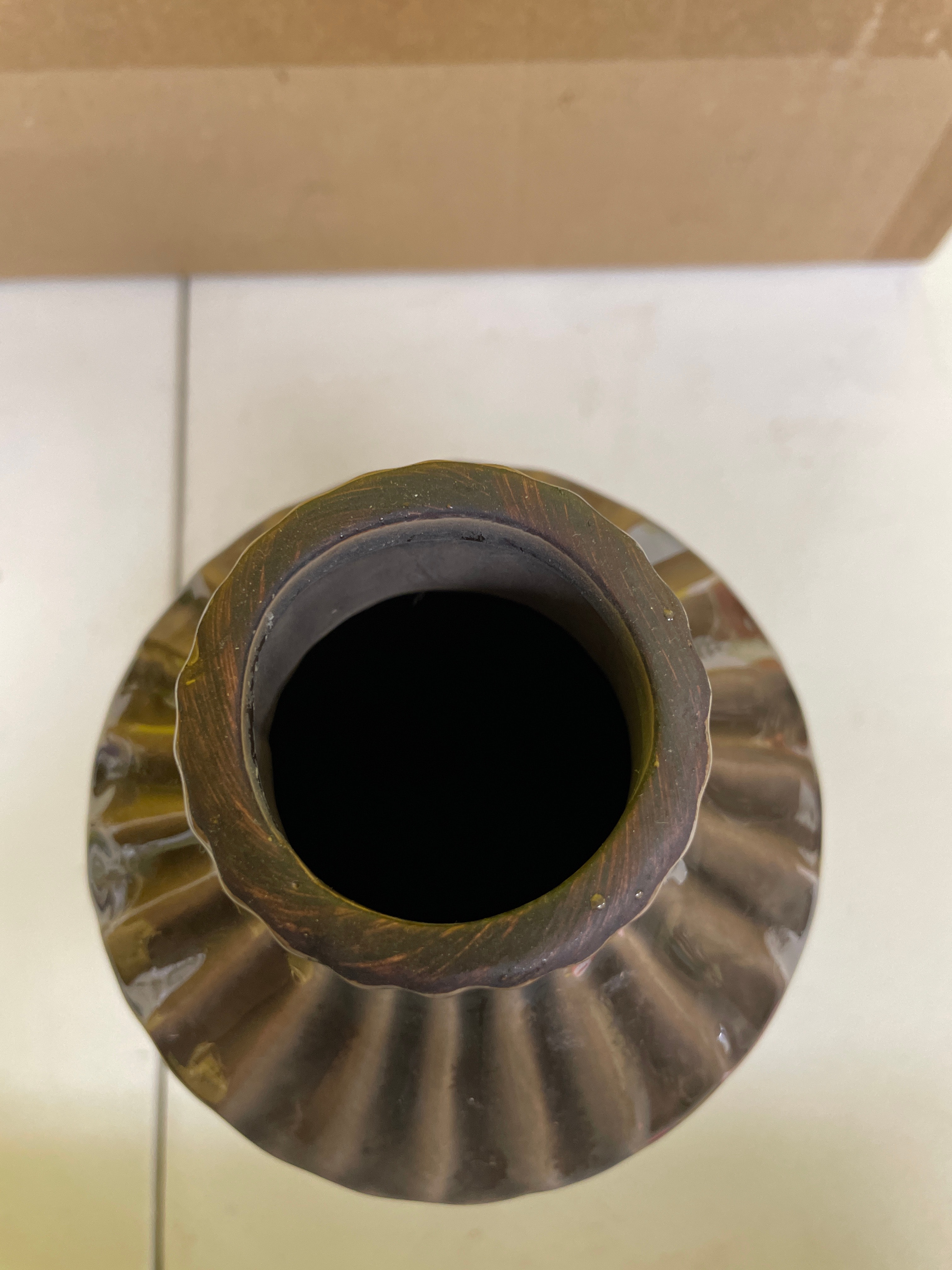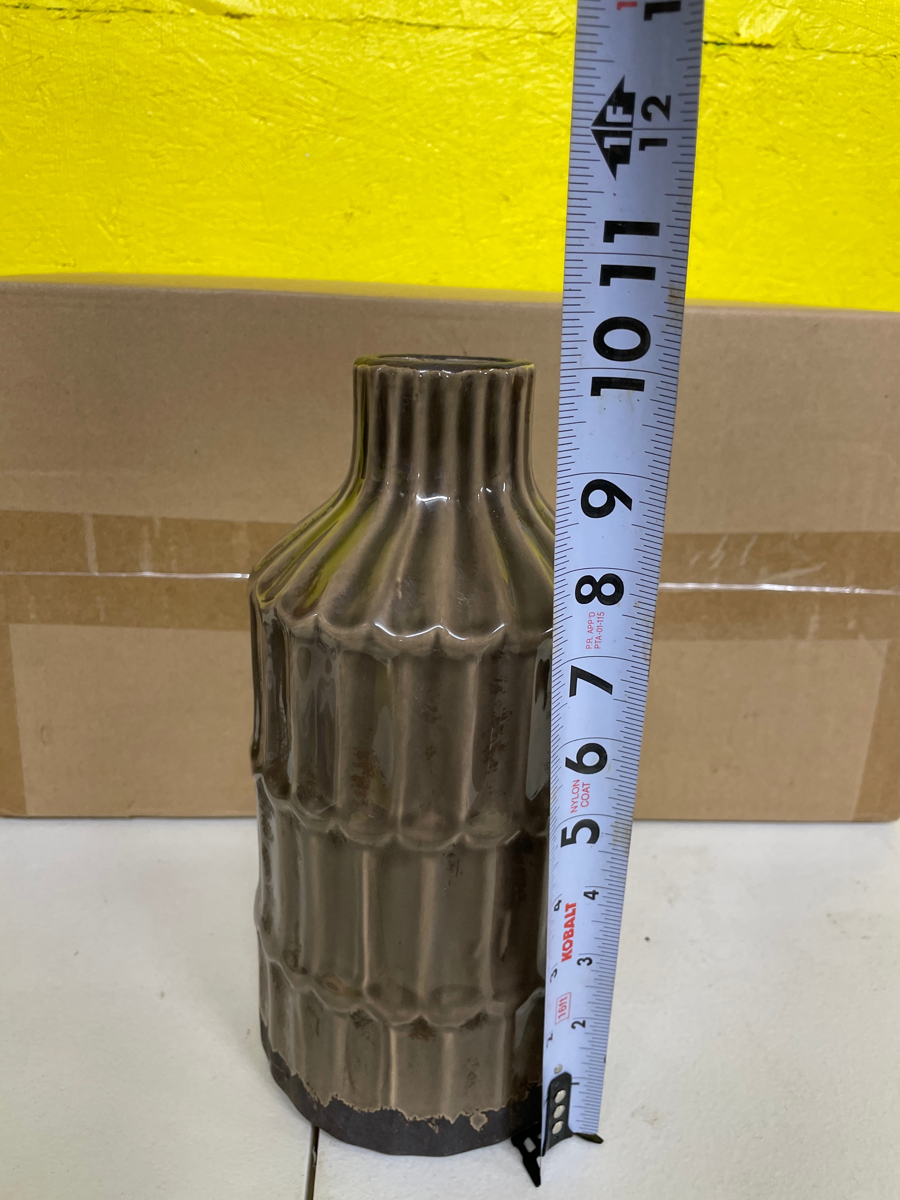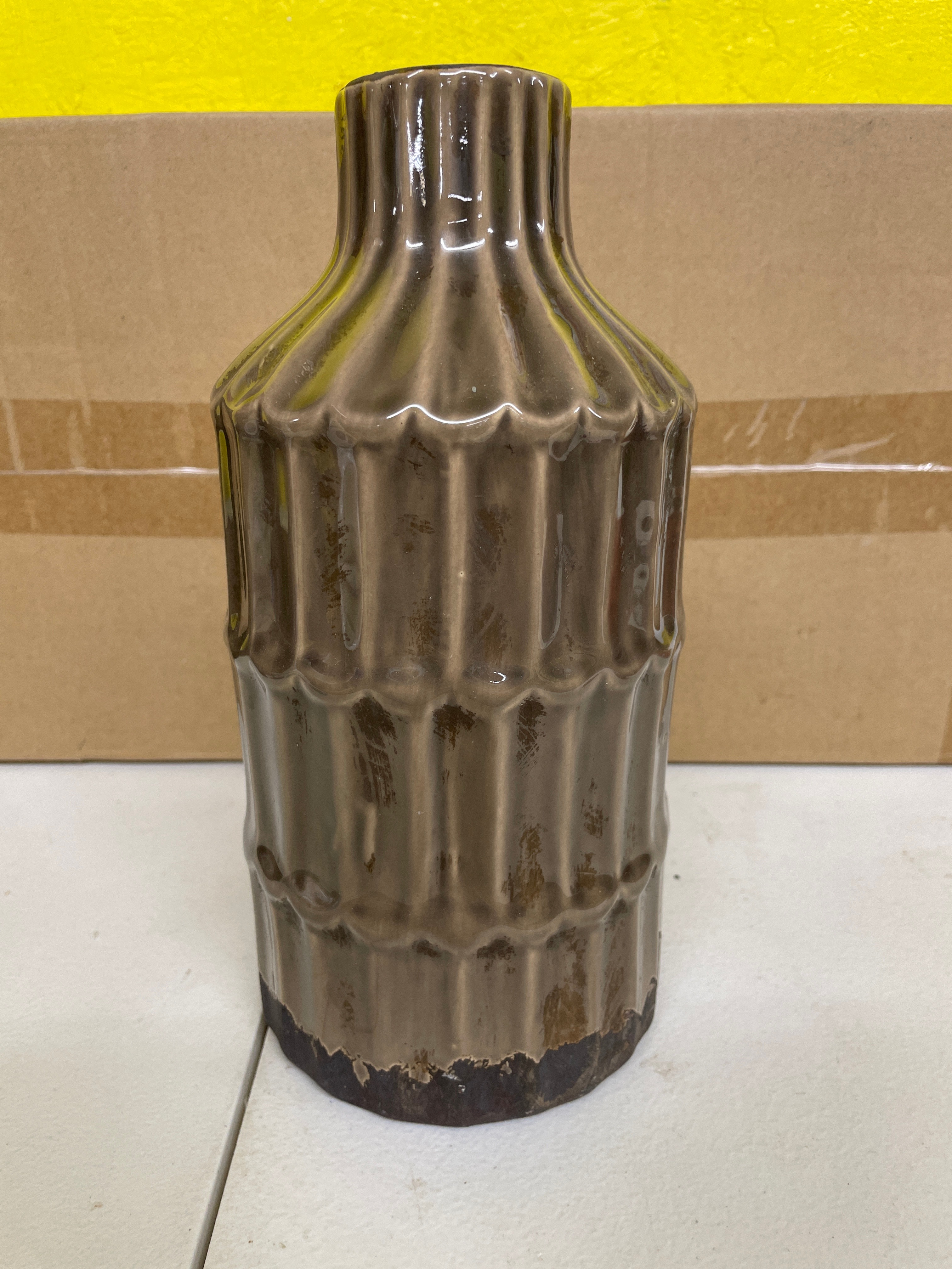 A contemporary ceramic vase or bottle-shaped vessel, featuring a glossy dark brown to bronze-colored glaze. The form includes a slightly tapered neck and a body adorned with segmented vertical fluting or ribbed texture, creating a stacked pattern. The unglazed base is of a natural light brown clay color, displaying firing rings and equipped with three circular protective pads. No manufacturer’s marks or discernible text are visible on the object itself.