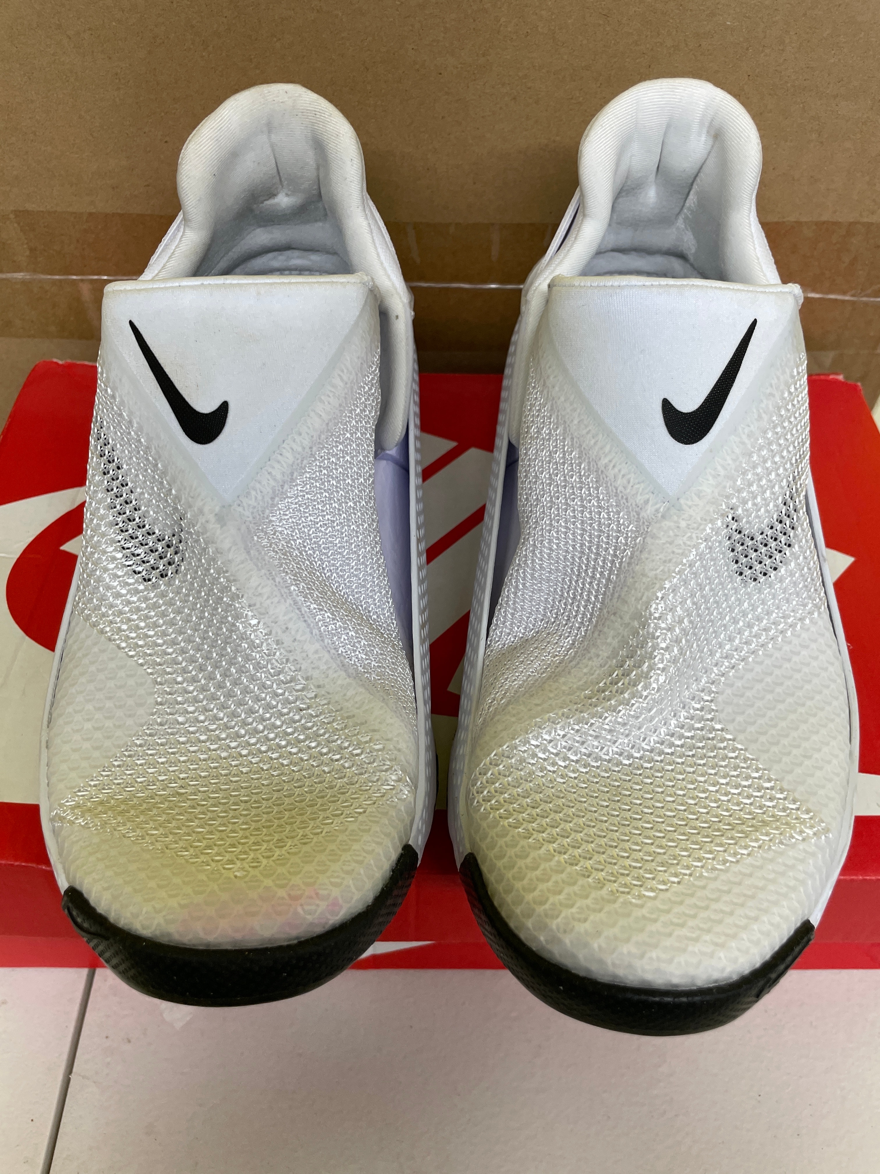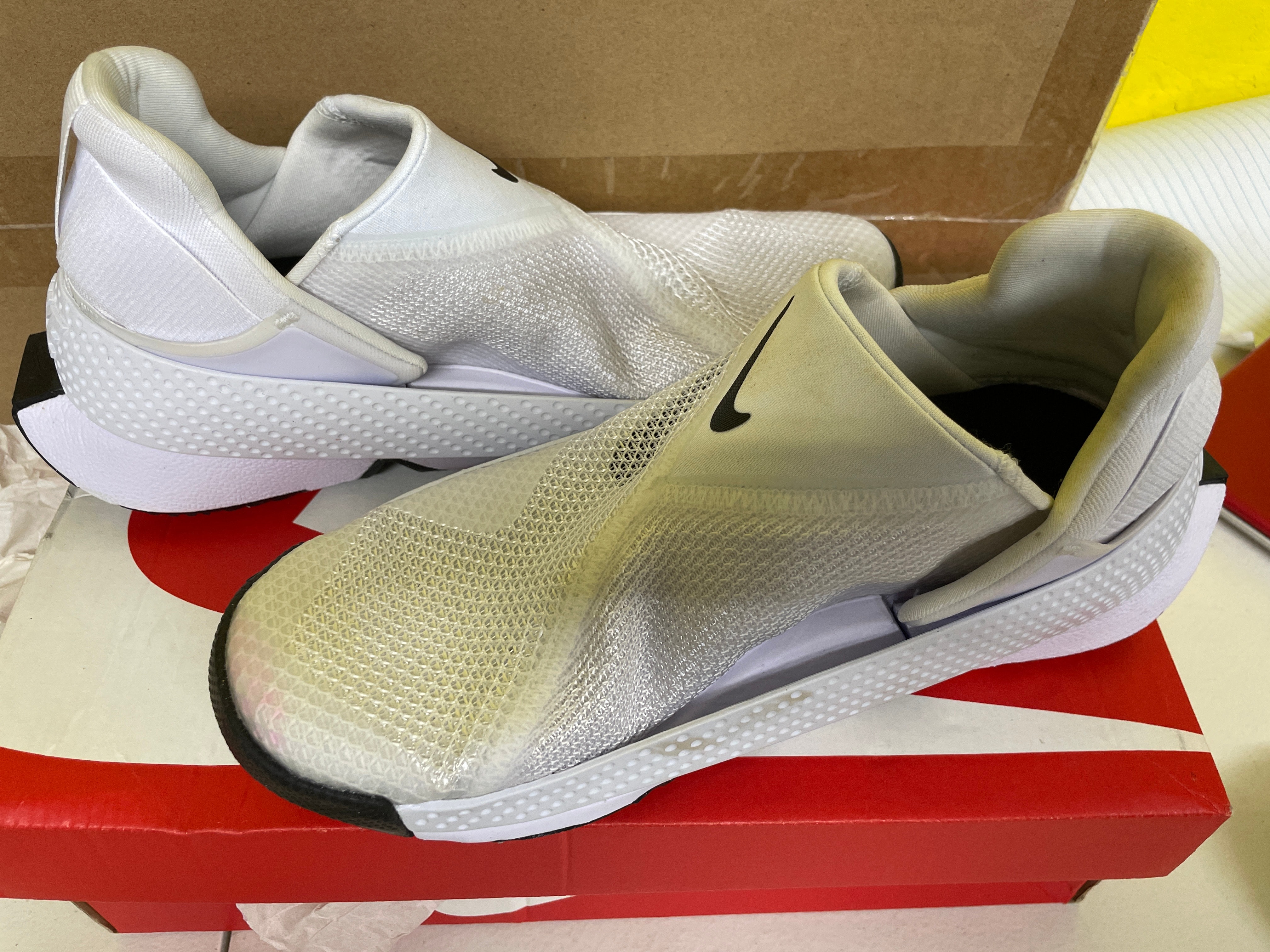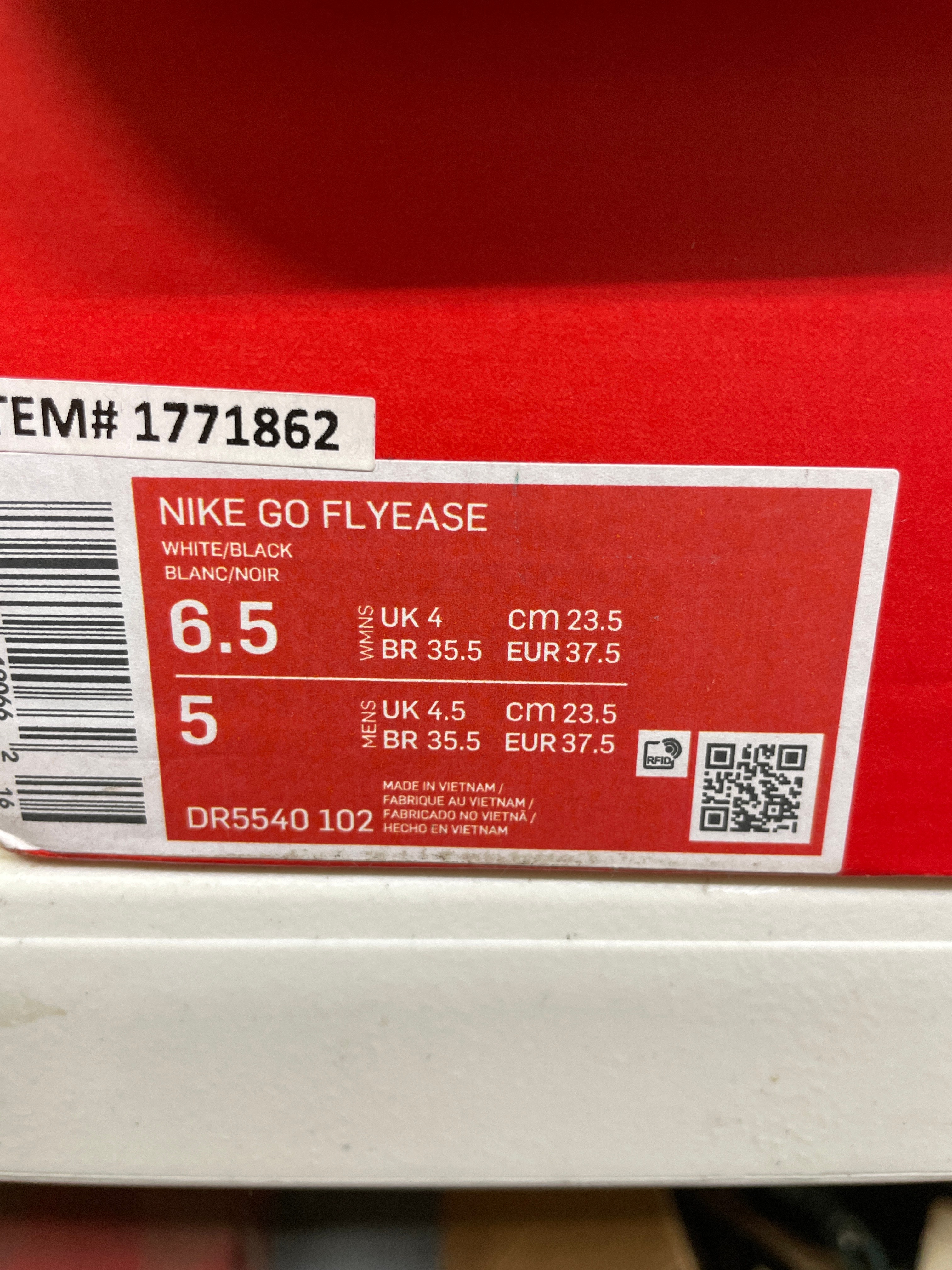 A pair of Nike Go FlyEase DR5540-102 shoes. These contemporary athletic shoes, manufactured in Vietnam in April 2022, feature a hands-free slip-on design. They are constructed with a white mesh and synthetic fabric upper, complemented by black accents and a distinctive white and black rubber sole. Prominent markings include the Nike swoosh logo on the upper and insoles, “NIKE GO FLYEASE” branding, the model number “DR5540-102” on the outsole and labels, and size information (US Women’s 6.5). The shoes are presented with their original box, labeled “WHITE/BLACK”.