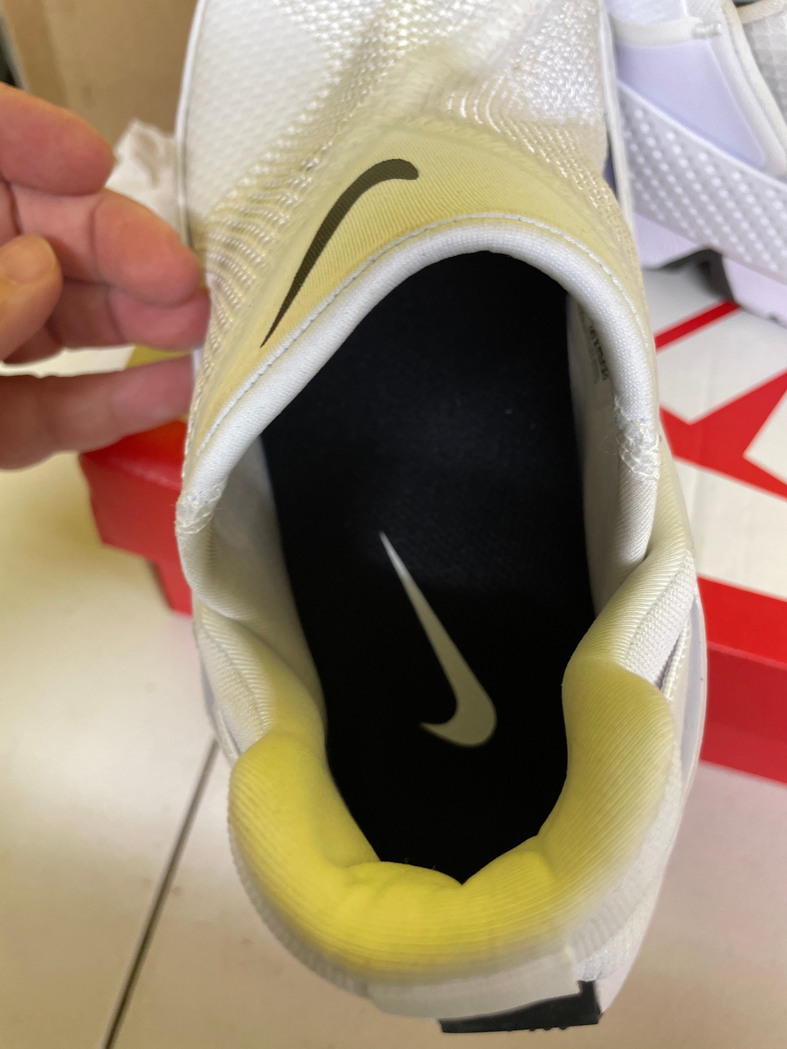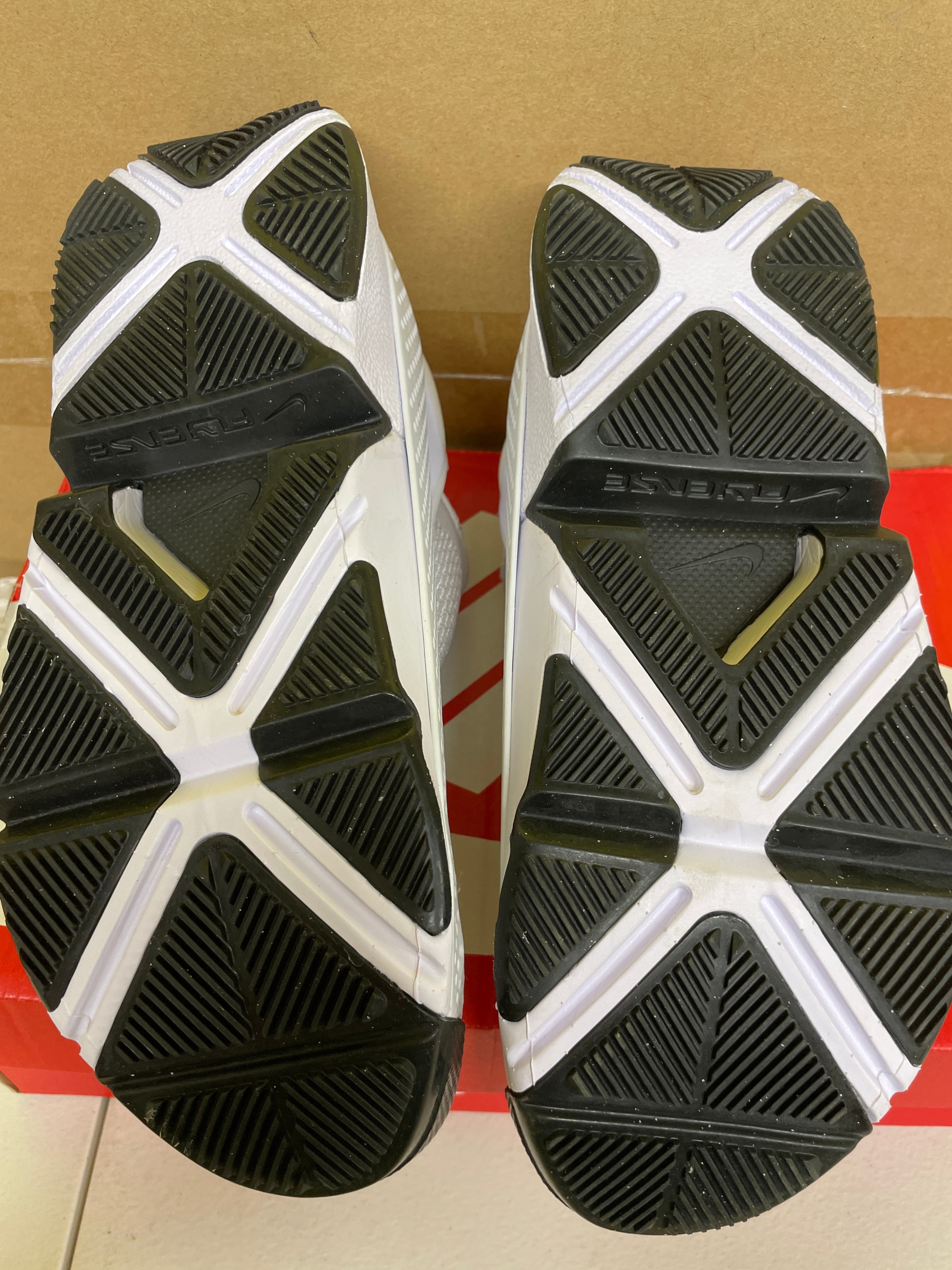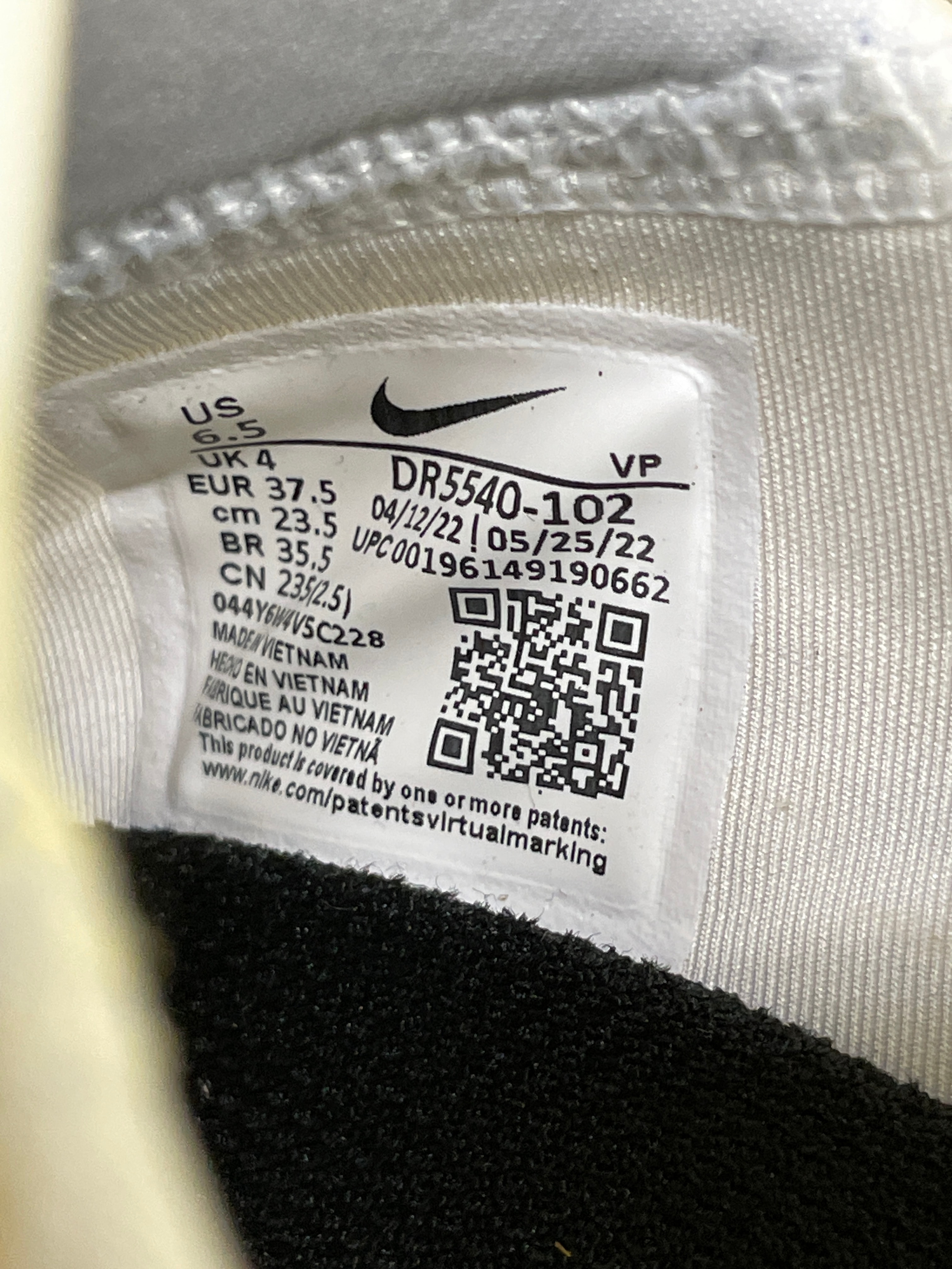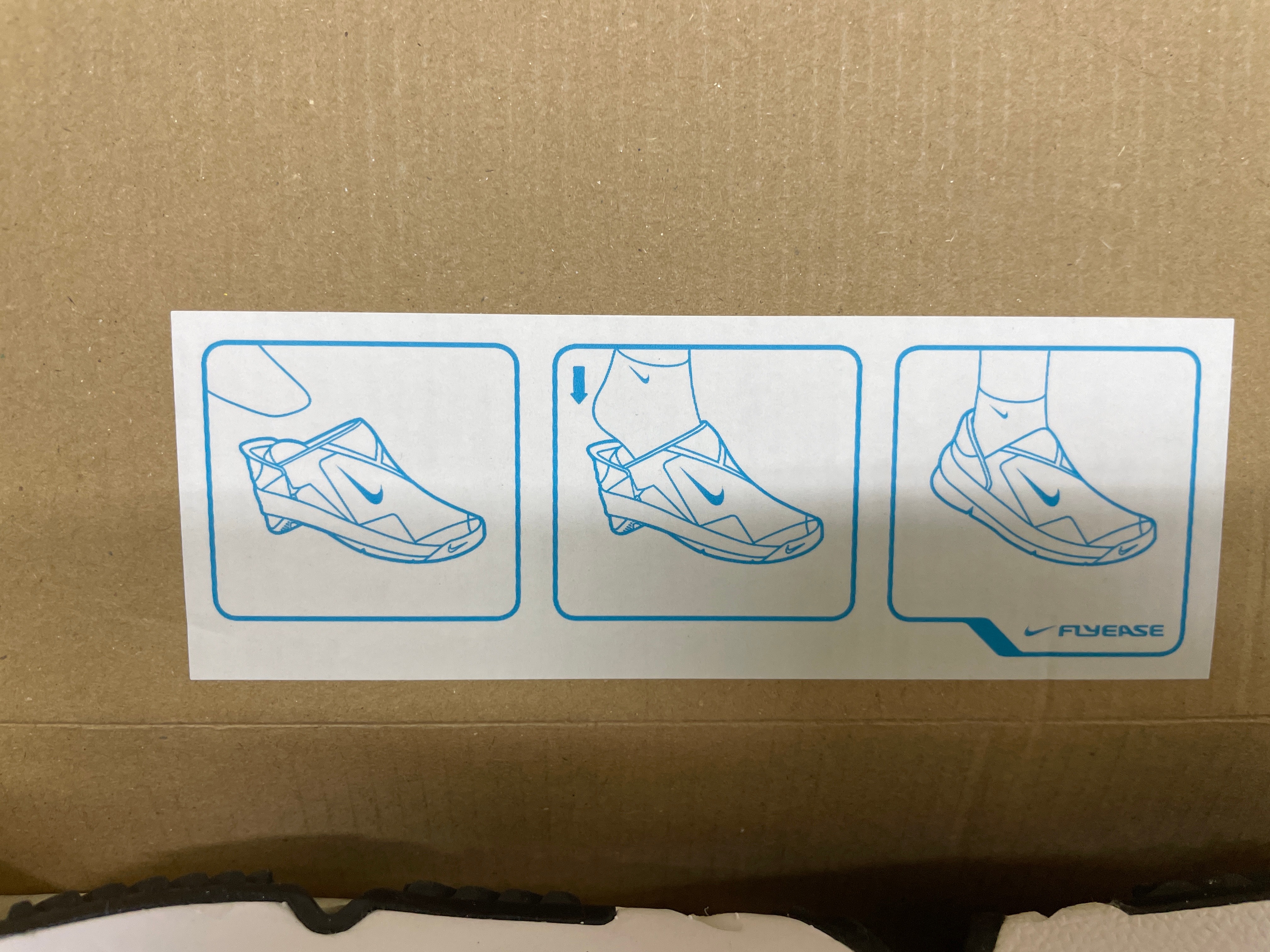 A pair of Nike Go FlyEase DR5540-102 shoes. These contemporary athletic shoes, manufactured in Vietnam in April 2022, feature a hands-free slip-on design. They are constructed with a white mesh and synthetic fabric upper, complemented by black accents and a distinctive white and black rubber sole. Prominent markings include the Nike swoosh logo on the upper and insoles, “NIKE GO FLYEASE” branding, the model number “DR5540-102” on the outsole and labels, and size information (US Women’s 6.5). The shoes are presented with their original box, labeled “WHITE/BLACK”.