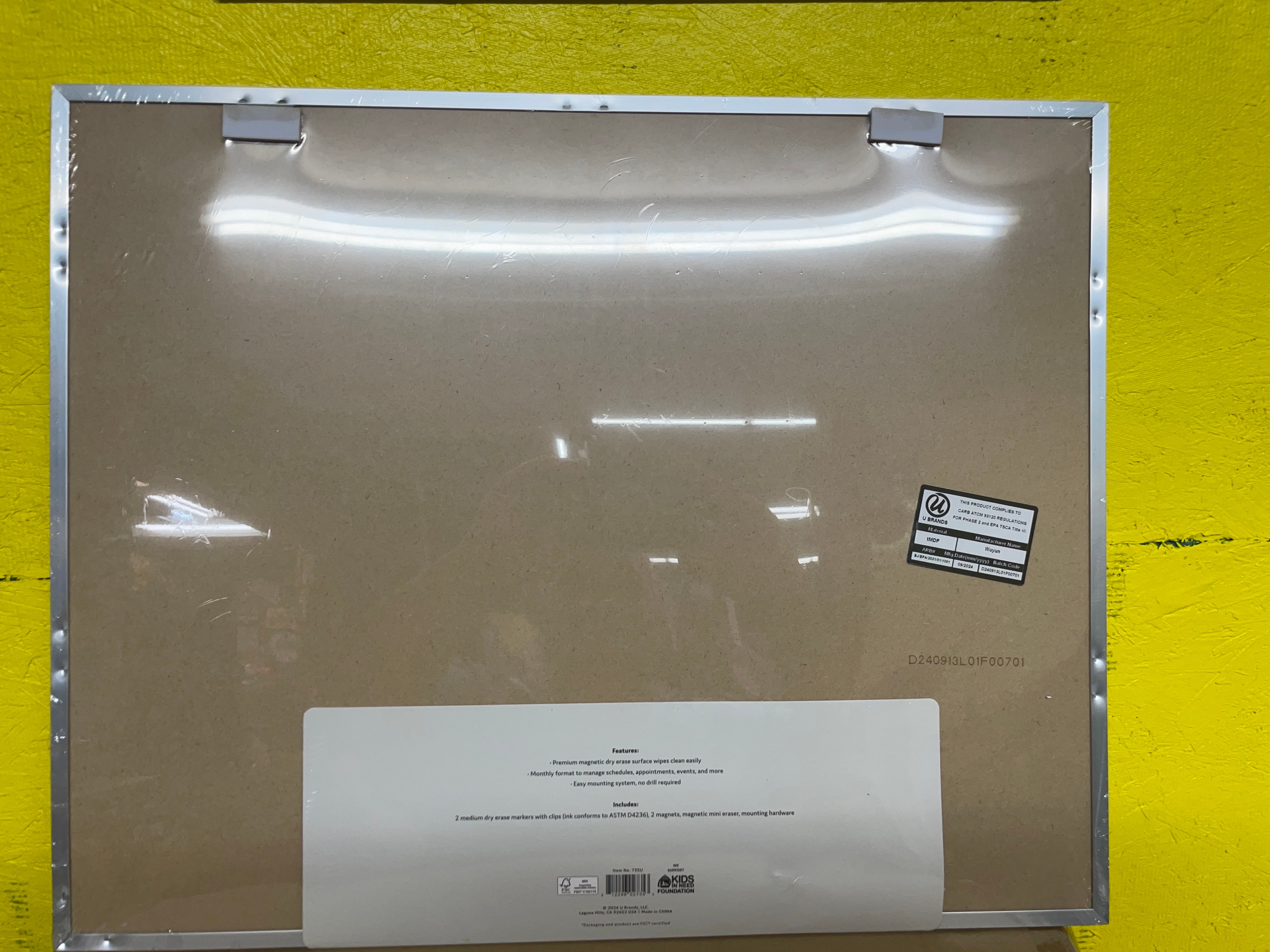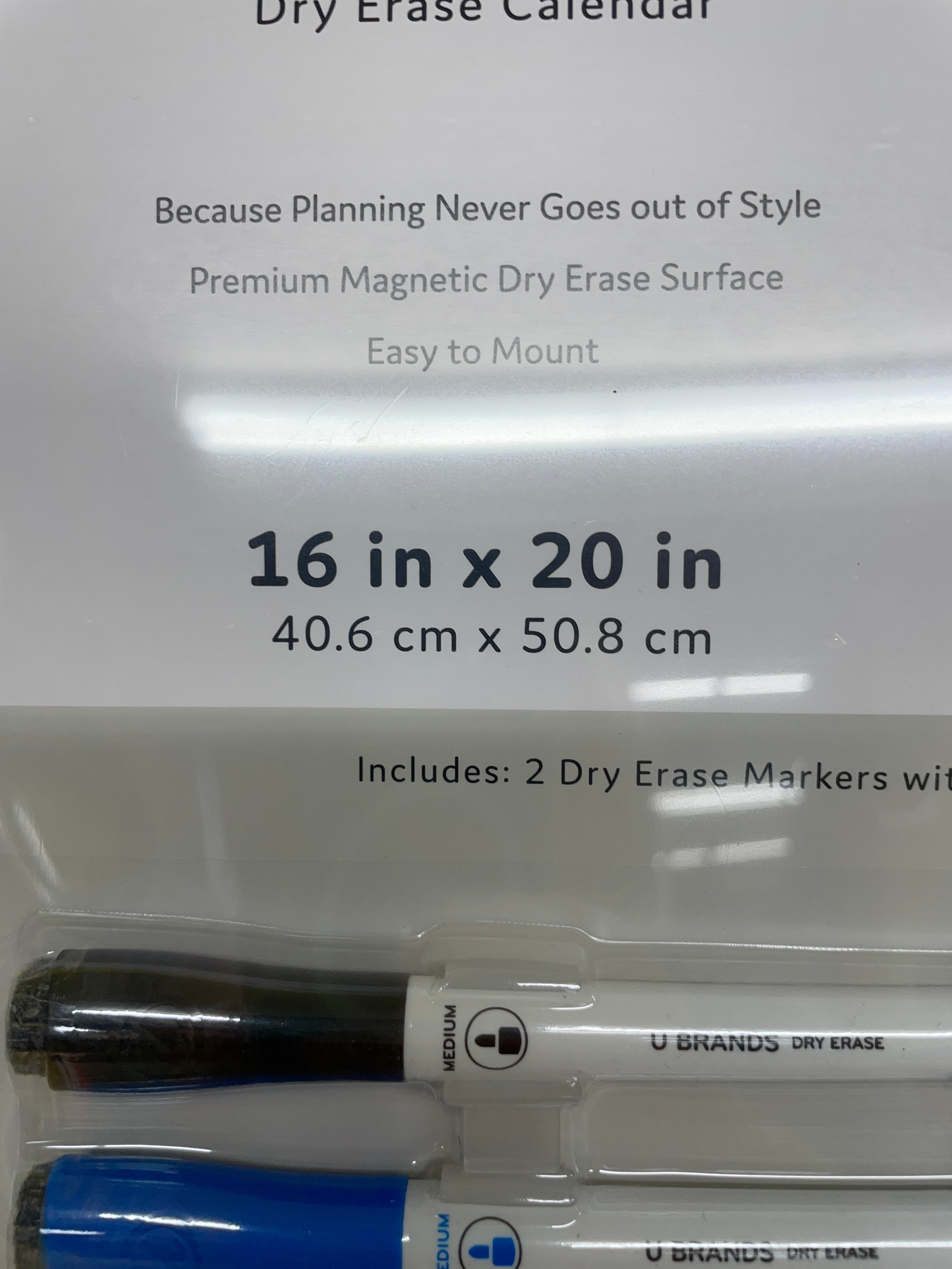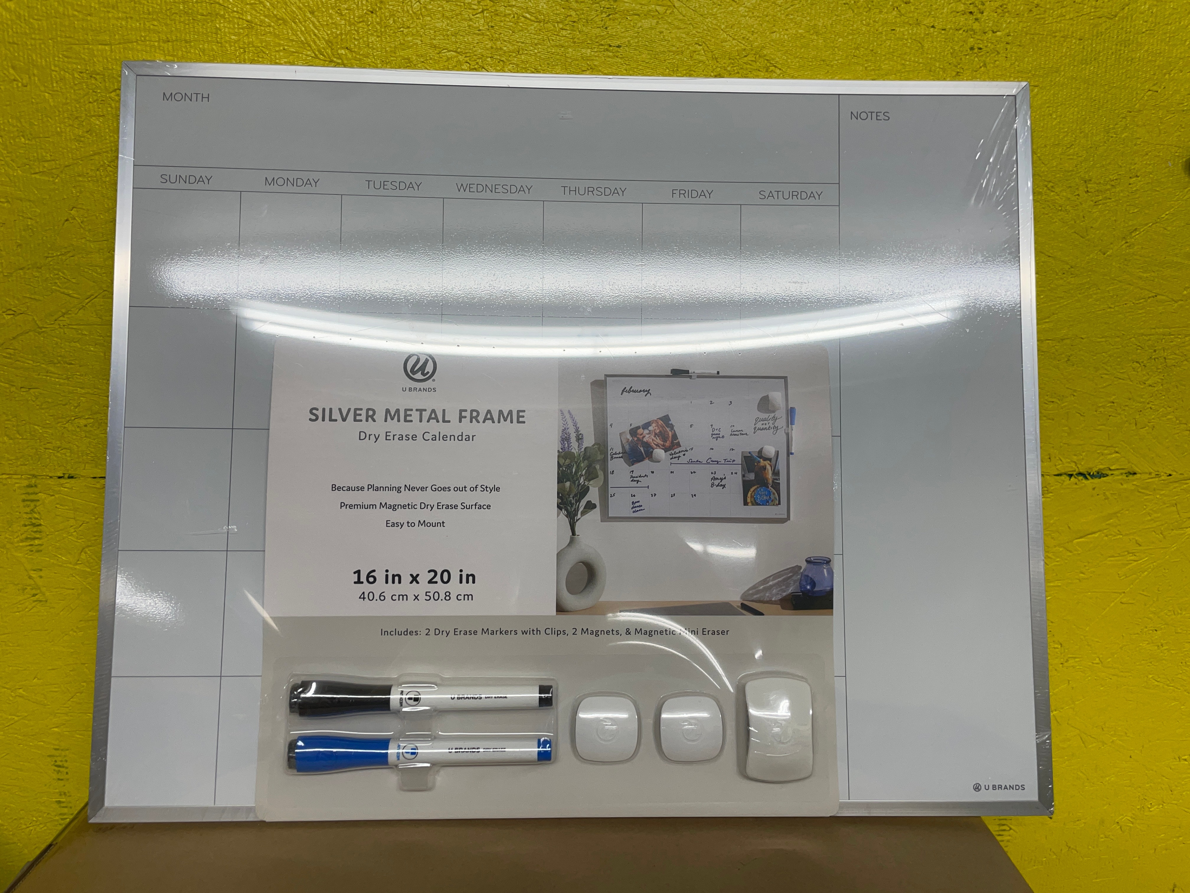 A U Brands ‘Silver Metal Frame Dry Erase Calendar’. This contemporary, rectangular board features a modern, minimalist design with a premium magnetic dry erase surface printed with a monthly calendar grid, including sections for ‘MONTH’ and ‘NOTES, ‘ and days of the week (Sunday-Saturday). It is constructed with a silver-colored metal frame and a hardboard backing, designed for wall mounting. The item comes factory-sealed in clear plastic packaging and includes two medium dry erase markers (black and blue), two small round magnets, and a magnetic dry erase eraser. Visible markings on the packaging include the ‘U BRANDS’ logo, product name, dimensions, and a list of included accessories and features, with a product code ‘D2409LOL1F00701’ visible on the reverse.