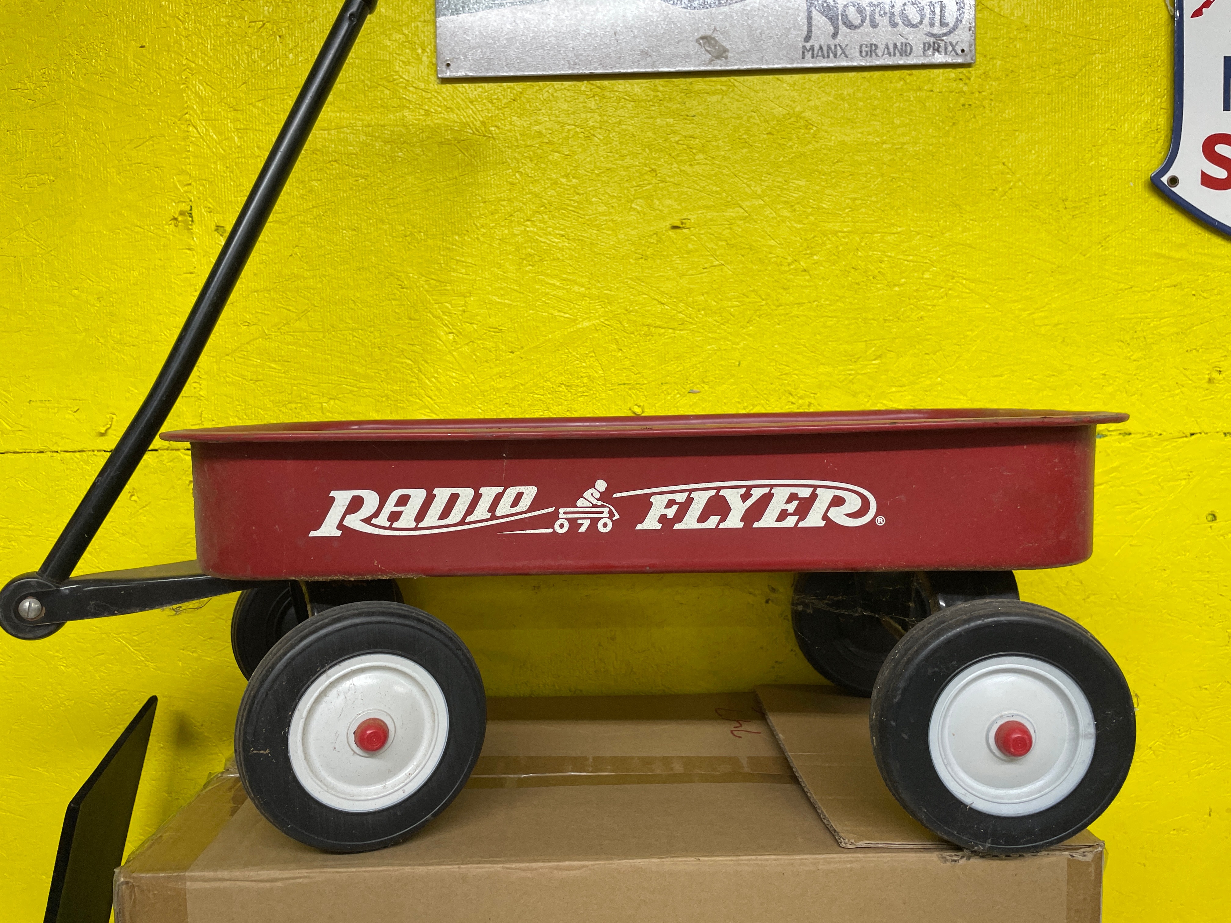 A Radio Flyer Classic Red Wagon, featuring a red-painted metal body, a black metal handle, and four wheels with black rubber tires, white hubs, and red central caps. The side of the wagon displays "RADIO FLYER" in white lettering, accompanied by a graphic of a child riding a tricycle.