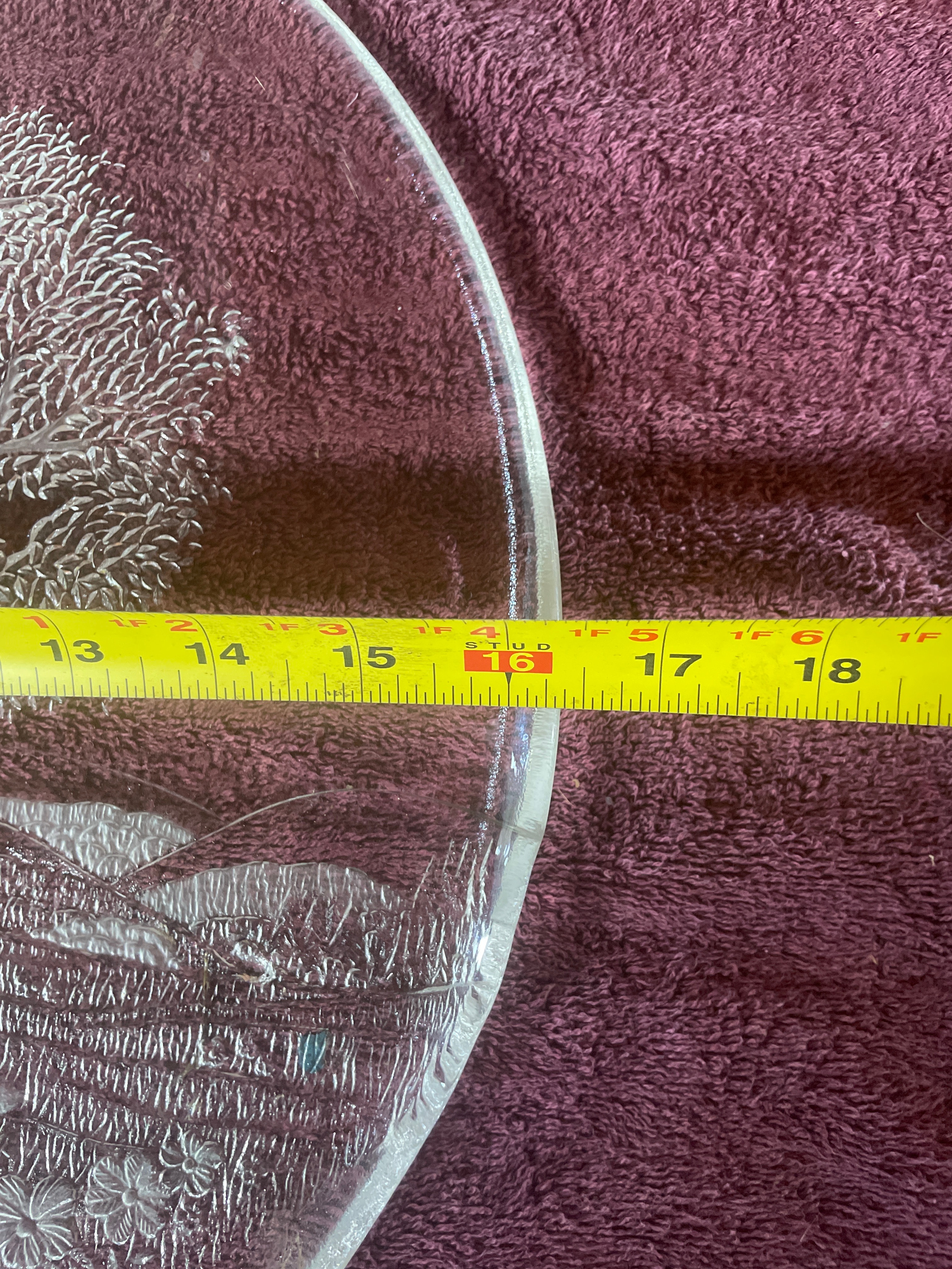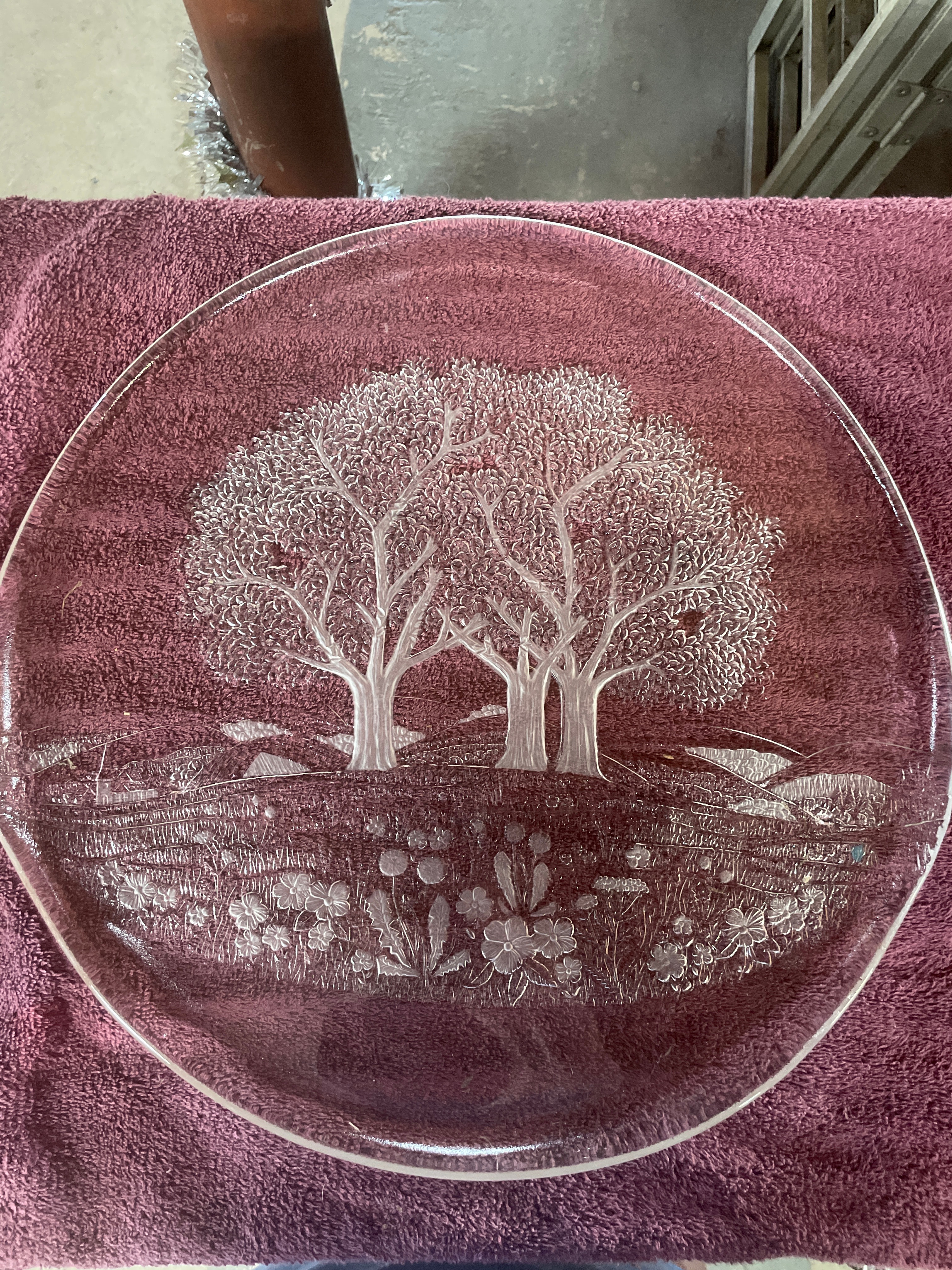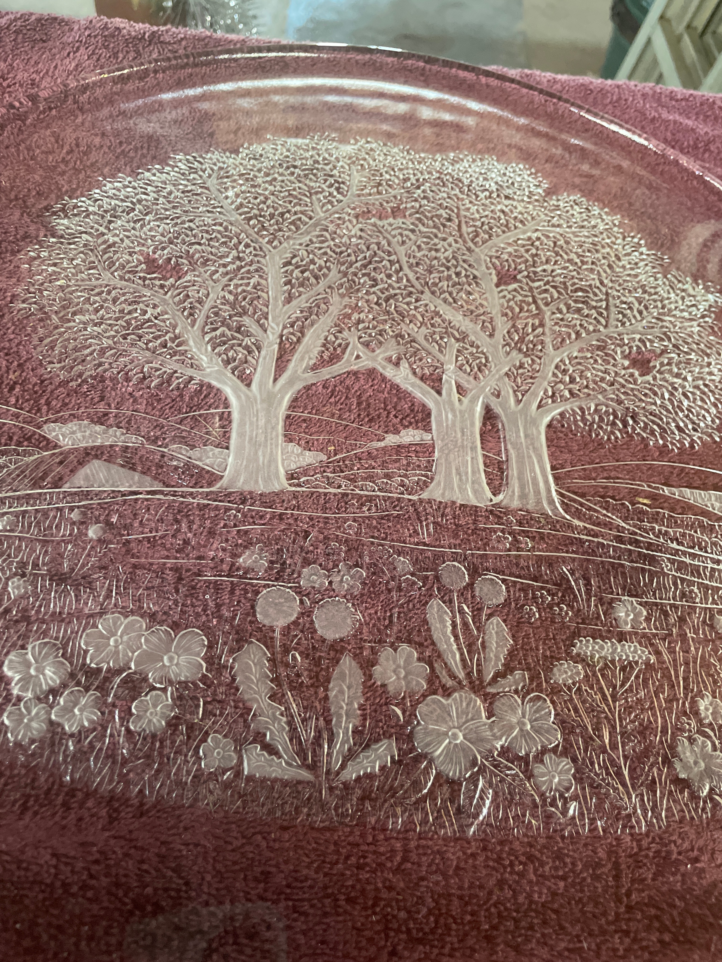 A vintage hand blown etched glass platter. This large, circular clear glass platter features an extensive frosted design on its underside, depicting a naturalistic landscape. The scene includes a foreground of various flowers and foliage, transitioning to a middle ground with four stylized trees featuring textured canopies and rolling terrain. Made of transparent, colorless glass, the object presents a decorative aesthetic. No maker’s marks, signatures, or inscriptions are visible.
