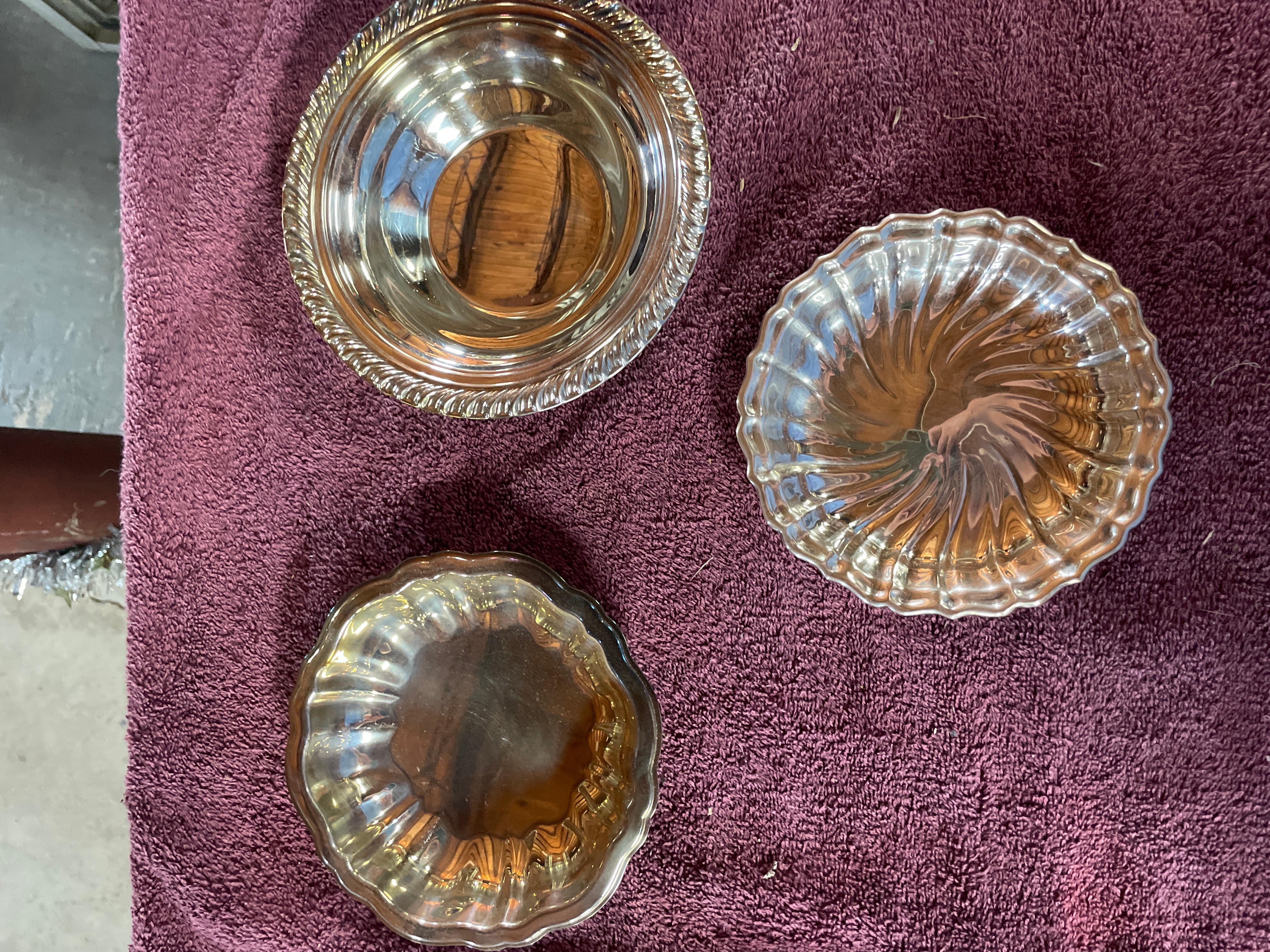 This lot comprises three distinct silver-colored metal bowls, all appearing to be silverplate.