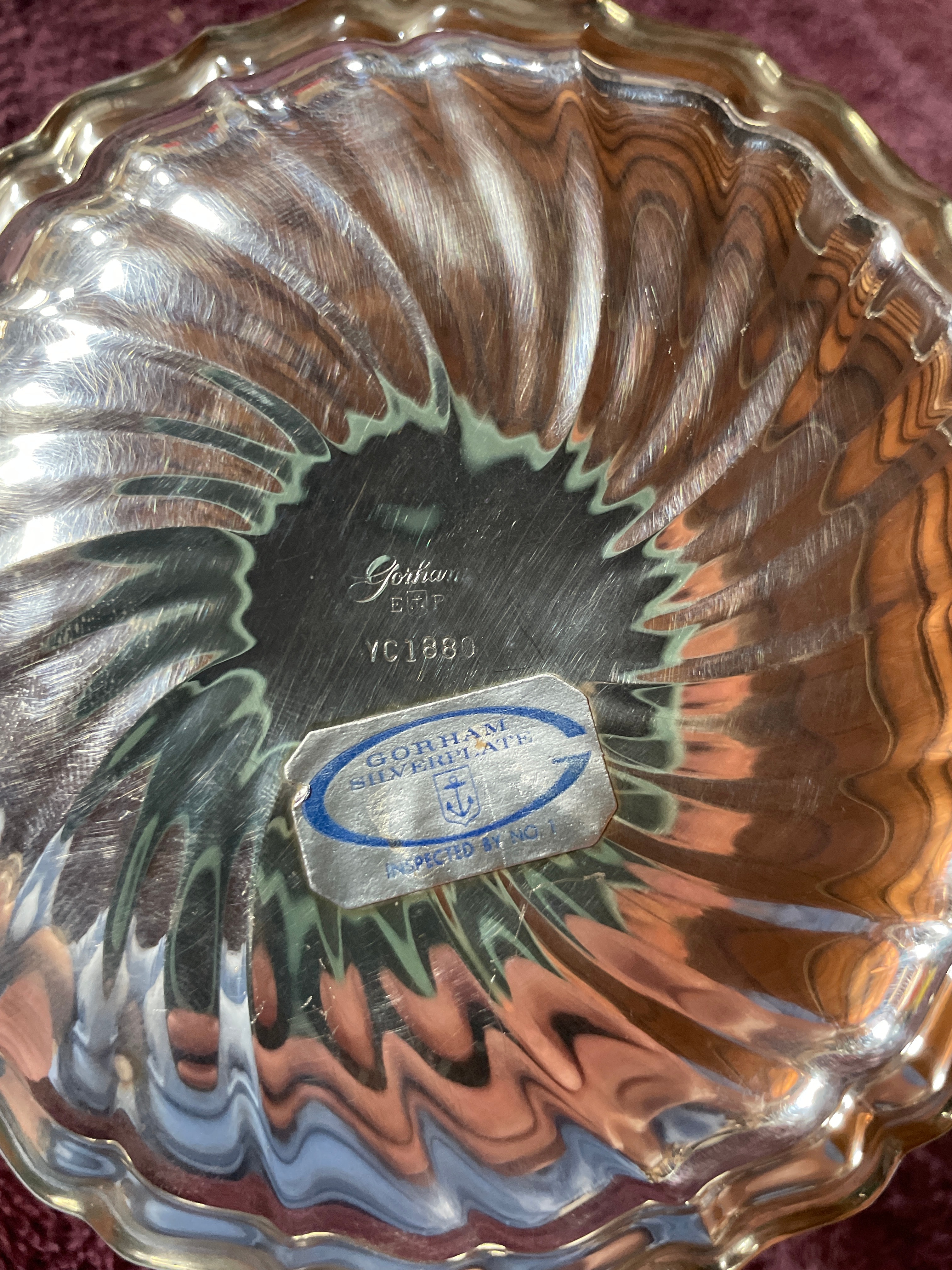 The third bowl has a scalloped edge and a distinctive radiating swirl pattern across its interior, marked "Gorham ERP", "YC1880", and retains a "GORHAM SILVERPLATE" label.
