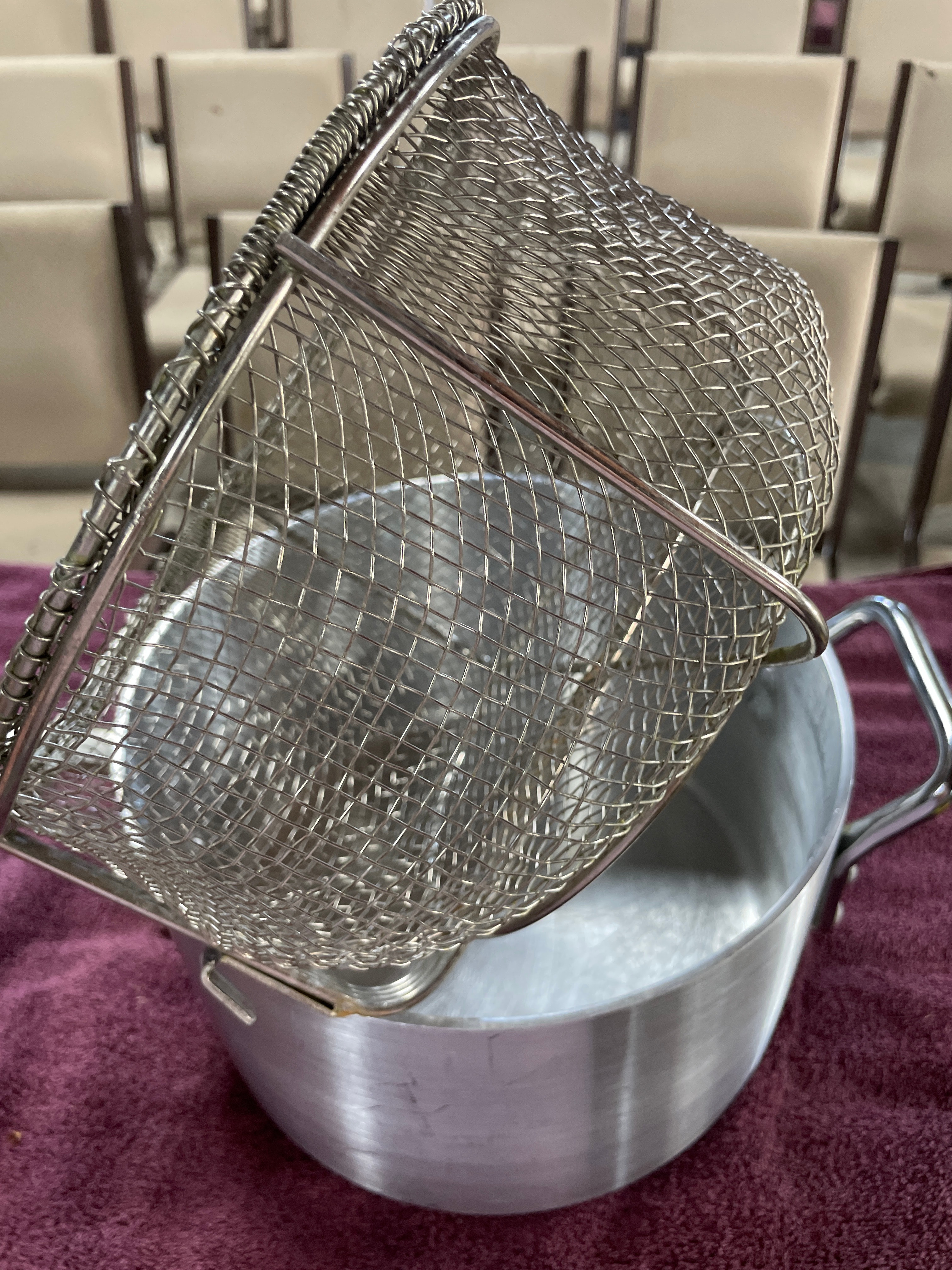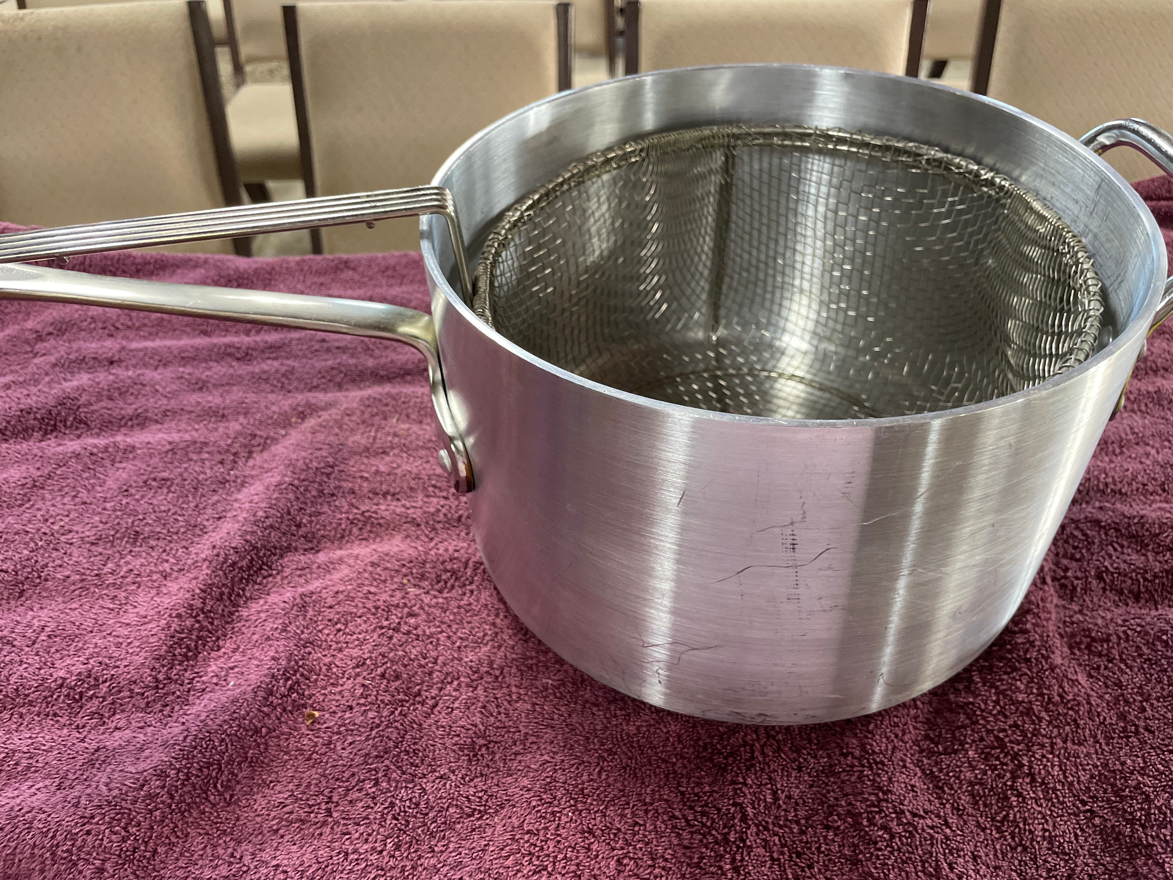 A modern Korean stainless steel deep pot, designed for deep frying or cooking pasta/noodles. The pot features a brushed finish, one elongated handle, and a smaller loop handle. It is accompanied by a fitted internal wire mesh basket insert, segmented into four compartments. The base of the pot is stamped "MADE IN KOREA."
