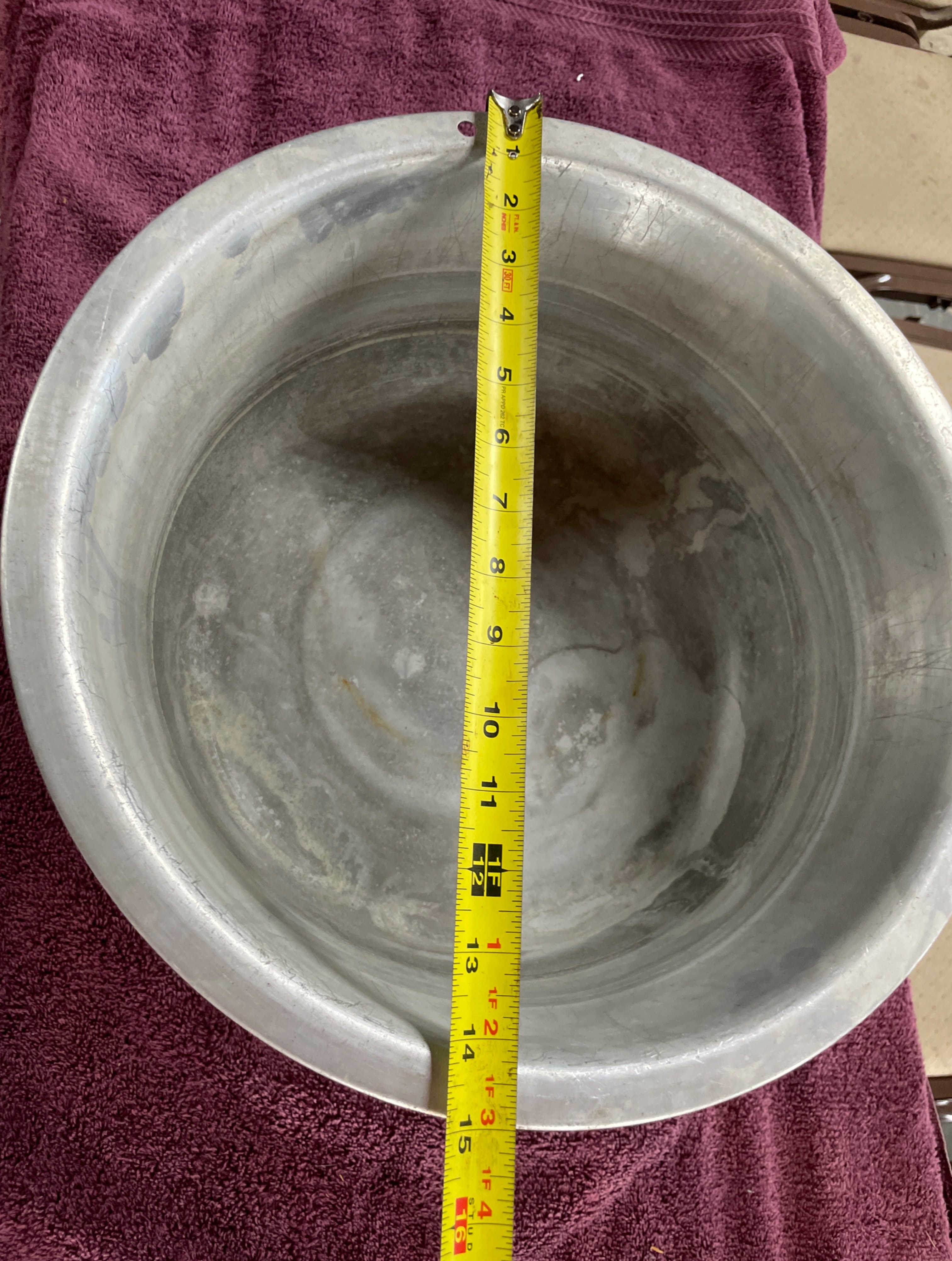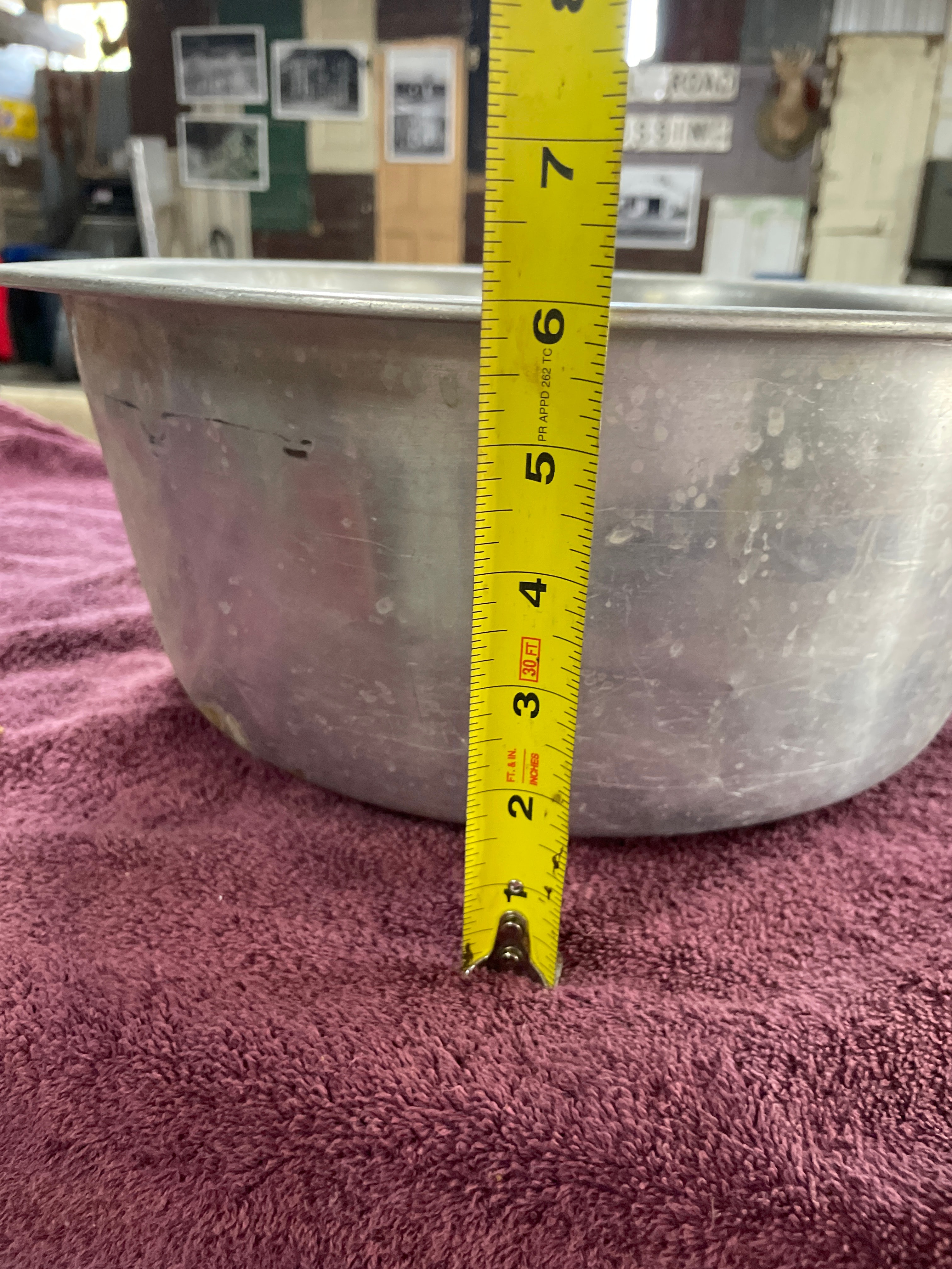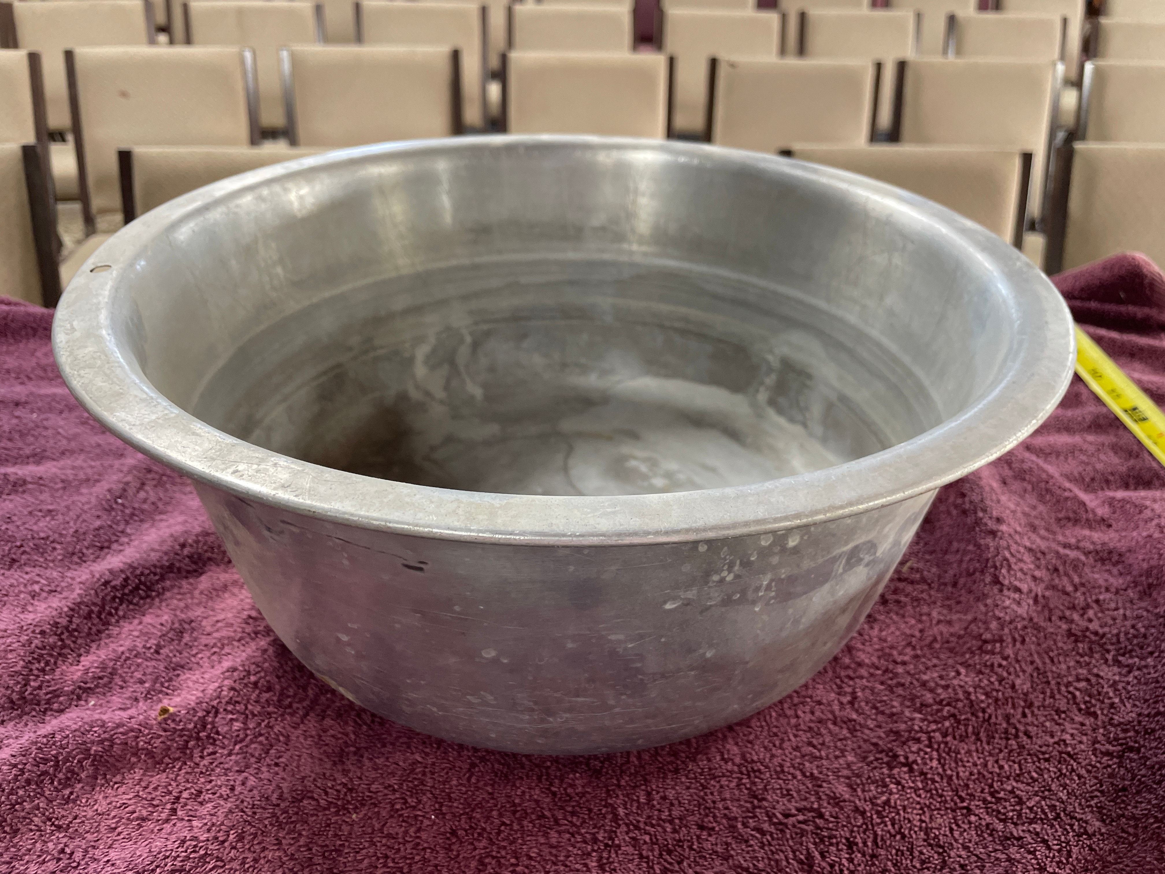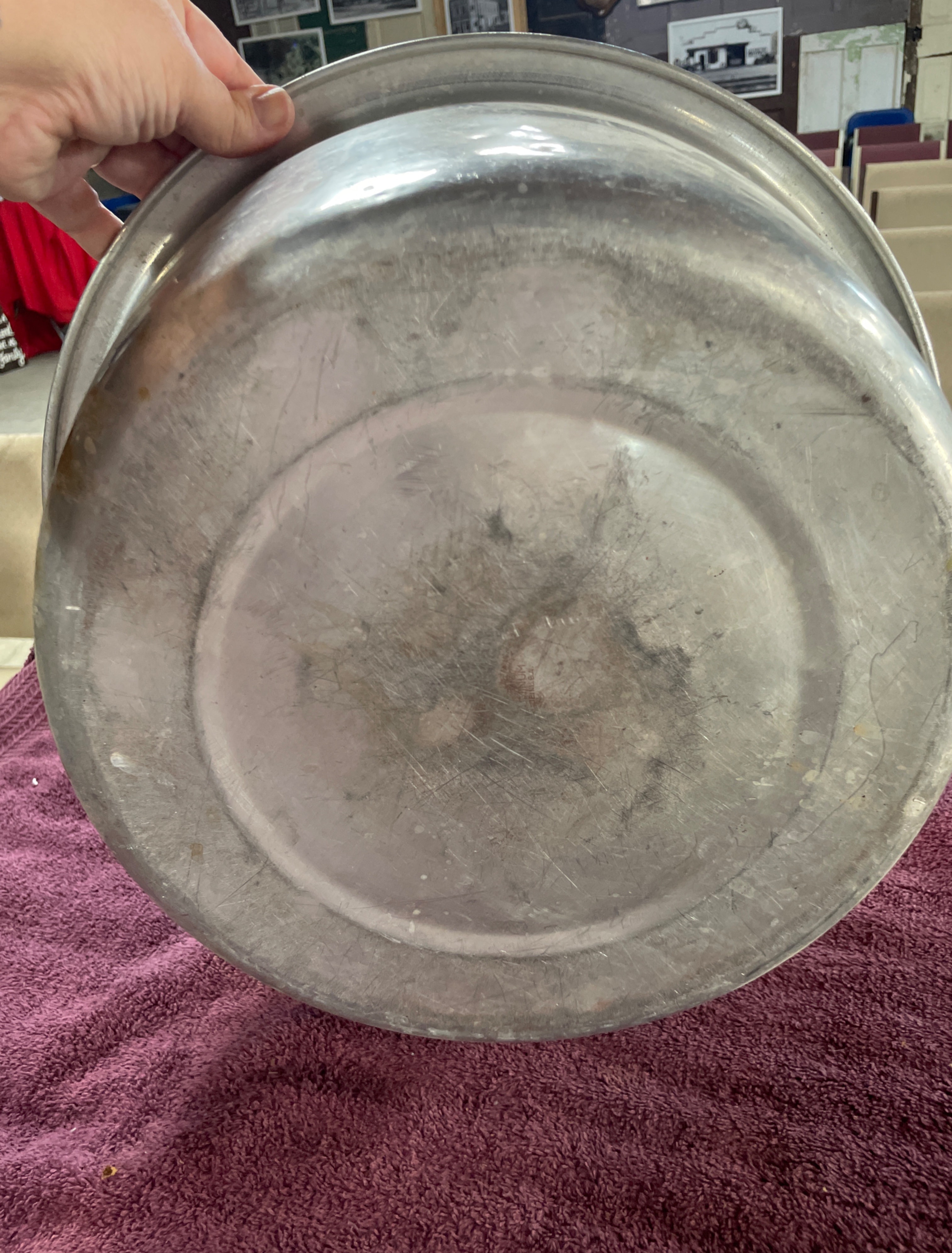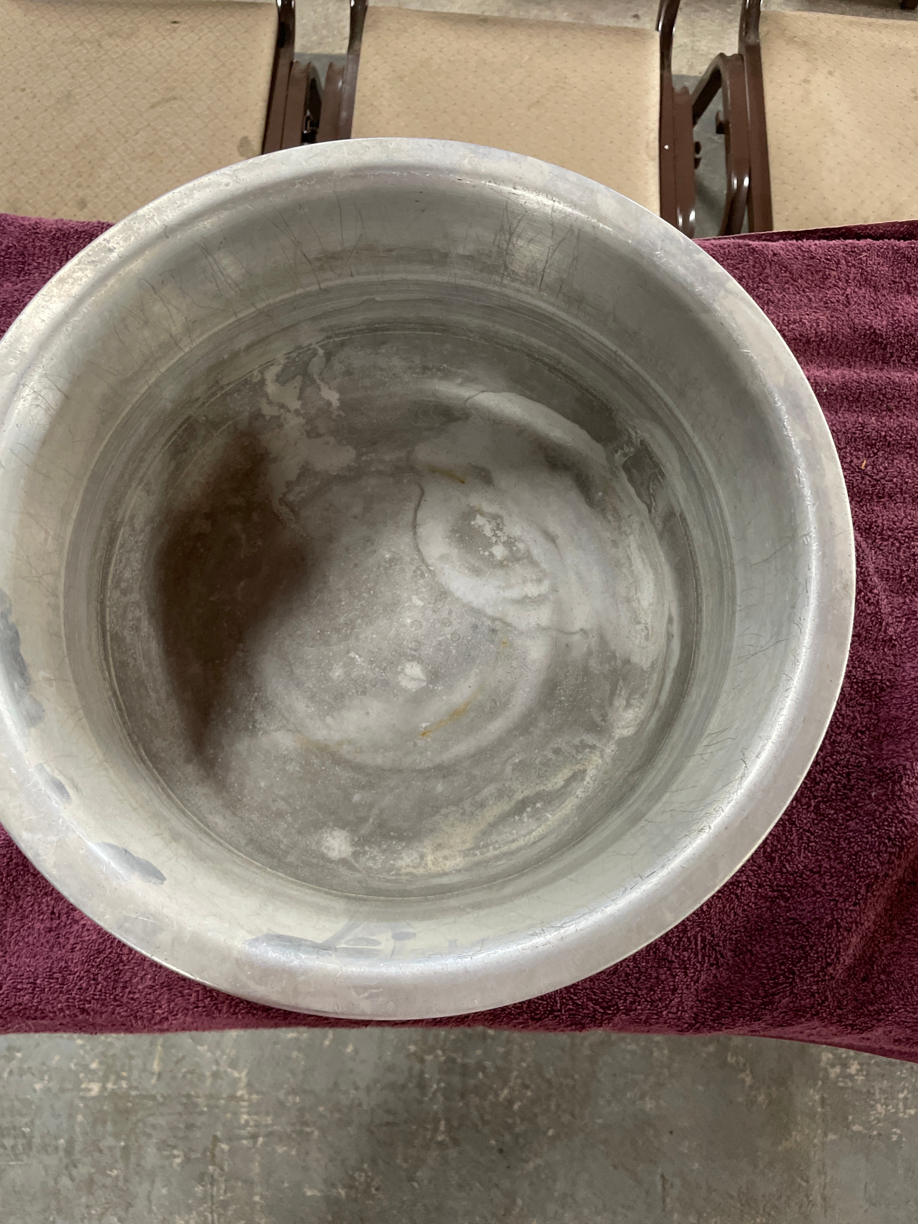 A large, circular, utilitarian style basin or bowl, likely constructed from aluminum. The item features tapered sides and a rolled rim. No manufacturer’s marks or identifying text are visible on the basin itself.