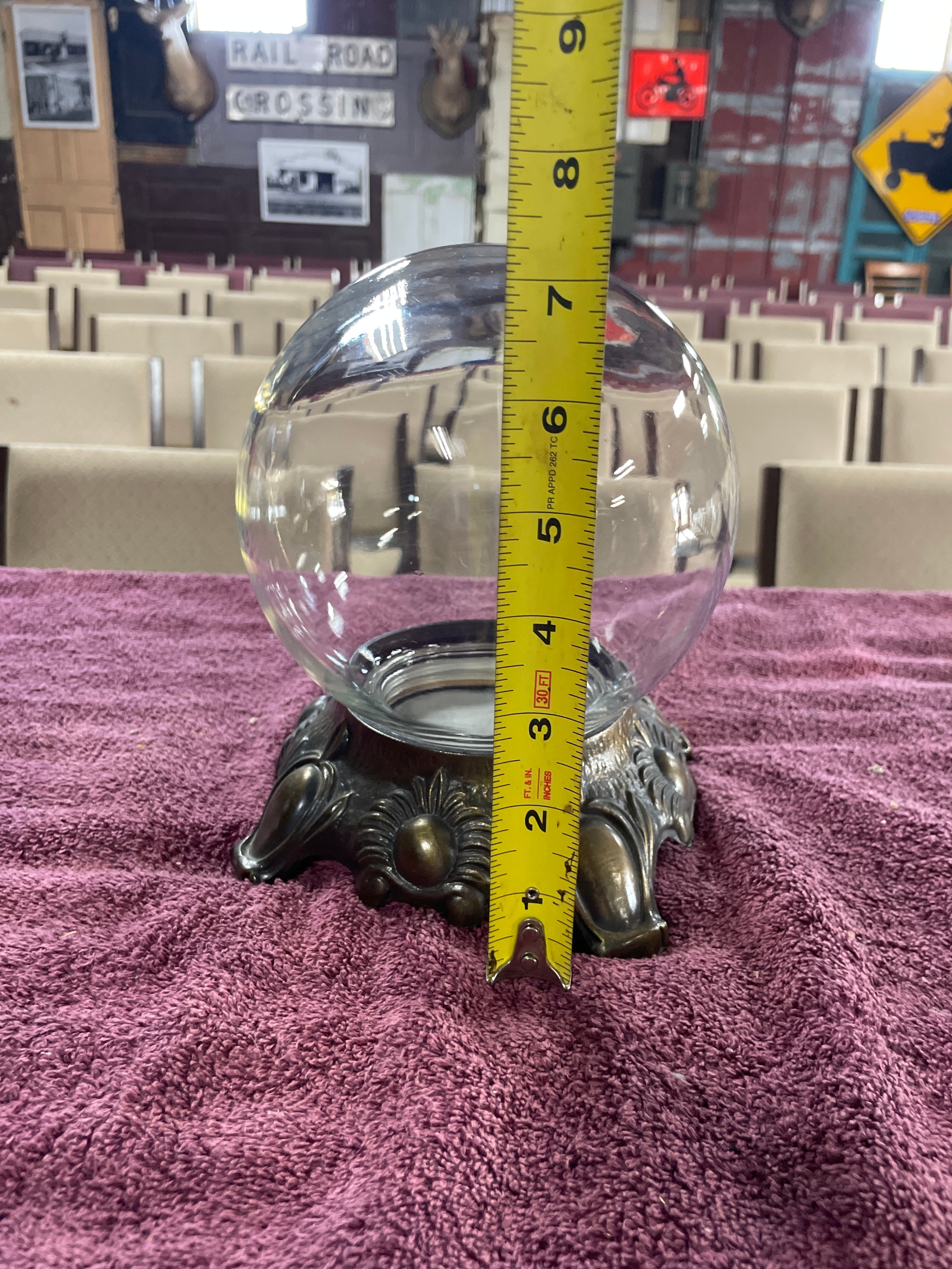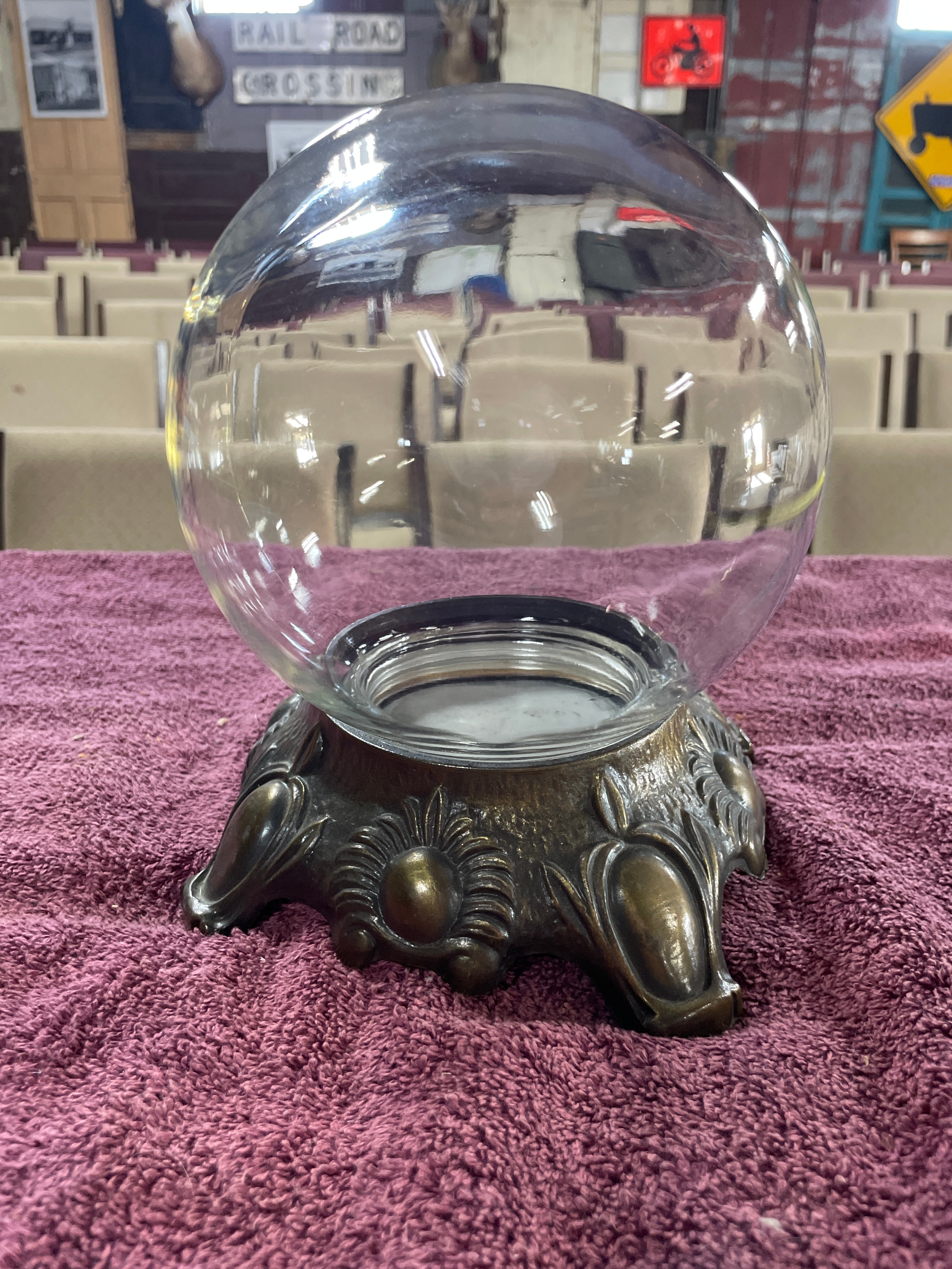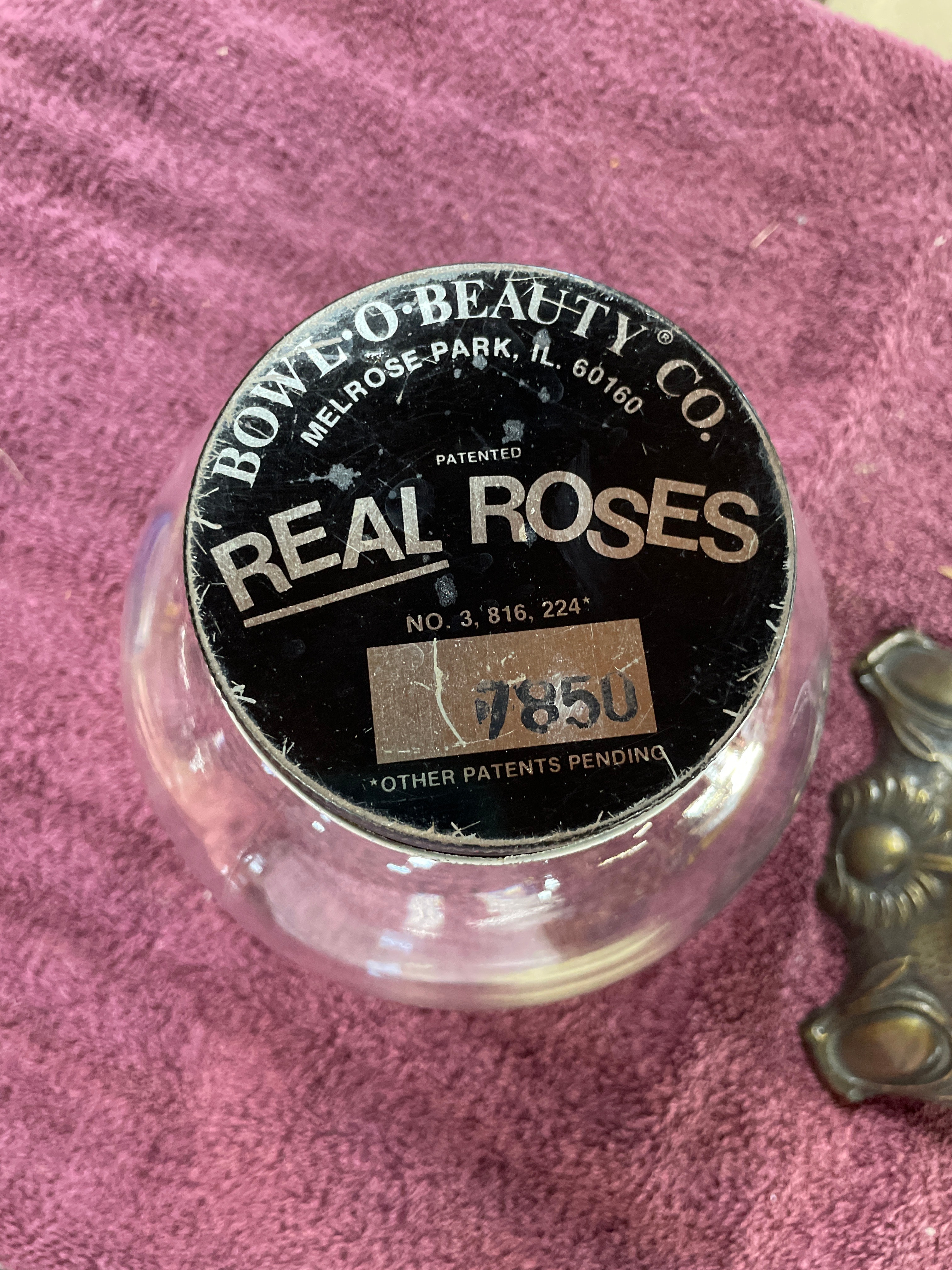 A vintage Bowl-O-Beauty ‘Real Roses’ glass dome jar terrarium, produced by Bow Lo Beauty Co. of Melrose Park, IL. The piece features a clear, spherical molded glass jar designed to sit within an ornate, patinated cast metal stand. The stand is decorated with molded floral or sunburst motifs and rests on four scrolled feet, consistent with a Mid-20th Century aesthetic. The black screw-top lid of the jar is extensively marked with "BOW LO BEAUTY CO. MELROSE PARK, IL. 60160," "PATENTED, " "REAL ROSES, " and "NO. 3, 816, 224," along with "OTHER PATENTS PENDING." A separate sticker on the lid displays the number "7850."