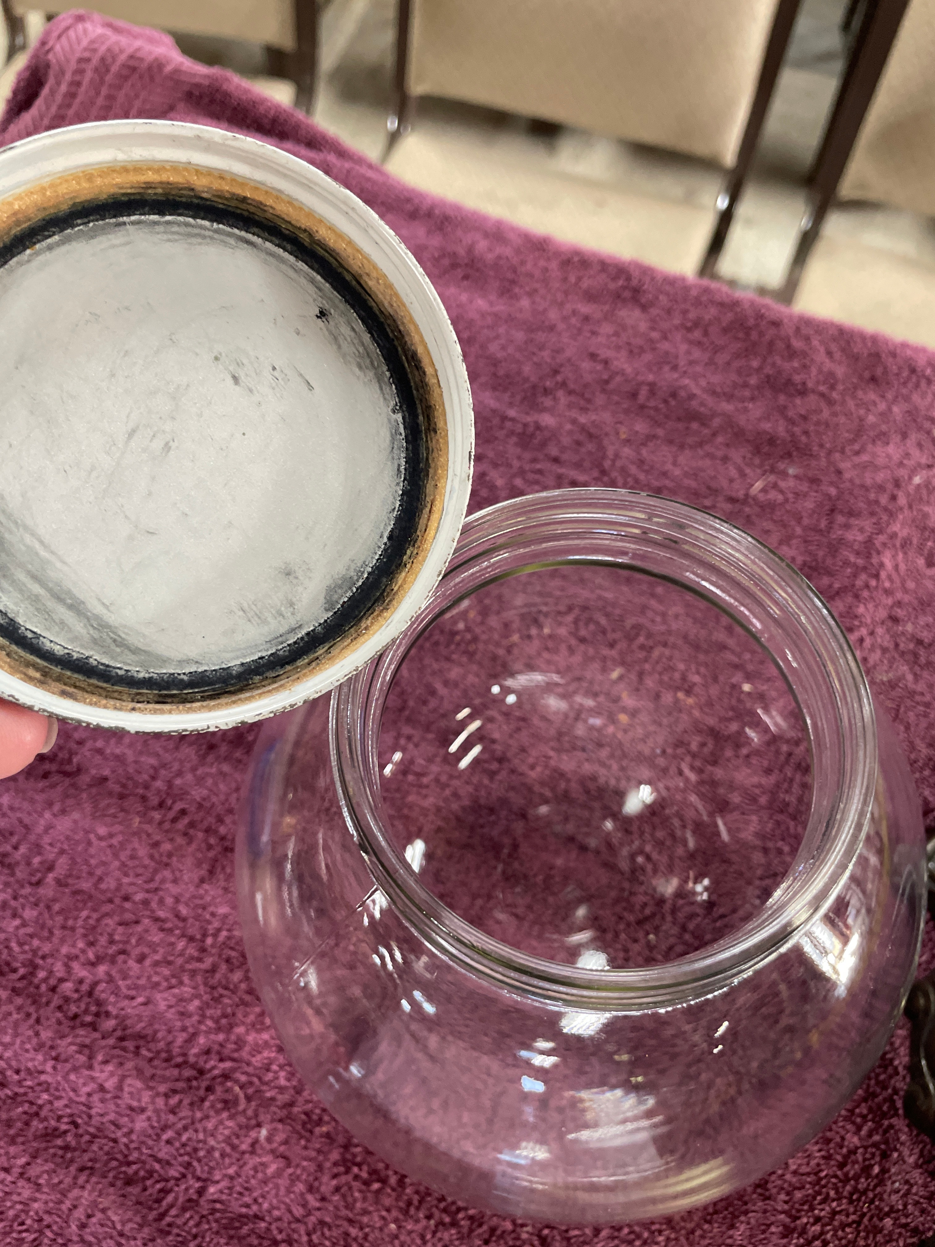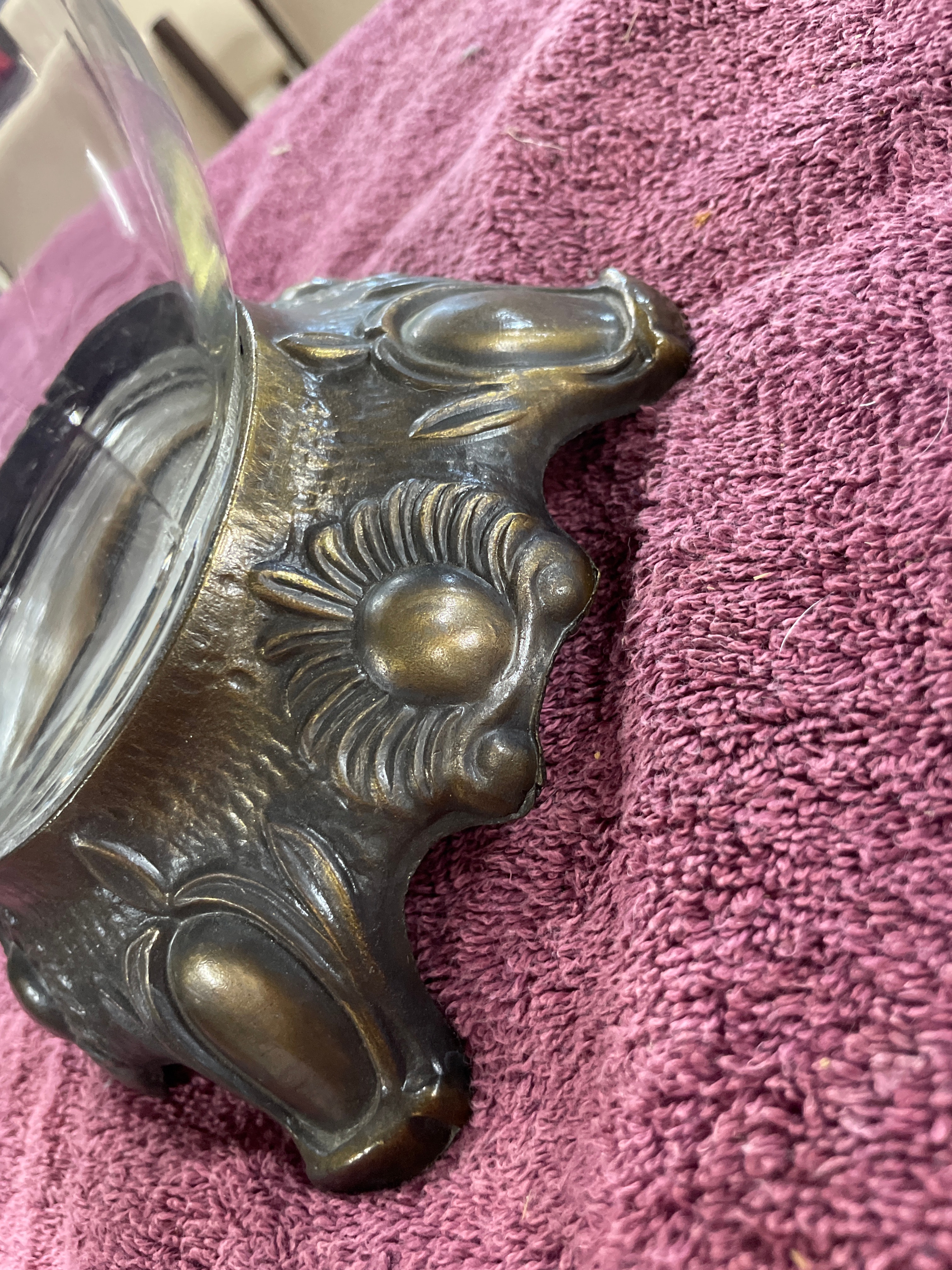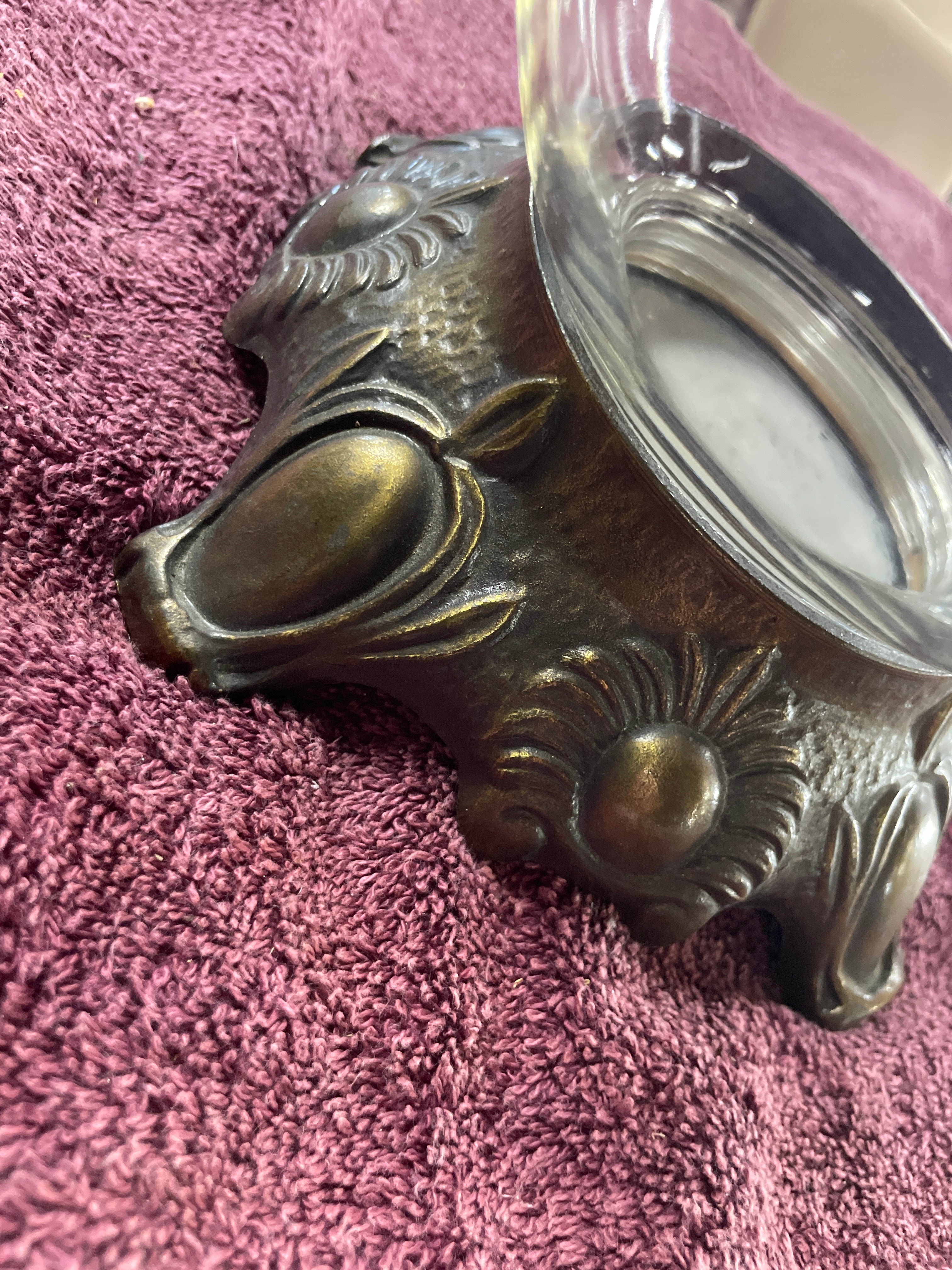 A vintage Bowl-O-Beauty ‘Real Roses’ glass dome jar terrarium, produced by Bow Lo Beauty Co. of Melrose Park, IL. The piece features a clear, spherical molded glass jar designed to sit within an ornate, patinated cast metal stand. The stand is decorated with molded floral or sunburst motifs and rests on four scrolled feet, consistent with a Mid-20th Century aesthetic. The black screw-top lid of the jar is extensively marked with "BOW LO BEAUTY CO. MELROSE PARK, IL. 60160," "PATENTED, " "REAL ROSES, " and "NO. 3, 816, 224," along with "OTHER PATENTS PENDING." A separate sticker on the lid displays the number "7850."