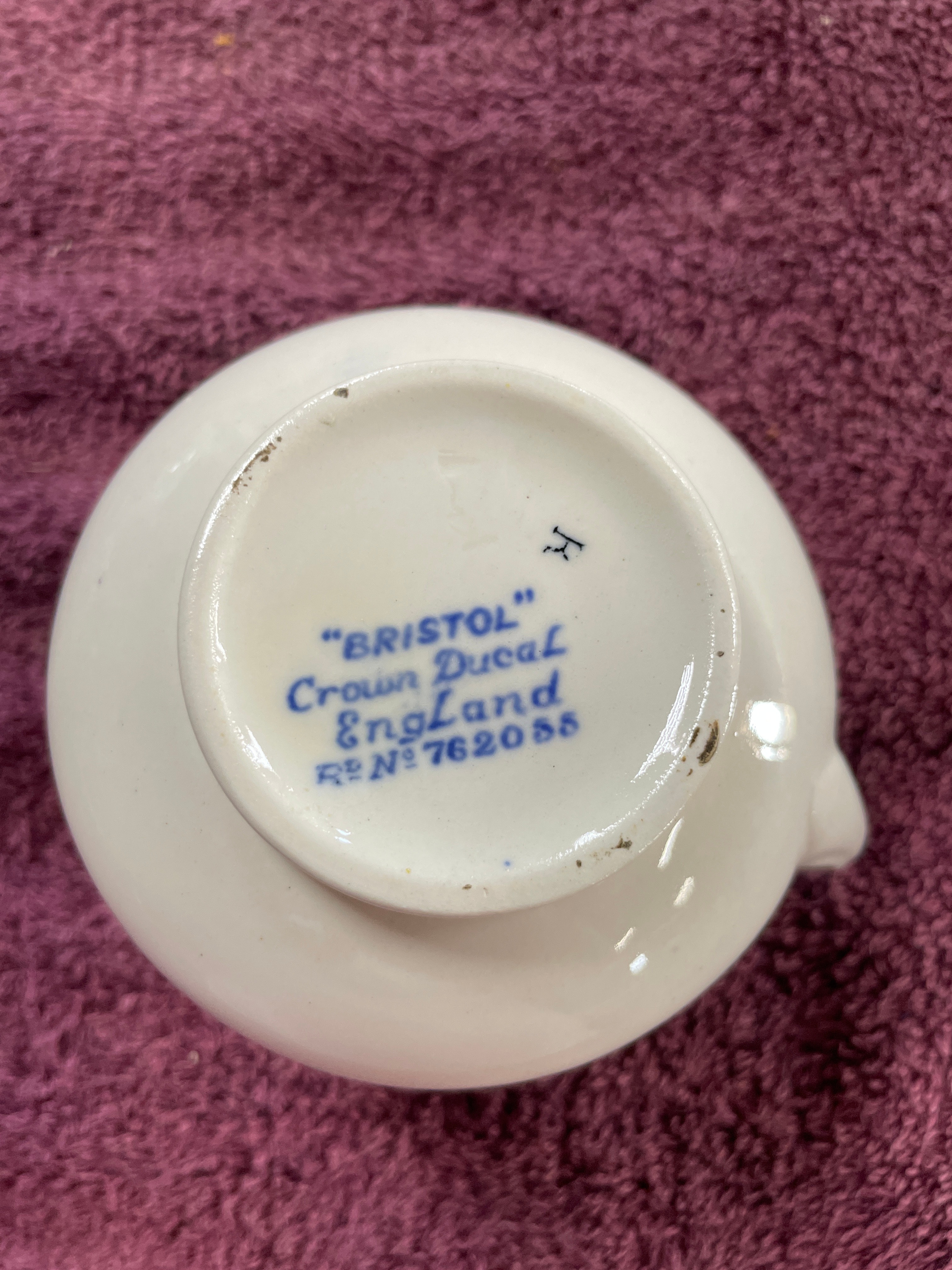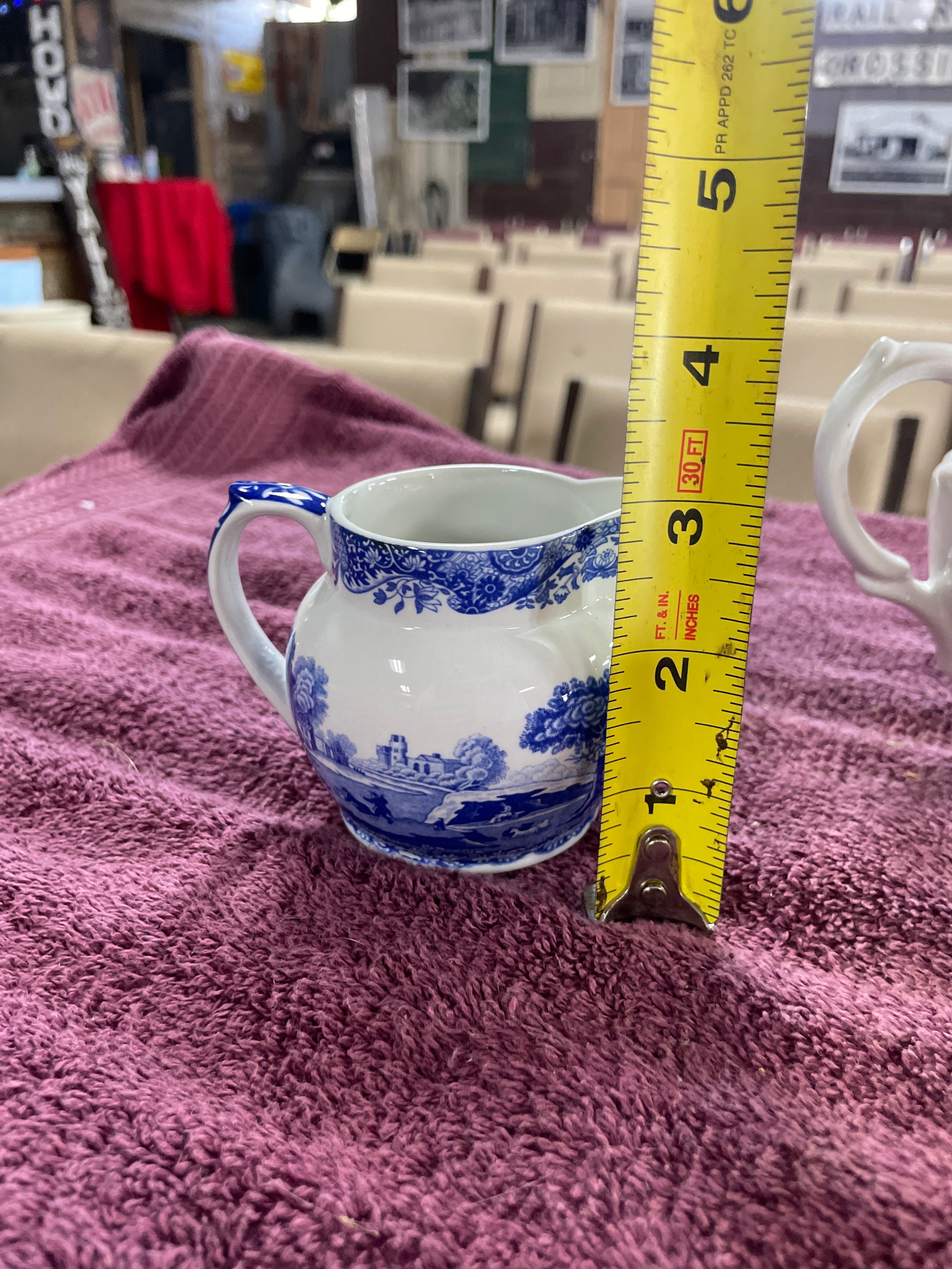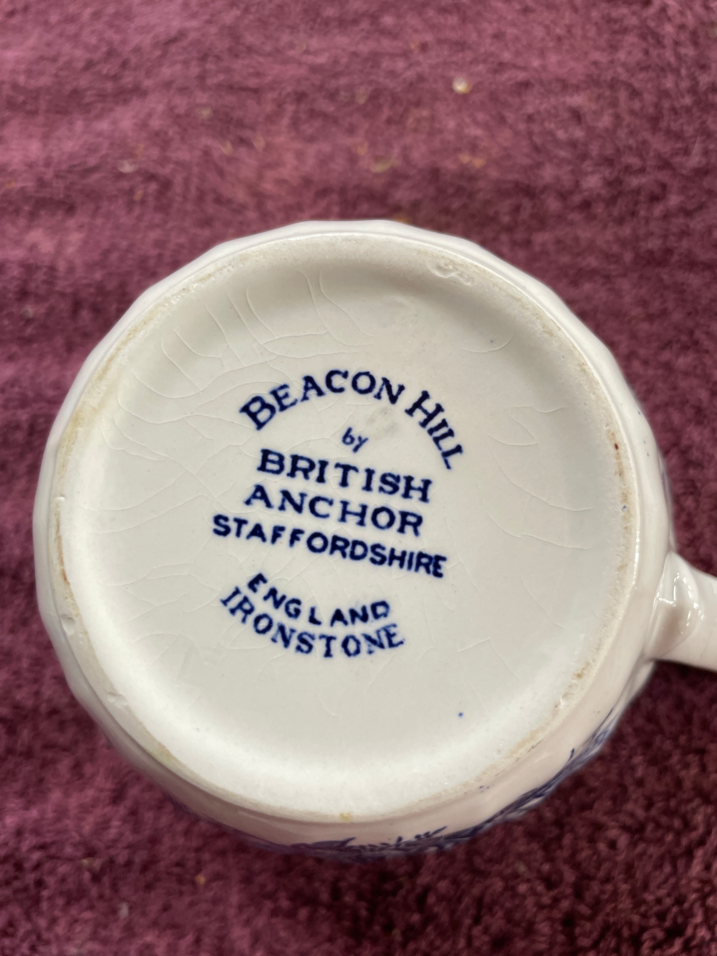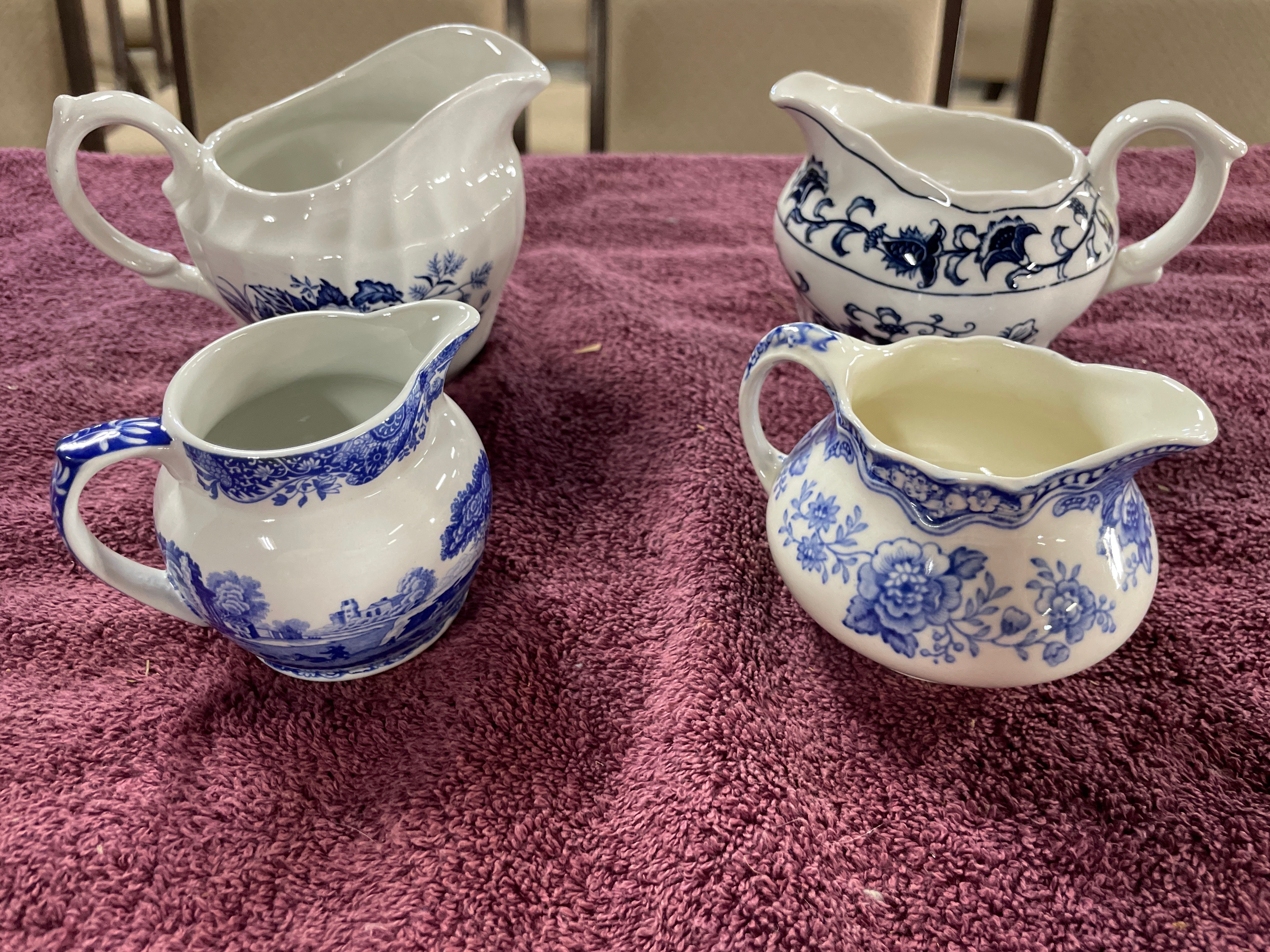 This lot presents four small ceramic pitchers or creamers, each adorned with unique blue and white transferware patterns. The first is a Spode ‘Italian’ pattern creamer, explicitly marked "Made in England, Spode Design C.1816 AO, " indicating a design from that period, and includes "Dishwasher Safe" and "Microwave Safe" directives; it features a neoclassical landscape design. The second is a faceted ironstone creamer marked "Beacon Hill by British Anchor Staffordshire England, " showcasing a dense blue floral pattern. The third creamer is a "Crown Ducal England ‘Bristol’" piece, identified by "R EN No 762088," featuring a scalloped rim and a full floral motif. The final item is a Nikko Ironstone creamer, stamped "Double Phoenix Japan, " displaying a stylized floral and foliate design.