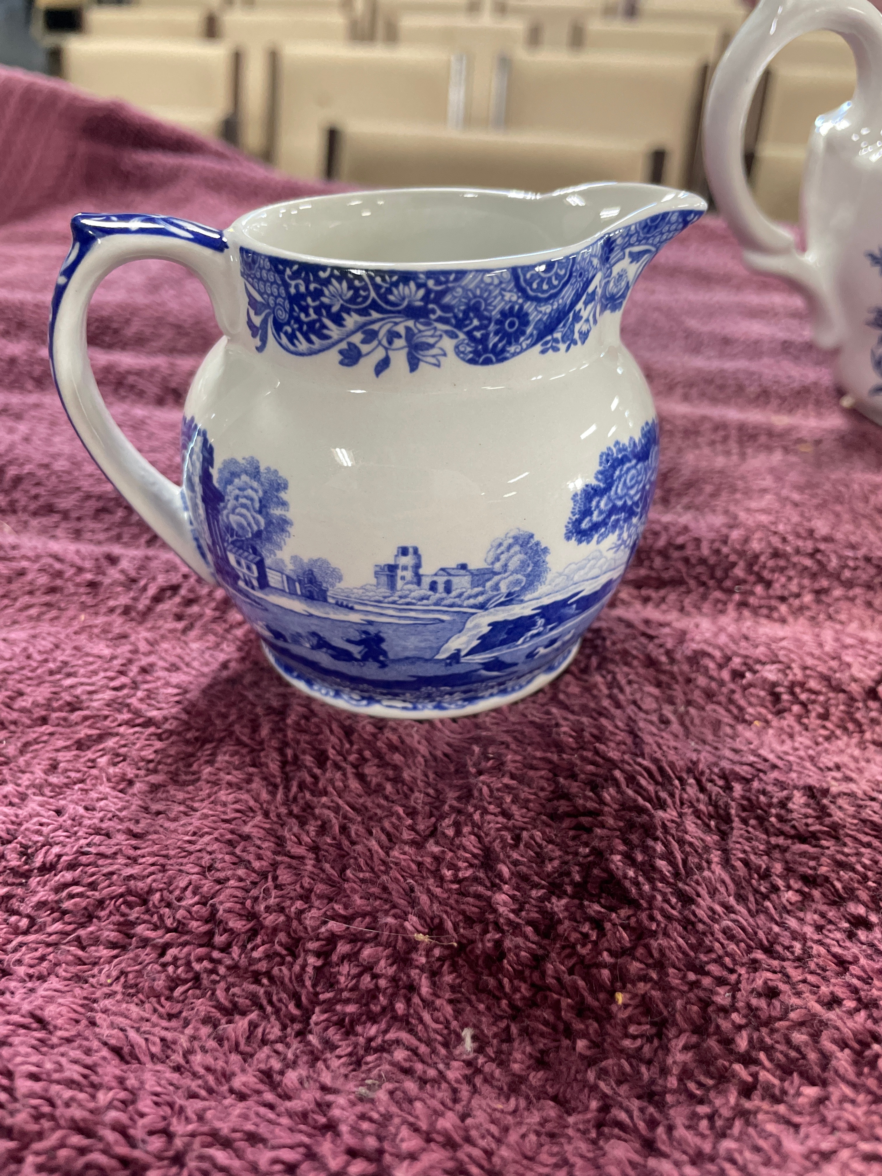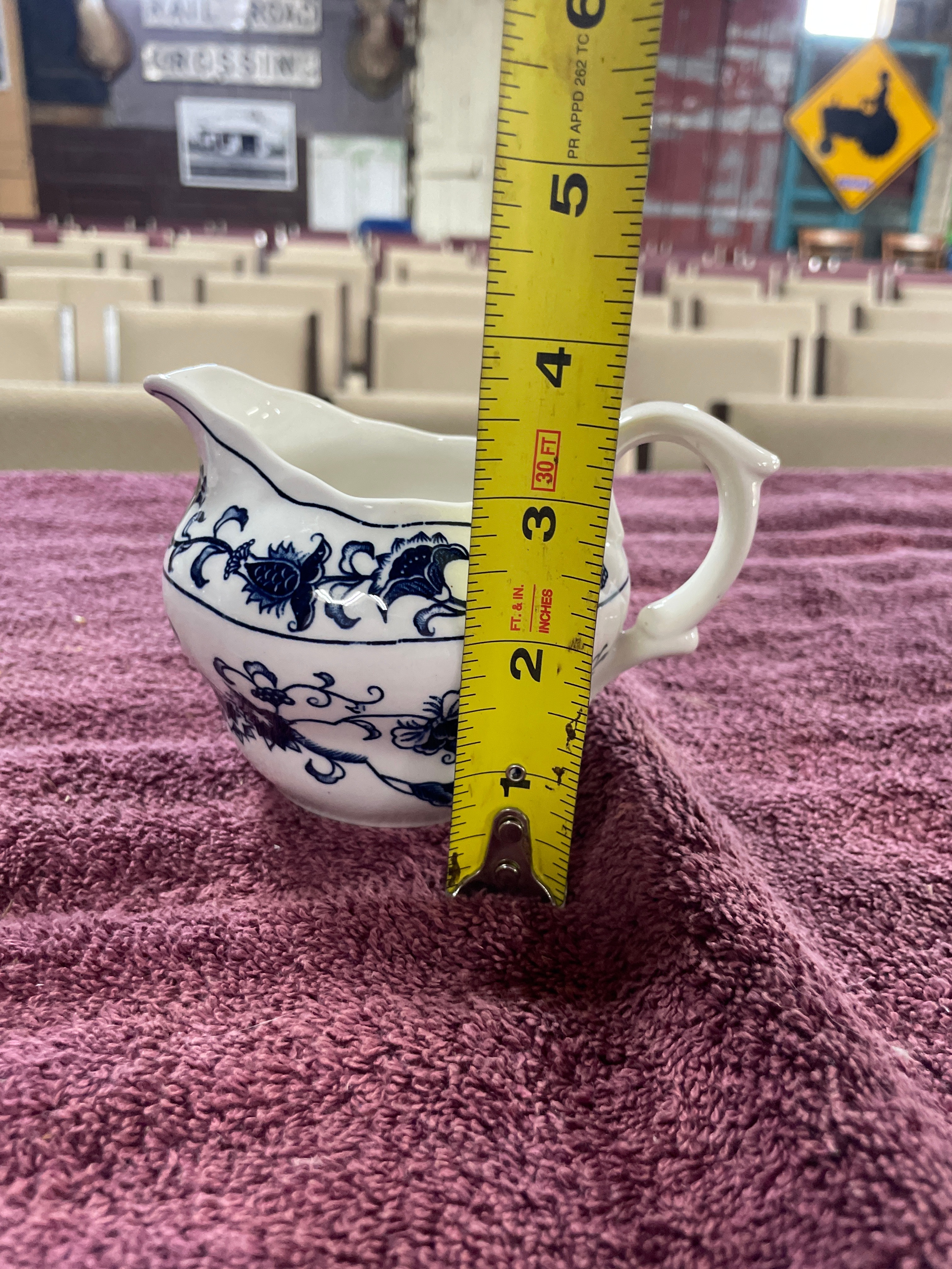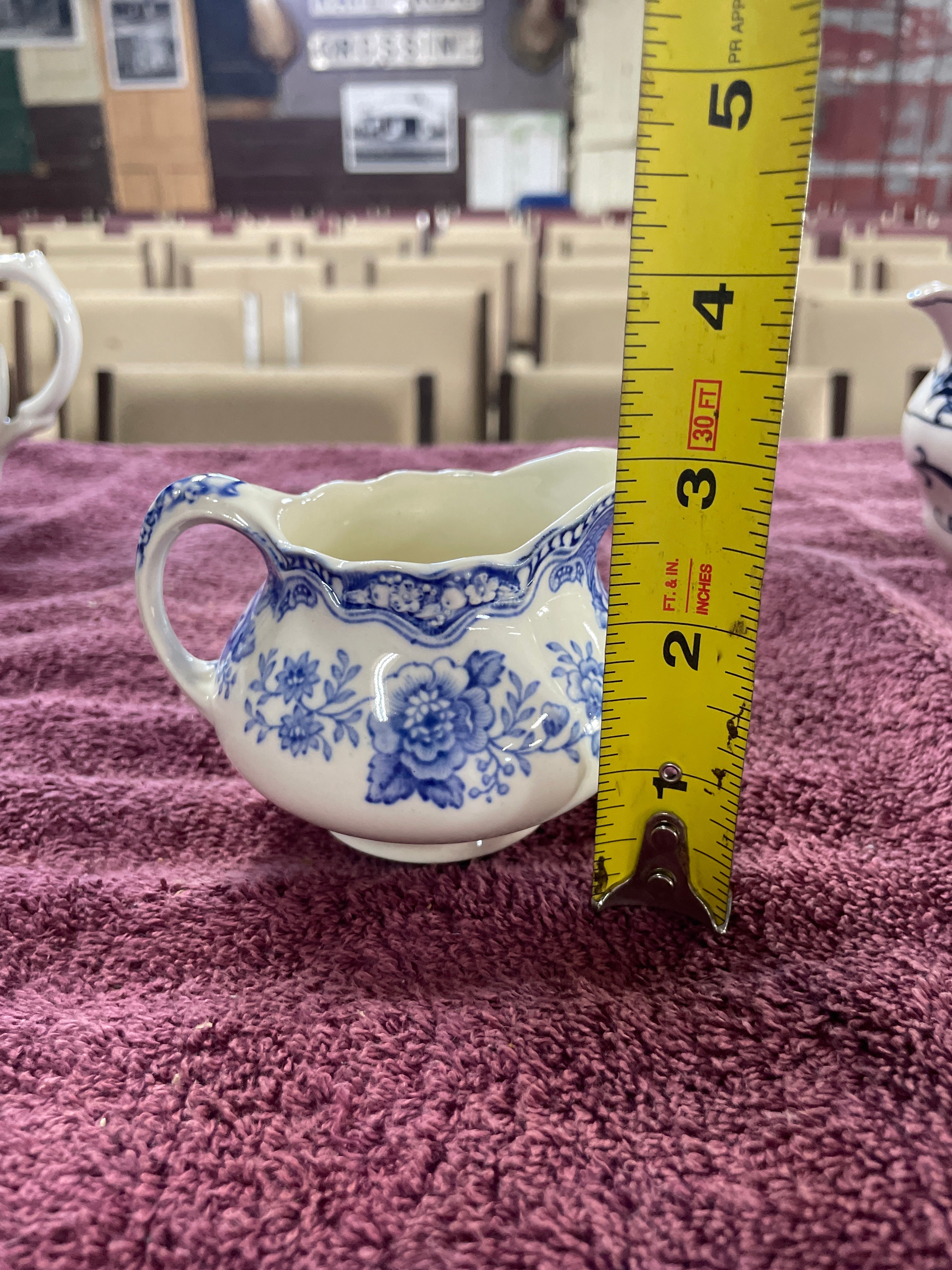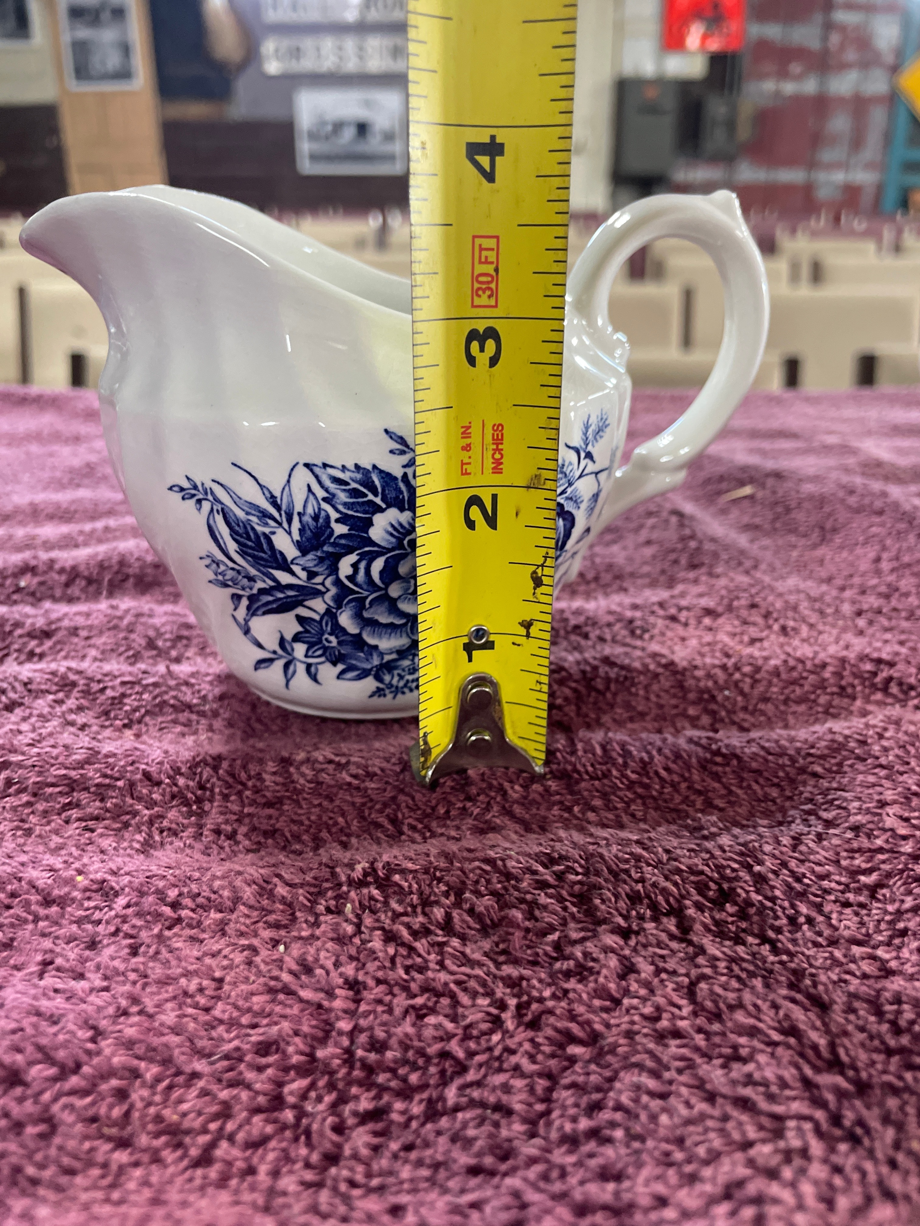 This lot presents four small ceramic pitchers or creamers, each adorned with unique blue and white transferware patterns. The first is a Spode ‘Italian’ pattern creamer, explicitly marked "Made in England, Spode Design C.1816 AO, " indicating a design from that period, and includes "Dishwasher Safe" and "Microwave Safe" directives; it features a neoclassical landscape design. The second is a faceted ironstone creamer marked "Beacon Hill by British Anchor Staffordshire England, " showcasing a dense blue floral pattern. The third creamer is a "Crown Ducal England ‘Bristol’" piece, identified by "R EN No 762088," featuring a scalloped rim and a full floral motif. The final item is a Nikko Ironstone creamer, stamped "Double Phoenix Japan, " displaying a stylized floral and foliate design.