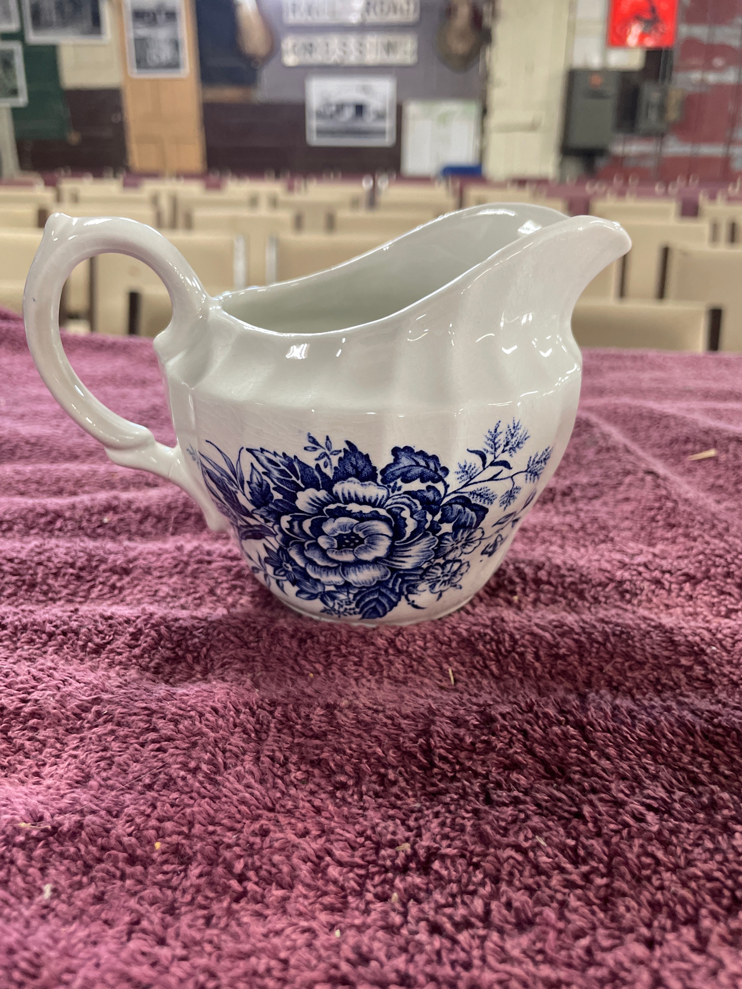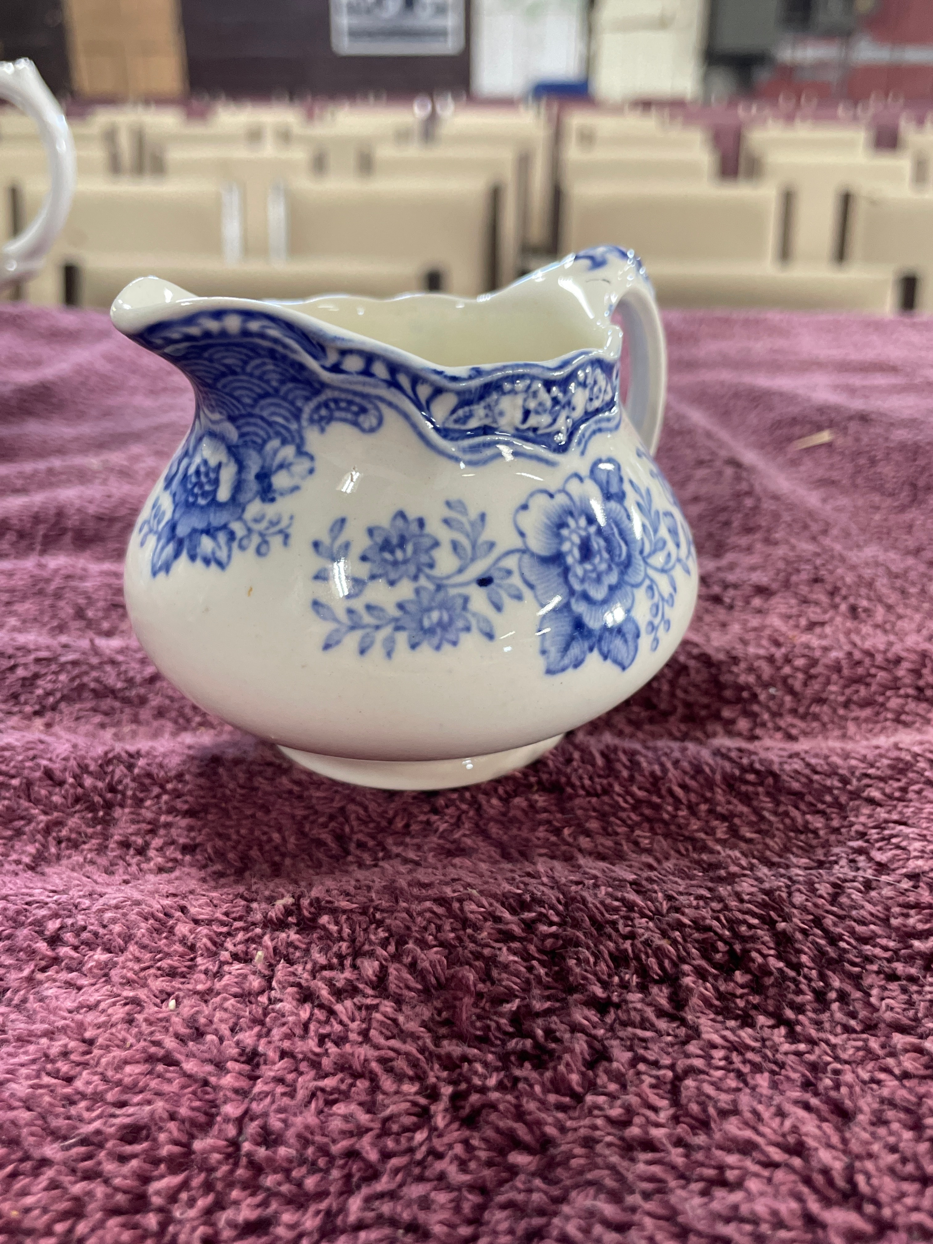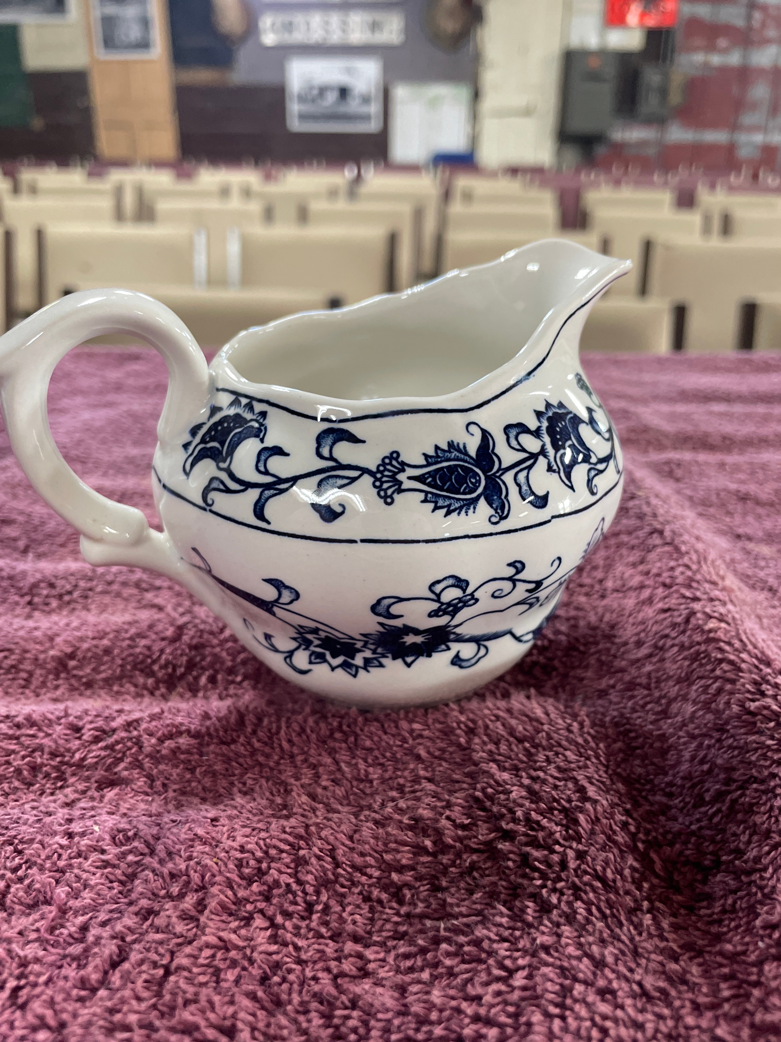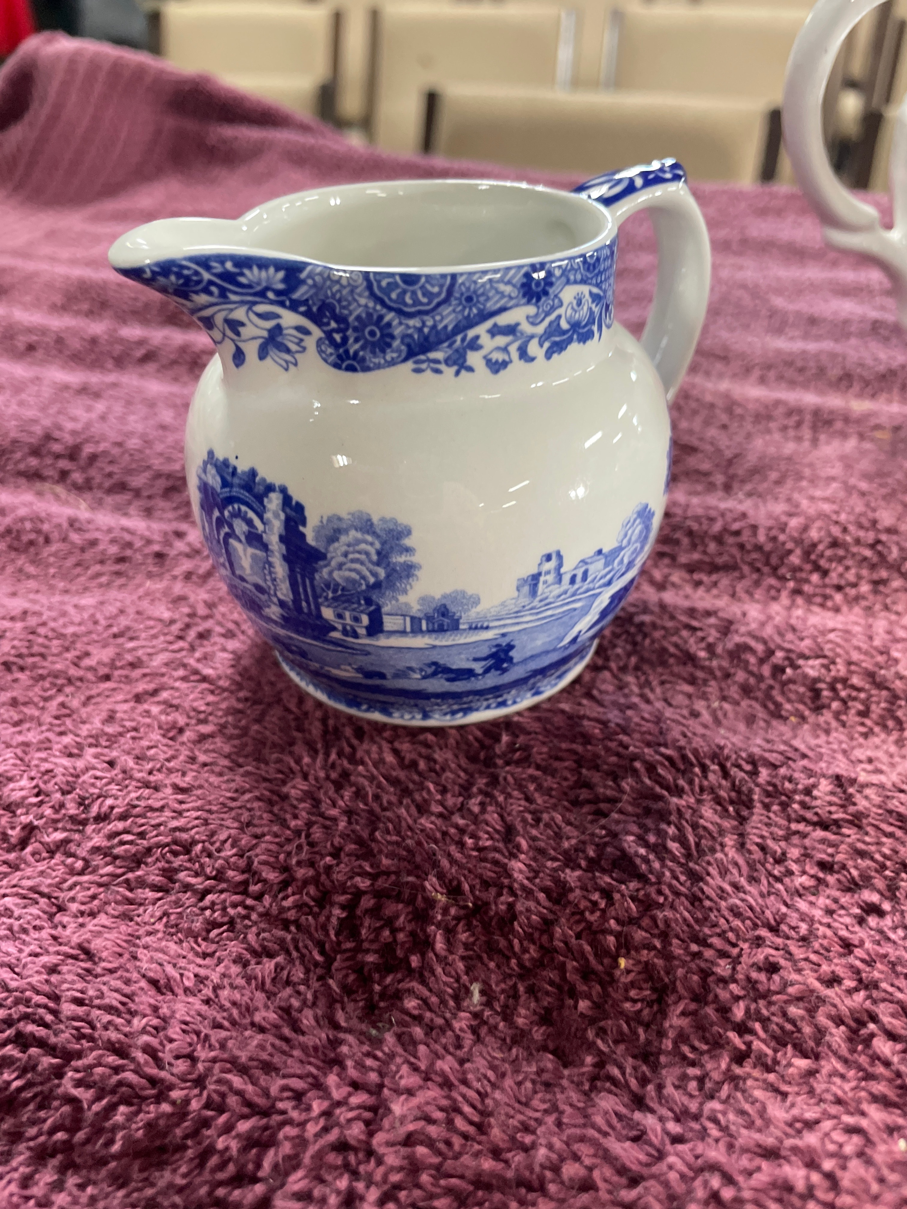 This lot presents four small ceramic pitchers or creamers, each adorned with unique blue and white transferware patterns. The first is a Spode ‘Italian’ pattern creamer, explicitly marked "Made in England, Spode Design C.1816 AO, " indicating a design from that period, and includes "Dishwasher Safe" and "Microwave Safe" directives; it features a neoclassical landscape design. The second is a faceted ironstone creamer marked "Beacon Hill by British Anchor Staffordshire England, " showcasing a dense blue floral pattern. The third creamer is a "Crown Ducal England ‘Bristol’" piece, identified by "R EN No 762088," featuring a scalloped rim and a full floral motif. The final item is a Nikko Ironstone creamer, stamped "Double Phoenix Japan, " displaying a stylized floral and foliate design.