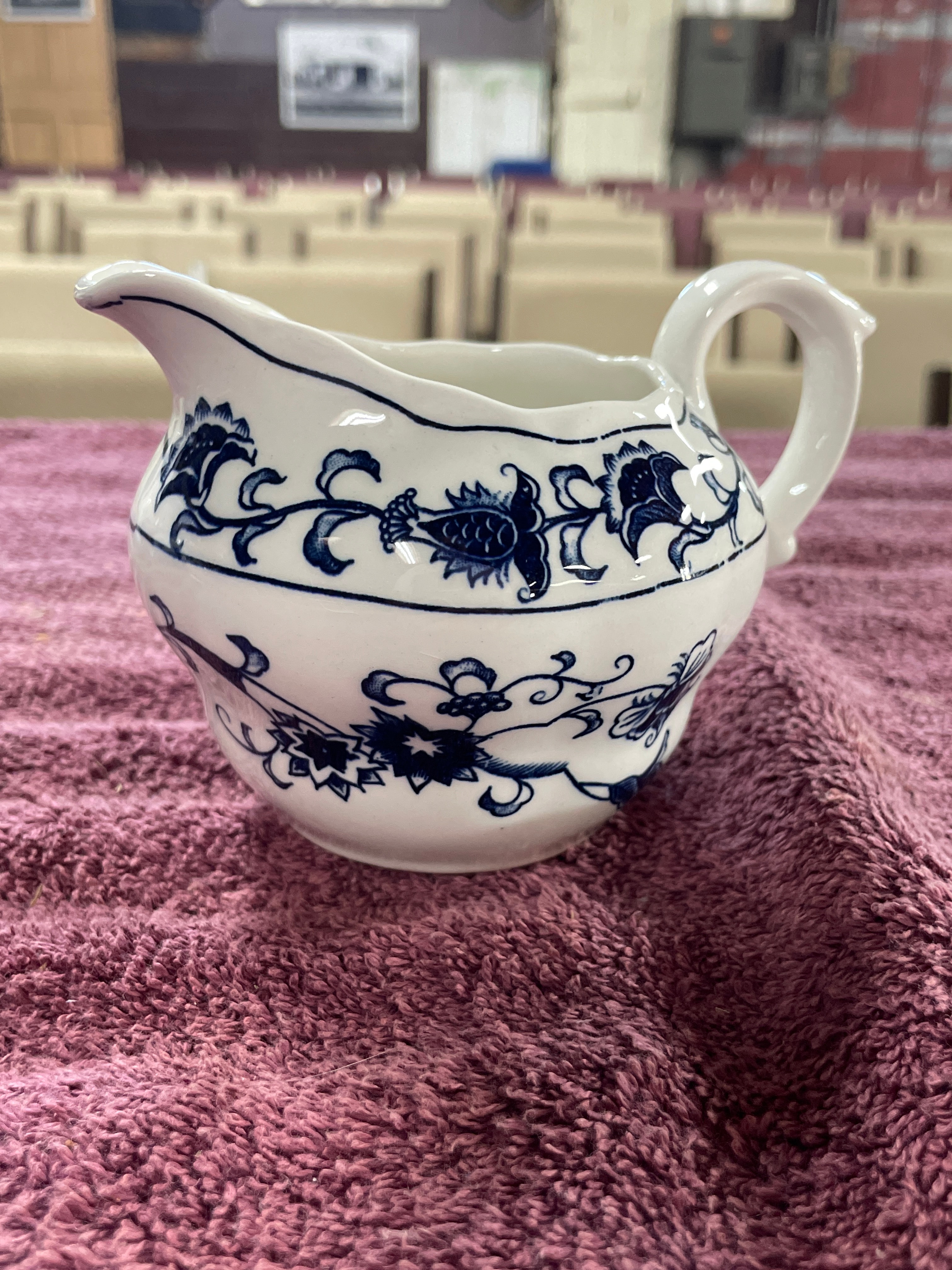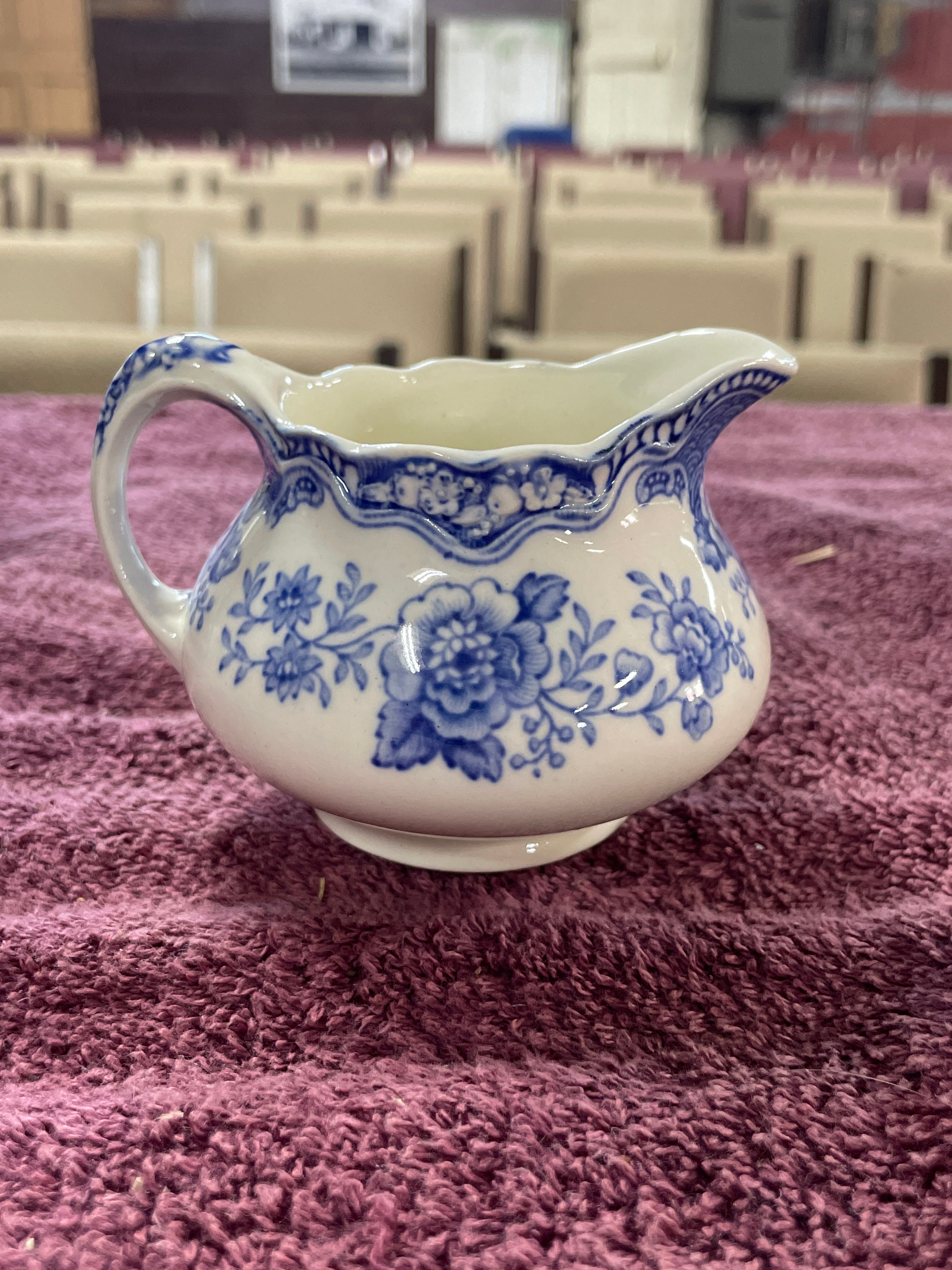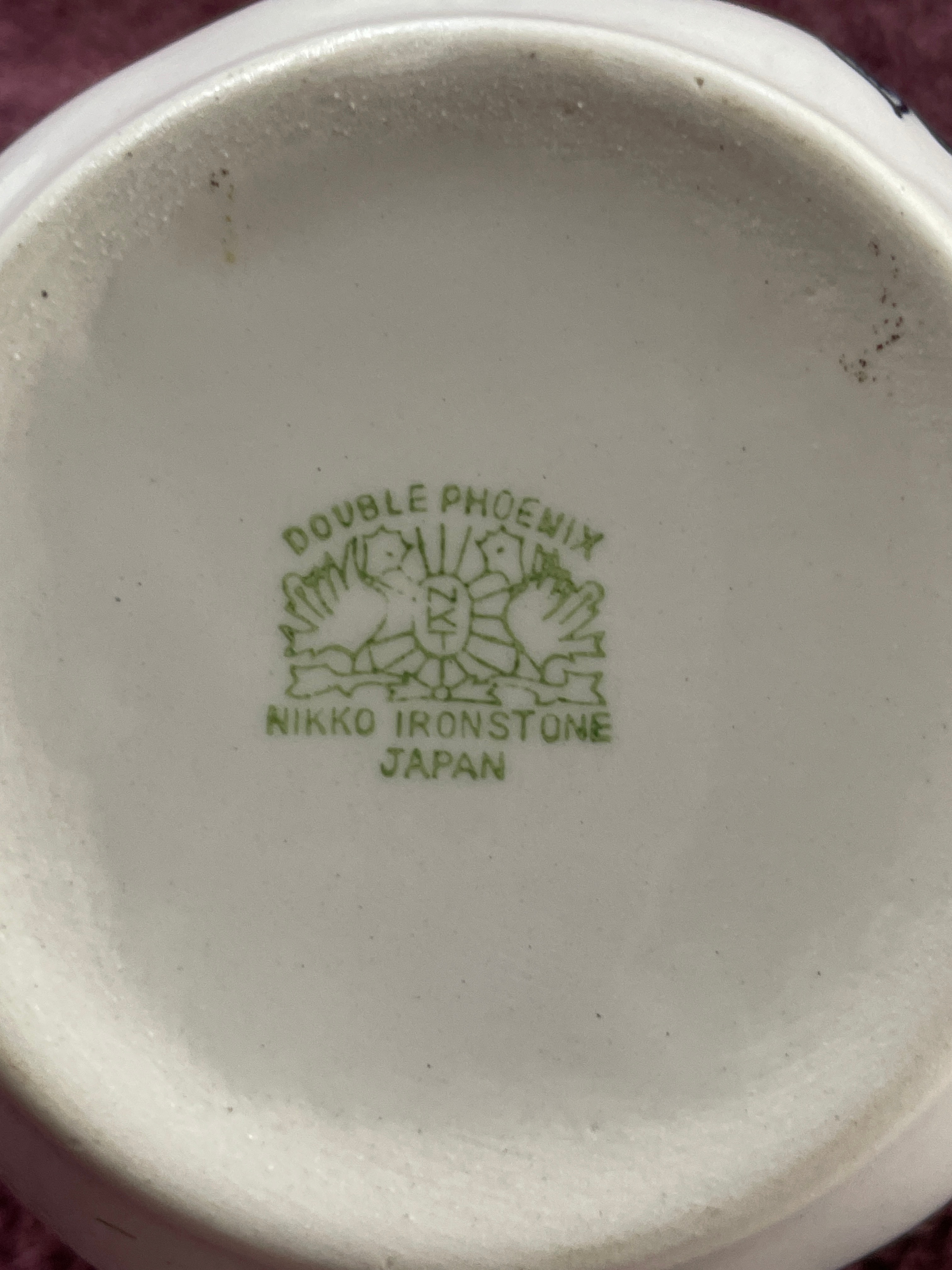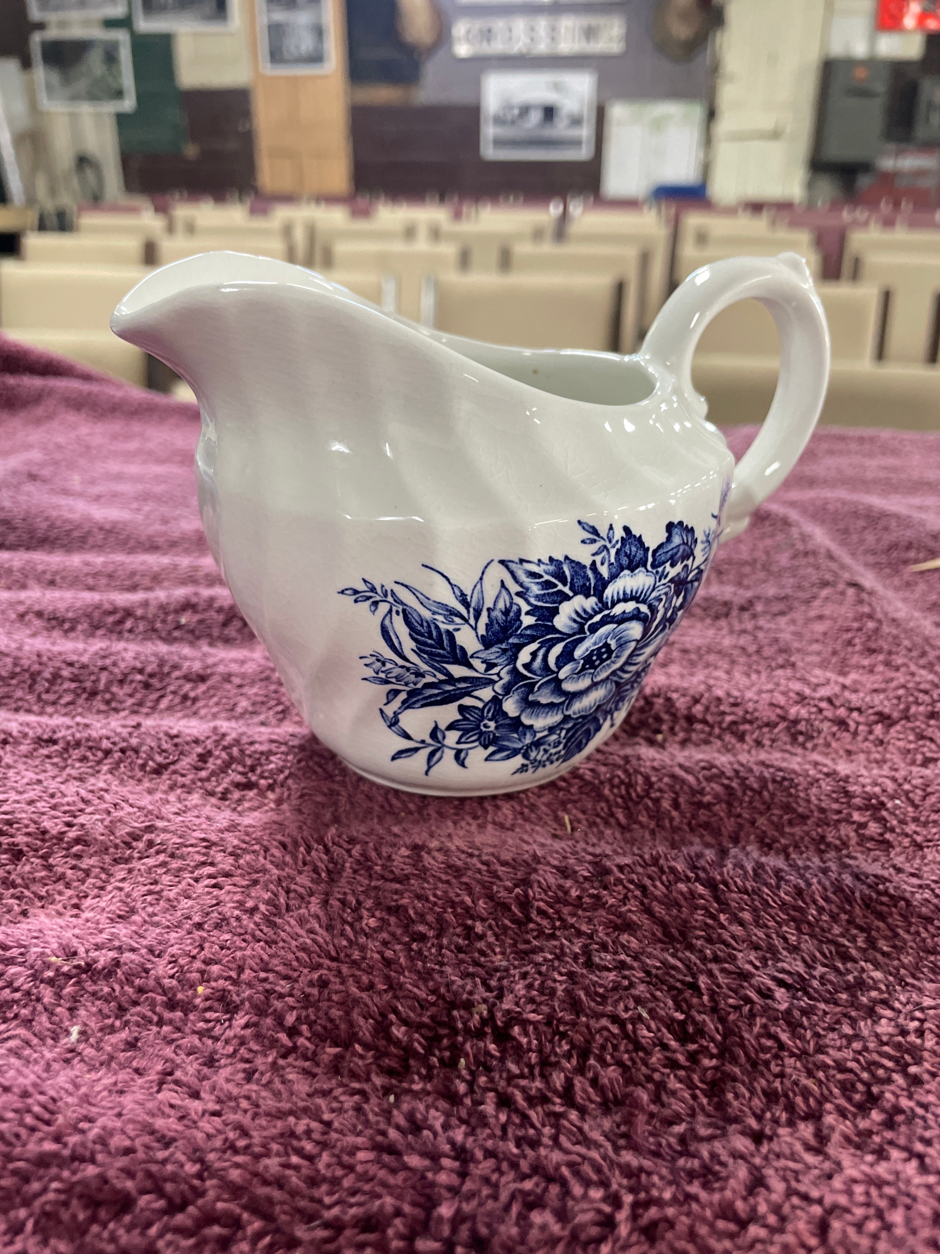 This lot presents four small ceramic pitchers or creamers, each adorned with unique blue and white transferware patterns. The first is a Spode ‘Italian’ pattern creamer, explicitly marked "Made in England, Spode Design C.1816 AO, " indicating a design from that period, and includes "Dishwasher Safe" and "Microwave Safe" directives; it features a neoclassical landscape design. The second is a faceted ironstone creamer marked "Beacon Hill by British Anchor Staffordshire England, " showcasing a dense blue floral pattern. The third creamer is a "Crown Ducal England ‘Bristol’" piece, identified by "R EN No 762088," featuring a scalloped rim and a full floral motif. The final item is a Nikko Ironstone creamer, stamped "Double Phoenix Japan, " displaying a stylized floral and foliate design.