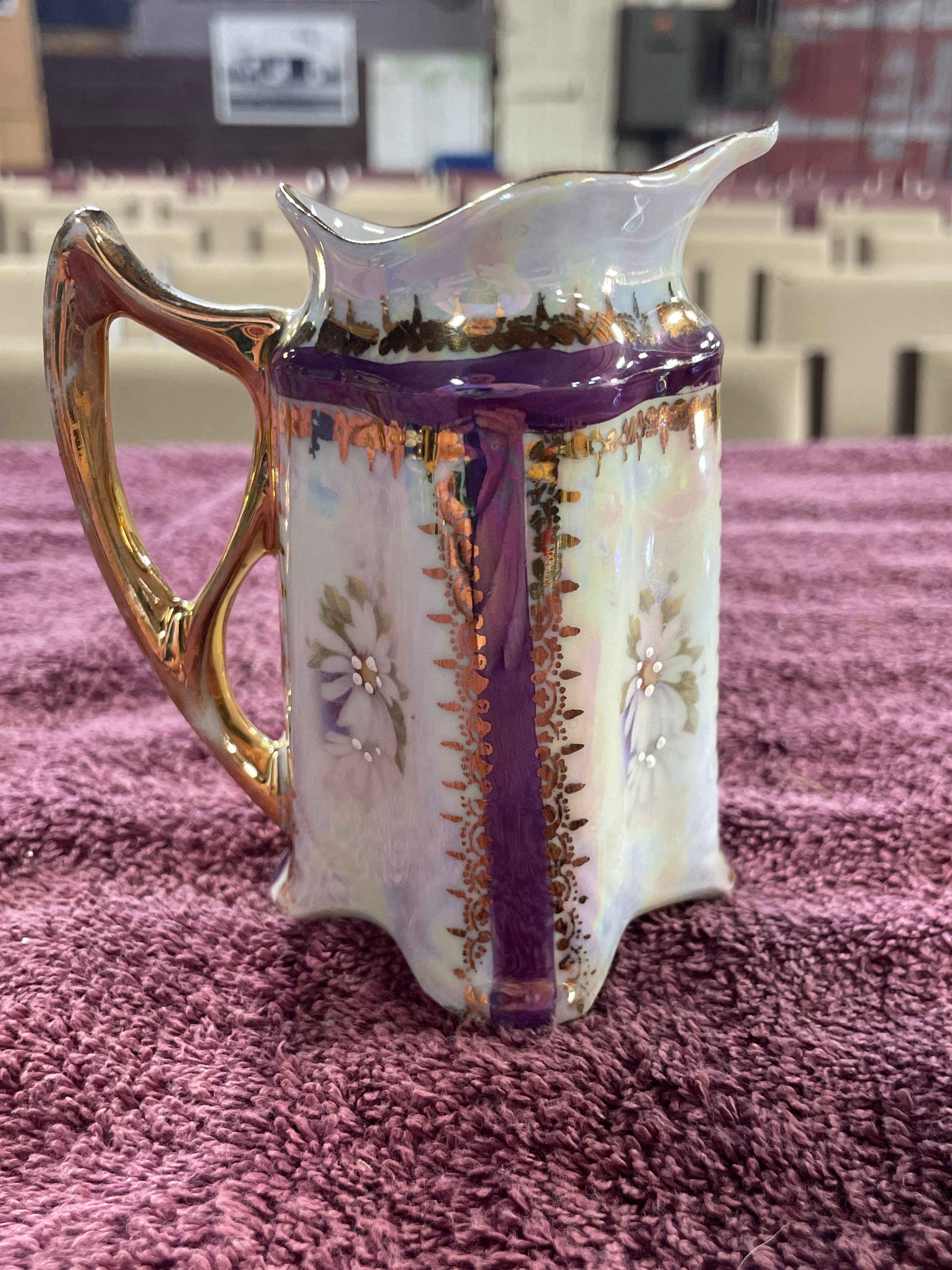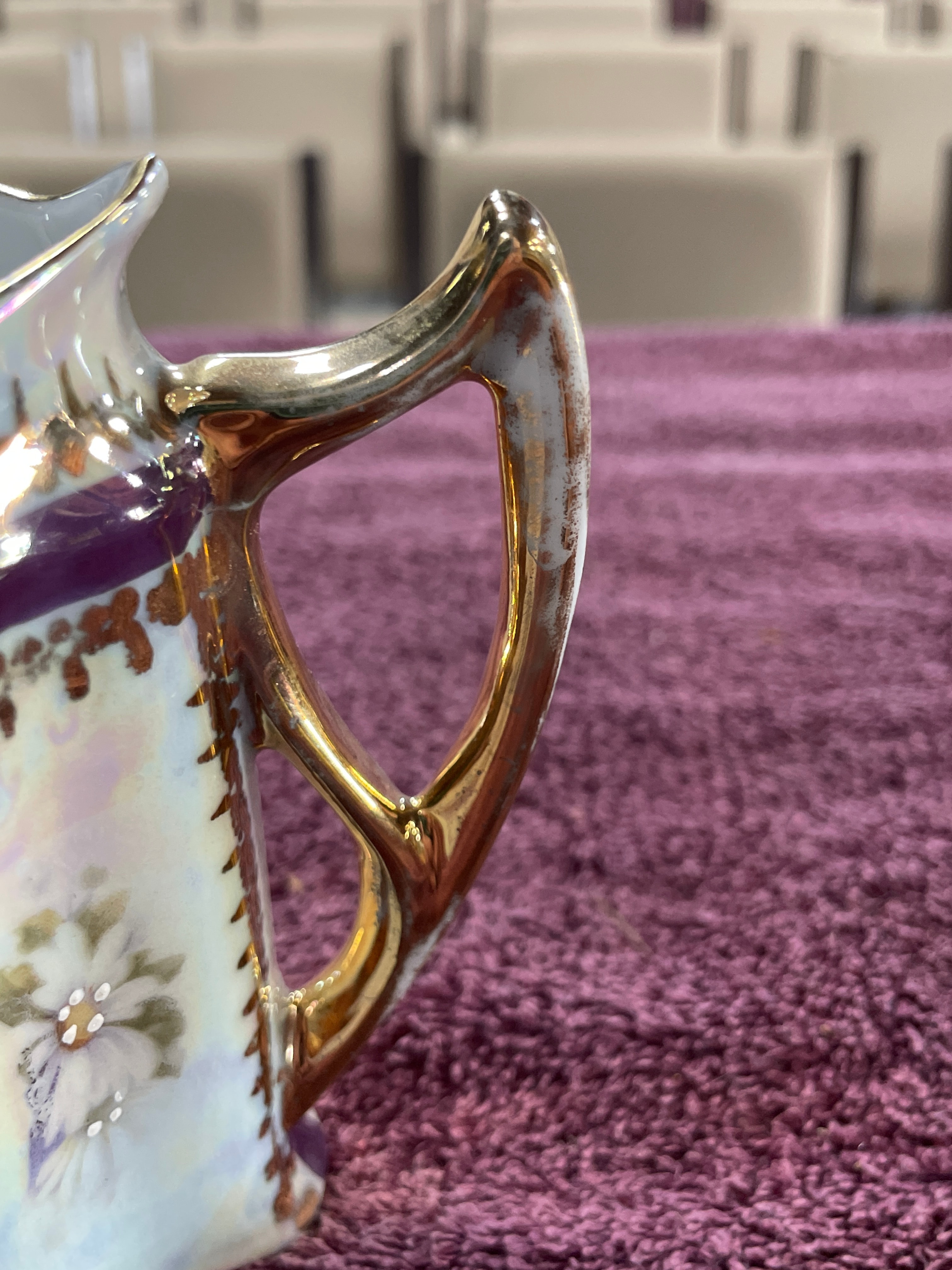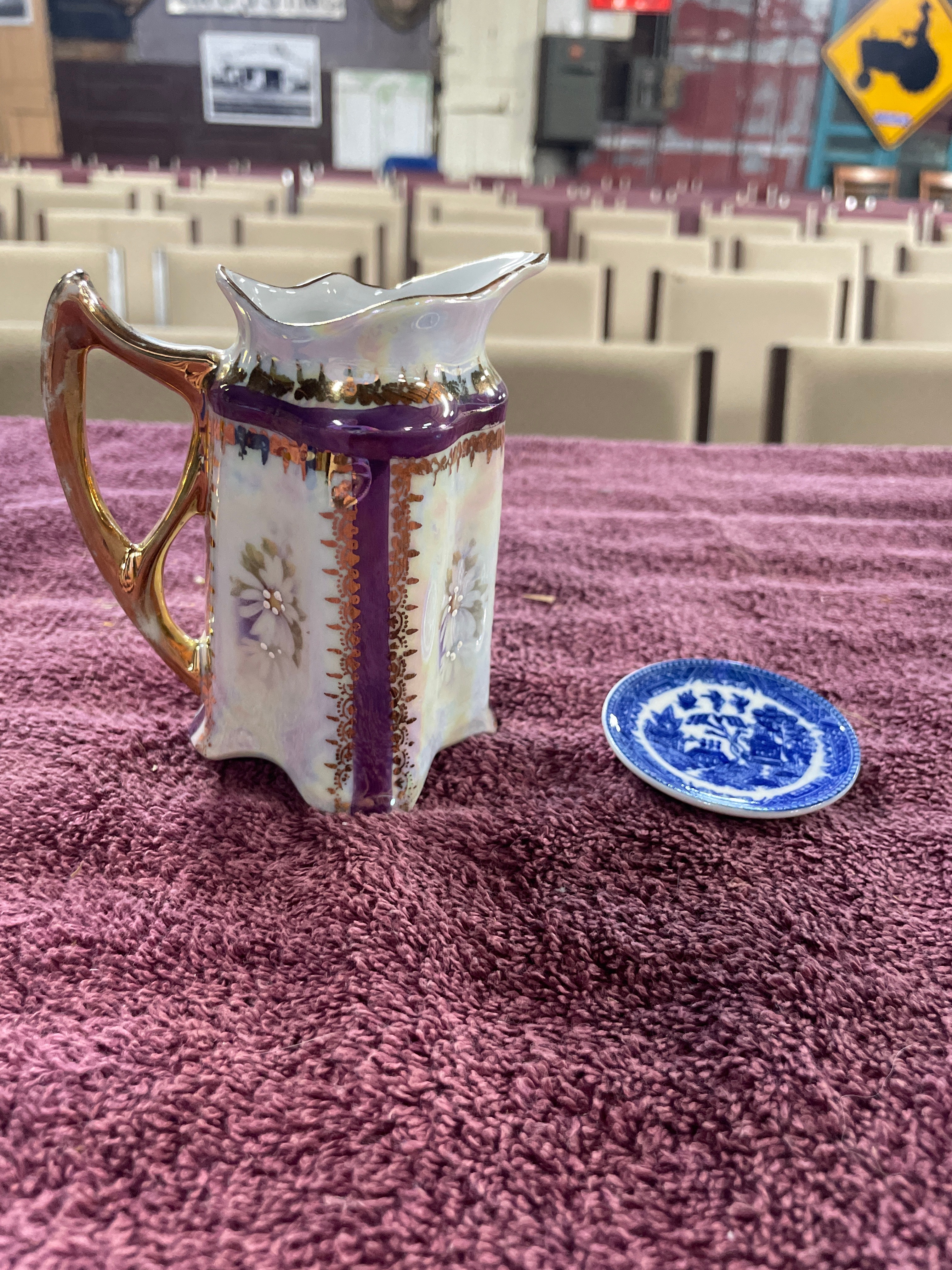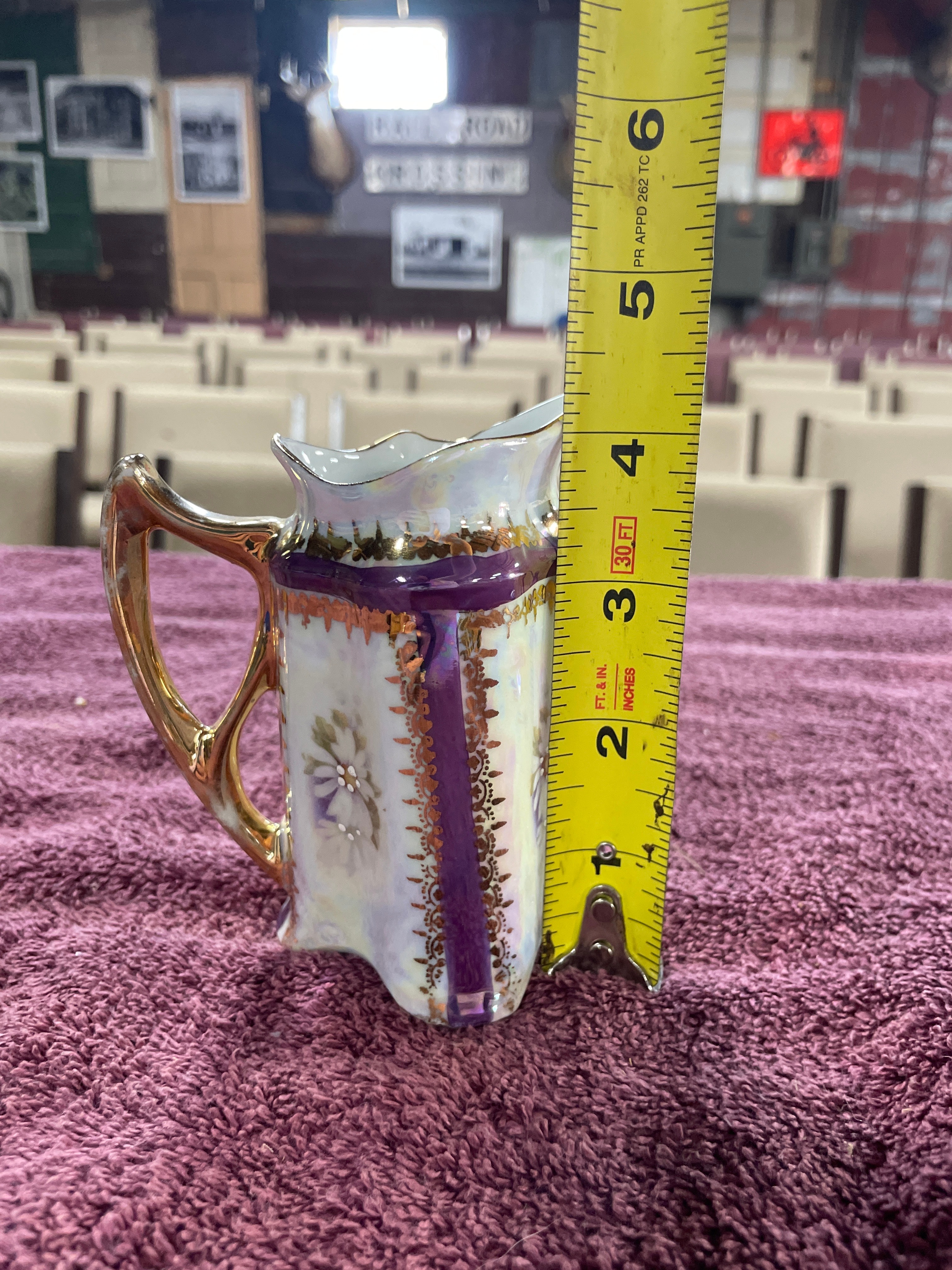 A vintage Bavaria porcelain creamer, featuring an iridescent white luster glaze, purple bands, and extensive gilt floral and foliate decoration on its shaped body. The creamer is fitted with an ornate gilded handle and marked "MADE IN GERMANY" with a red circular stamp on its base. Accompanying the creamer is a miniature round decorative plate, adorned with a blue and white ‘Willow Pattern’ design. The plate’s underside is marked "MADE IN CHINA" in blue text with a "U" inside a triangle.