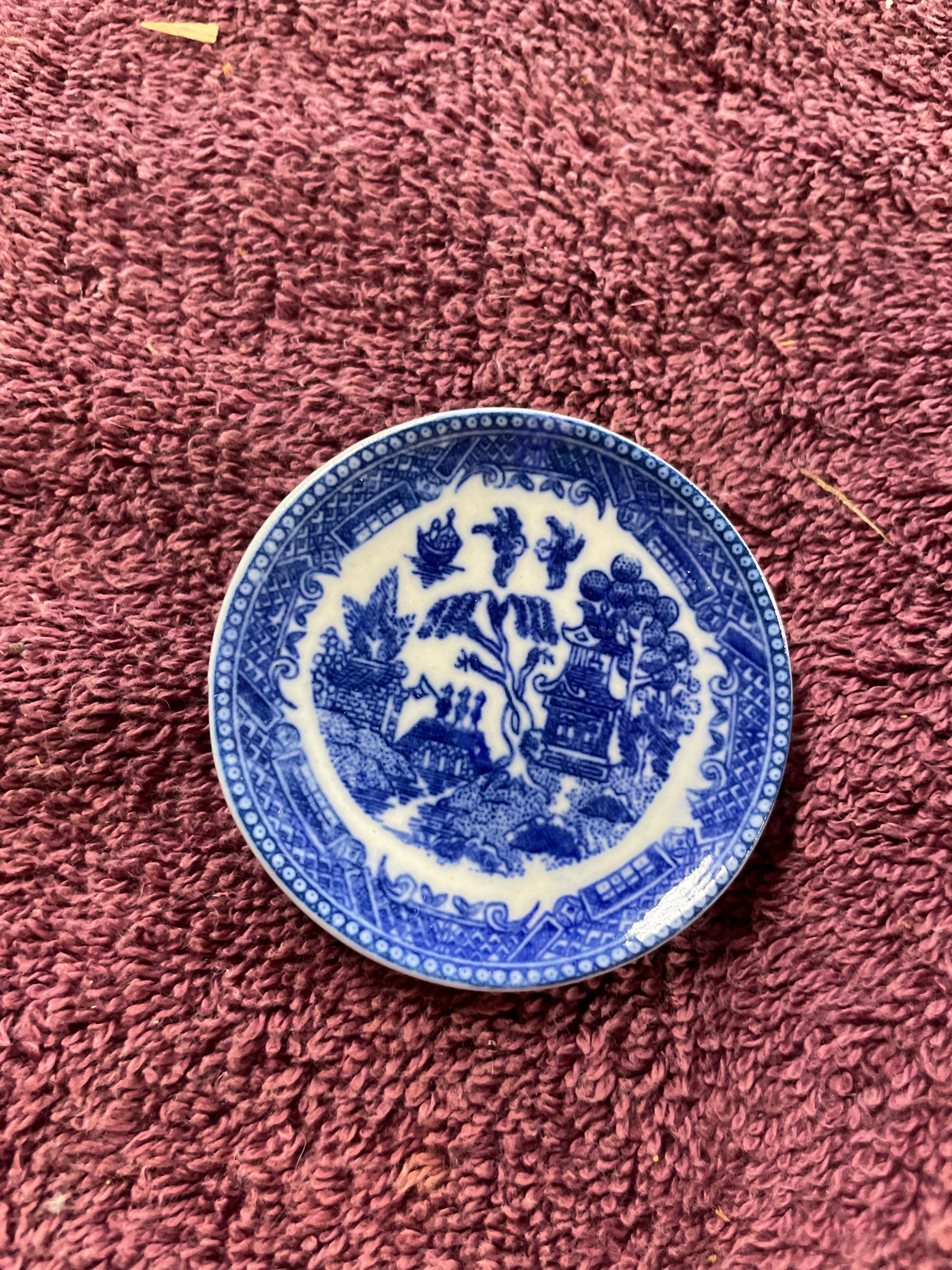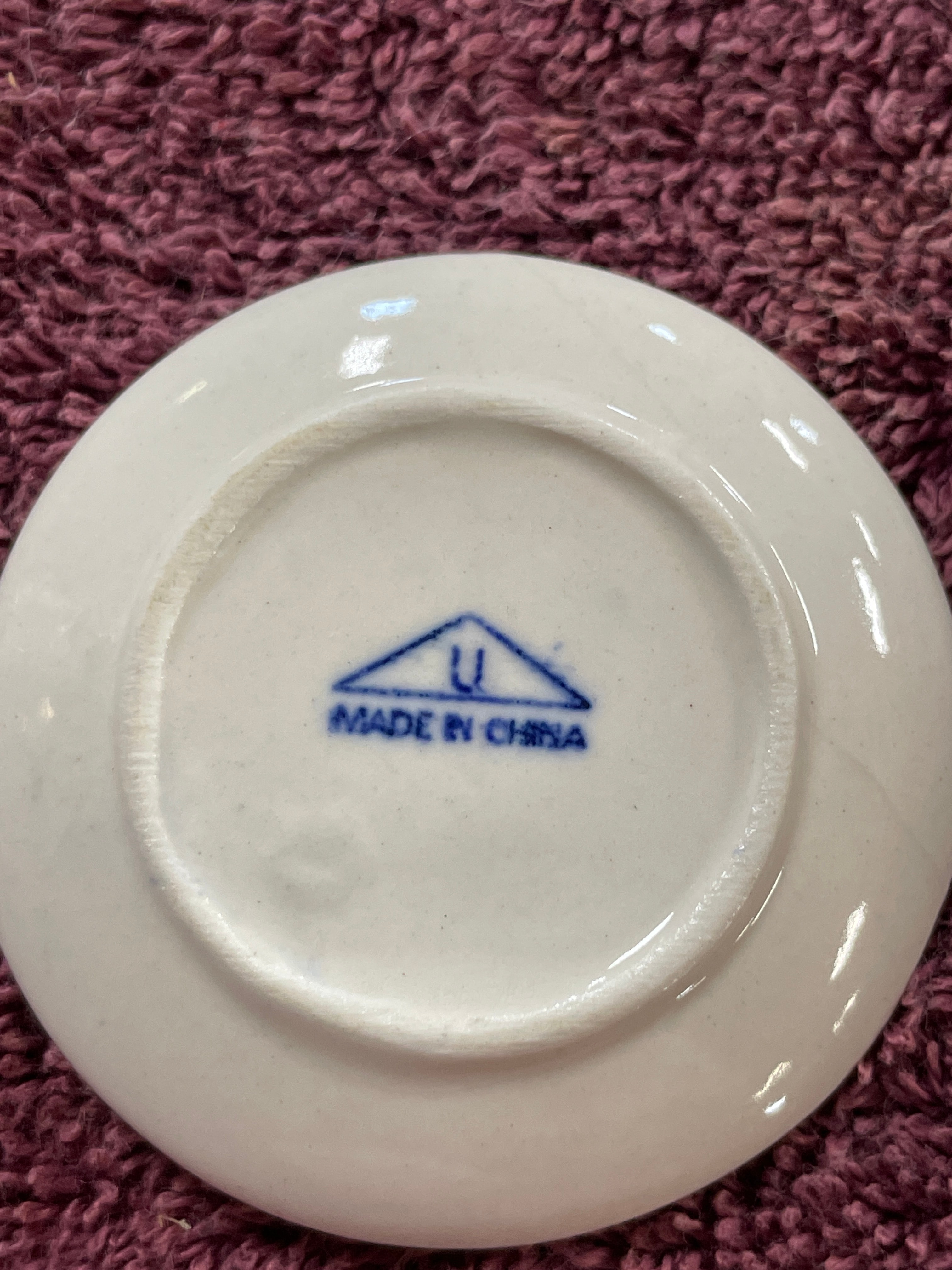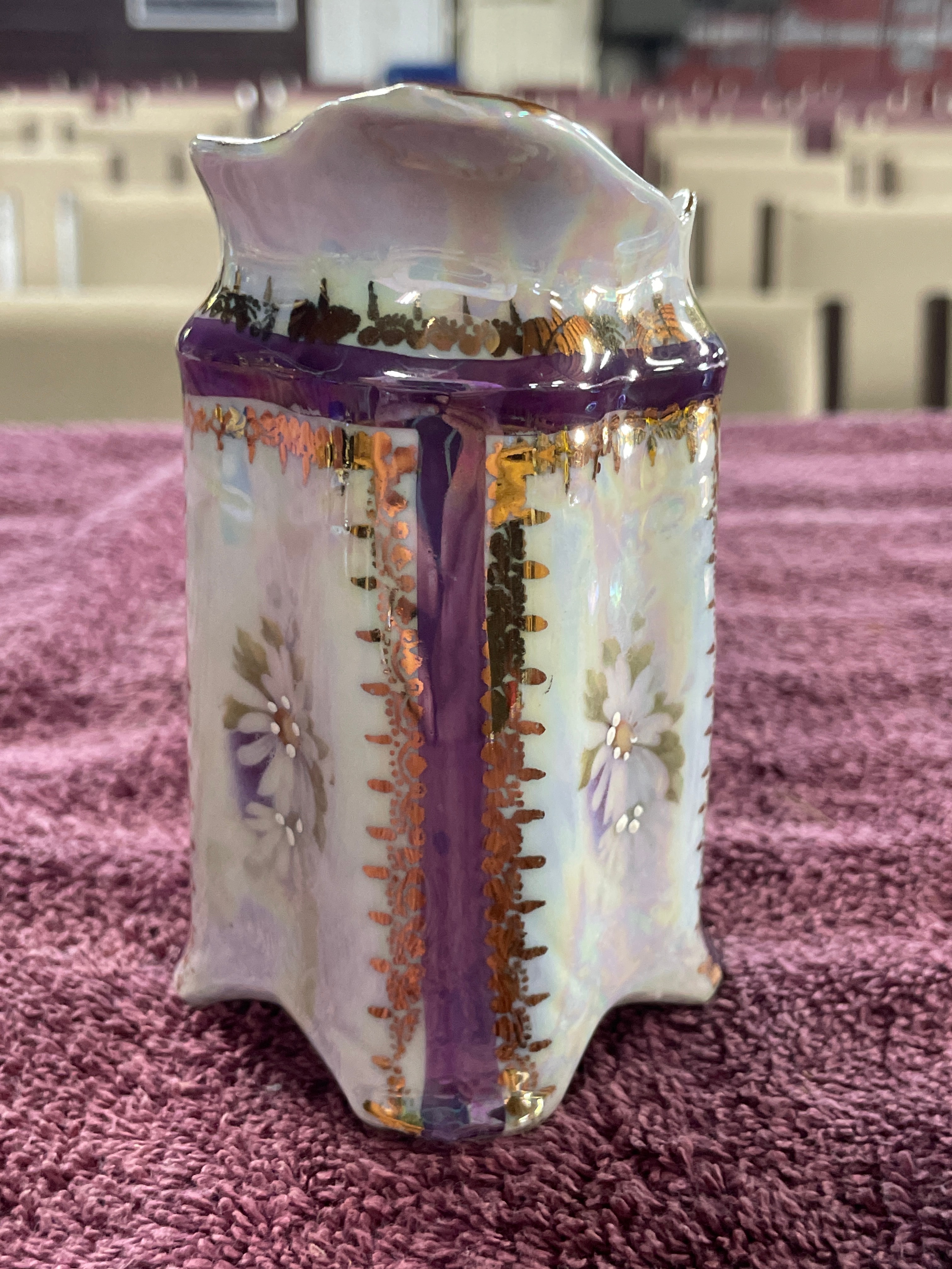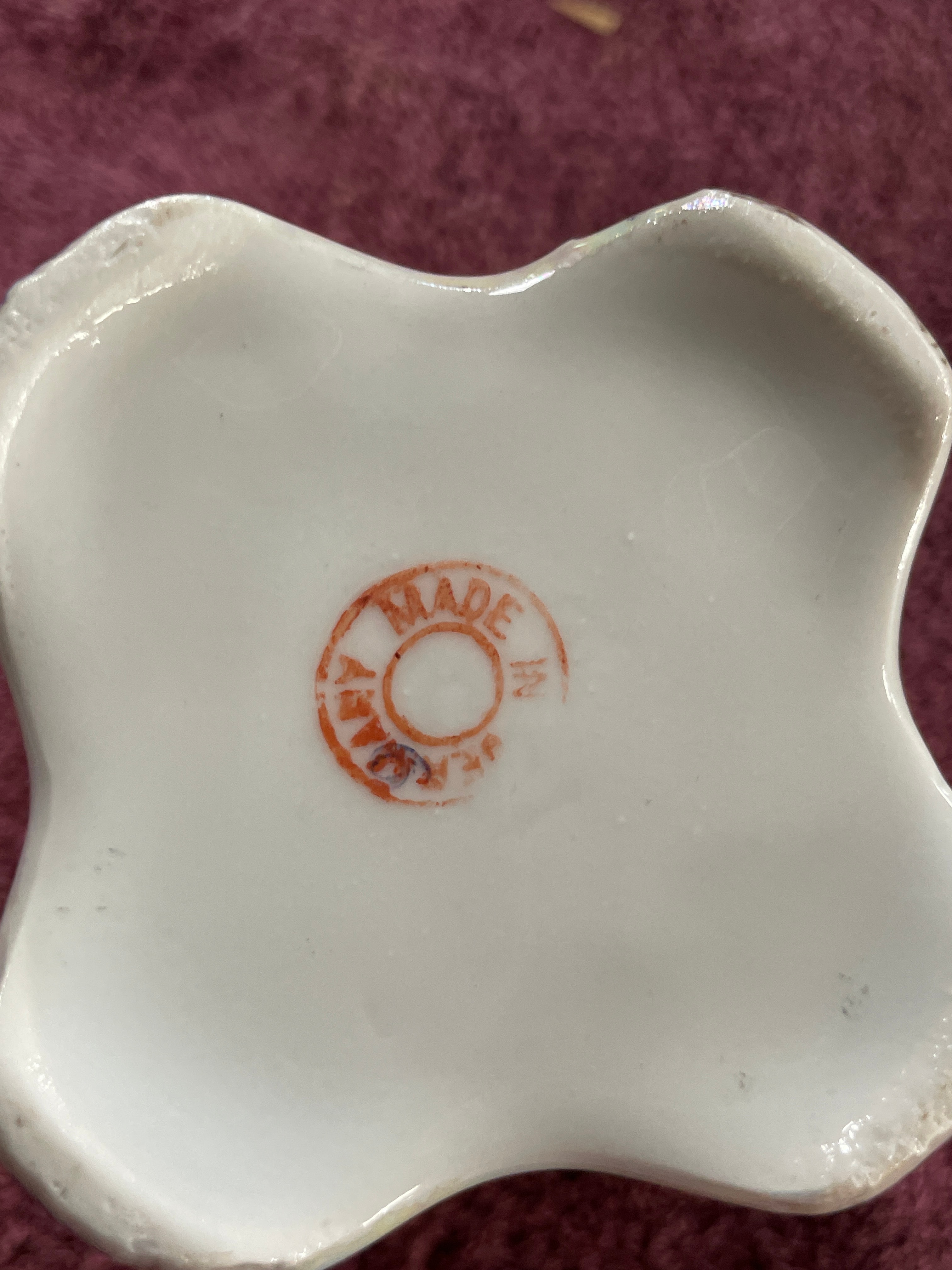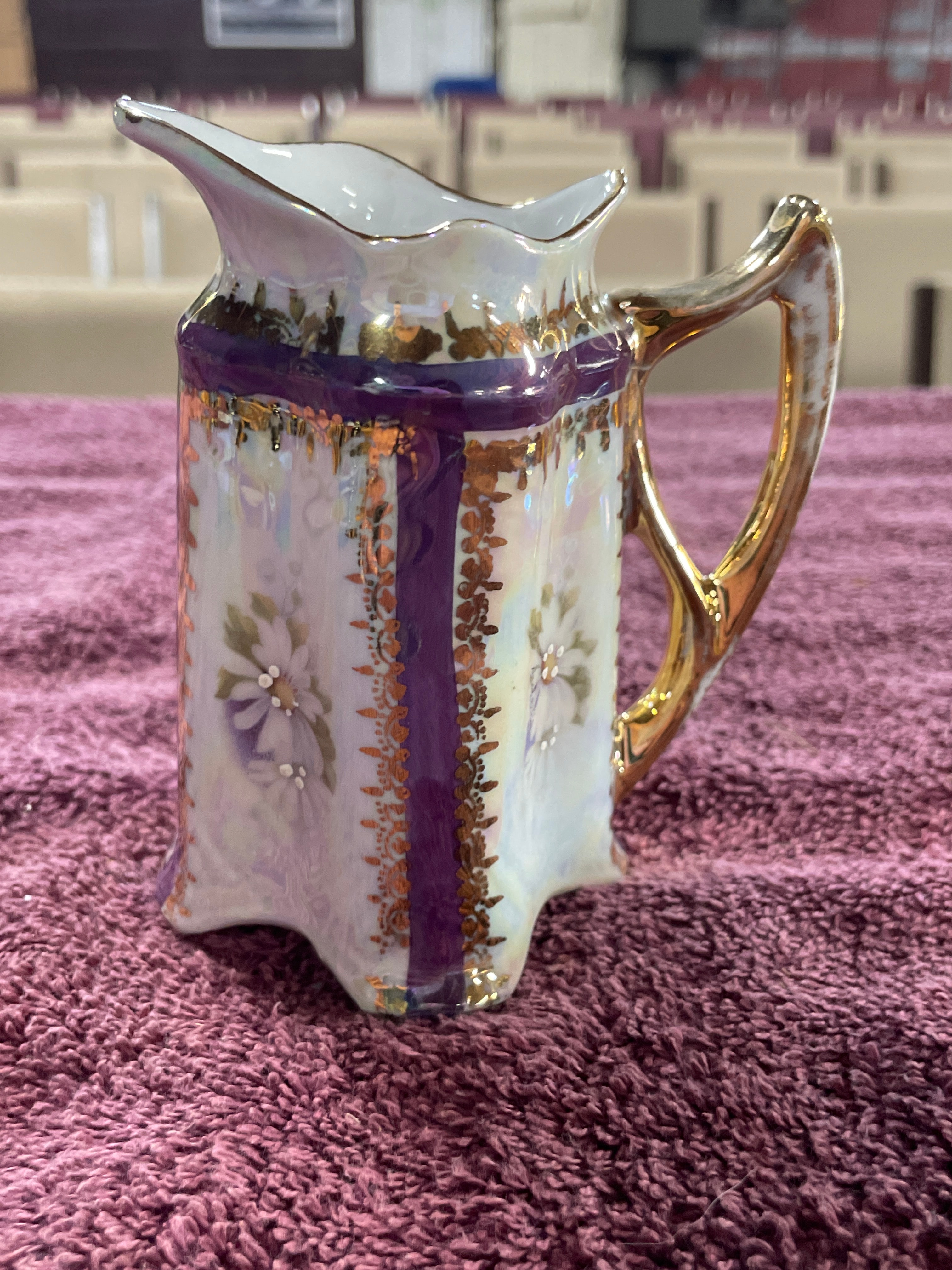 A vintage Bavaria porcelain creamer, featuring an iridescent white luster glaze, purple bands, and extensive gilt floral and foliate decoration on its shaped body. The creamer is fitted with an ornate gilded handle and marked "MADE IN GERMANY" with a red circular stamp on its base. Accompanying the creamer is a miniature round decorative plate, adorned with a blue and white ‘Willow Pattern’ design. The plate’s underside is marked "MADE IN CHINA" in blue text with a "U" inside a triangle.