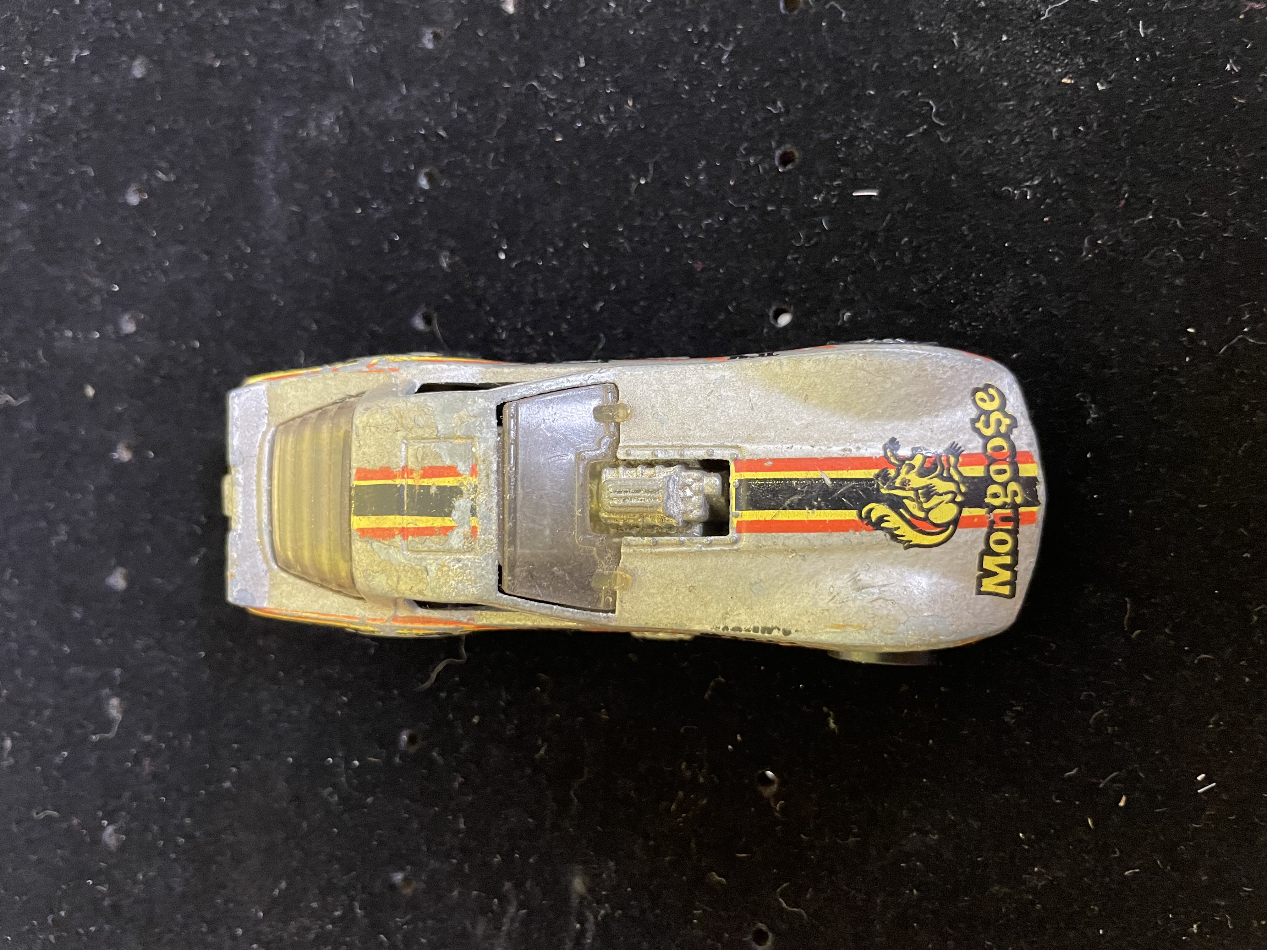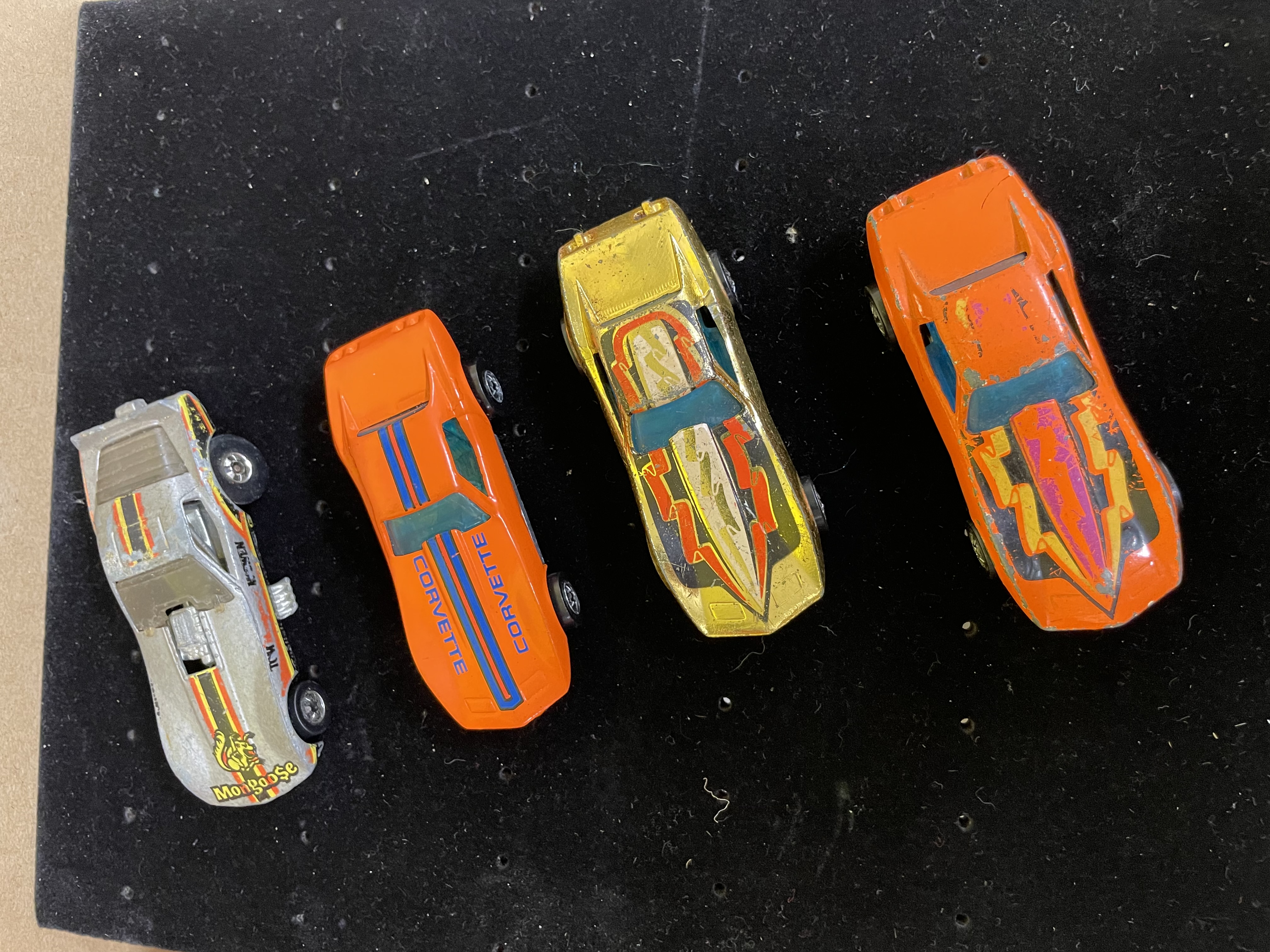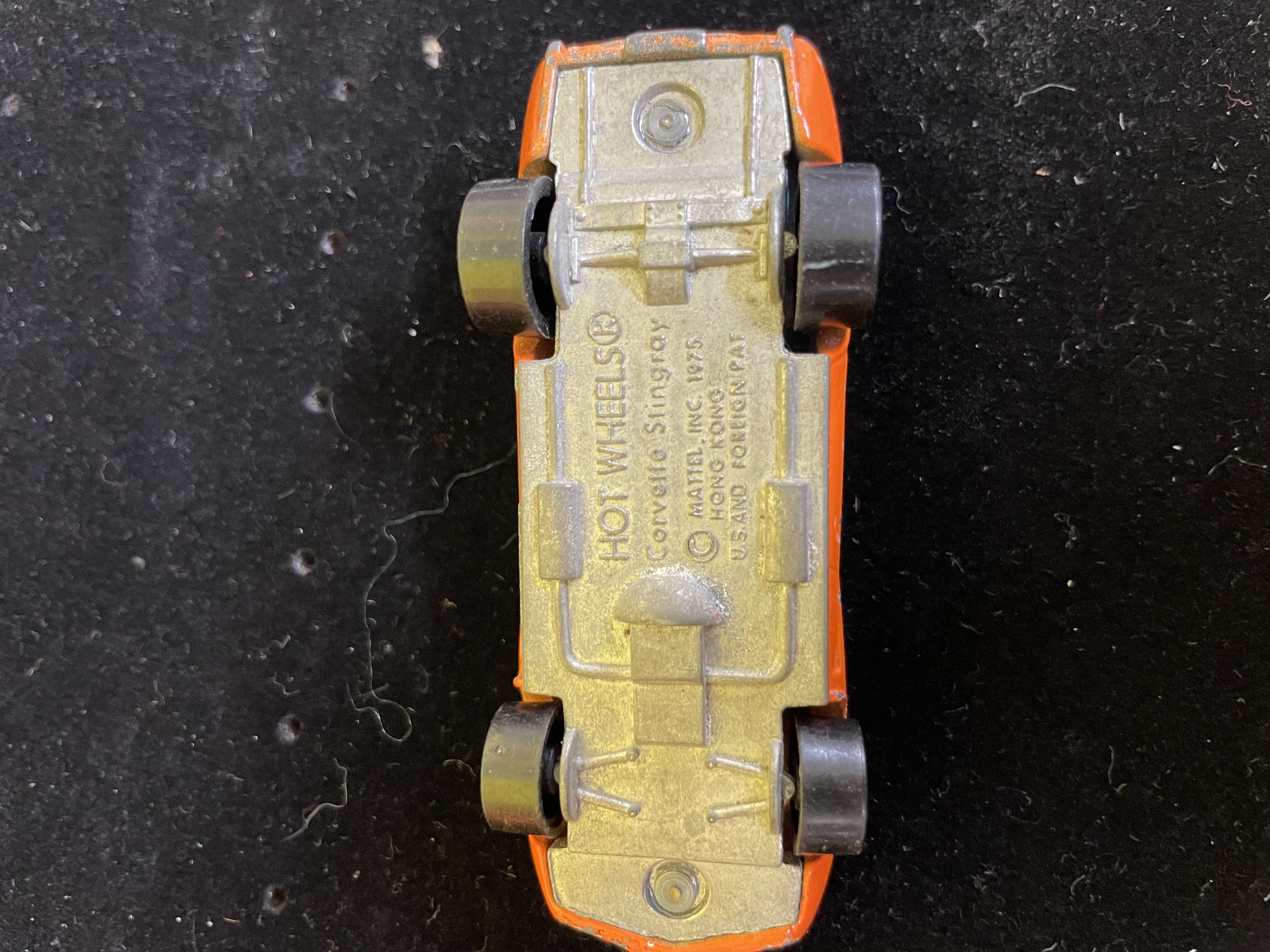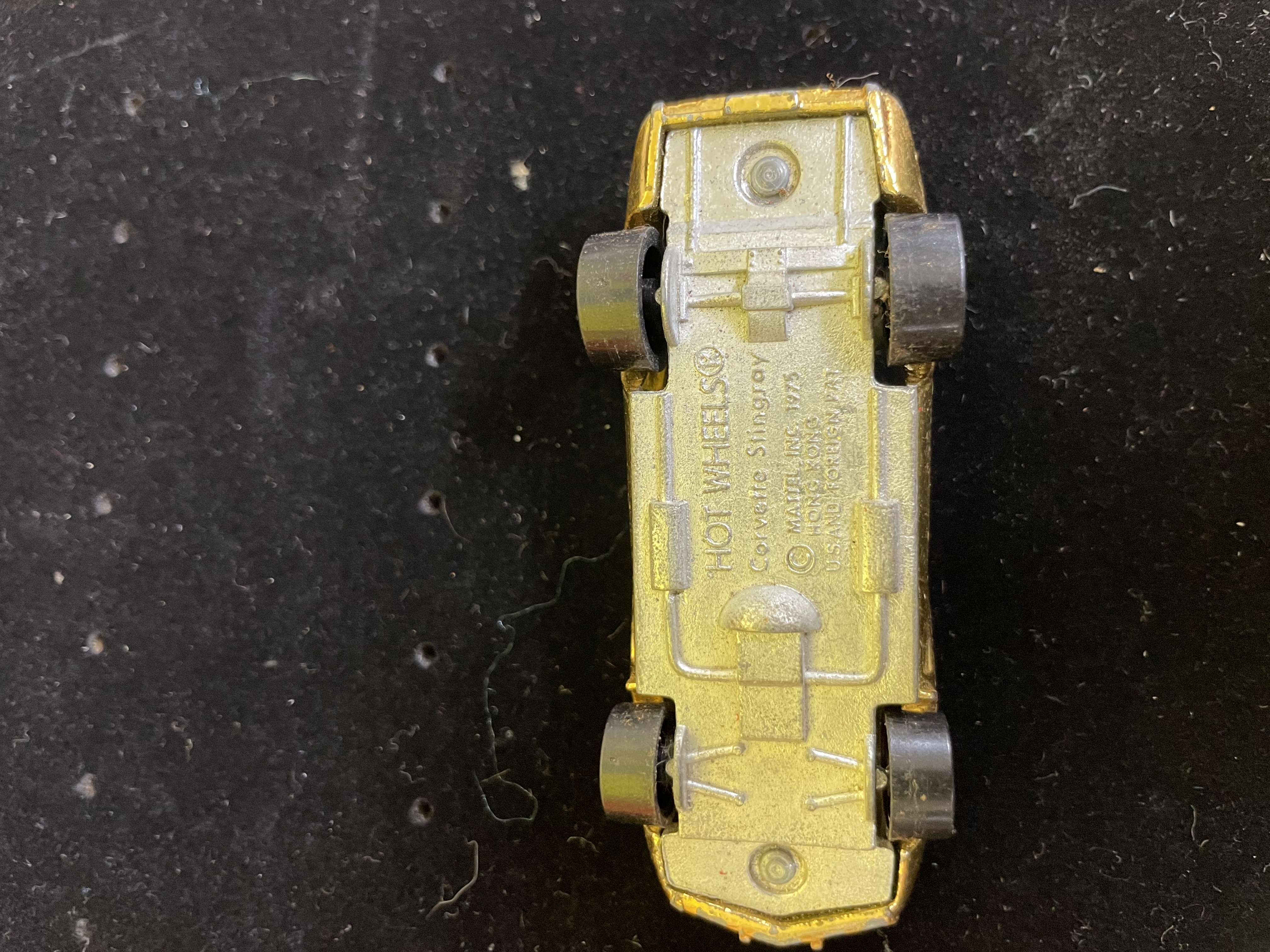 A group of three vintage Hot Wheels die-cast toy cars, characteristic of 1970s manufacturing. Each vehicle is constructed with a metal body, an unpainted metal chassis, and black plastic wheels. The first is a gold-painted “Corvette Stingray” model from 1975, marked “HOT WHEELS®” and “© MATTEL, INC. 1975 HONG KONG U.S. AND FOREIGN PAT, ” featuring red, black, and white racing decals. The second is a silver-grey “Mongoose” dragster from 1971, marked “HOT WHEELS®” and “© MATTEL, INC. 1971 HONG KONG, ” displaying prominent red, yellow, and black racing stripes with a “Mongoose” logo. The third is an orange-painted “Corvette” from 1977, marked “HOT WHEELS®” and “© MATTEL INC. 1977 MALAYSIA, ” featuring blue racing stripes and “CORVETTE” text.