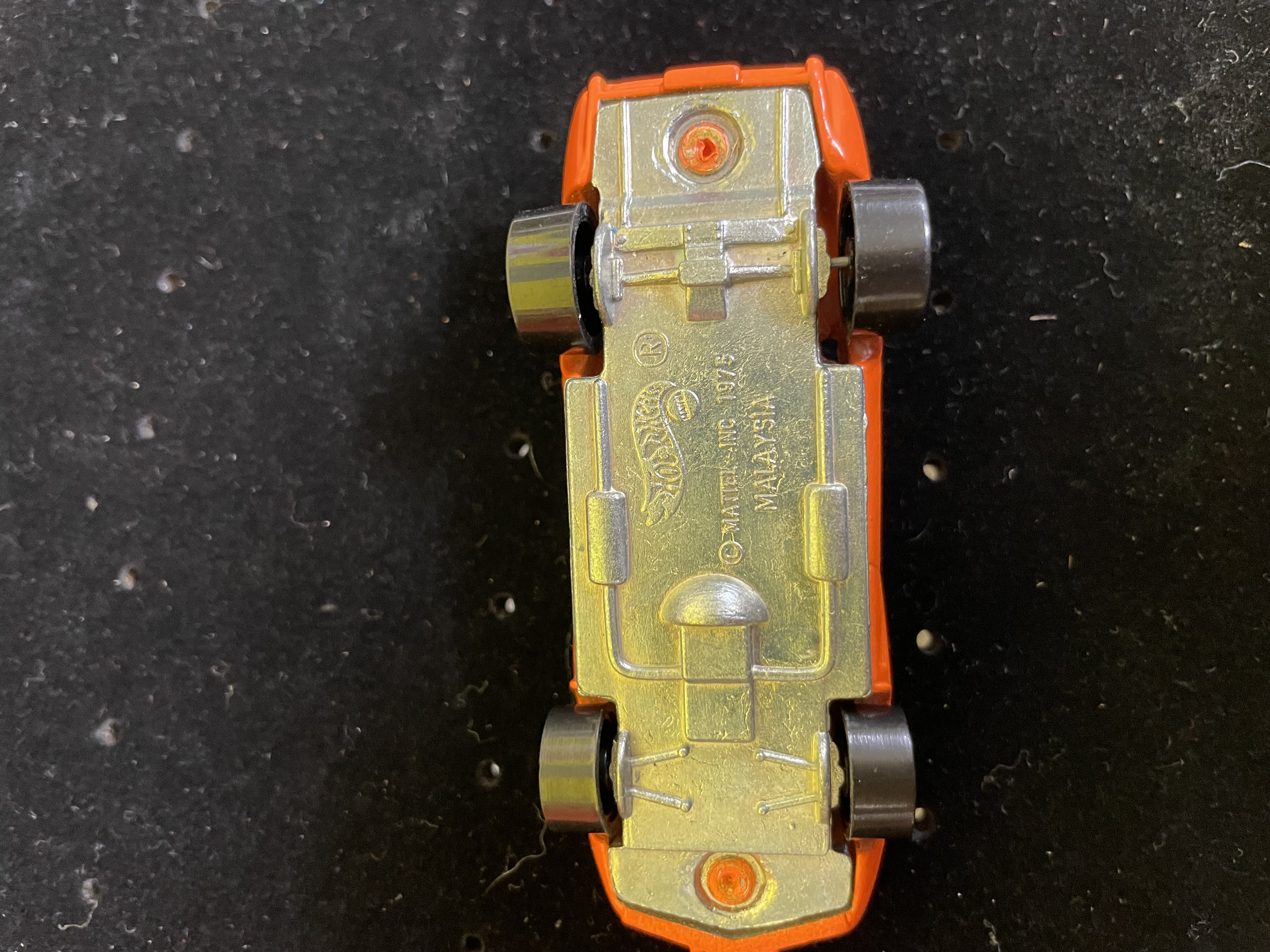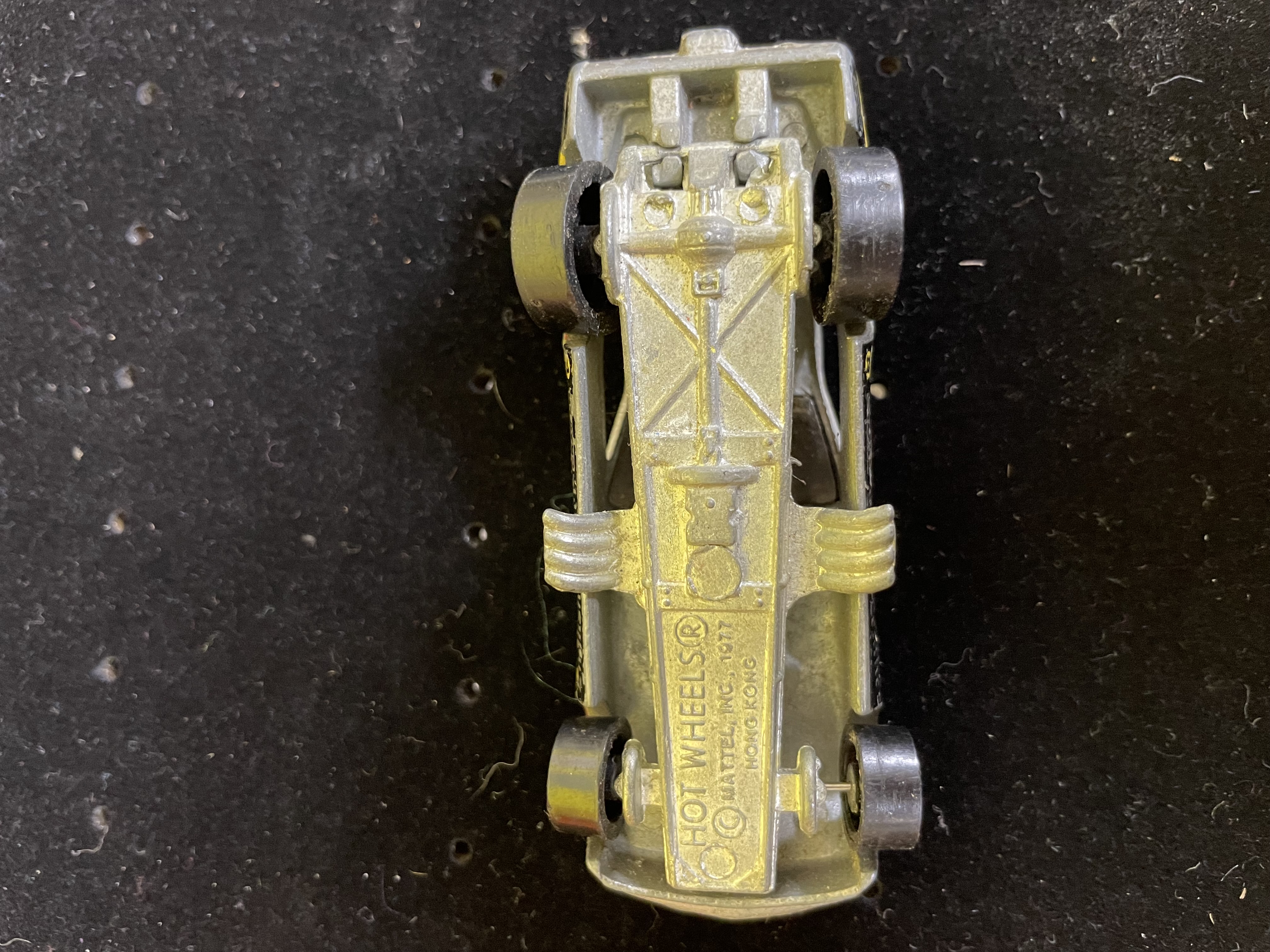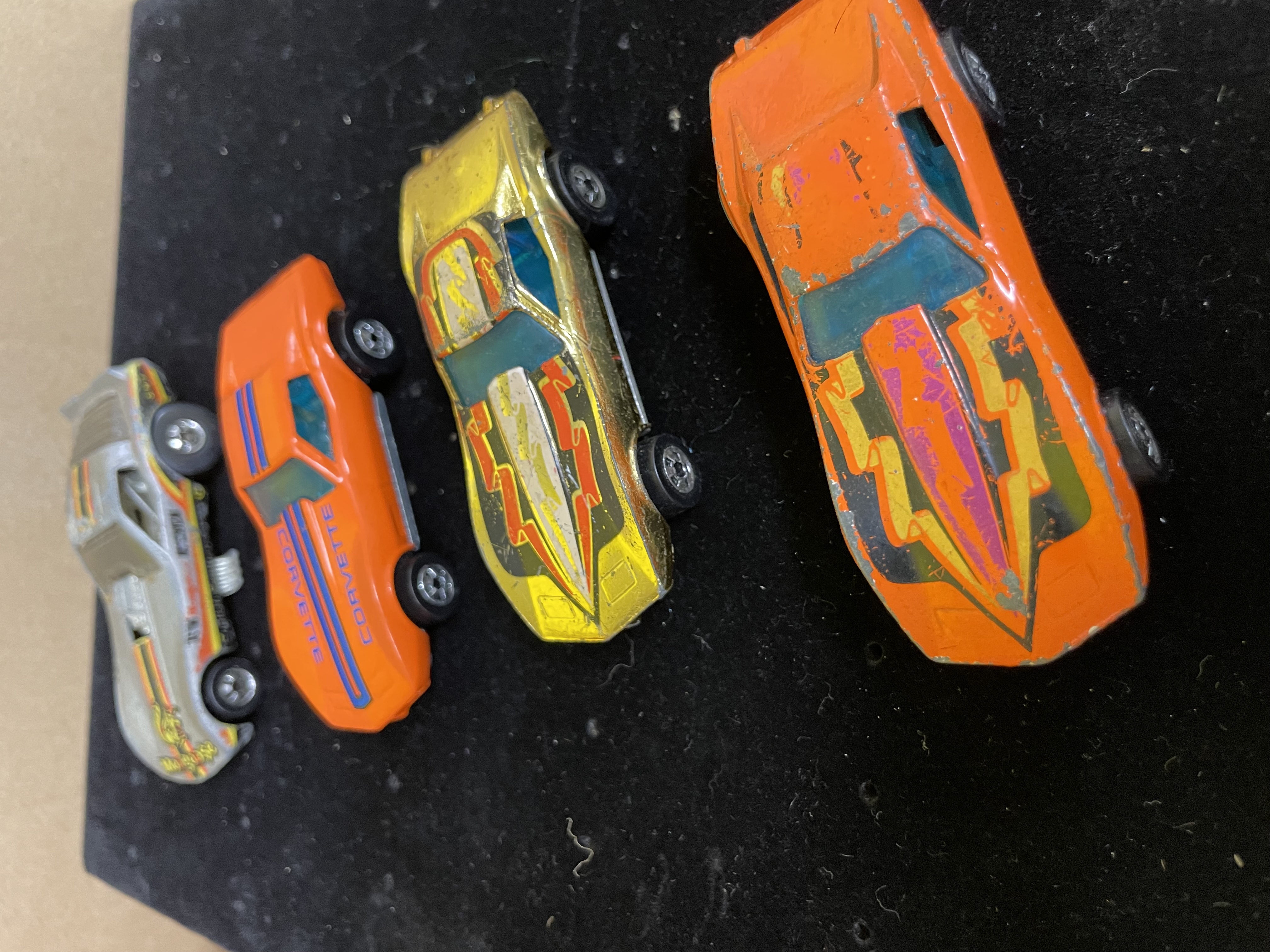 A group of three vintage Hot Wheels die-cast toy cars, characteristic of 1970s manufacturing. Each vehicle is constructed with a metal body, an unpainted metal chassis, and black plastic wheels. The first is a gold-painted “Corvette Stingray” model from 1975, marked “HOT WHEELS®” and “© MATTEL, INC. 1975 HONG KONG U.S. AND FOREIGN PAT, ” featuring red, black, and white racing decals. The second is a silver-grey “Mongoose” dragster from 1971, marked “HOT WHEELS®” and “© MATTEL, INC. 1971 HONG KONG, ” displaying prominent red, yellow, and black racing stripes with a “Mongoose” logo. The third is an orange-painted “Corvette” from 1977, marked “HOT WHEELS®” and “© MATTEL INC. 1977 MALAYSIA, ” featuring blue racing stripes and “CORVETTE” text.