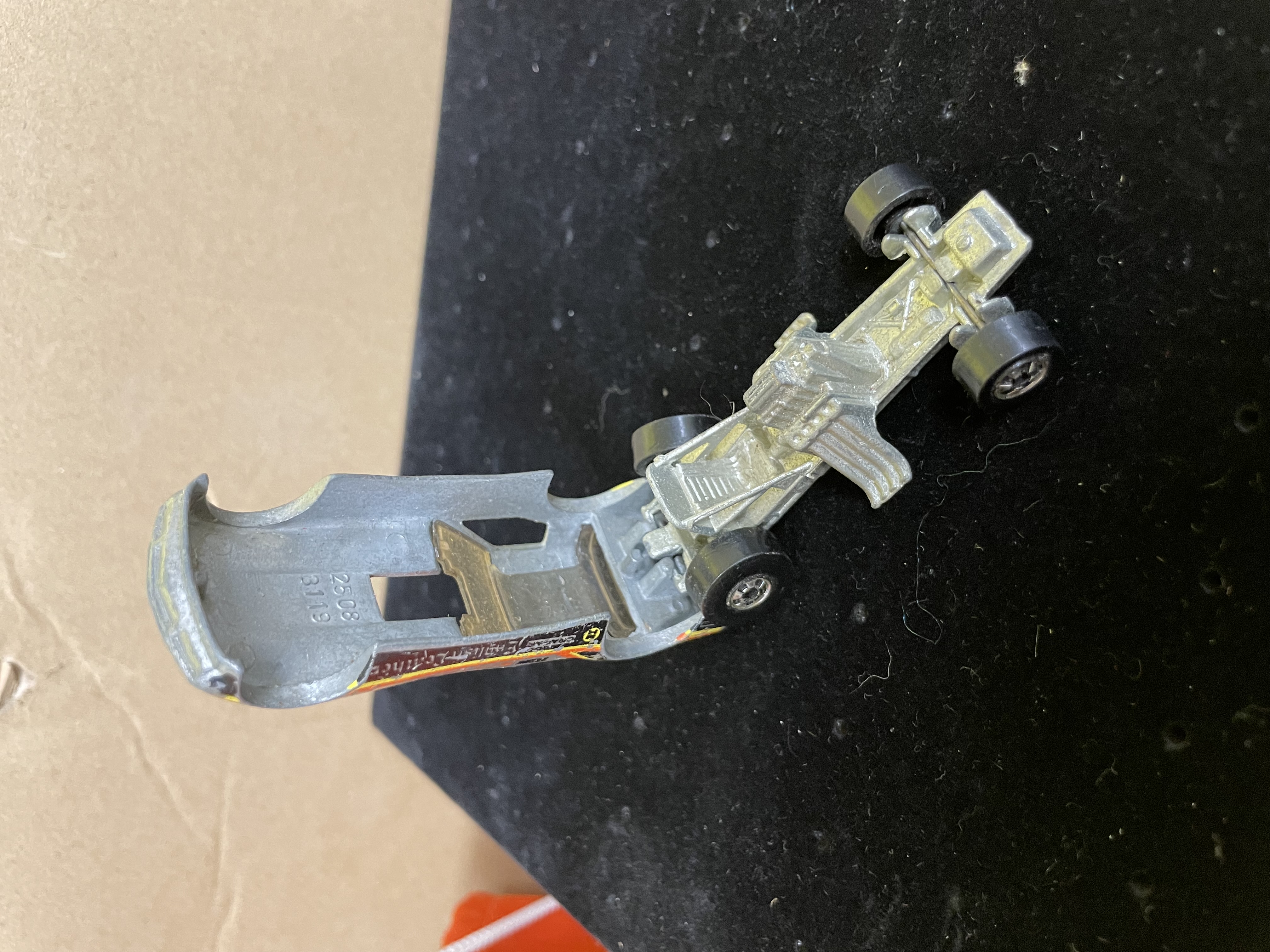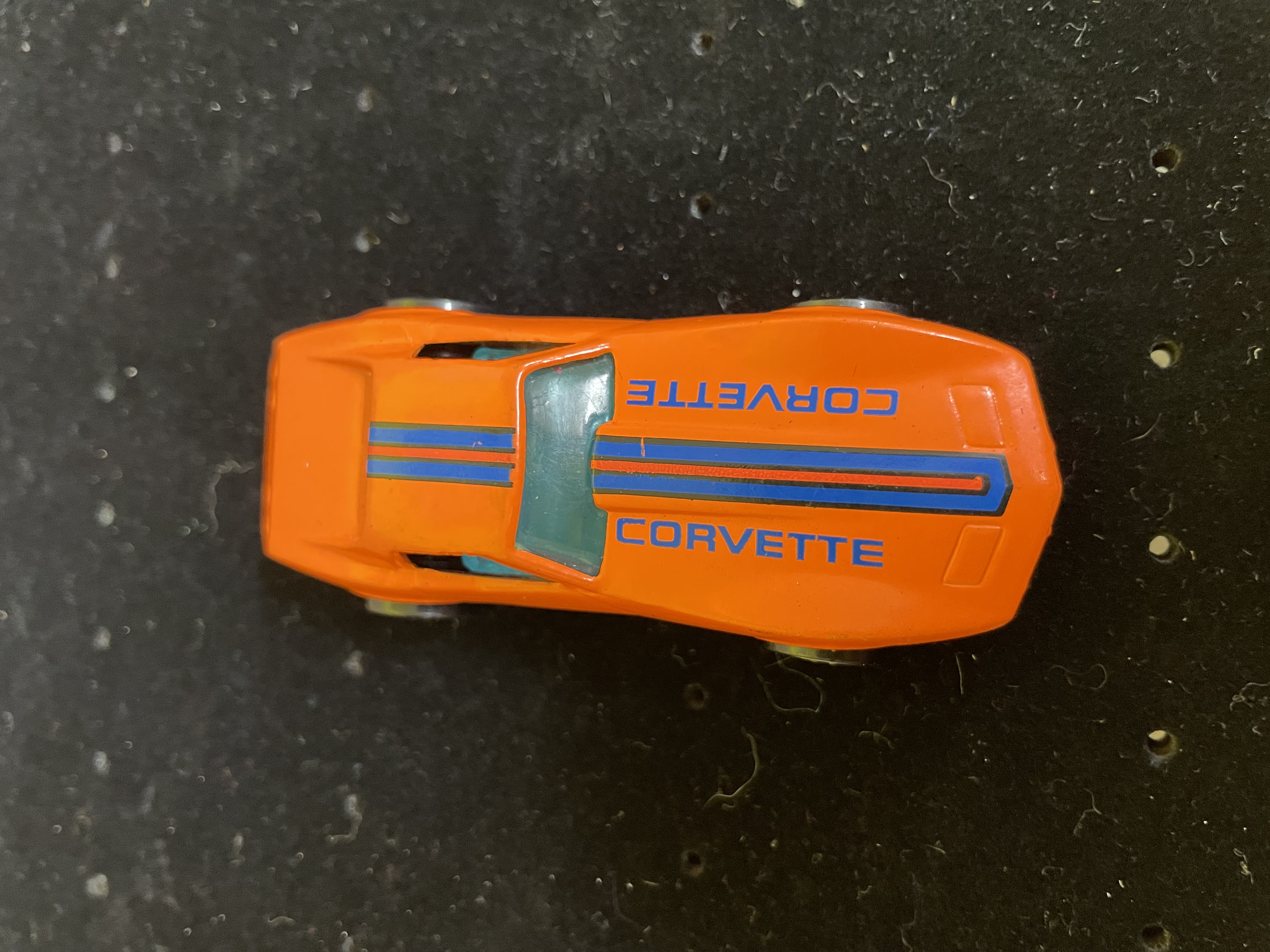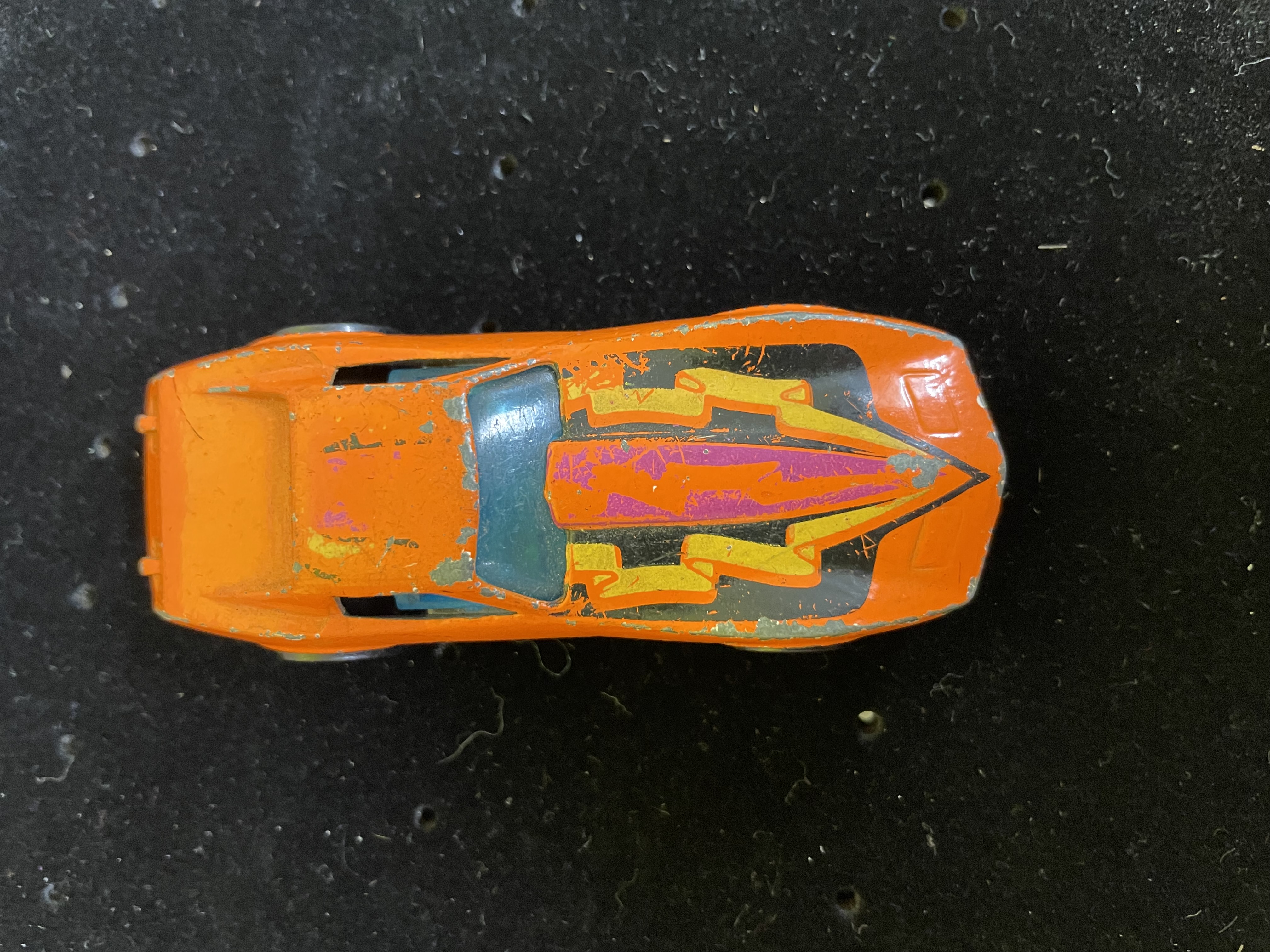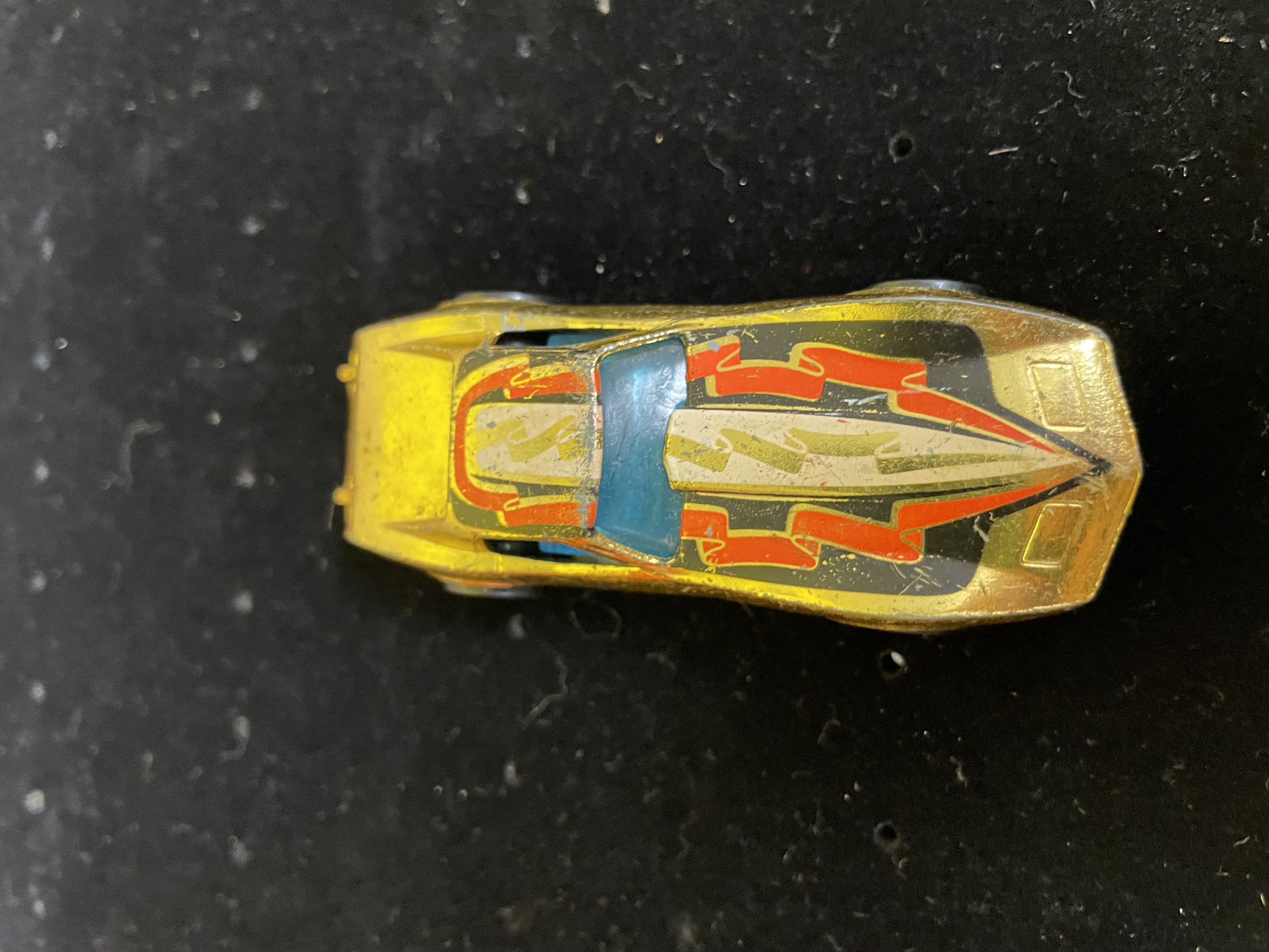 A group of three vintage Hot Wheels die-cast toy cars, characteristic of 1970s manufacturing. Each vehicle is constructed with a metal body, an unpainted metal chassis, and black plastic wheels. The first is a gold-painted “Corvette Stingray” model from 1975, marked “HOT WHEELS®” and “© MATTEL, INC. 1975 HONG KONG U.S. AND FOREIGN PAT, ” featuring red, black, and white racing decals. The second is a silver-grey “Mongoose” dragster from 1971, marked “HOT WHEELS®” and “© MATTEL, INC. 1971 HONG KONG, ” displaying prominent red, yellow, and black racing stripes with a “Mongoose” logo. The third is an orange-painted “Corvette” from 1977, marked “HOT WHEELS®” and “© MATTEL INC. 1977 MALAYSIA, ” featuring blue racing stripes and “CORVETTE” text.