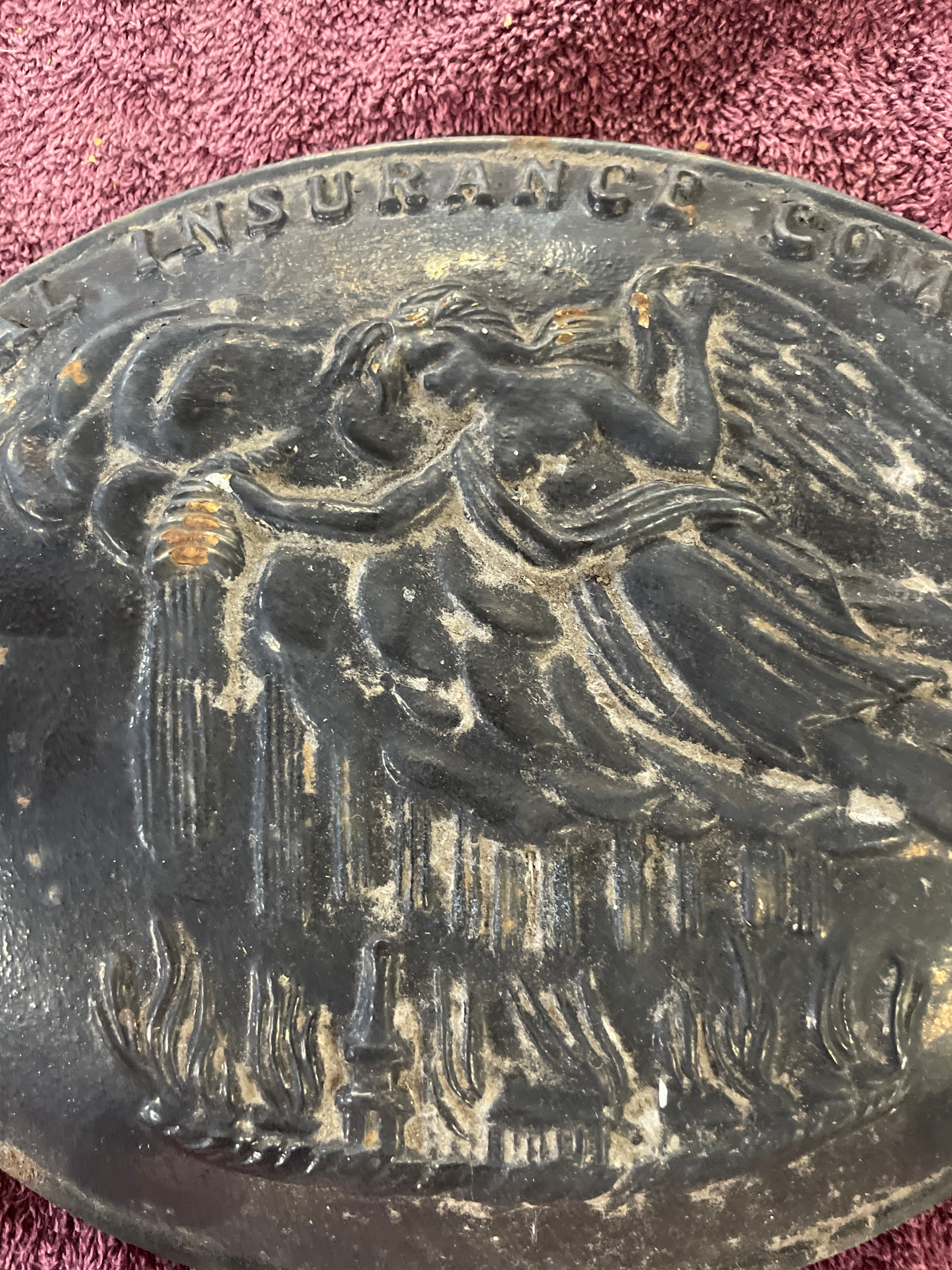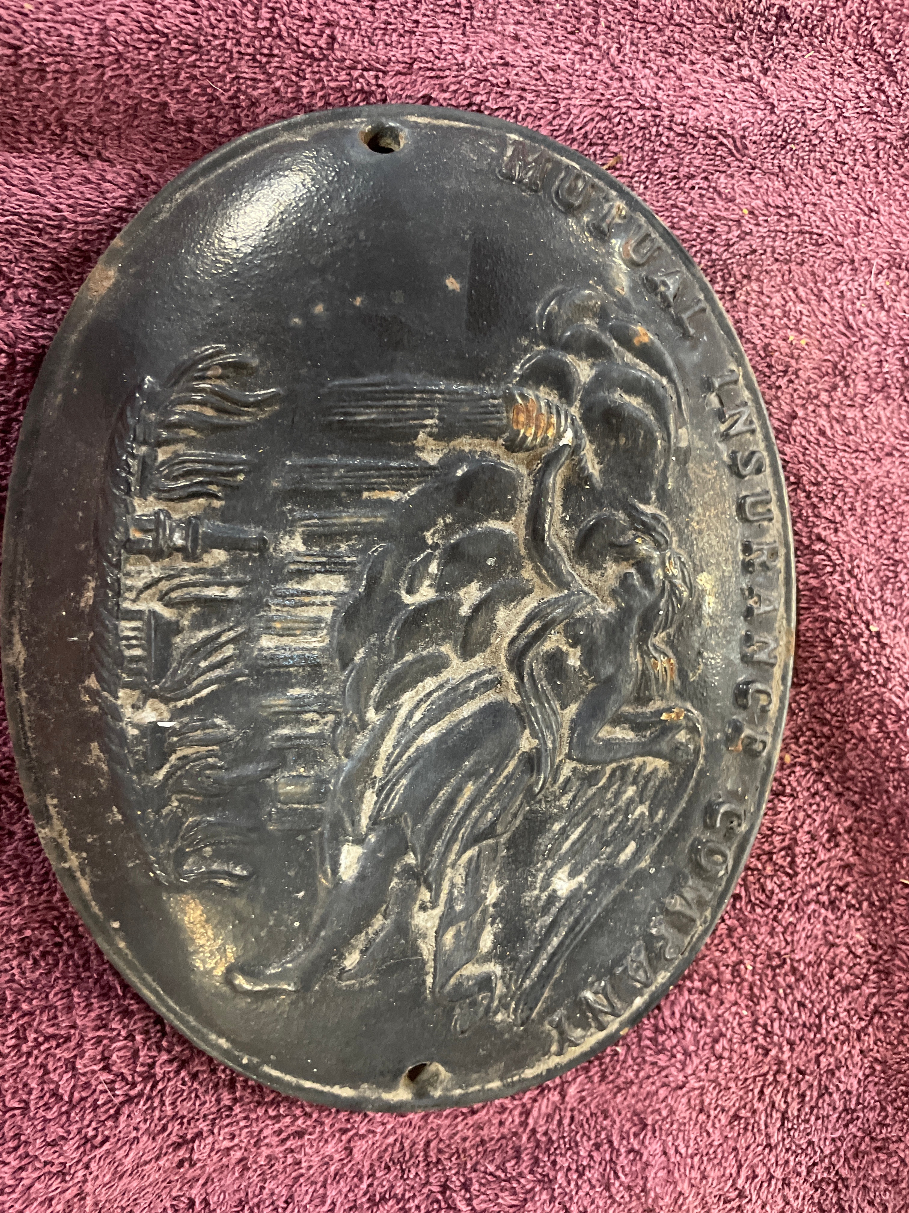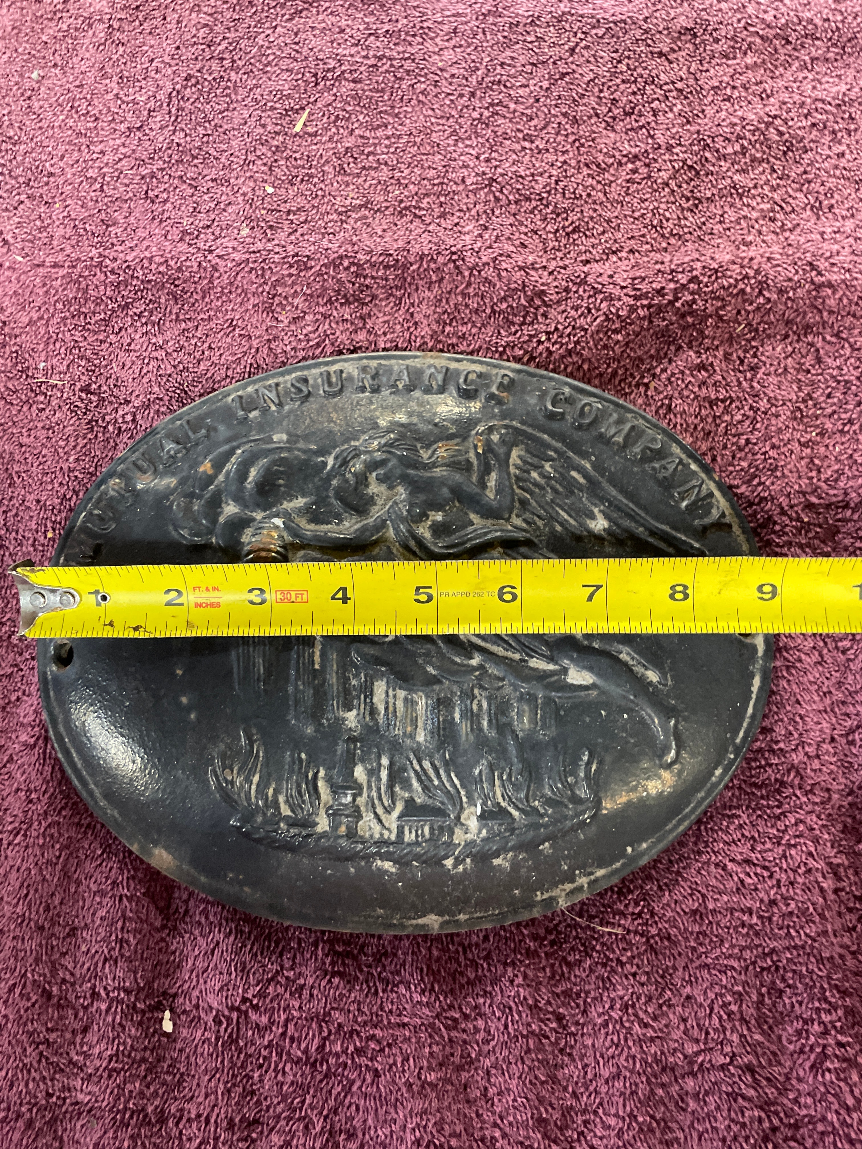A reproduction of a historic fire mark or insurance emblem, this oval, dark-finished cast iron plaque features a raised relief design. The obverse depicts a winged allegorical figure holding a torch above a burning structure, encircled by the raised text "MUTUAL INSURANCE COMPANY." The reverse is marked with the recessed text "HISTORIC CHARLESTON REPRODUCTIONS BY JOHN M. WIGHT." It is equipped with two pre-drilled mounting holes.