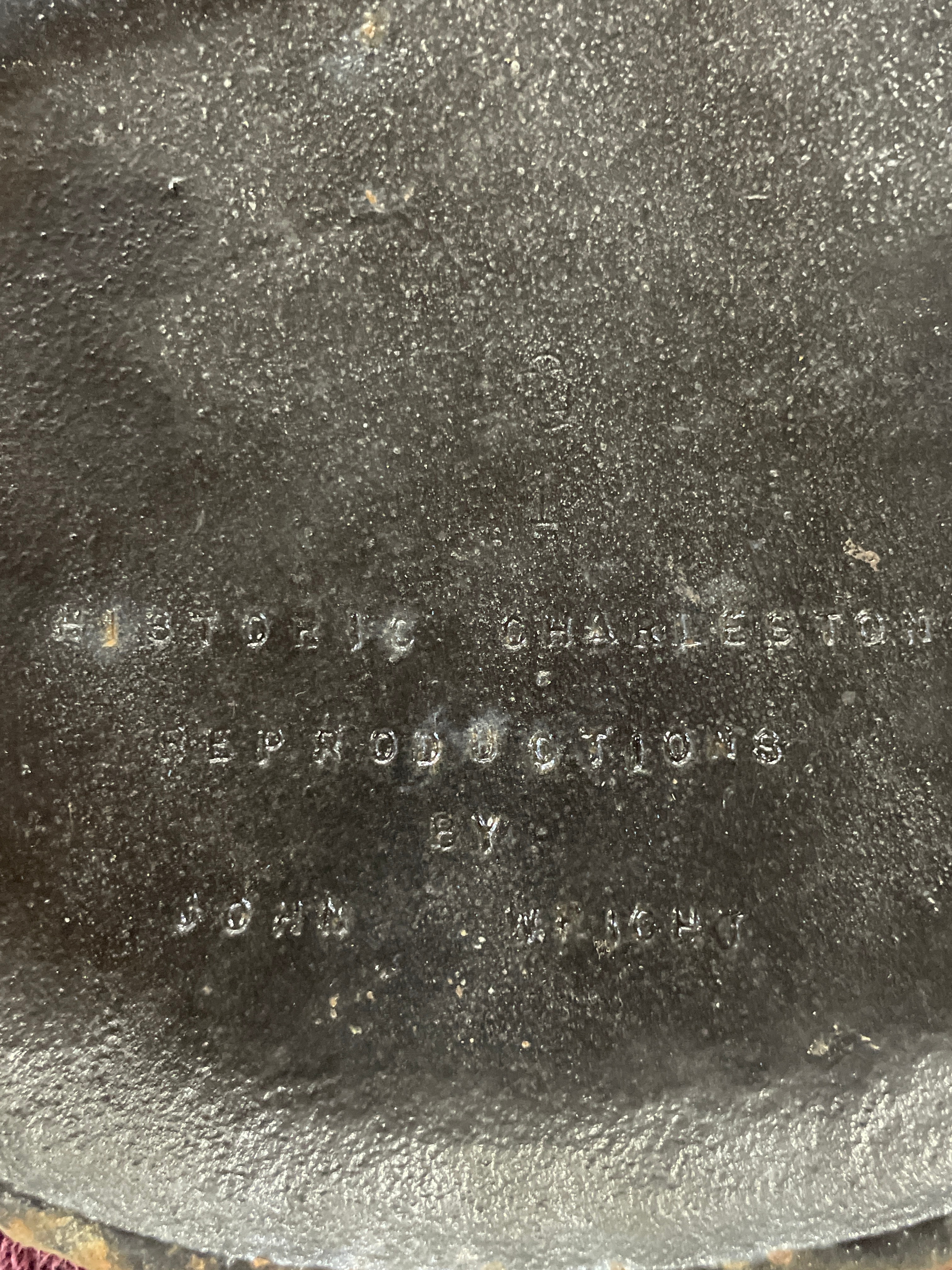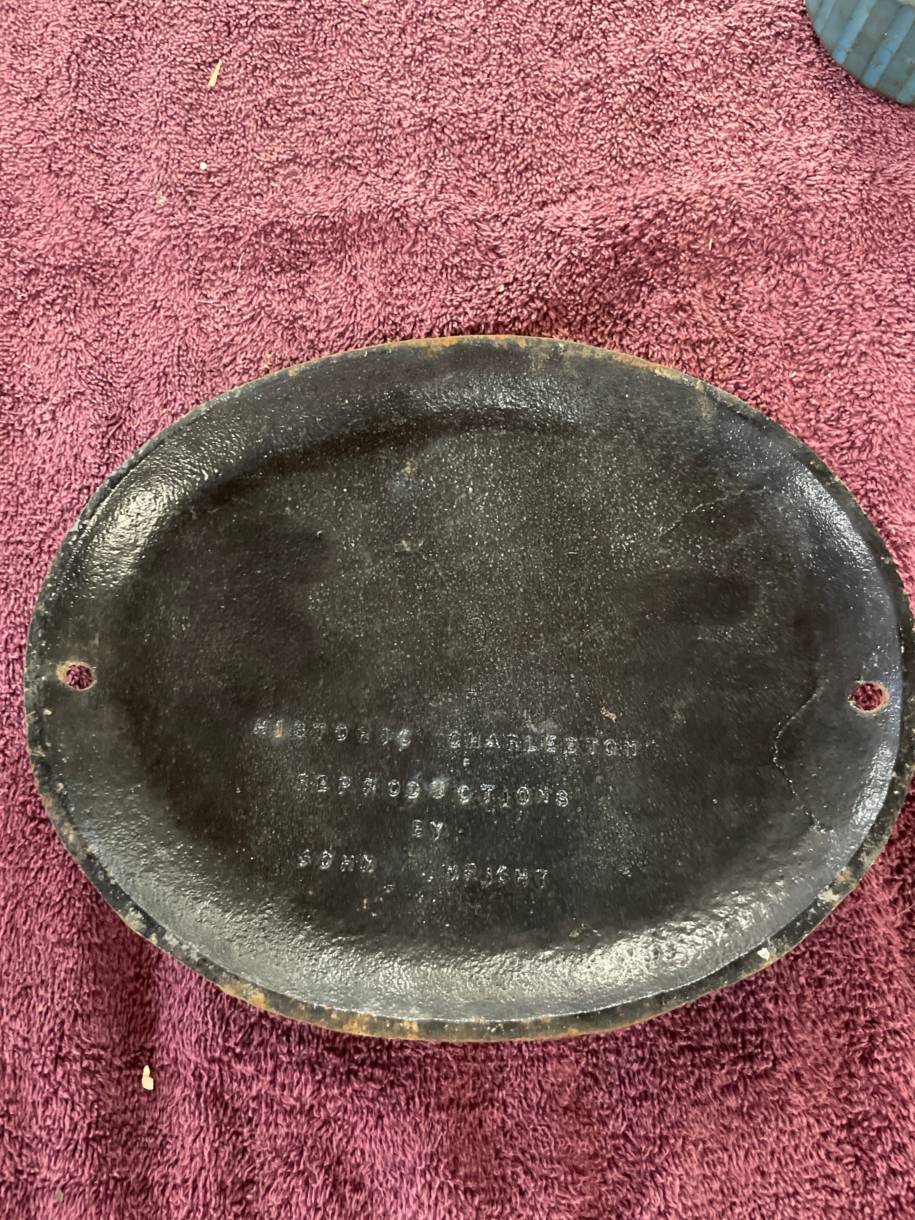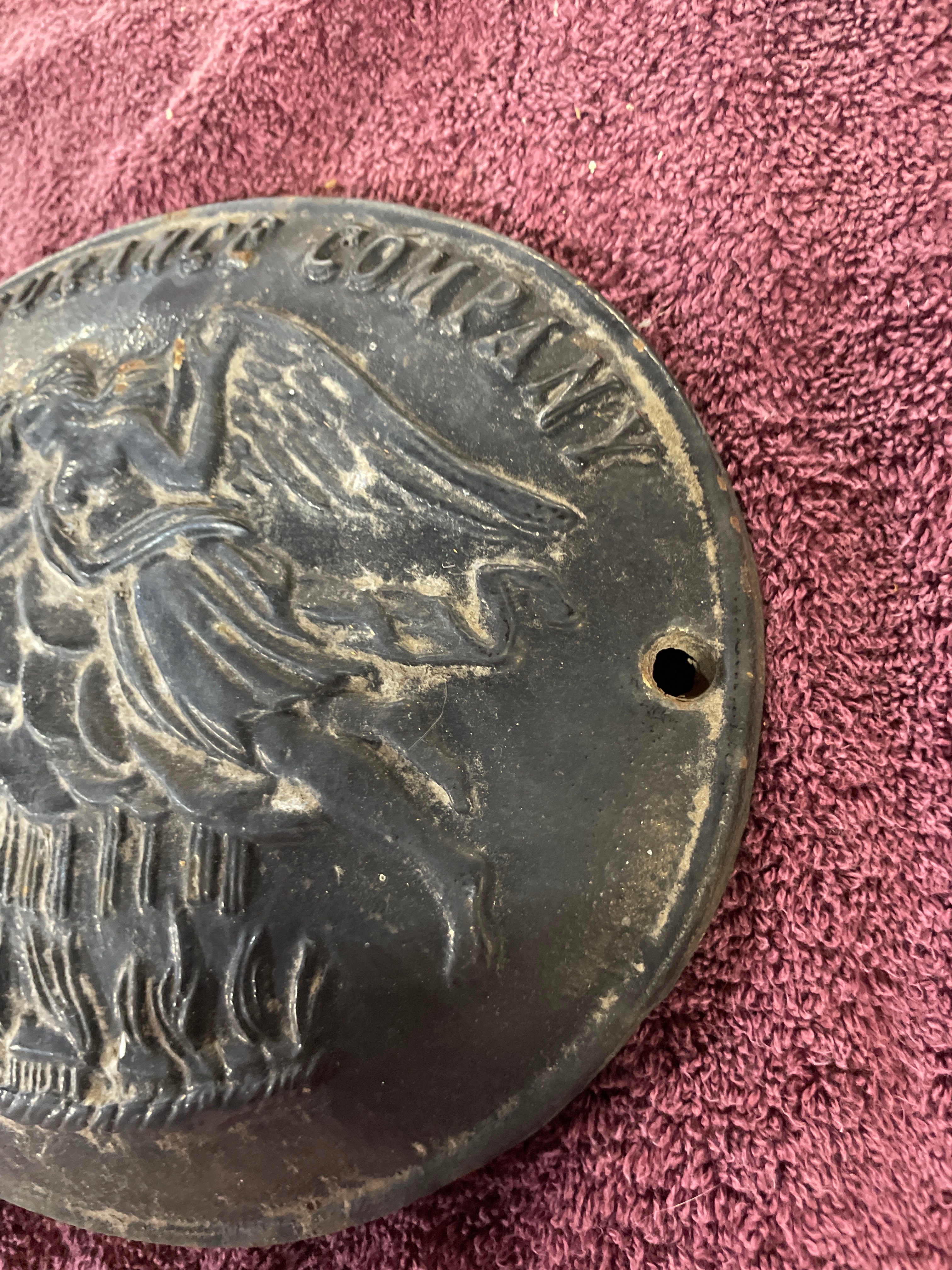 A reproduction of a historic fire mark or insurance emblem, this oval, dark-finished cast iron plaque features a raised relief design. The obverse depicts a winged allegorical figure holding a torch above a burning structure, encircled by the raised text "MUTUAL INSURANCE COMPANY." The reverse is marked with the recessed text "HISTORIC CHARLESTON REPRODUCTIONS BY JOHN M. WIGHT." It is equipped with two pre-drilled mounting holes.