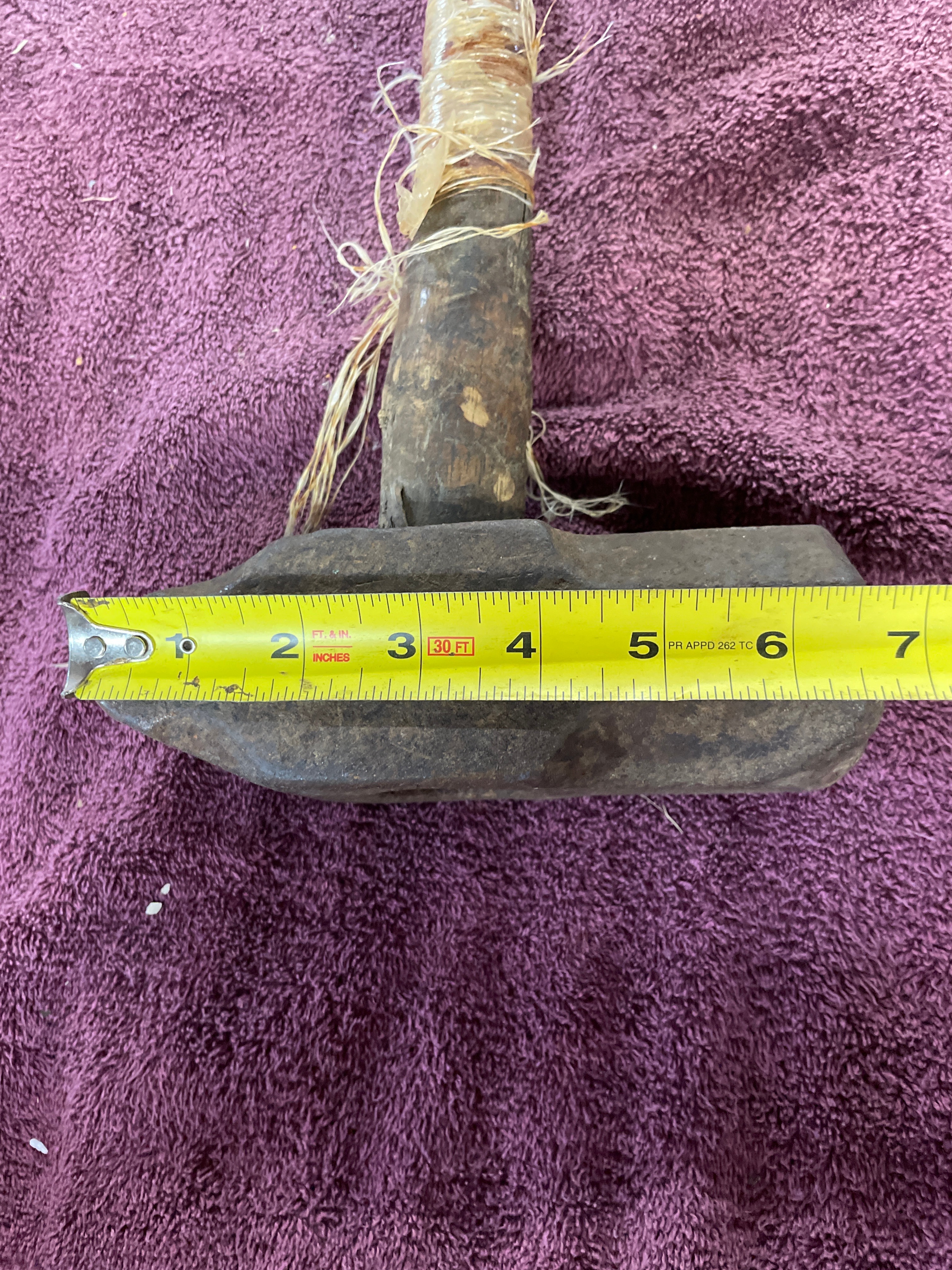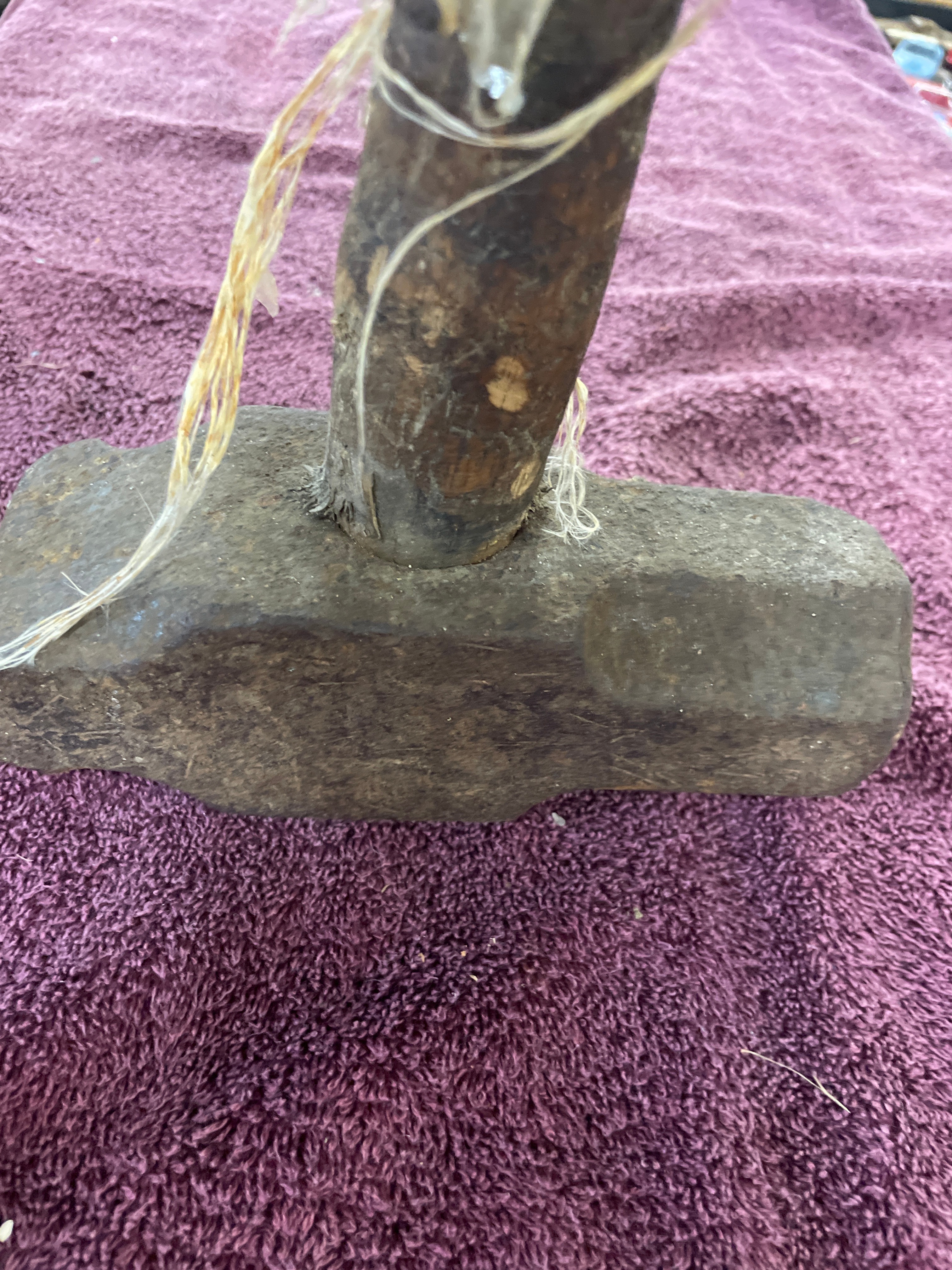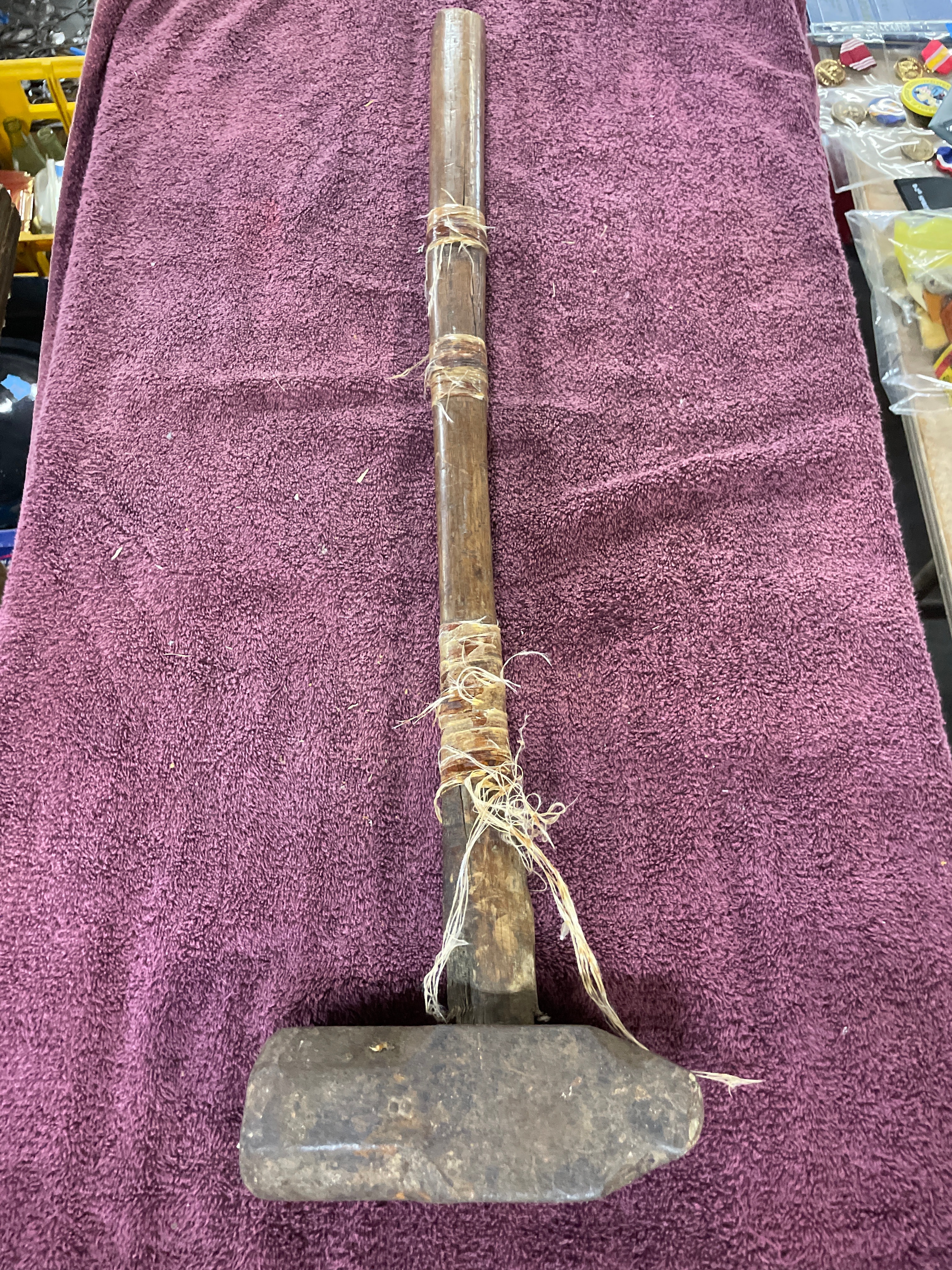 This heavy-duty striking tool features a large, oblong metal head, appearing to be forged or cast iron, exhibiting significant surface rust, pitting, and wear. The dark, patinated wooden handle is roughly shaped, showing natural variations, and is reinforced in several sections by loose, frayed natural fiber binding, which also secures the handle to the head. No discernible manufacturer’s marks or text are visible on the item. The overall construction and binding style bear a resemblance to certain indigenous or early industrial tools.