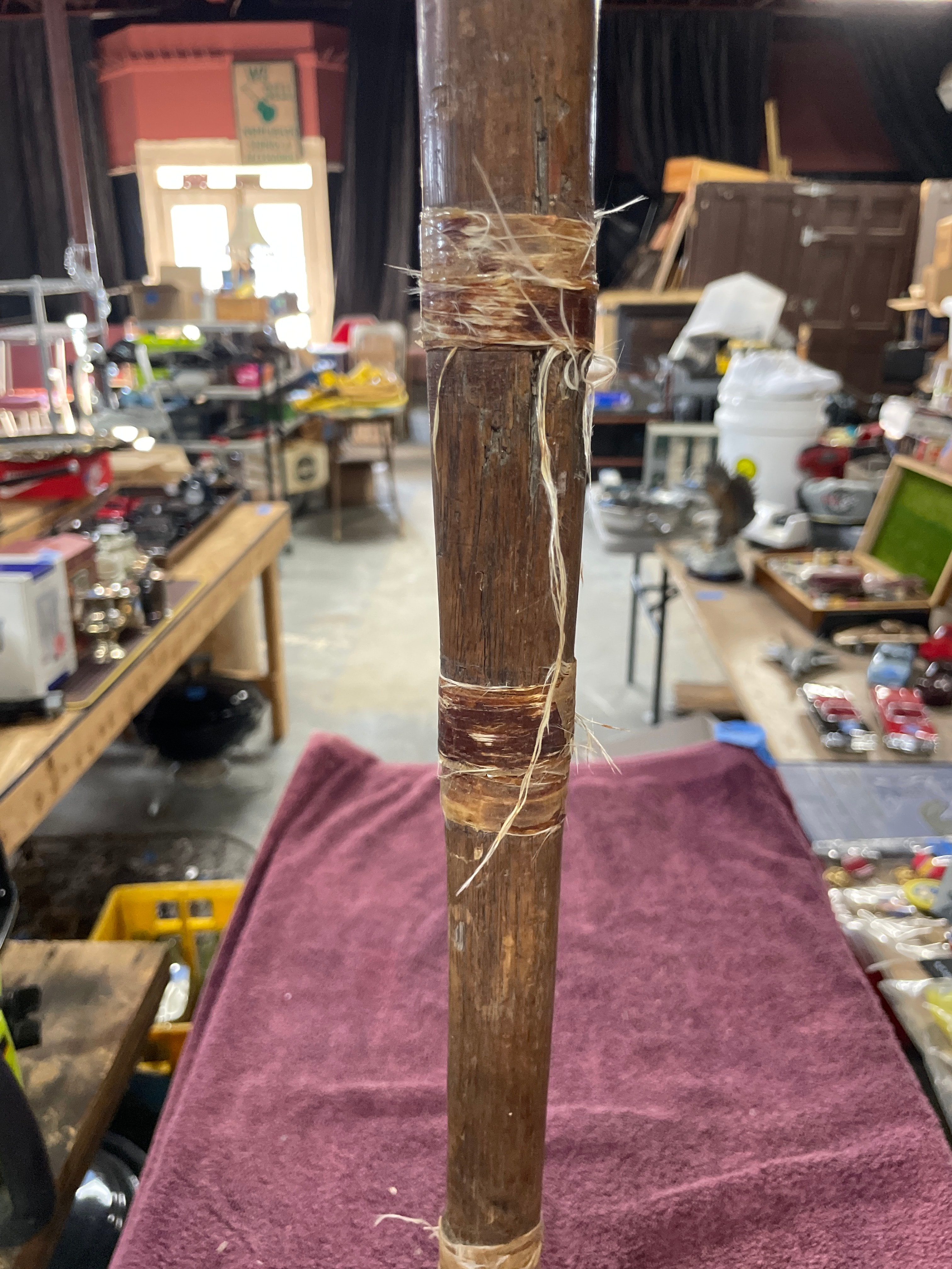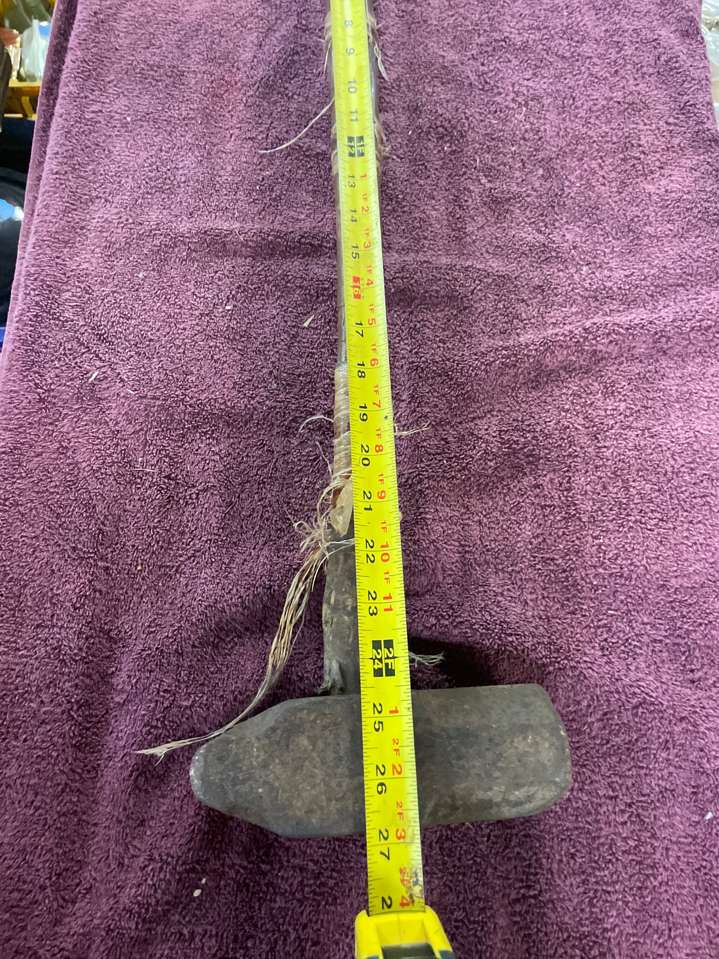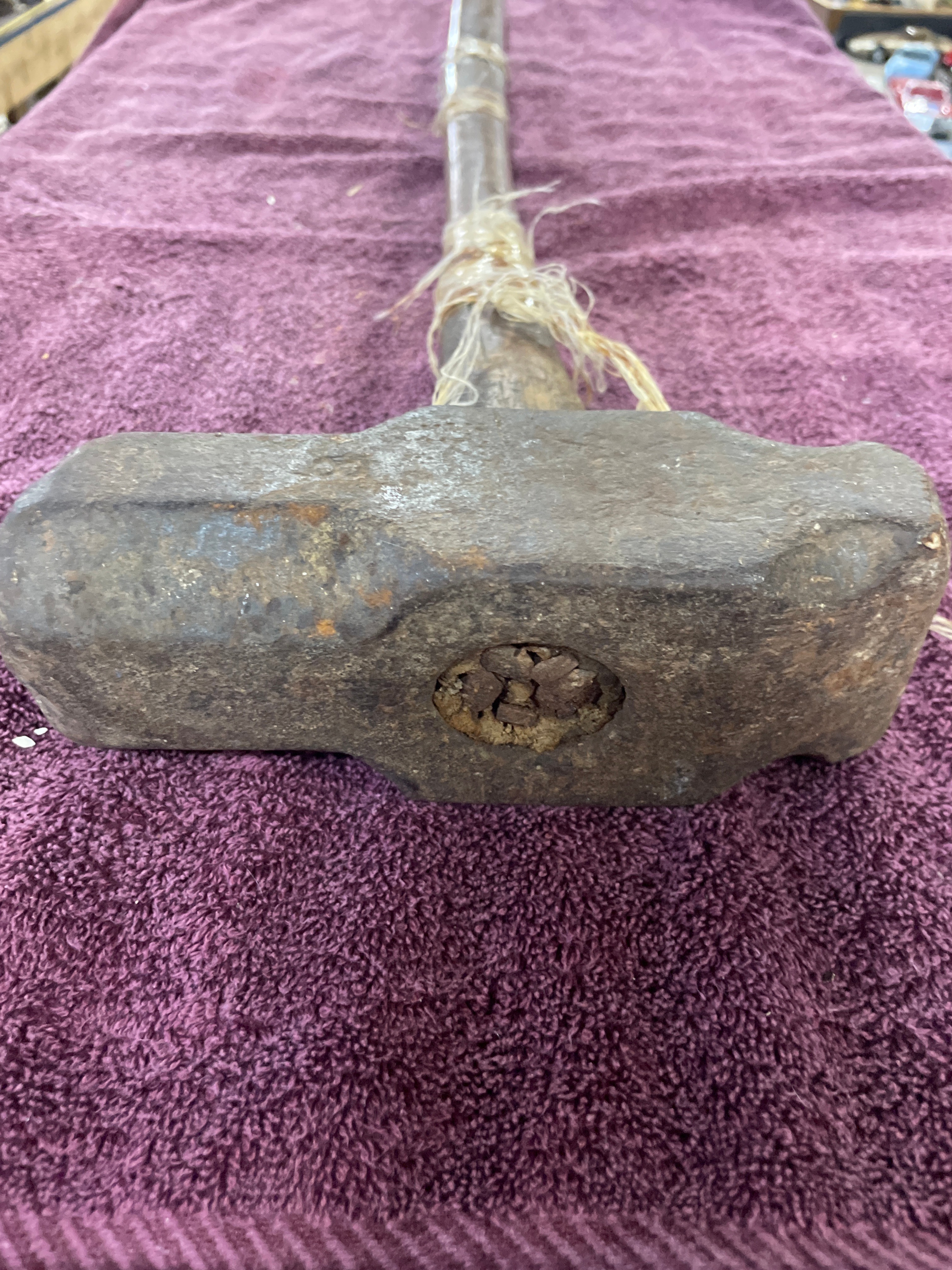 This heavy-duty striking tool features a large, oblong metal head, appearing to be forged or cast iron, exhibiting significant surface rust, pitting, and wear. The dark, patinated wooden handle is roughly shaped, showing natural variations, and is reinforced in several sections by loose, frayed natural fiber binding, which also secures the handle to the head. No discernible manufacturer’s marks or text are visible on the item. The overall construction and binding style bear a resemblance to certain indigenous or early industrial tools.