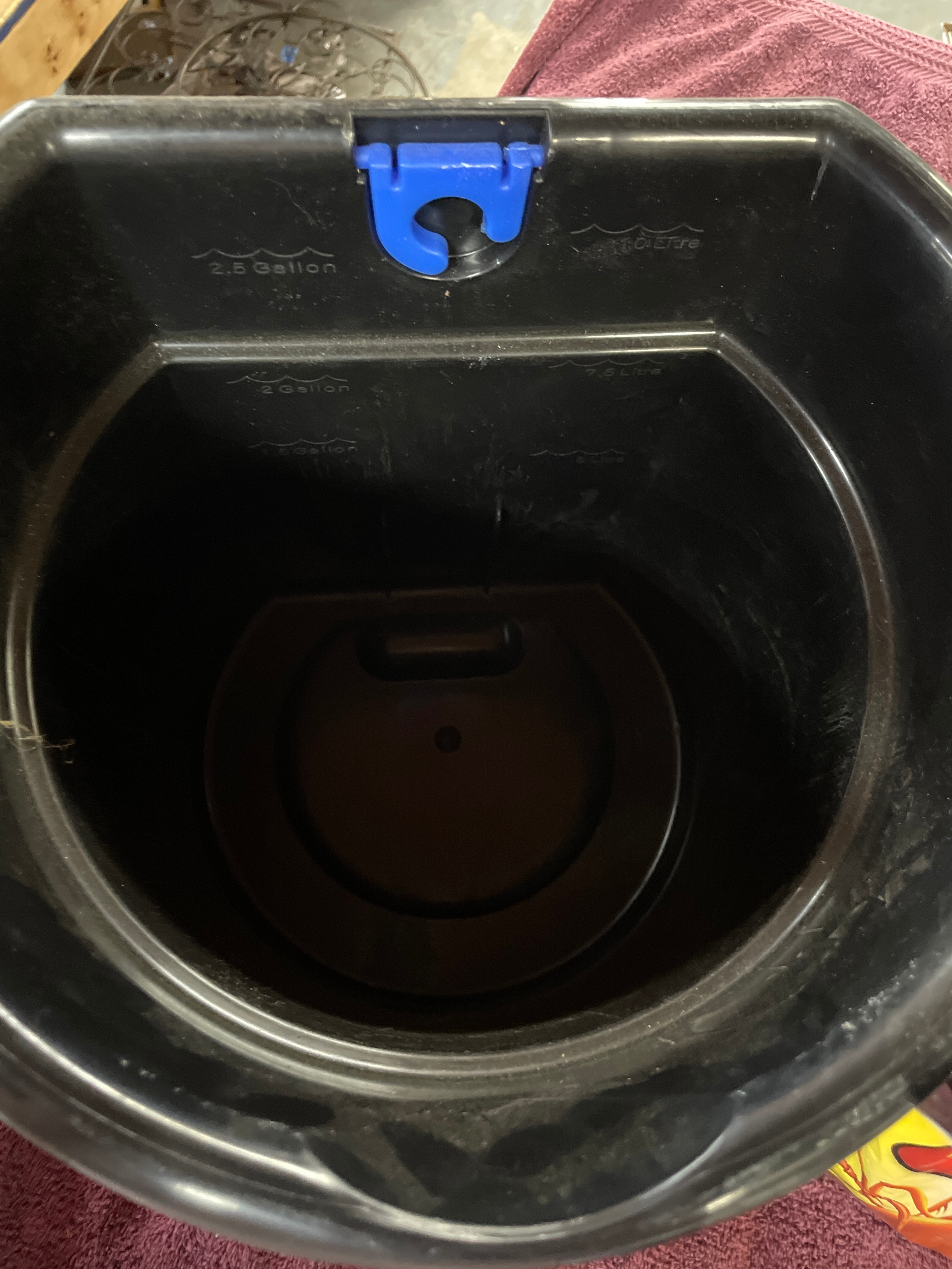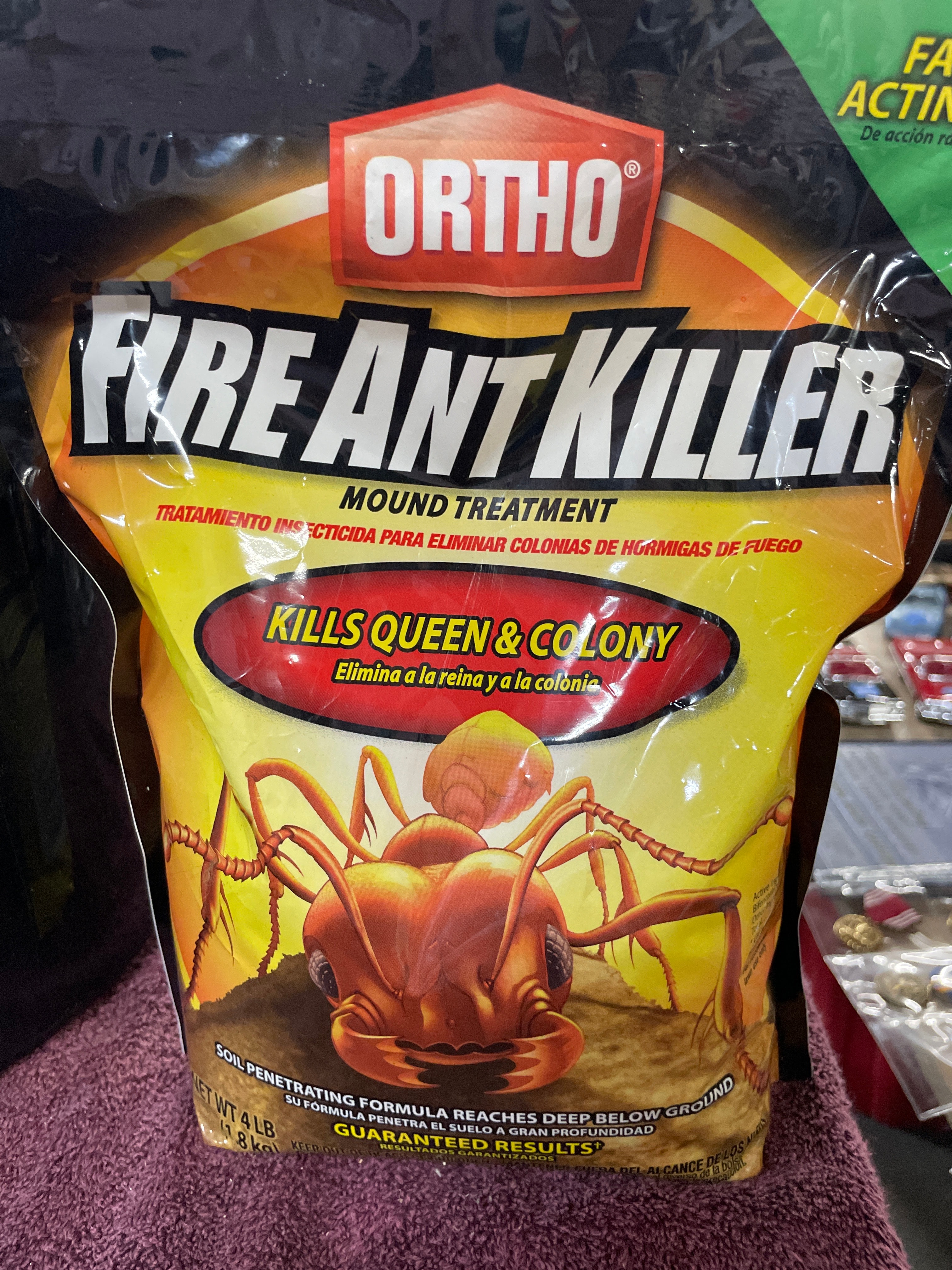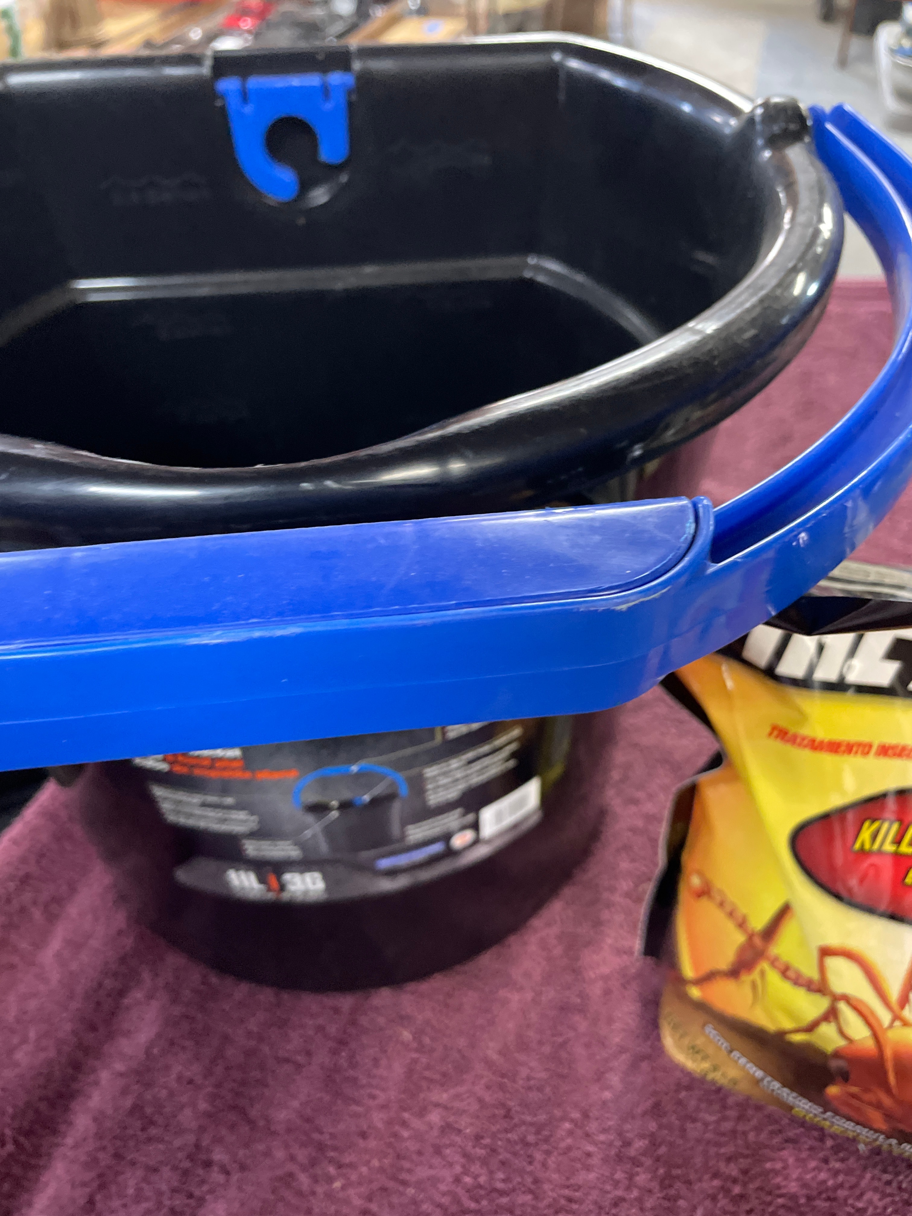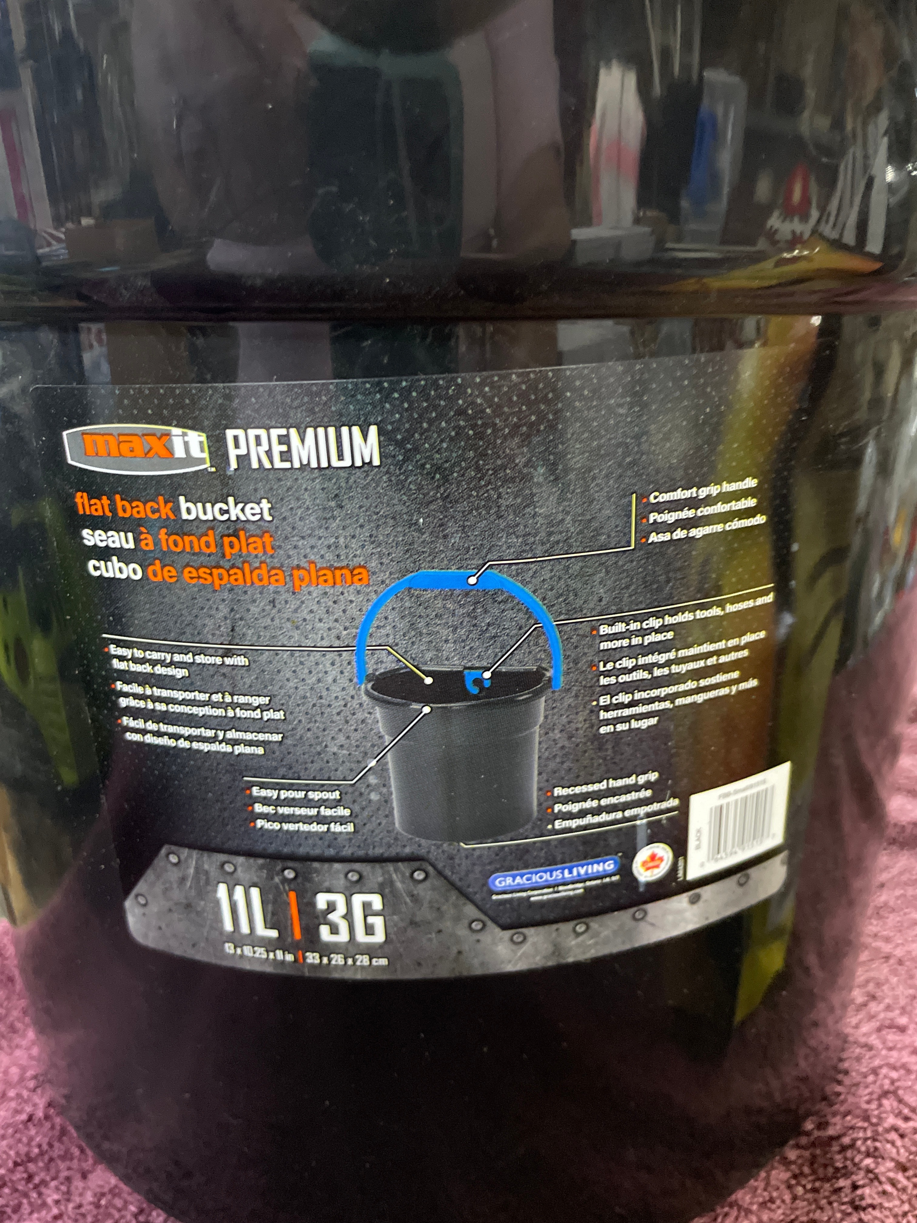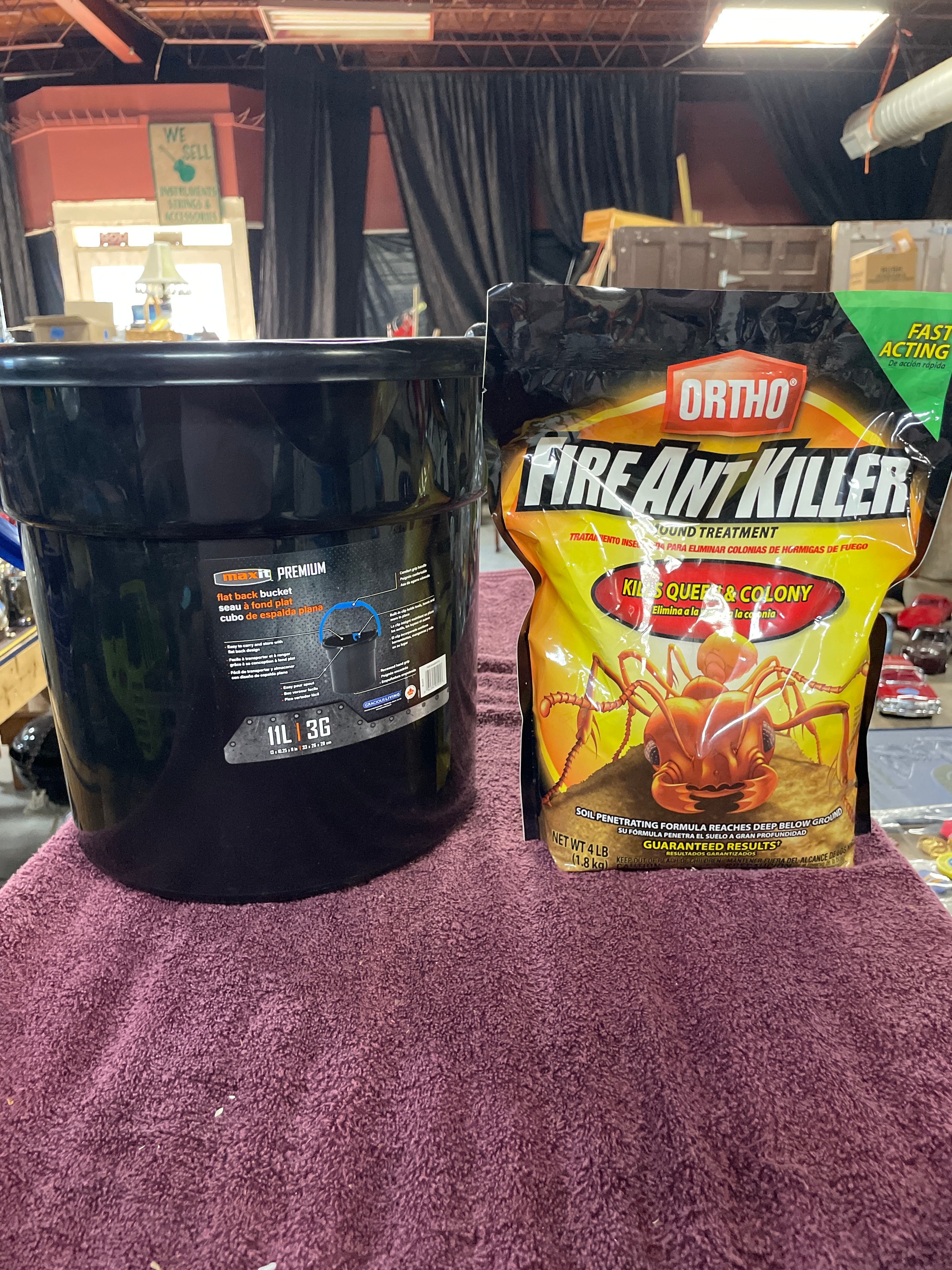 A Gracious Living 3-Gallon BPA-Free Plastic Paint Bucket, also labeled ‘MaxiT PREMIUM’ and ’11L 3G’. This black flat-back plastic bucket features a blue comfort-grip handle and an integrated blue hook. The interior includes measuring marks for 2.5 Gallon / 7.5 Litre. Accompanied by an ‘ORTHO FIRE ANT KILLER MOUND TREATMENT’ flexible pouch. The package displays a graphic of an ant on an orange and yellow background, with prominent English and Spanish text including ‘KILLS QUEEN & COLONY’ (Elimina a la reina y a la colonia) and ‘MOUND TREATMENT’ (Tratamiento insecticida para eliminar colonias de hormigas de fuego).