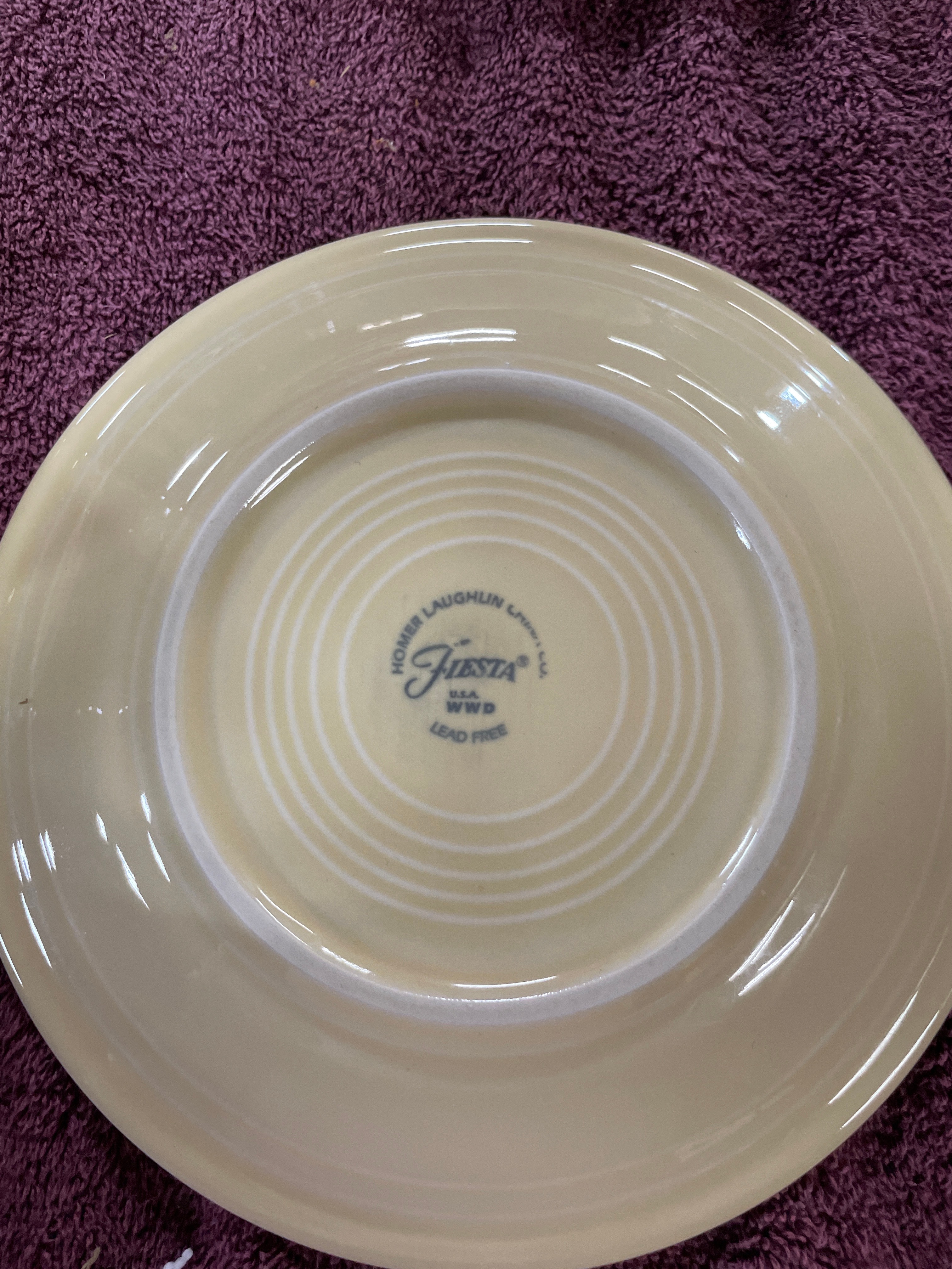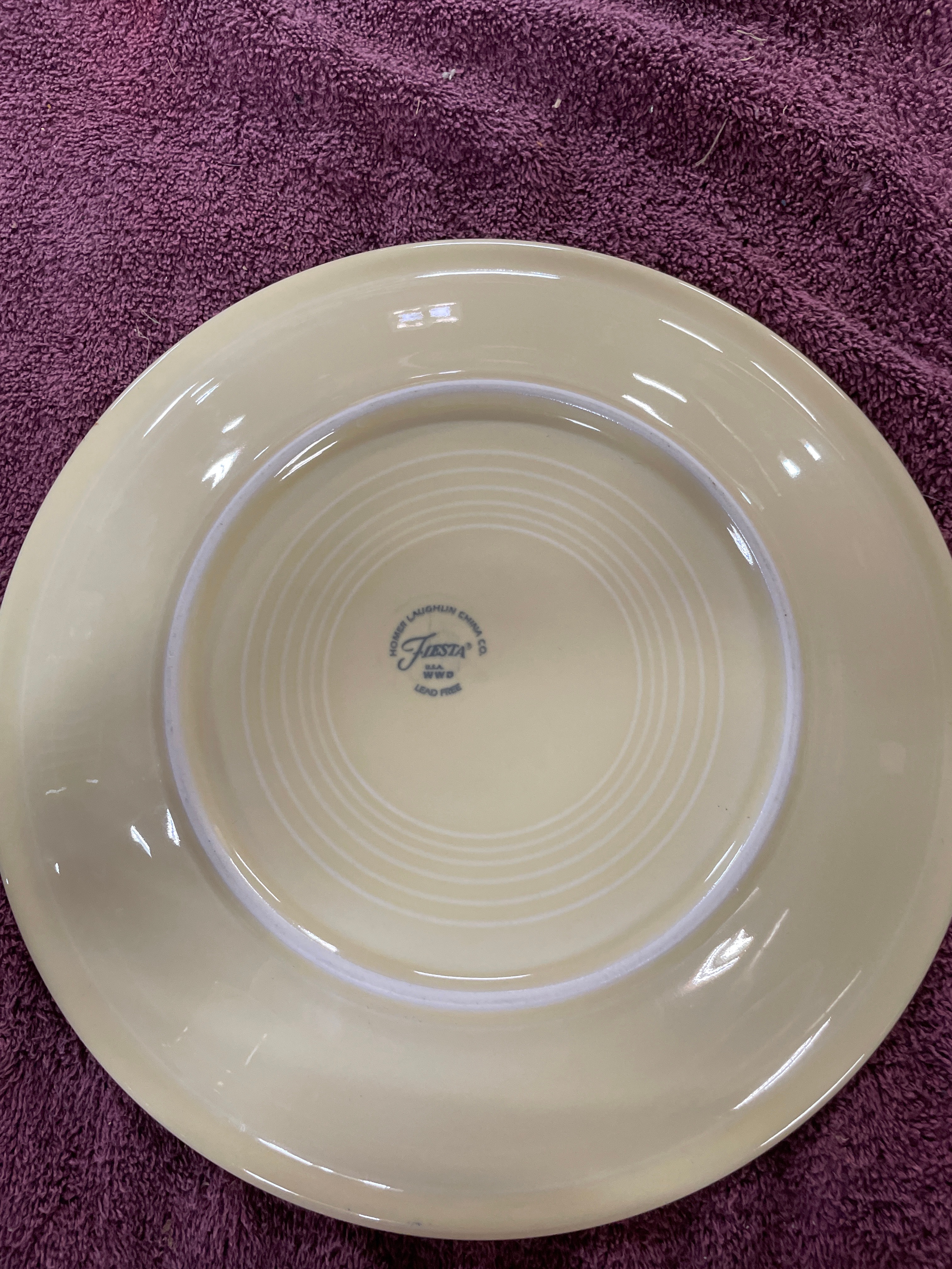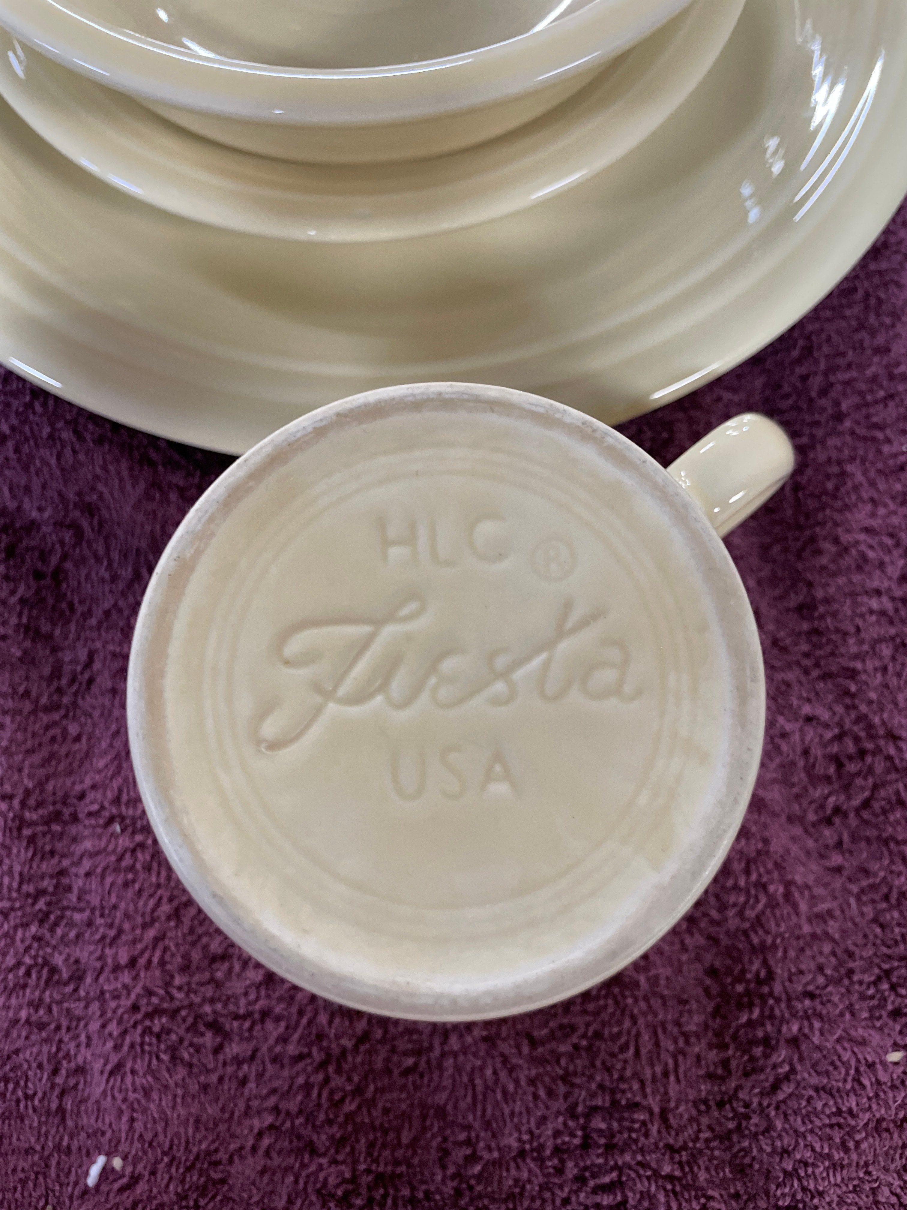 A set of Homer Laughlin Fiesta dinnerware in Ivory, comprising a cup, two bowls of varying sizes, and two plates of varying sizes, all featuring a distinctive concentric ring design. The style exhibits characteristics often associated with mid-century modern or Art Deco aesthetics. Visible impressed markings on the undersides of the cup and a smaller bowl read “HLC® Fiesta USA”, while the plates additionally bear “HOMER LAUGHLIN CHINA CO. Fiesta® USA W2G LEAD FREE”.