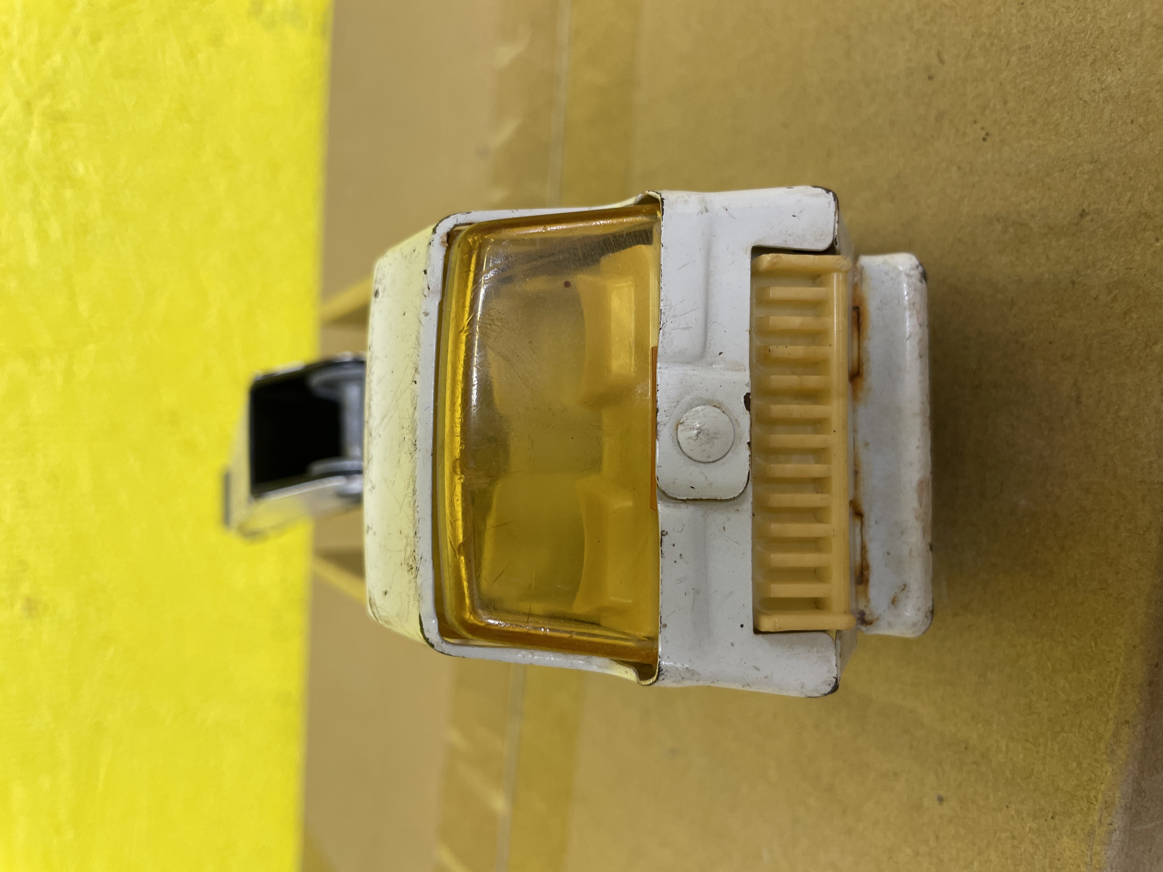 A Vintage Tiny Tonka Bell System Telephone Truck Bucket Mini Boom Steel, dating to approximately 1978. This pressed steel and plastic toy service truck features a predominantly white and beige painted metal body with a beige plastic truck bed. It is equipped with yellow plastic cab windows, grille, and wheel hubs, and black rubber tires. An articulated white and black boom mechanism is present. Visible markings include "Tonka" on the cab door and a blue and yellow stripe decal on the truck bed, which reads "Bell System" alongside its classic logo.