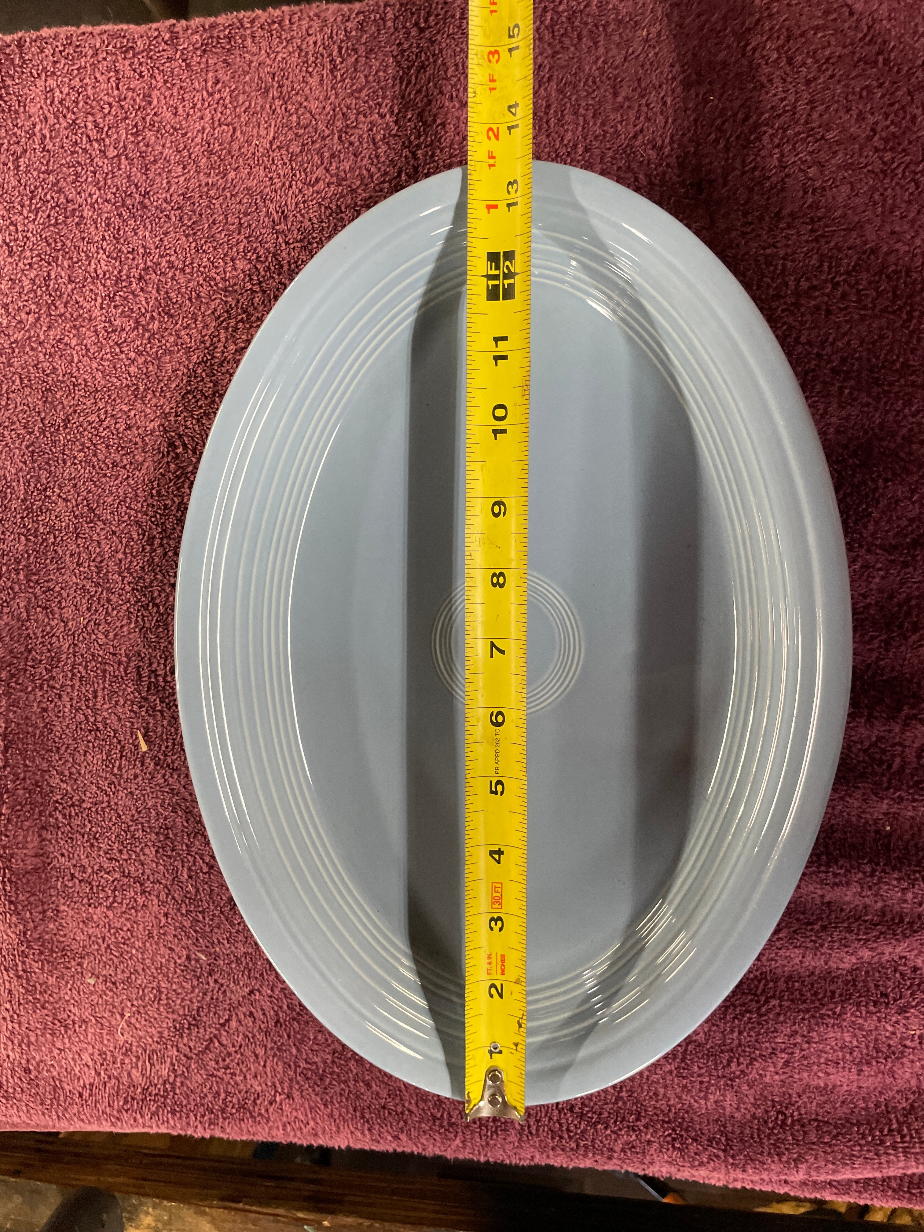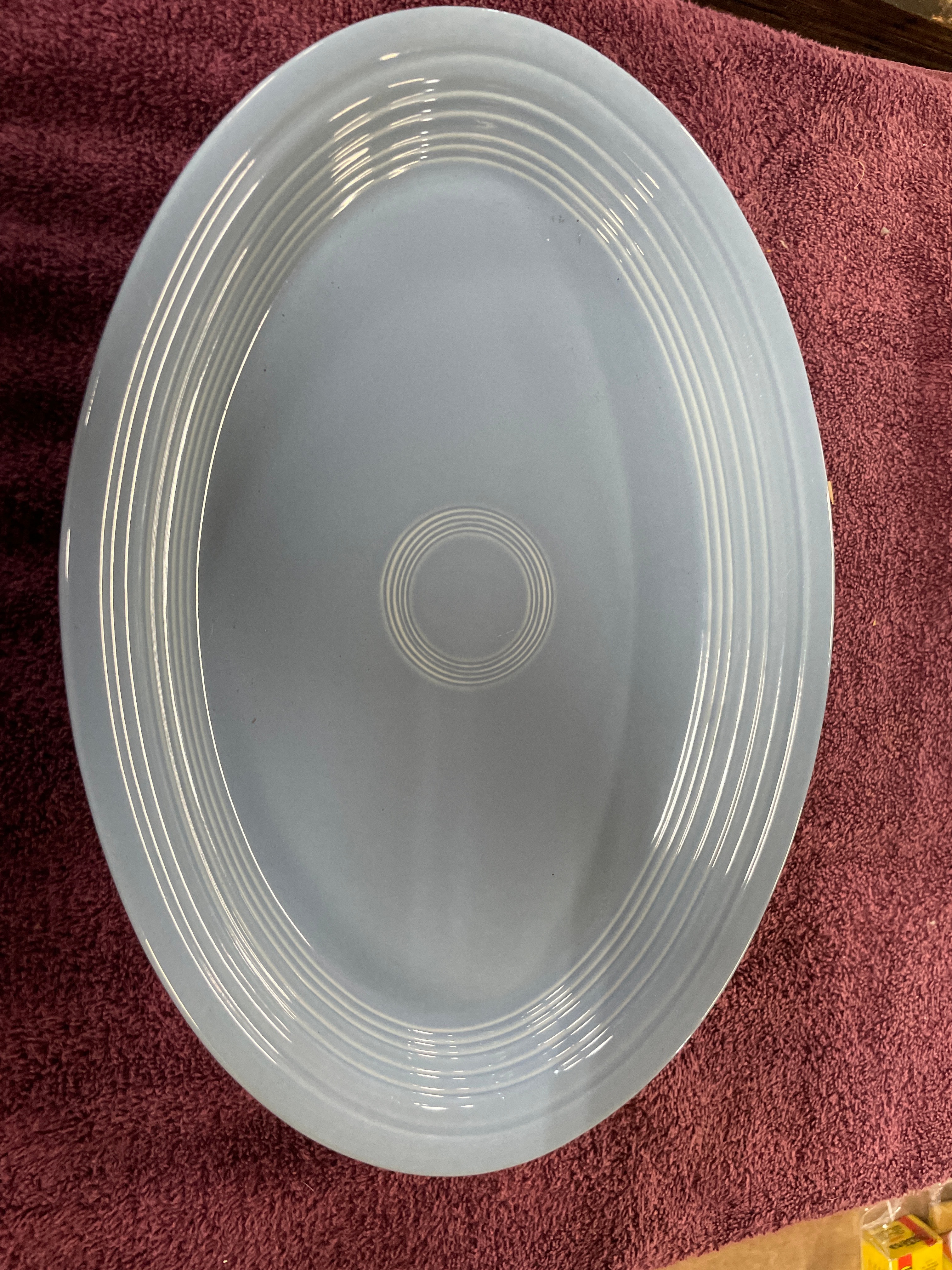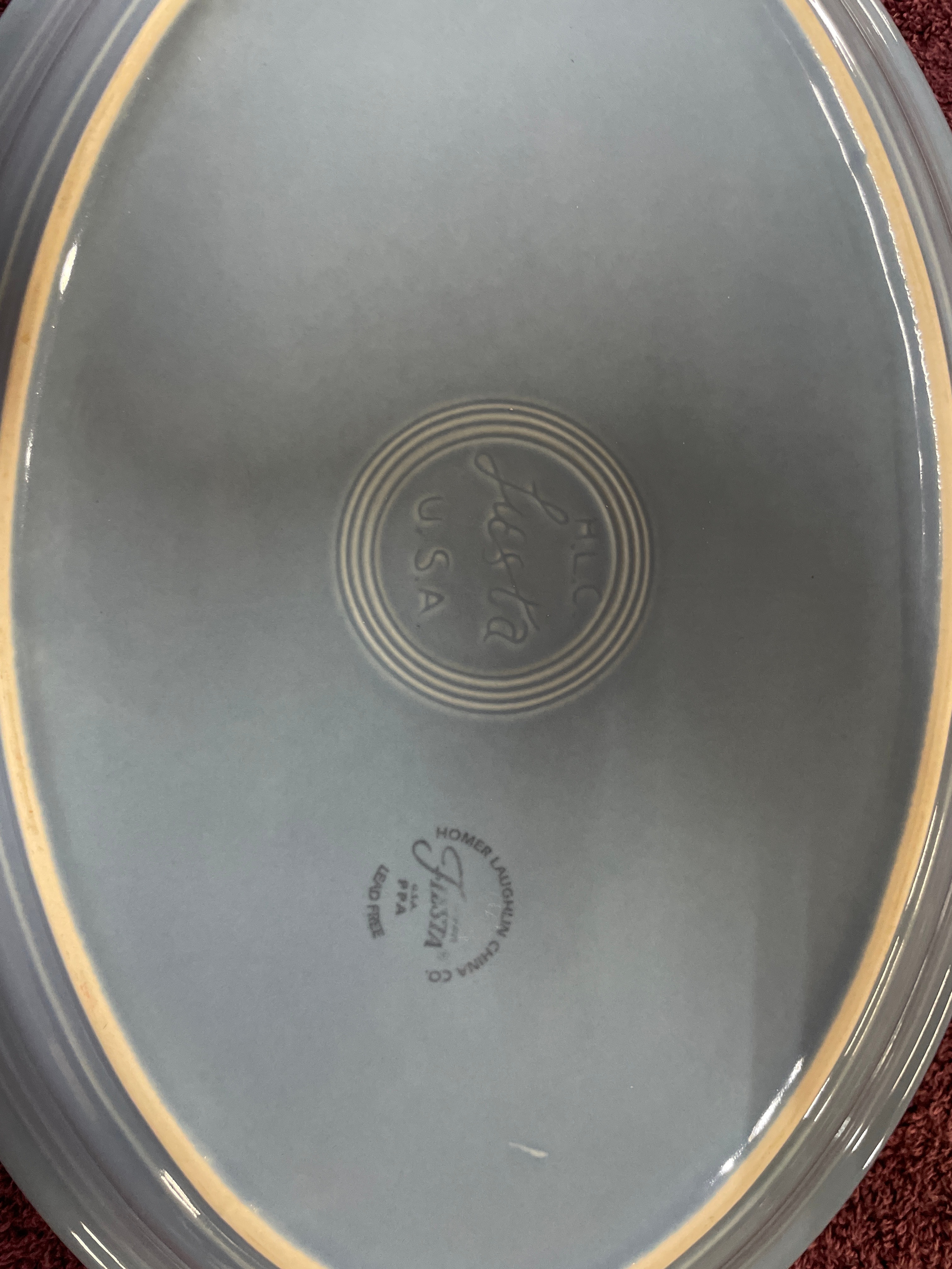 A Fiesta Periwinkle Blue oval serving platter. This ceramic platter features a light blue glaze with distinctive concentric rings across its surface. The underside is clearly marked with ‘Fiesta’ in a stylized script, ‘HLC USA’, ‘HOMER LAUGHLIN CHINA CO.’, and ‘LEAD FREE’, along with an additional ‘P9A’ mark.
