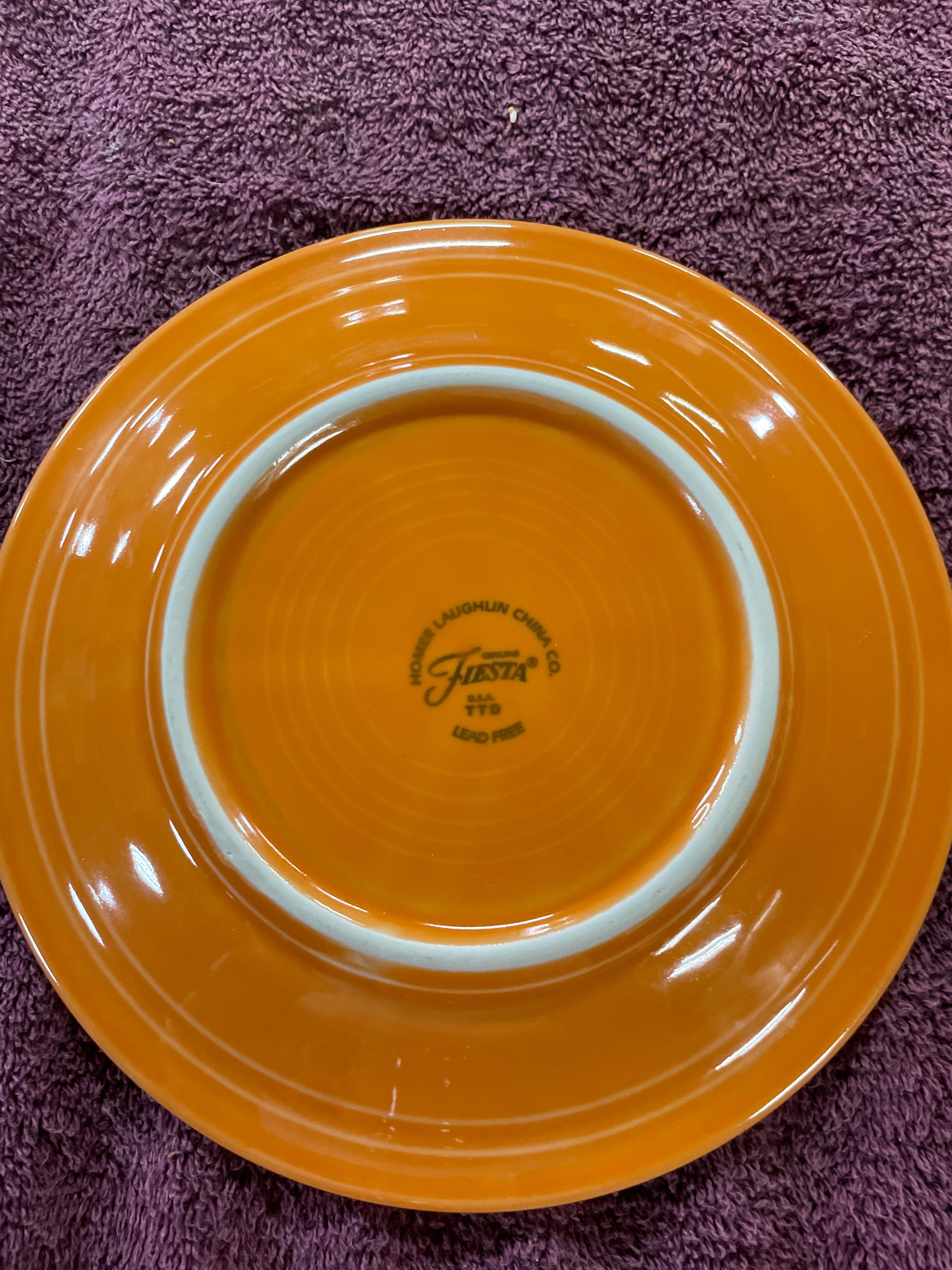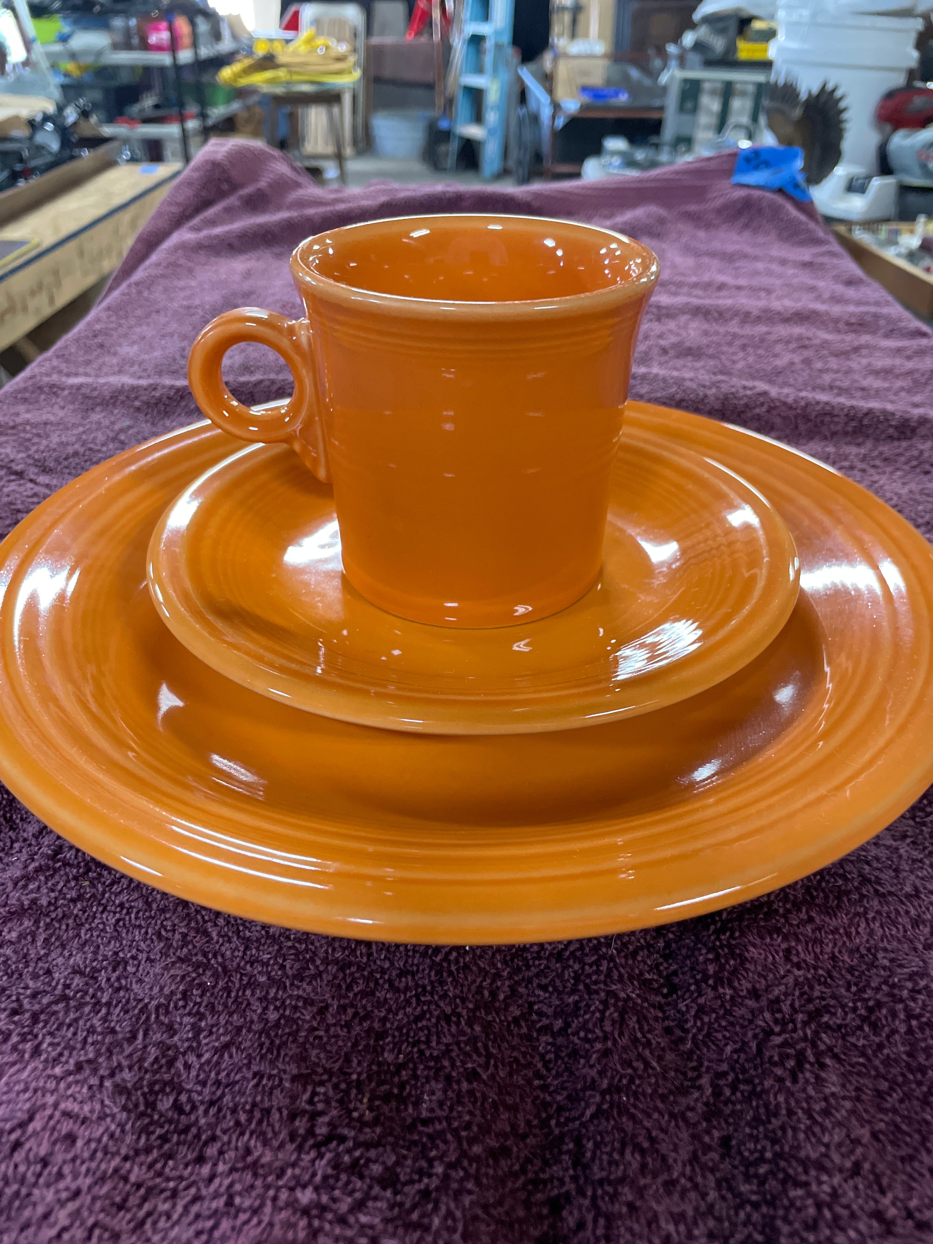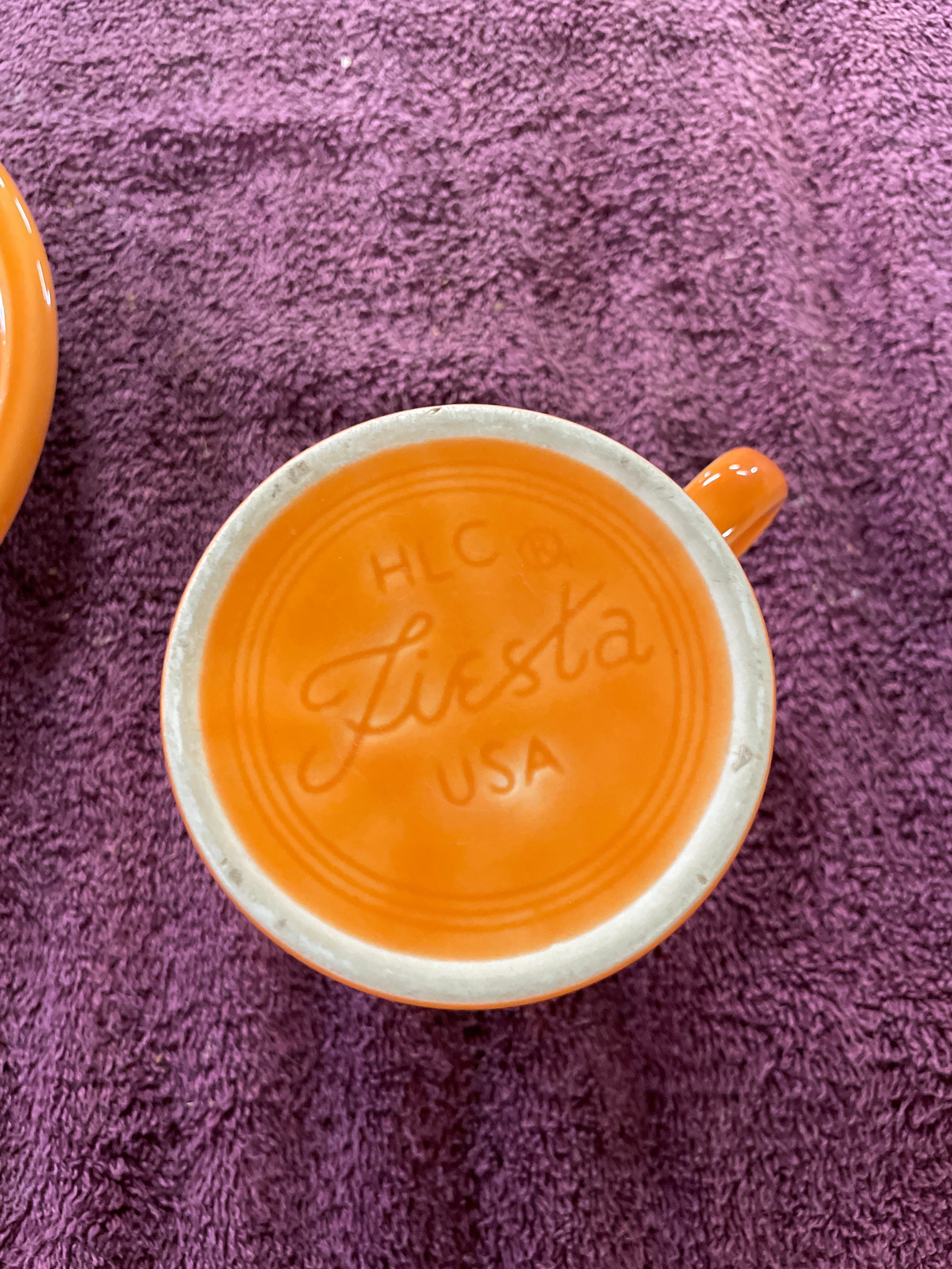 A three-piece Fiesta Tangerine dinnerware set by Homer Laughlin China Co., comprising a handled mug, a saucer, and a dinner plate, all in a vibrant, solid orange glazed ceramic. Each piece features a distinct concentric ring design characteristic of the Fiestaware brand. Markings on the underside of the plates read ‘HOMER LAUGHLIN CHINA CO.’, ‘FIESTA’ (in script), a partially obscured mark ‘F?D’, and ‘LEAD FREE’. The mug’s base is marked ‘HLC®’, ‘Fiesta’ (in script), and ‘USA’.