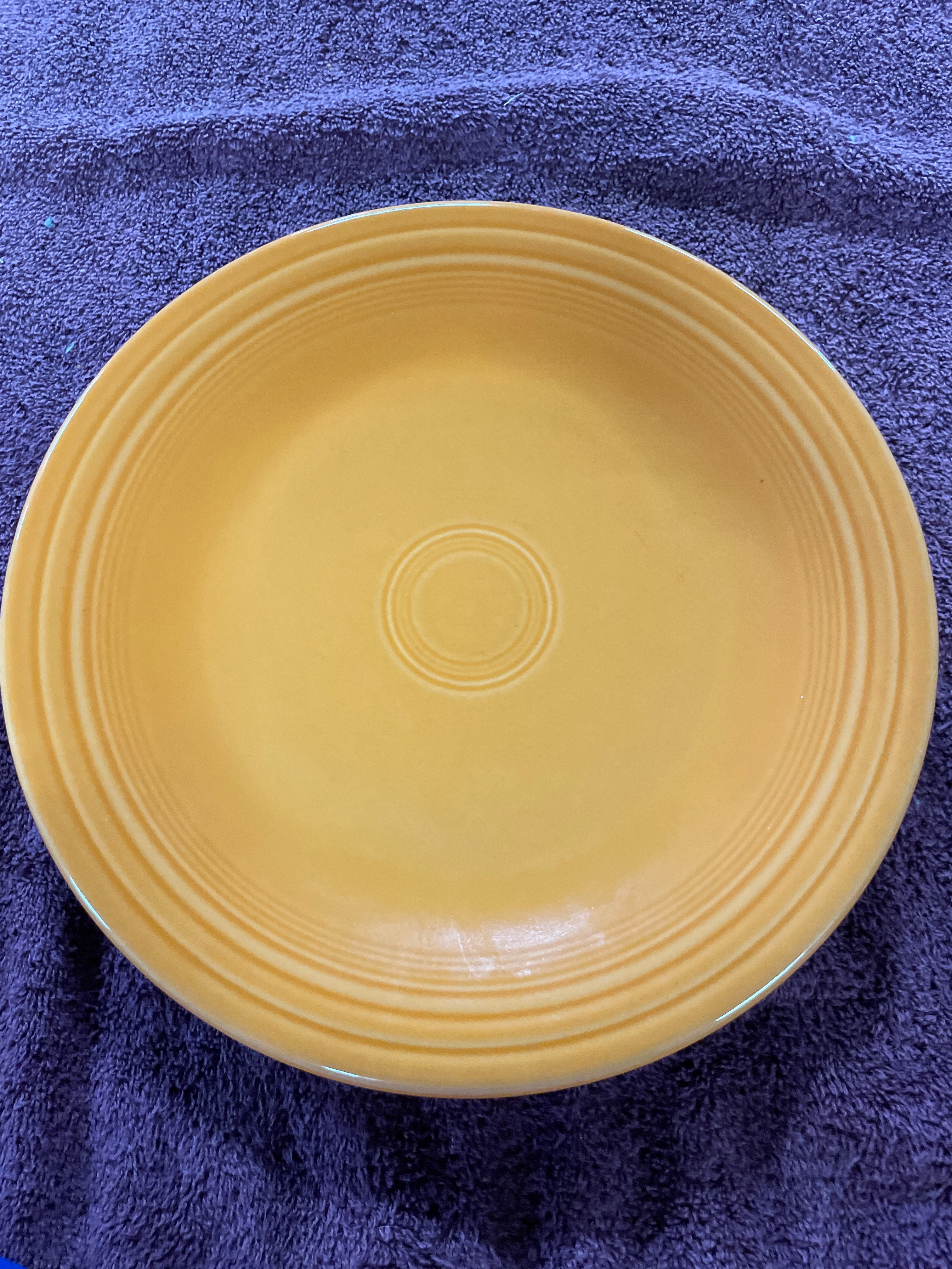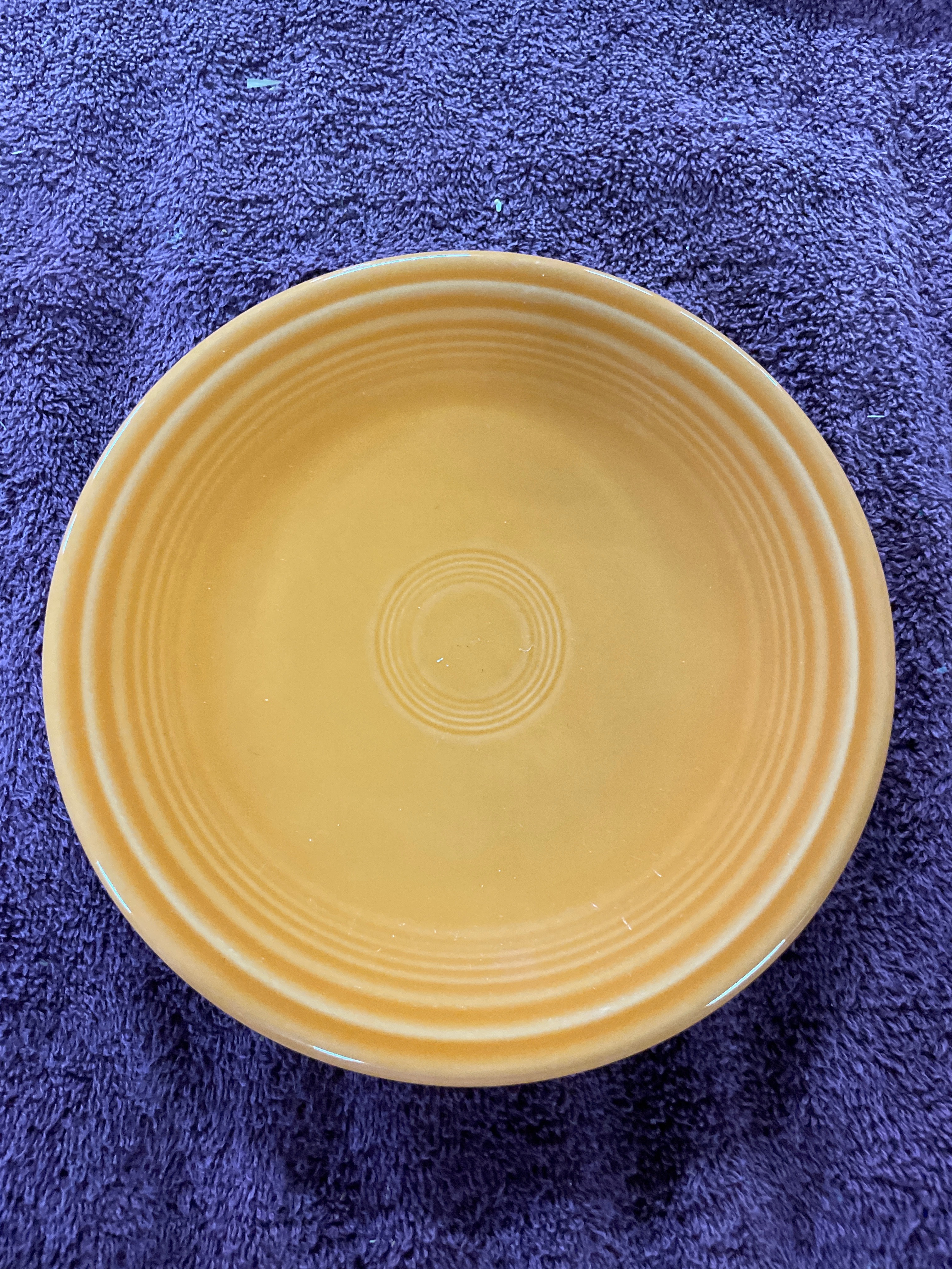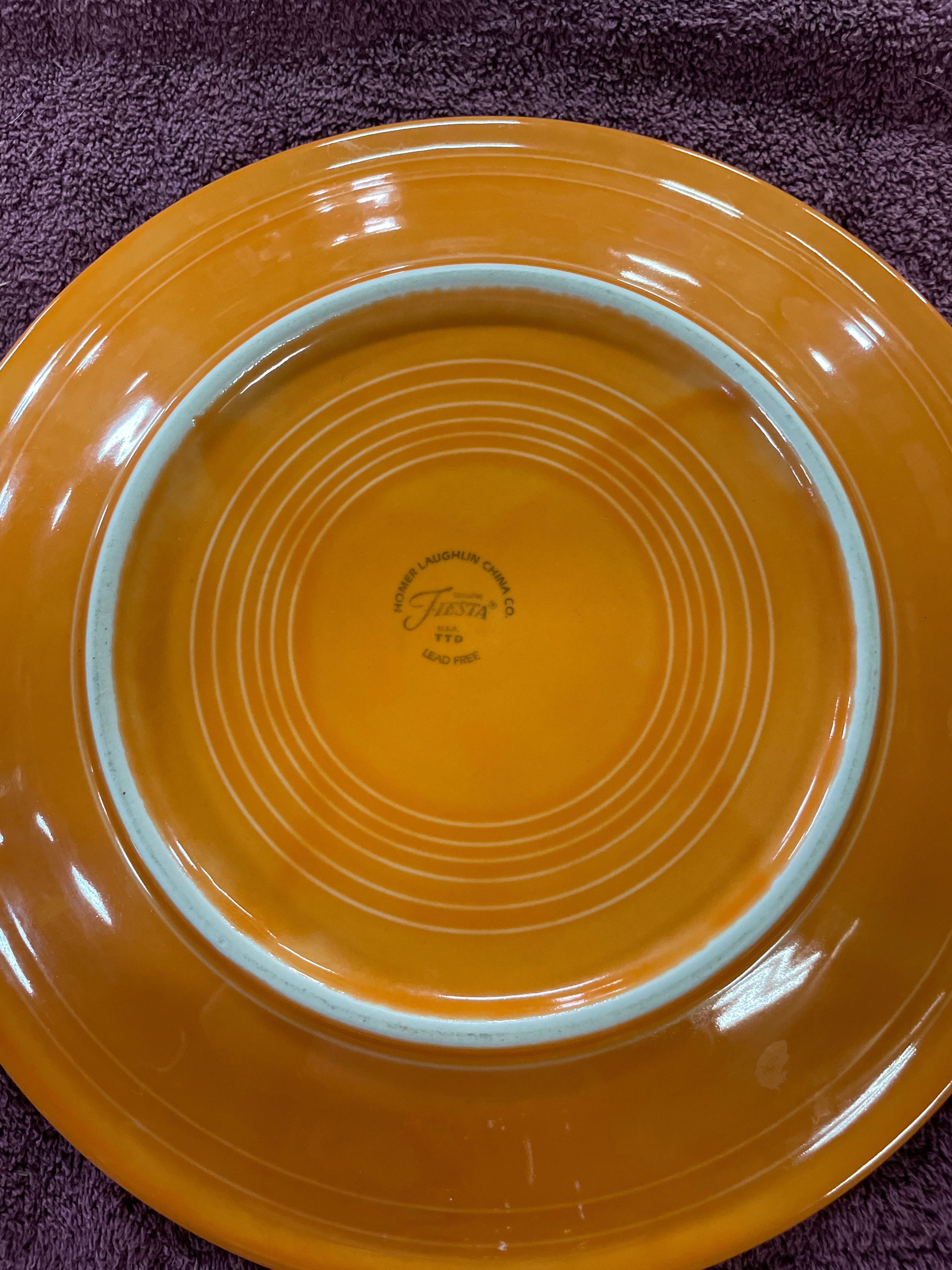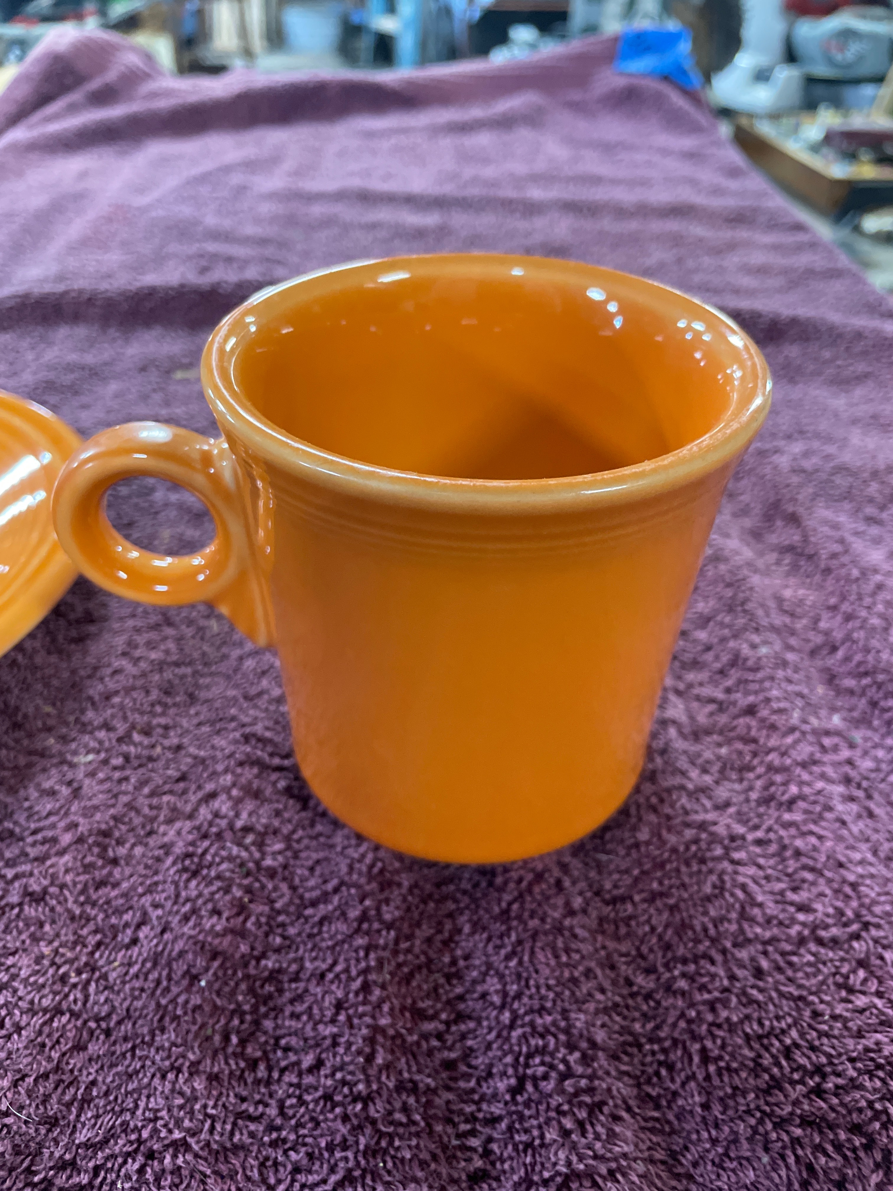 A three-piece Fiesta Tangerine dinnerware set by Homer Laughlin China Co., comprising a handled mug, a saucer, and a dinner plate, all in a vibrant, solid orange glazed ceramic. Each piece features a distinct concentric ring design characteristic of the Fiestaware brand. Markings on the underside of the plates read ‘HOMER LAUGHLIN CHINA CO.’, ‘FIESTA’ (in script), a partially obscured mark ‘F?D’, and ‘LEAD FREE’. The mug’s base is marked ‘HLC®’, ‘Fiesta’ (in script), and ‘USA’.
