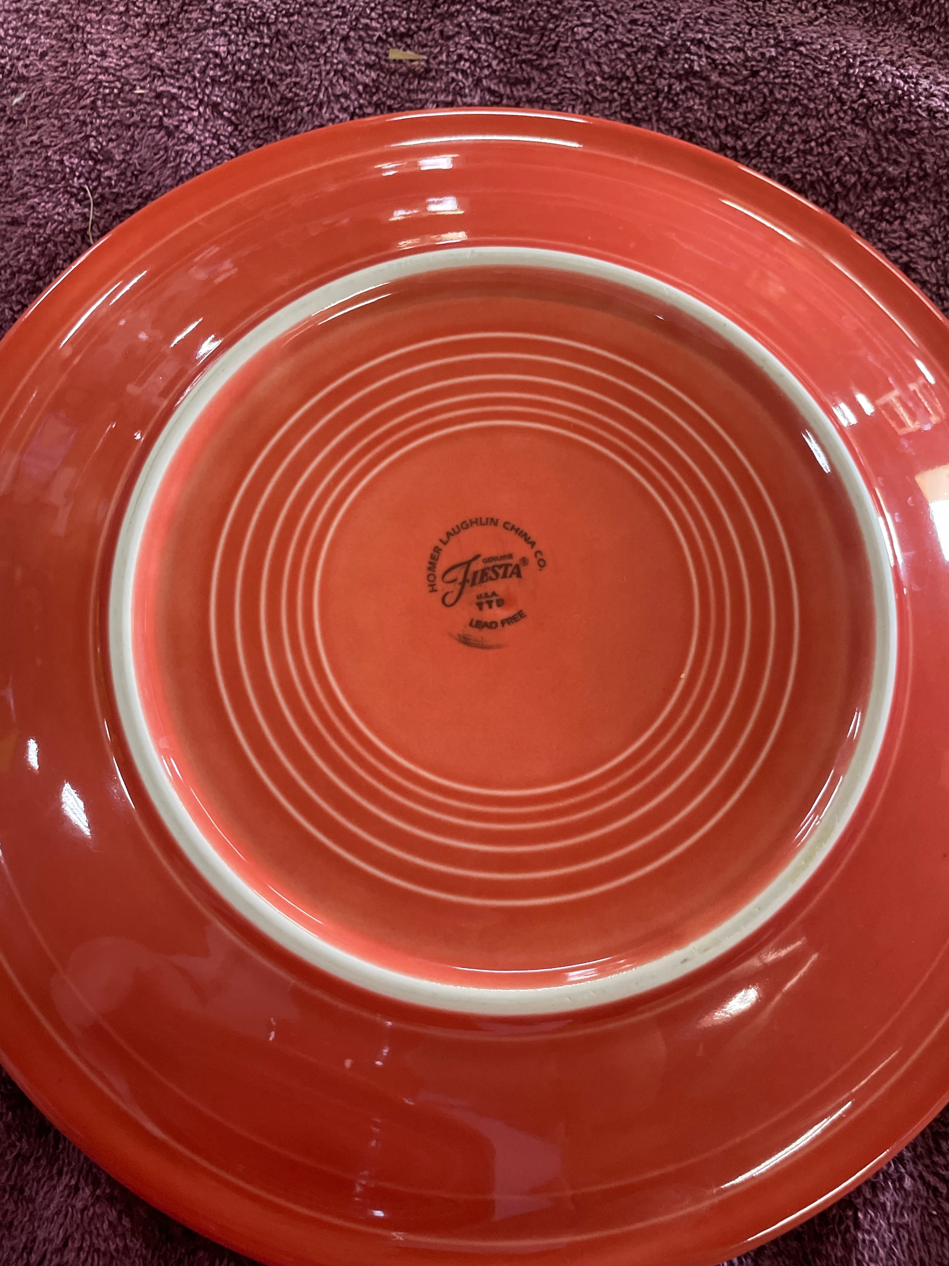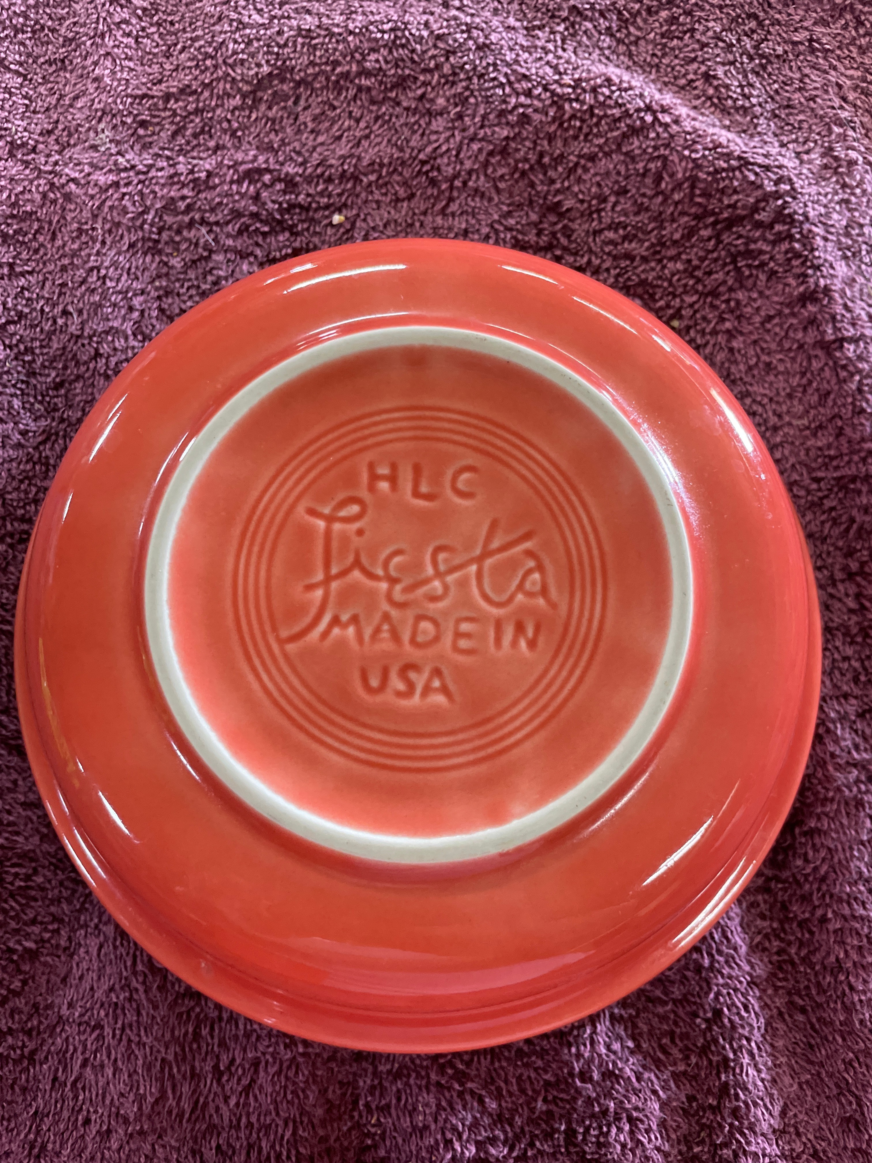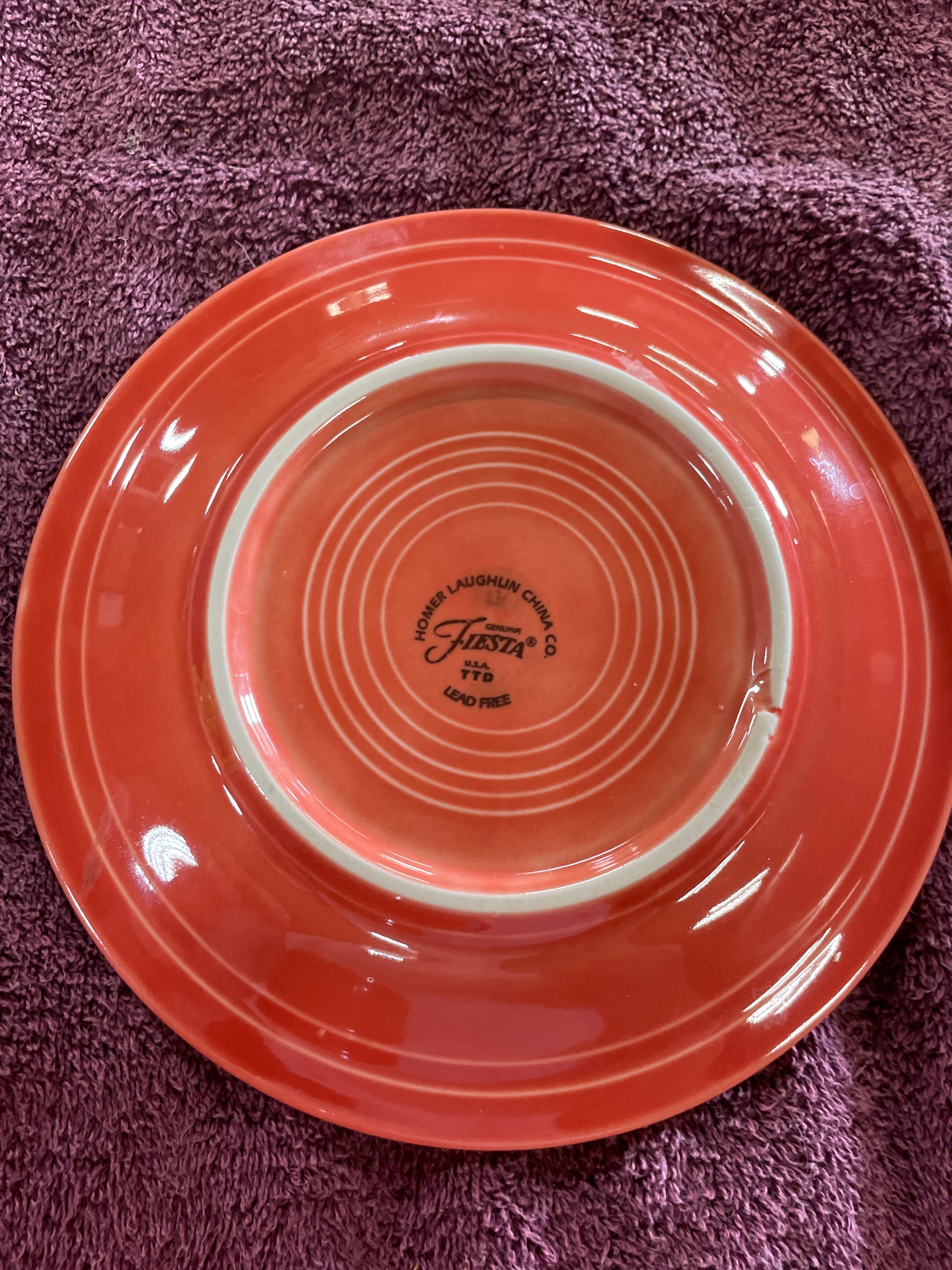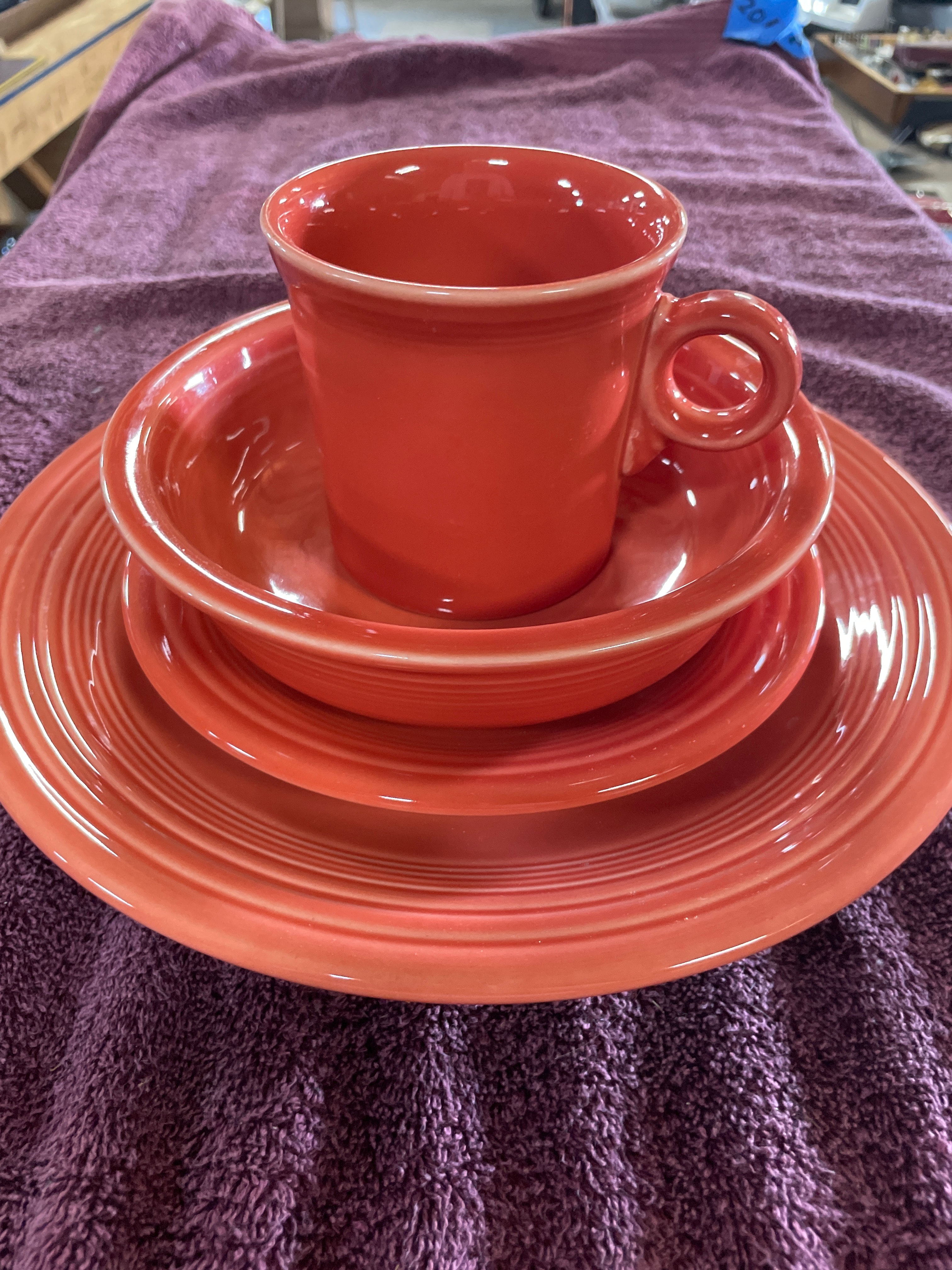 A four-piece orange Fiesta dinnerware set by Homer Laughlin, consisting of one dinner plate, one salad plate, one bowl, and one mug, with various pieces marked ‘Homer Laughlin China Co.’, ‘Fiesta’, ‘U.S.A.’, ‘HLC®’, and ‘Lead Free’.
