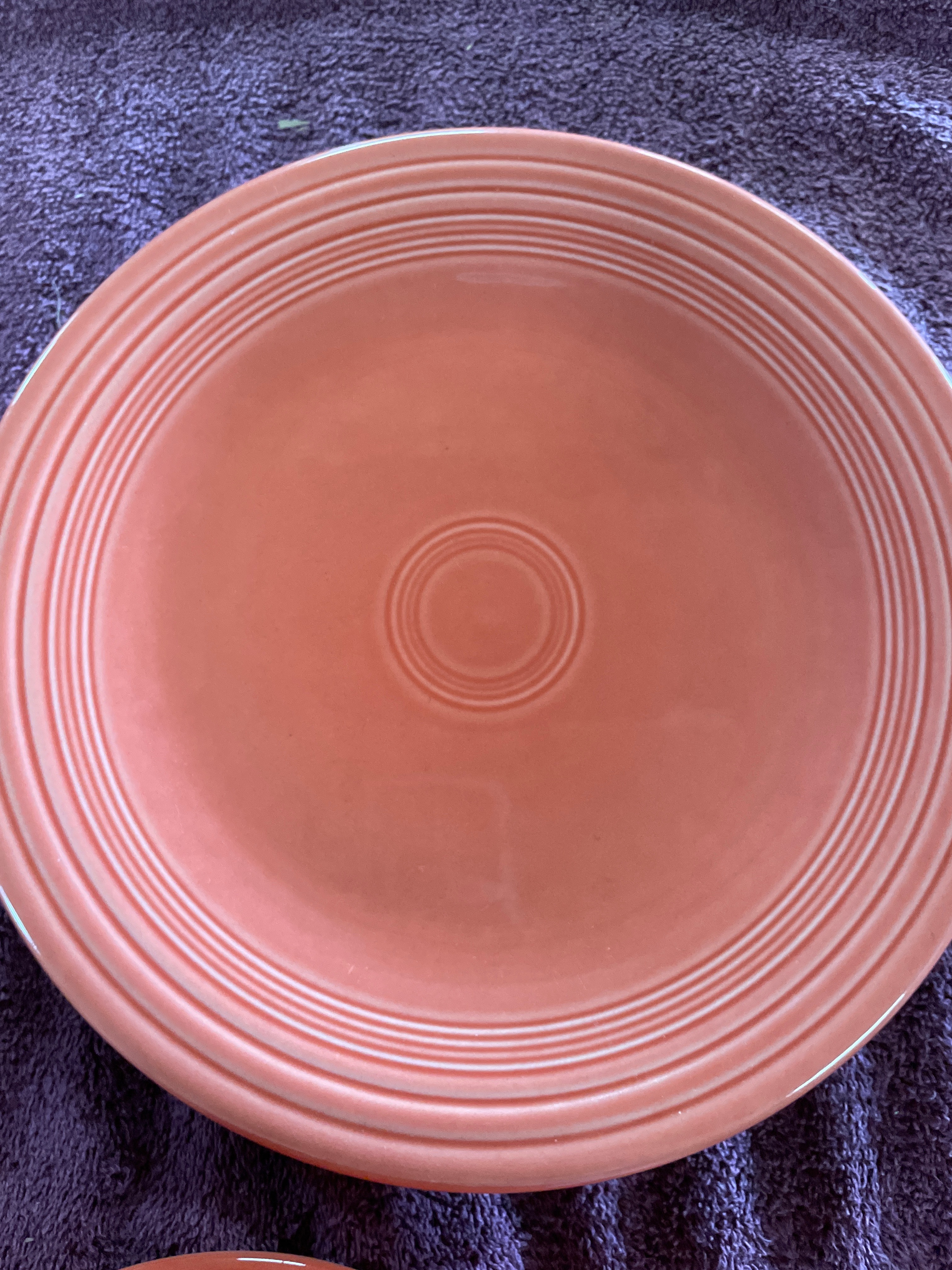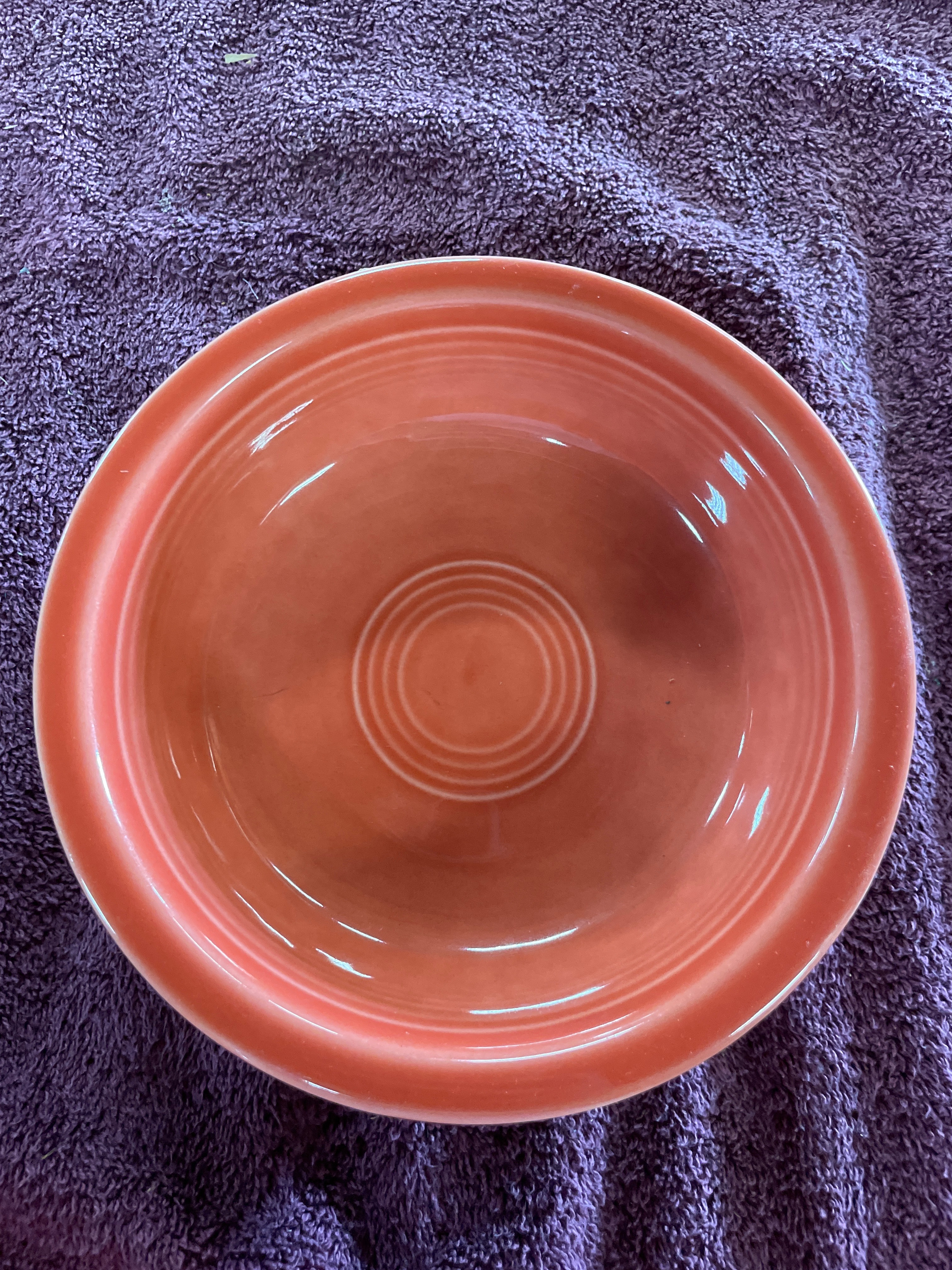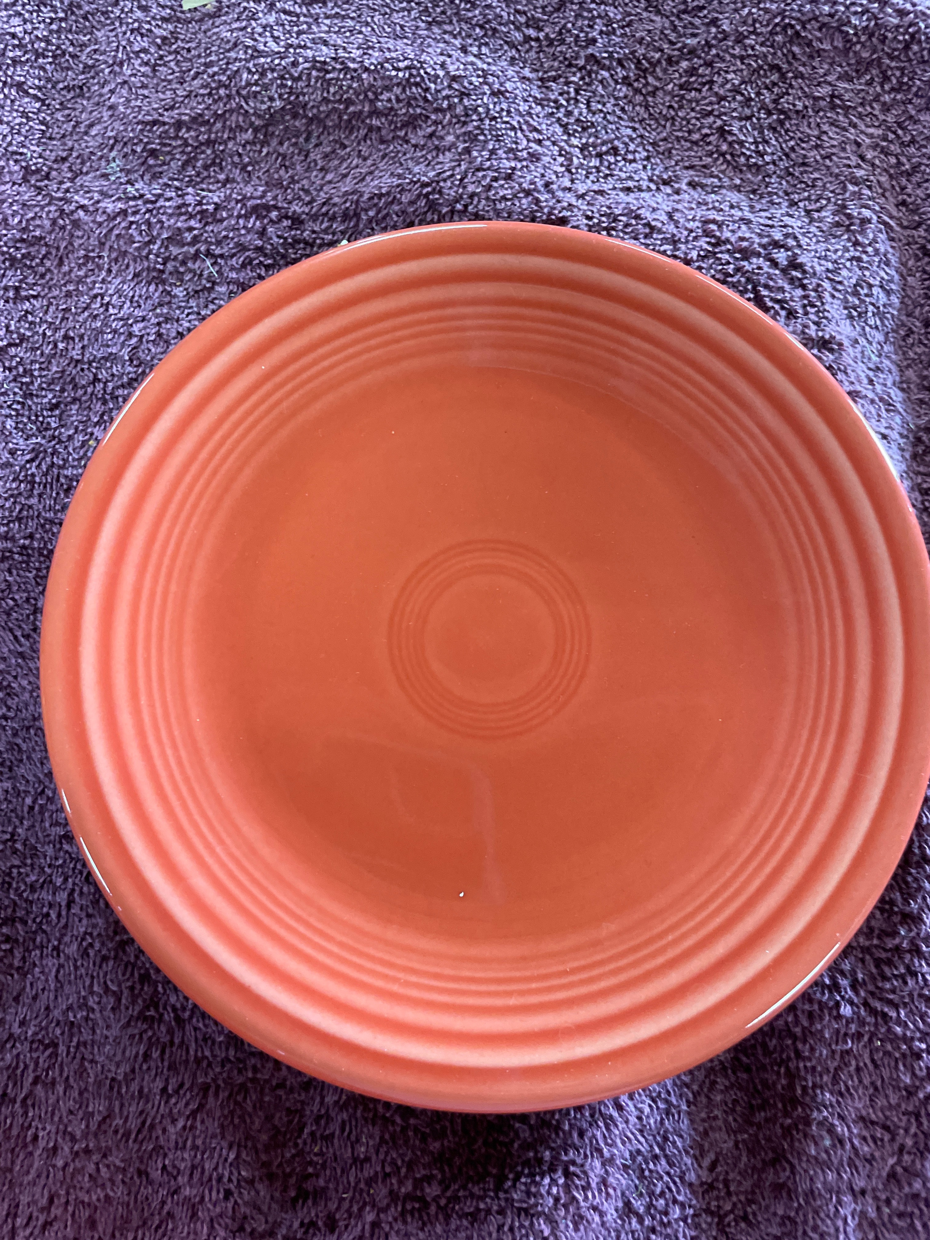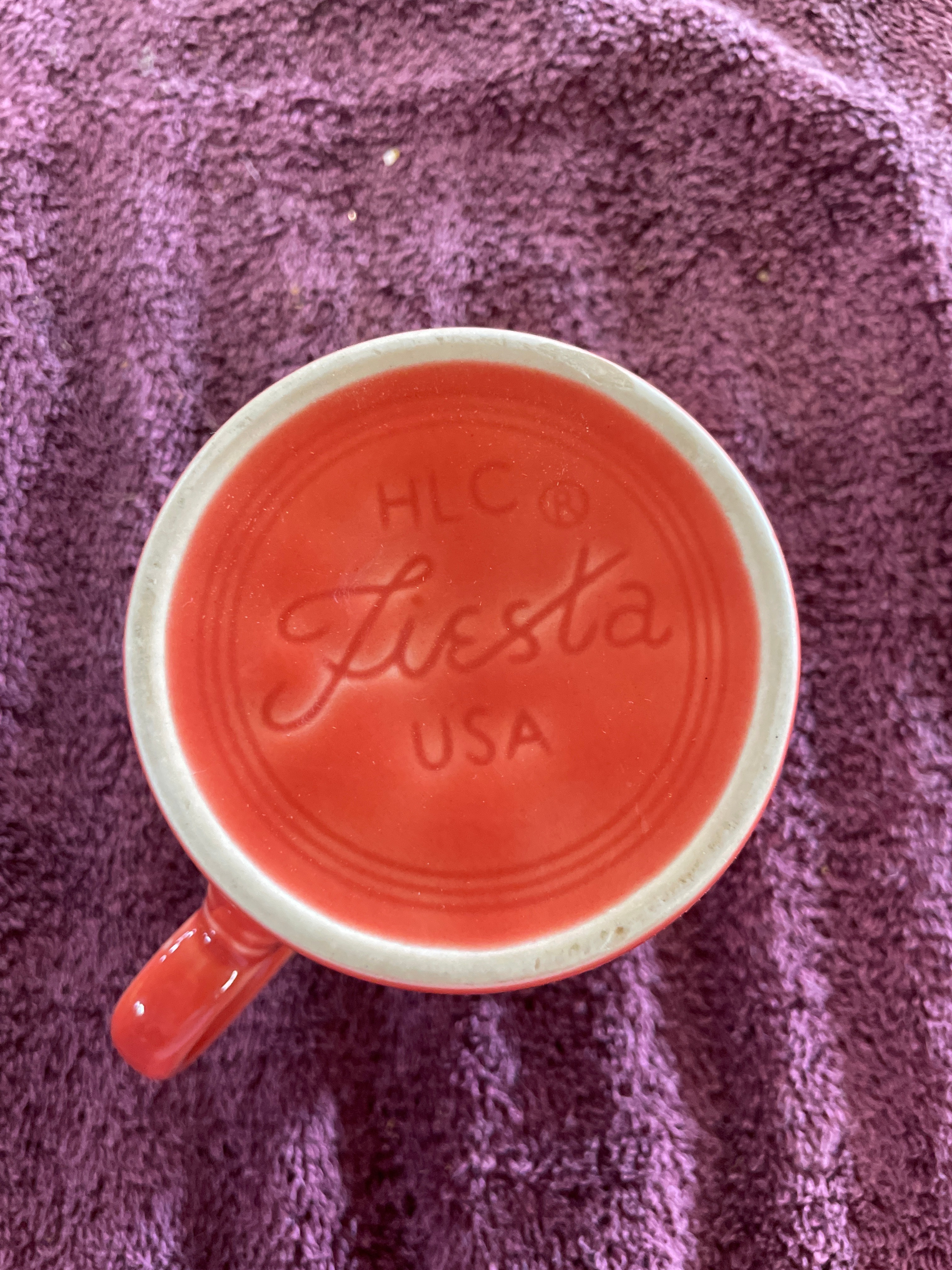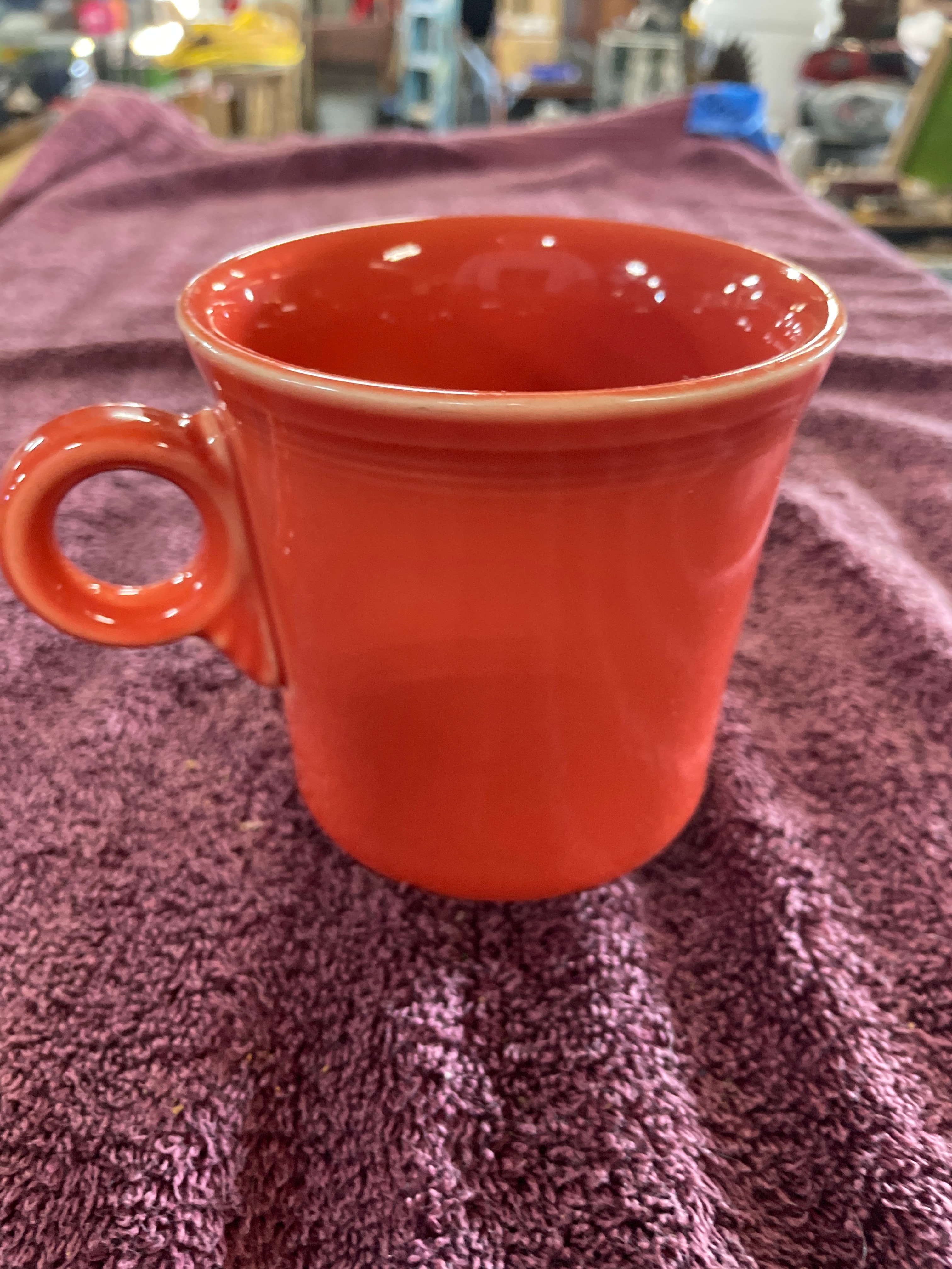 A four-piece orange Fiesta dinnerware set by Homer Laughlin, consisting of one dinner plate, one salad plate, one bowl, and one mug, with various pieces marked ‘Homer Laughlin China Co.’, ‘Fiesta’, ‘U.S.A.’, ‘HLC®’, and ‘Lead Free’.