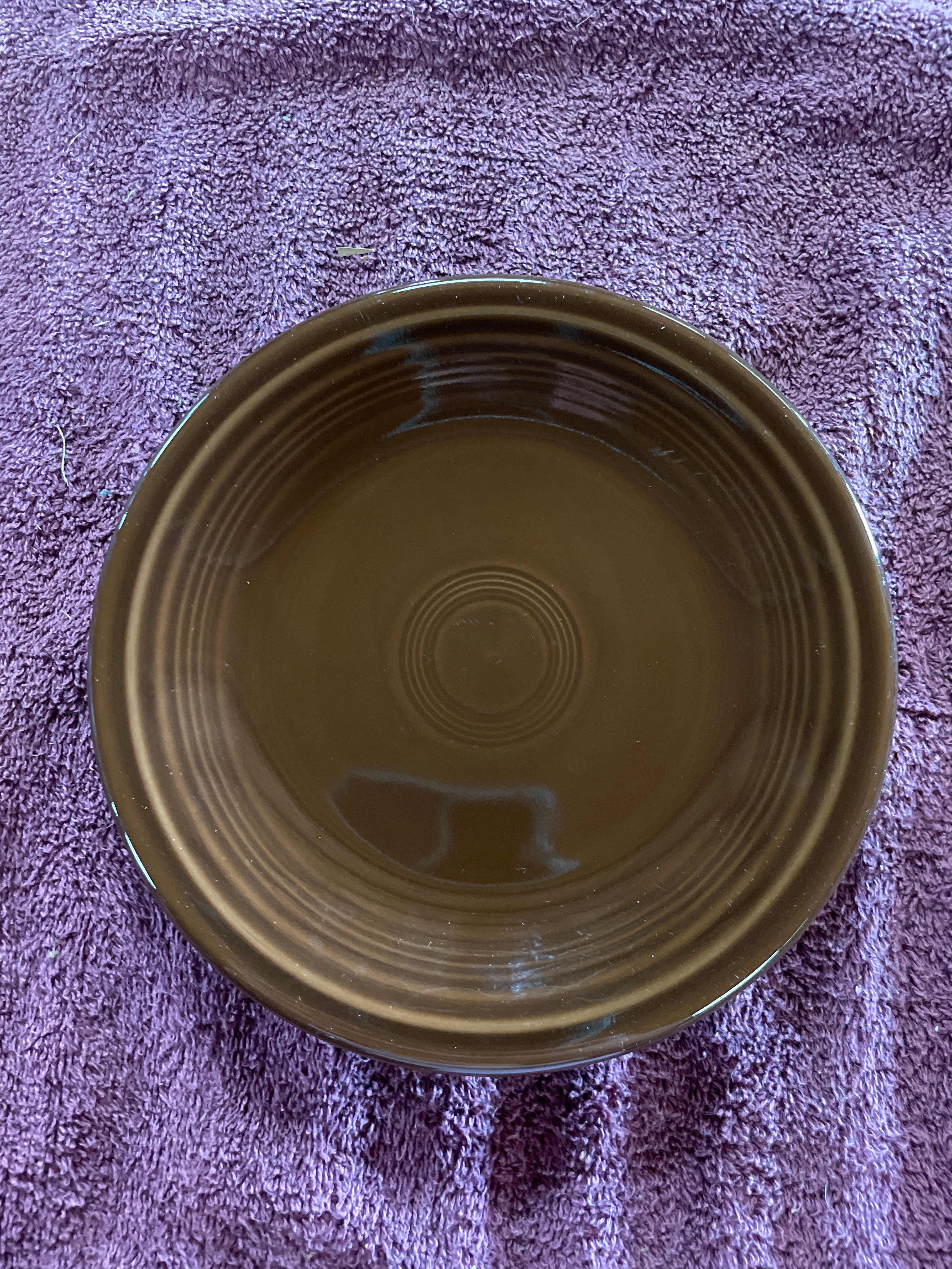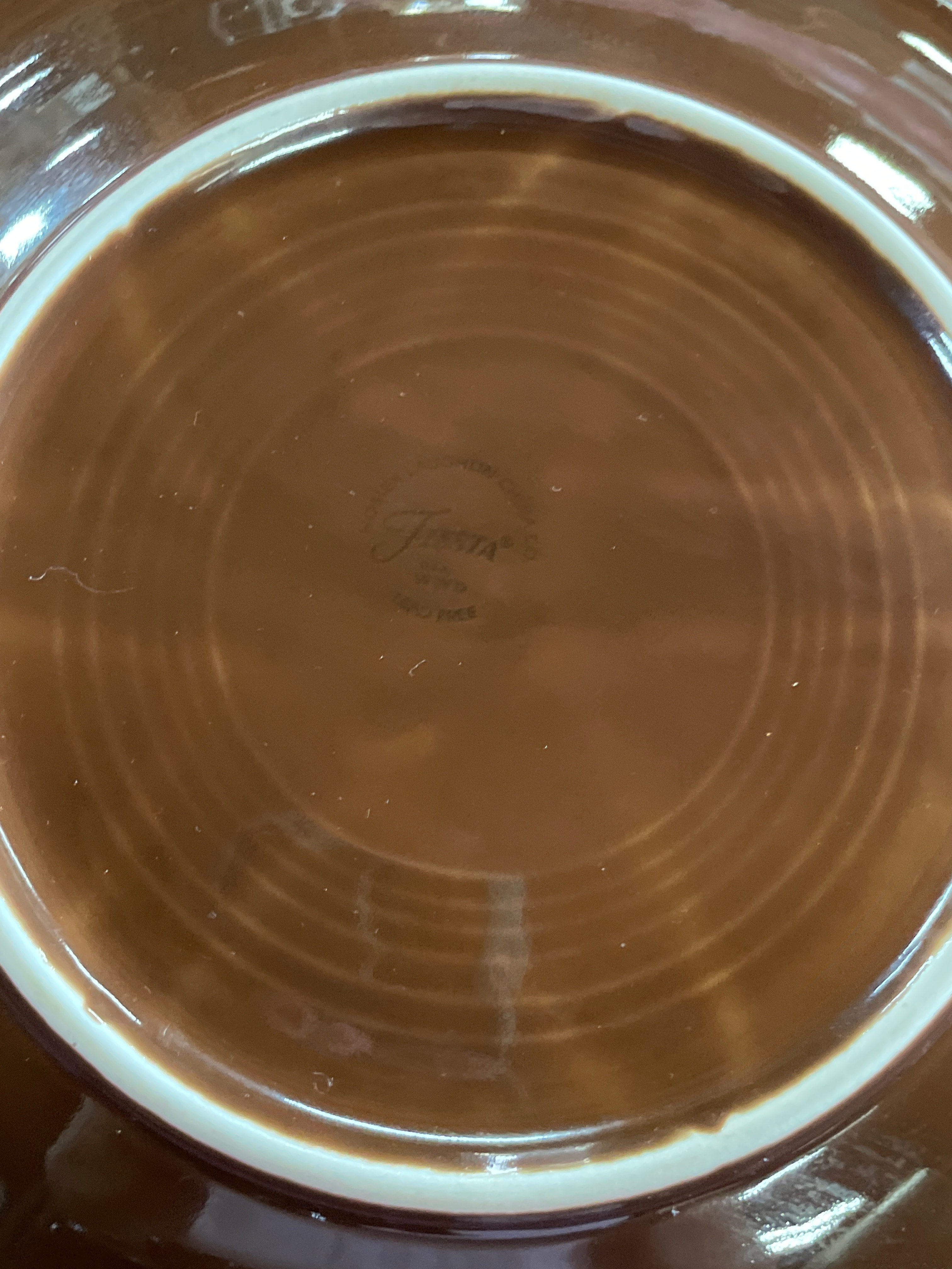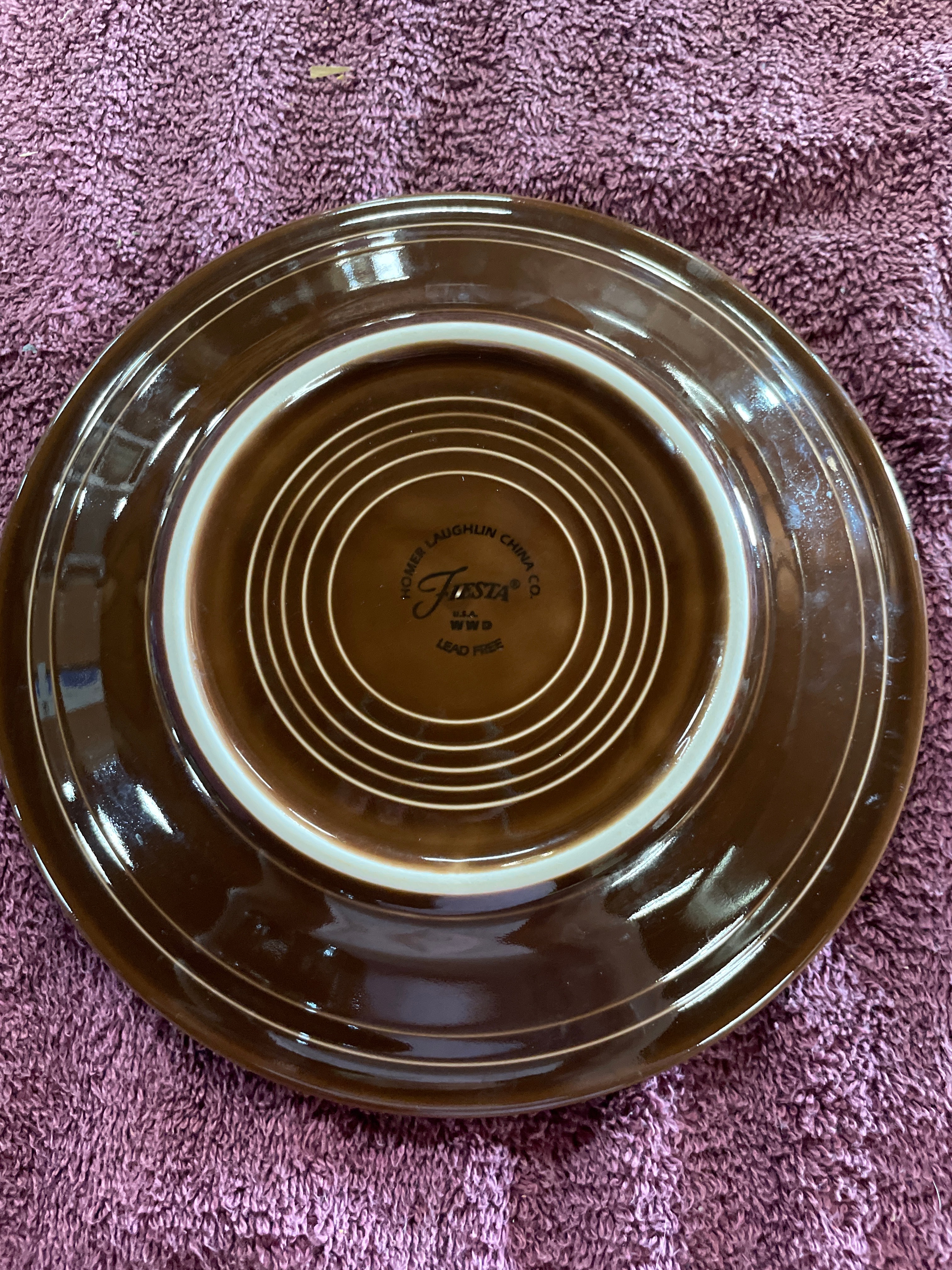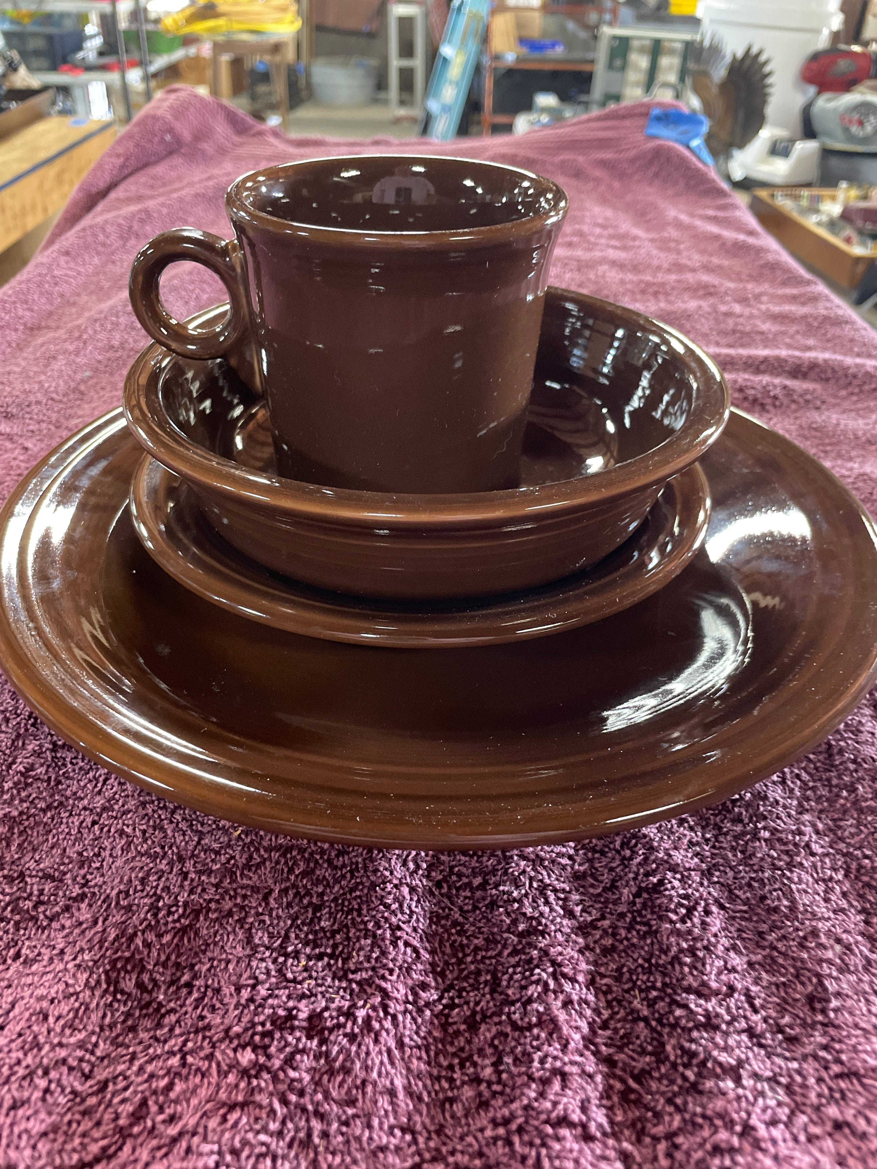 A four-piece set of glossy dark brown Fiesta dinnerware by Homer Laughlin China Co., including one dinner plate, one salad plate, one bowl, and one mug, with plates marked “USA”, “WDG”, and “LEAD FREE”.