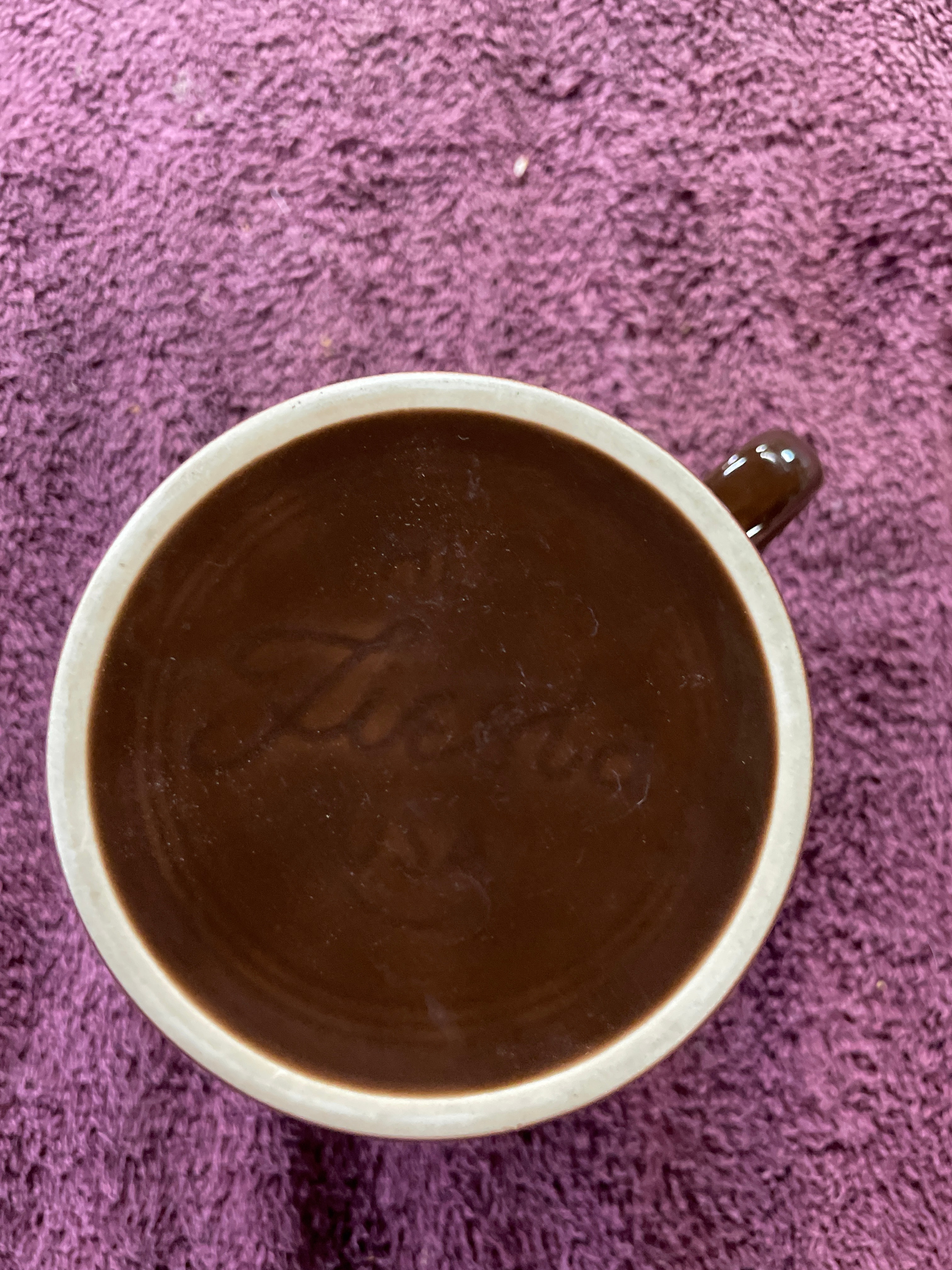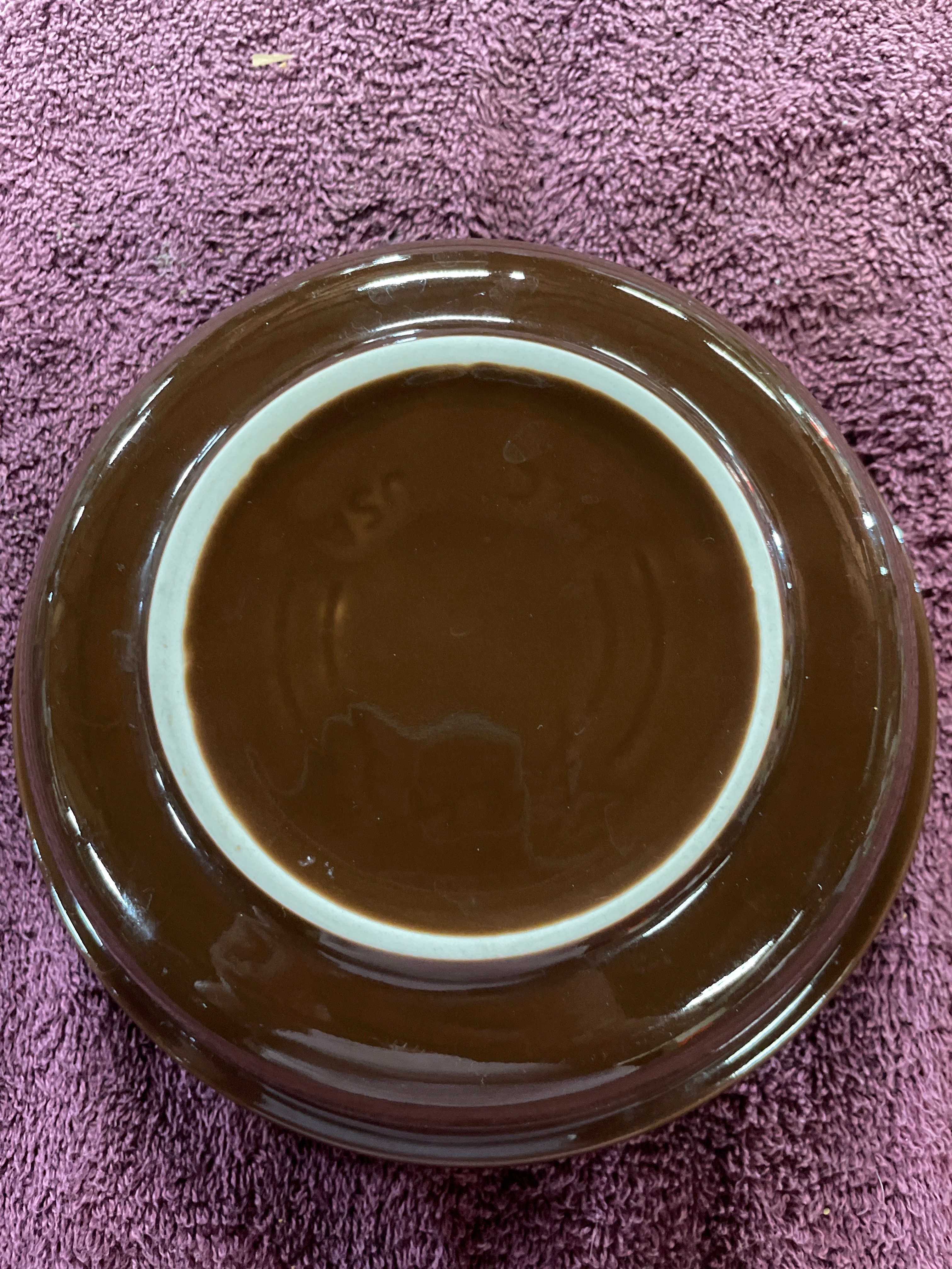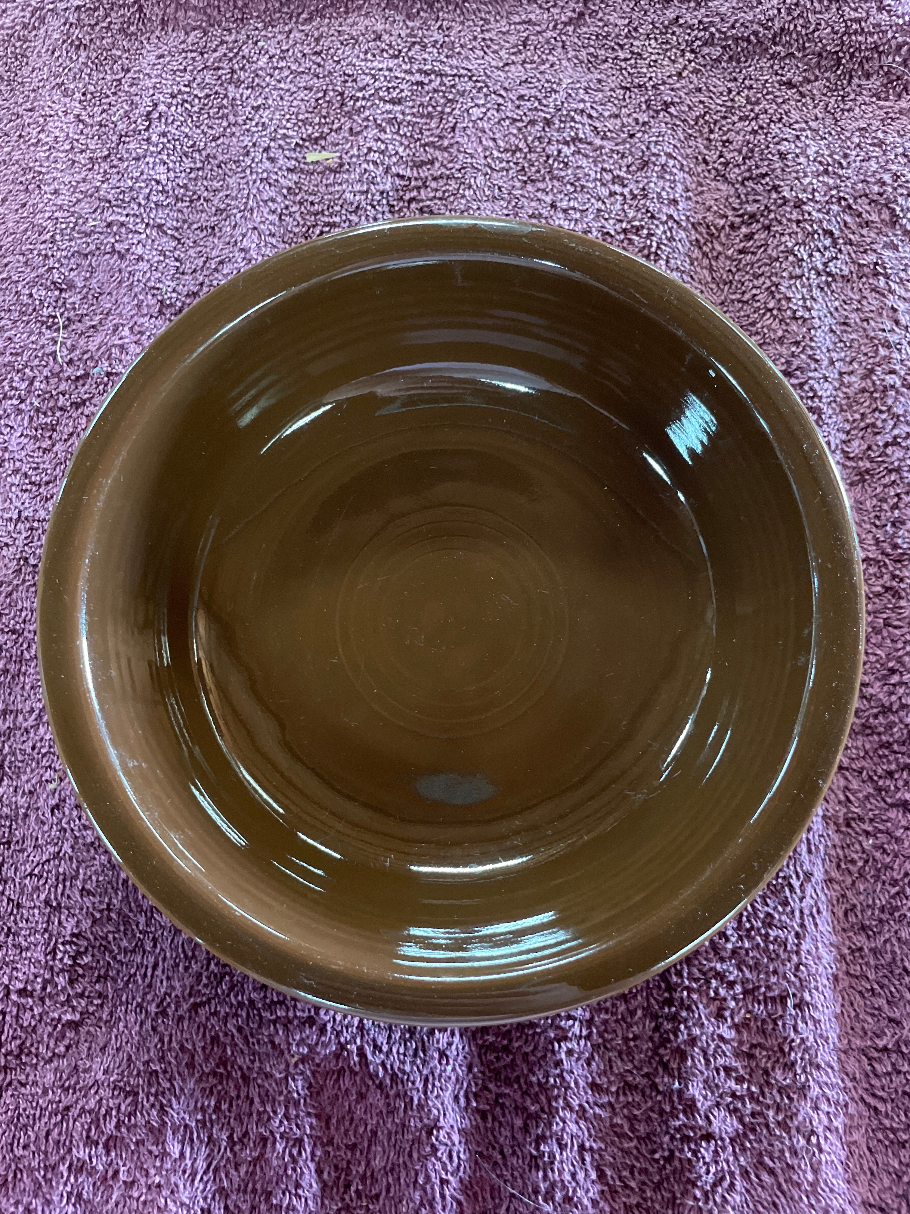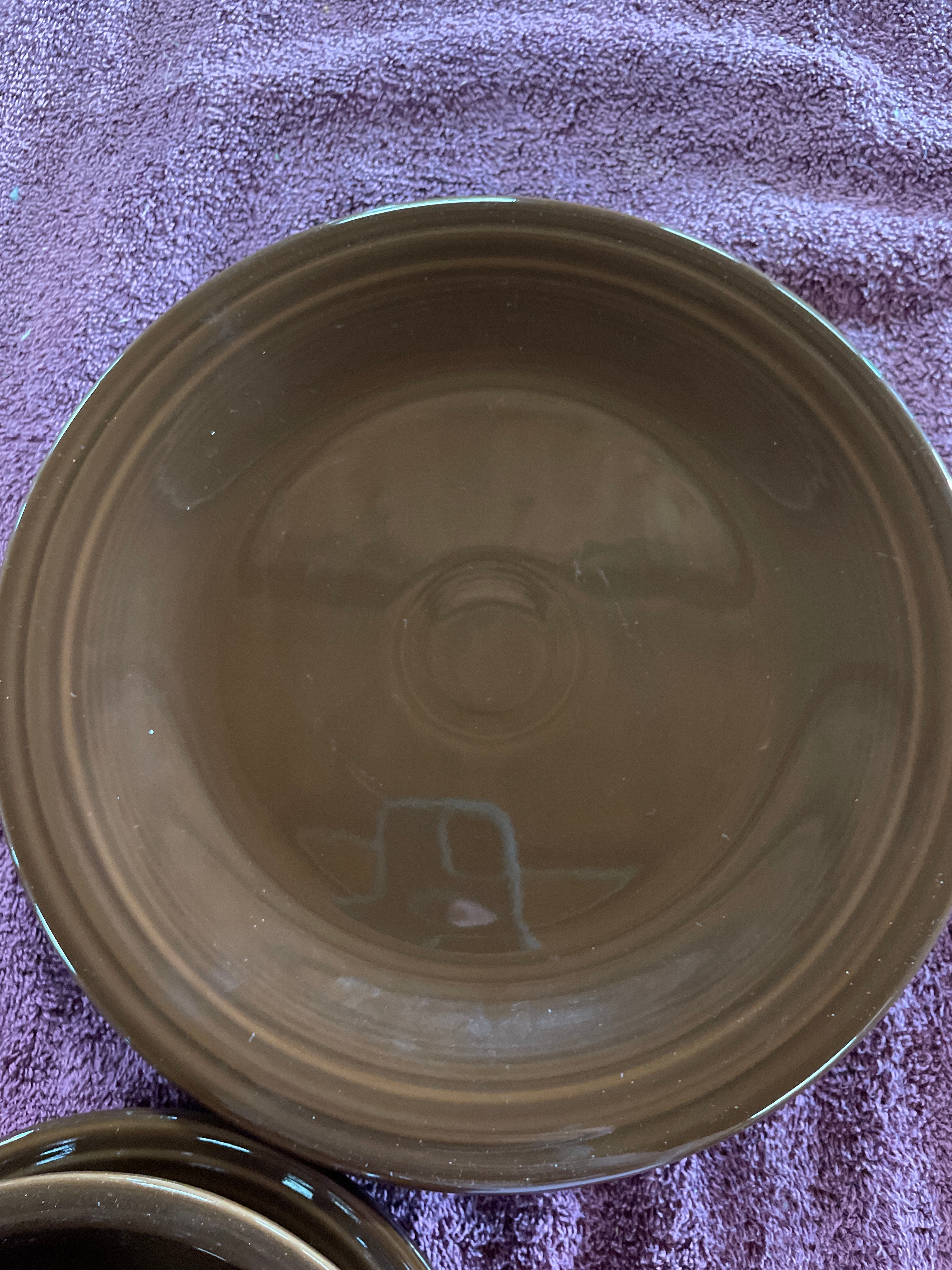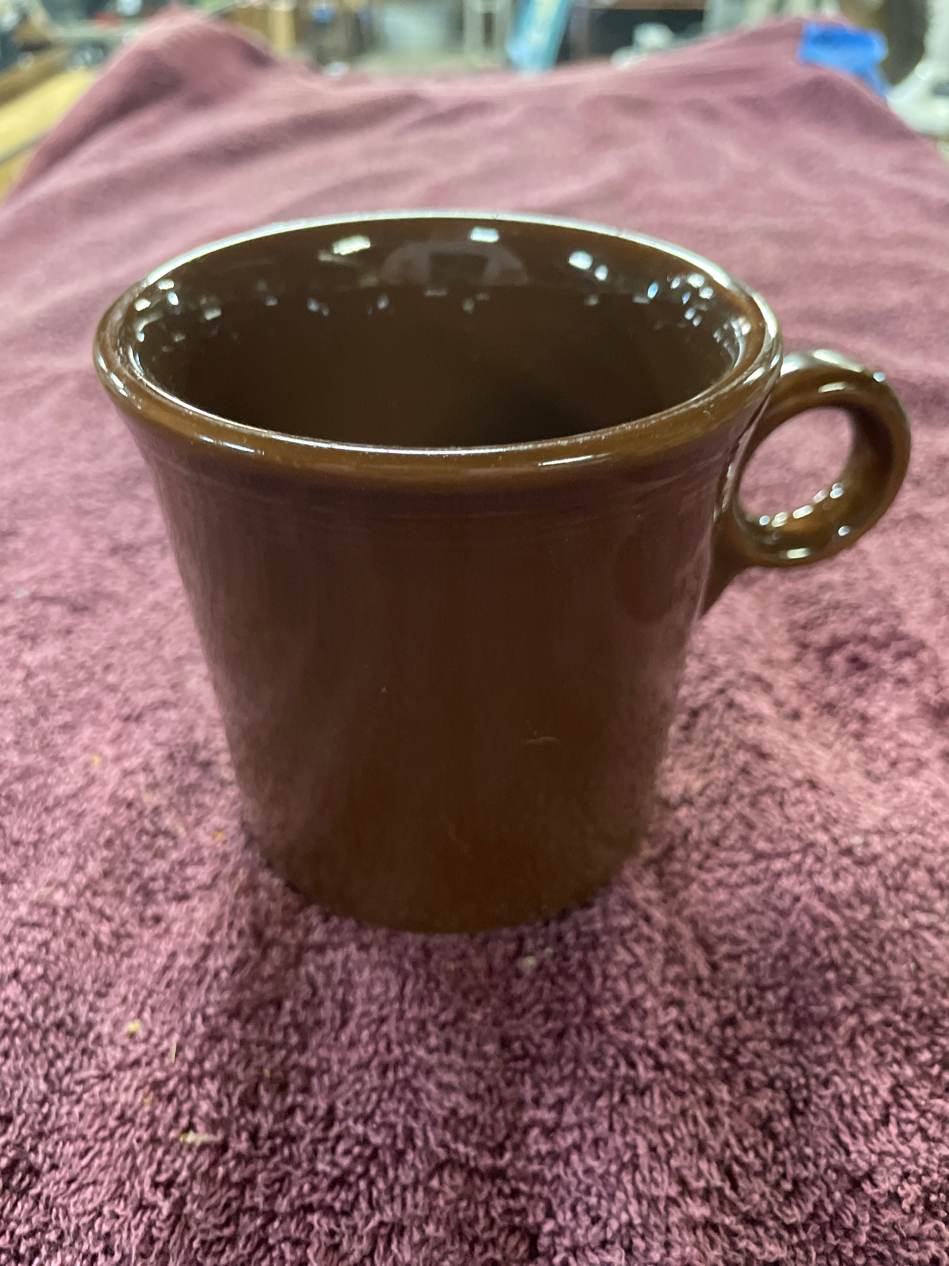 A four-piece set of glossy dark brown Fiesta dinnerware by Homer Laughlin China Co., including one dinner plate, one salad plate, one bowl, and one mug, with plates marked “USA”, “WDG”, and “LEAD FREE”.